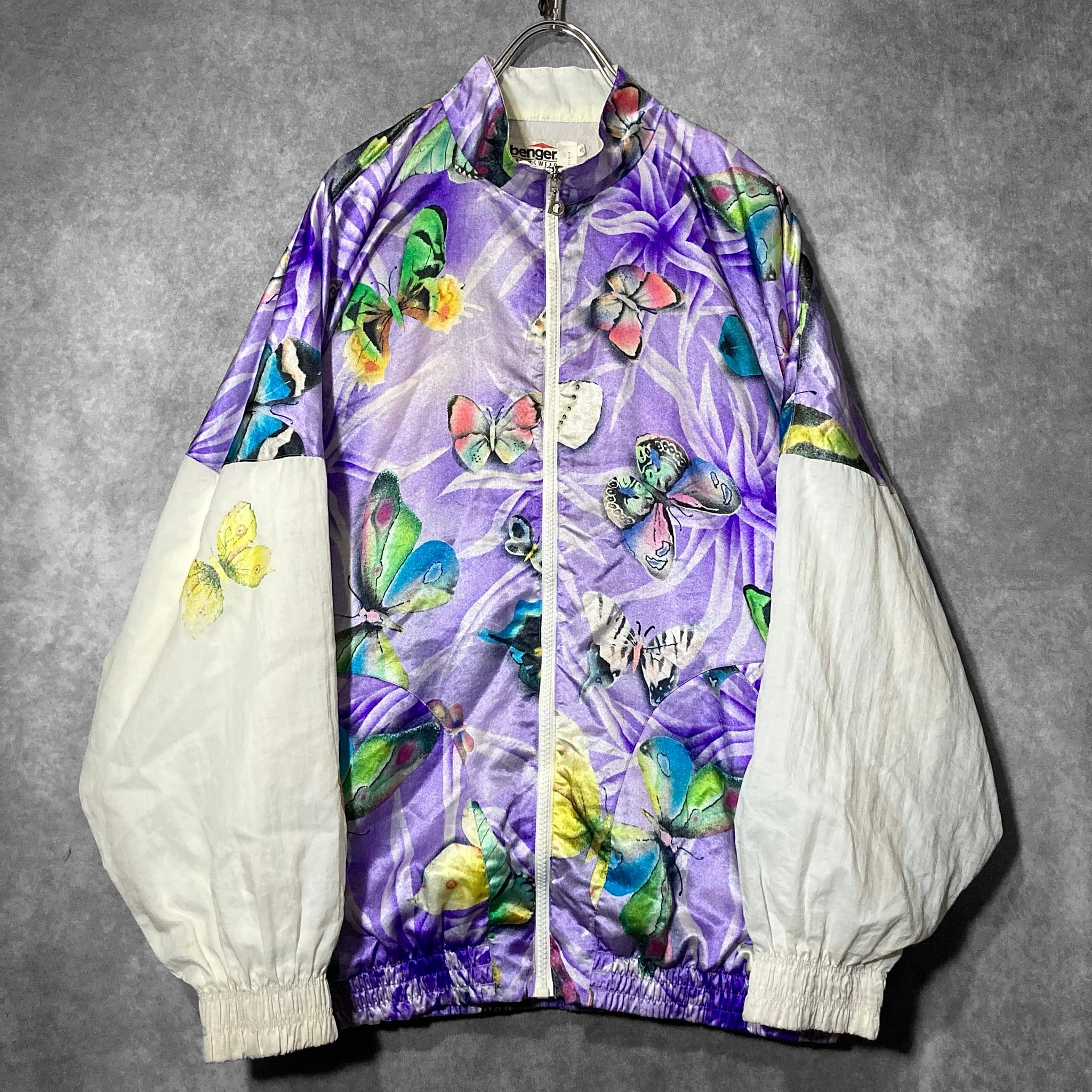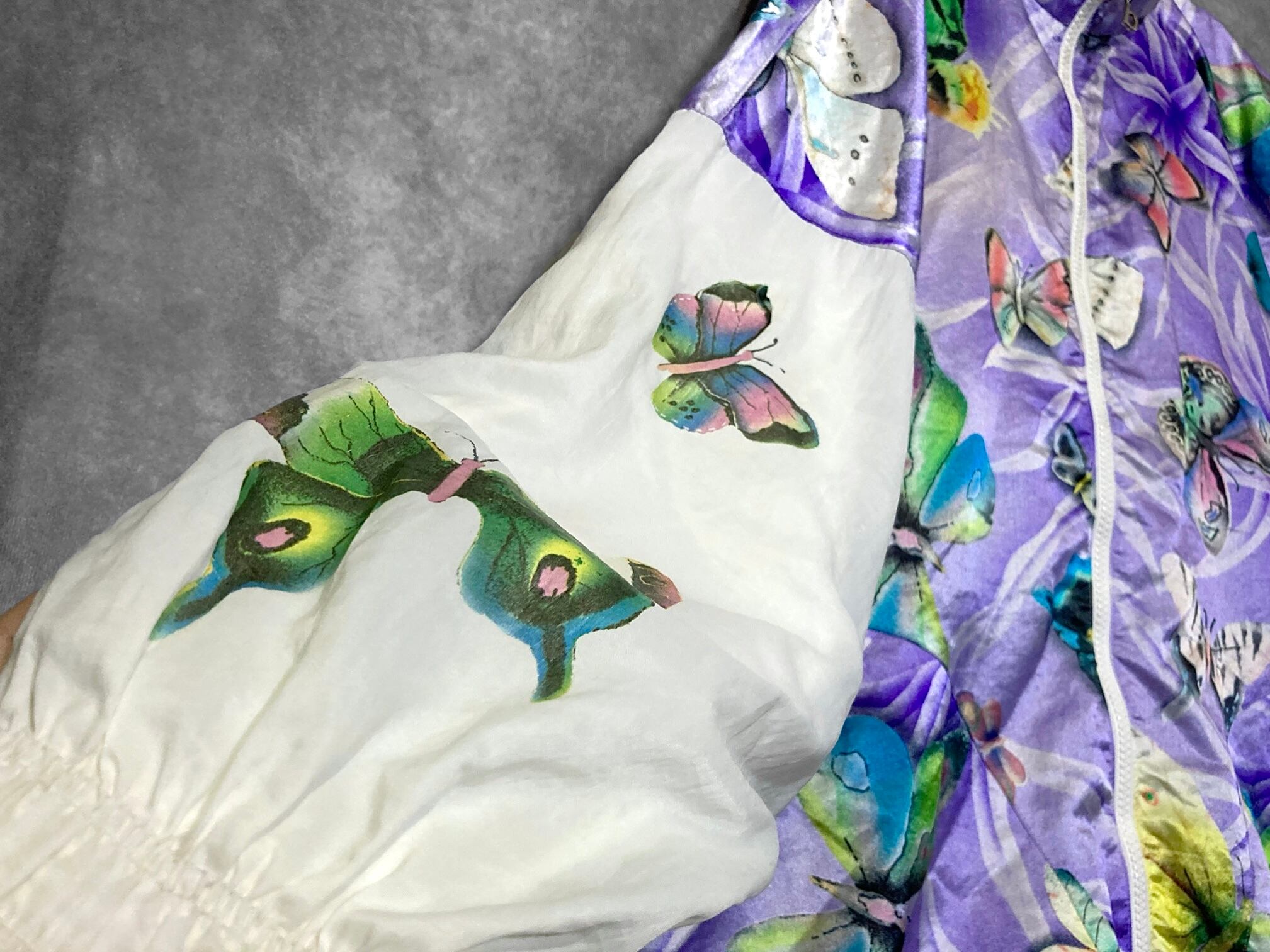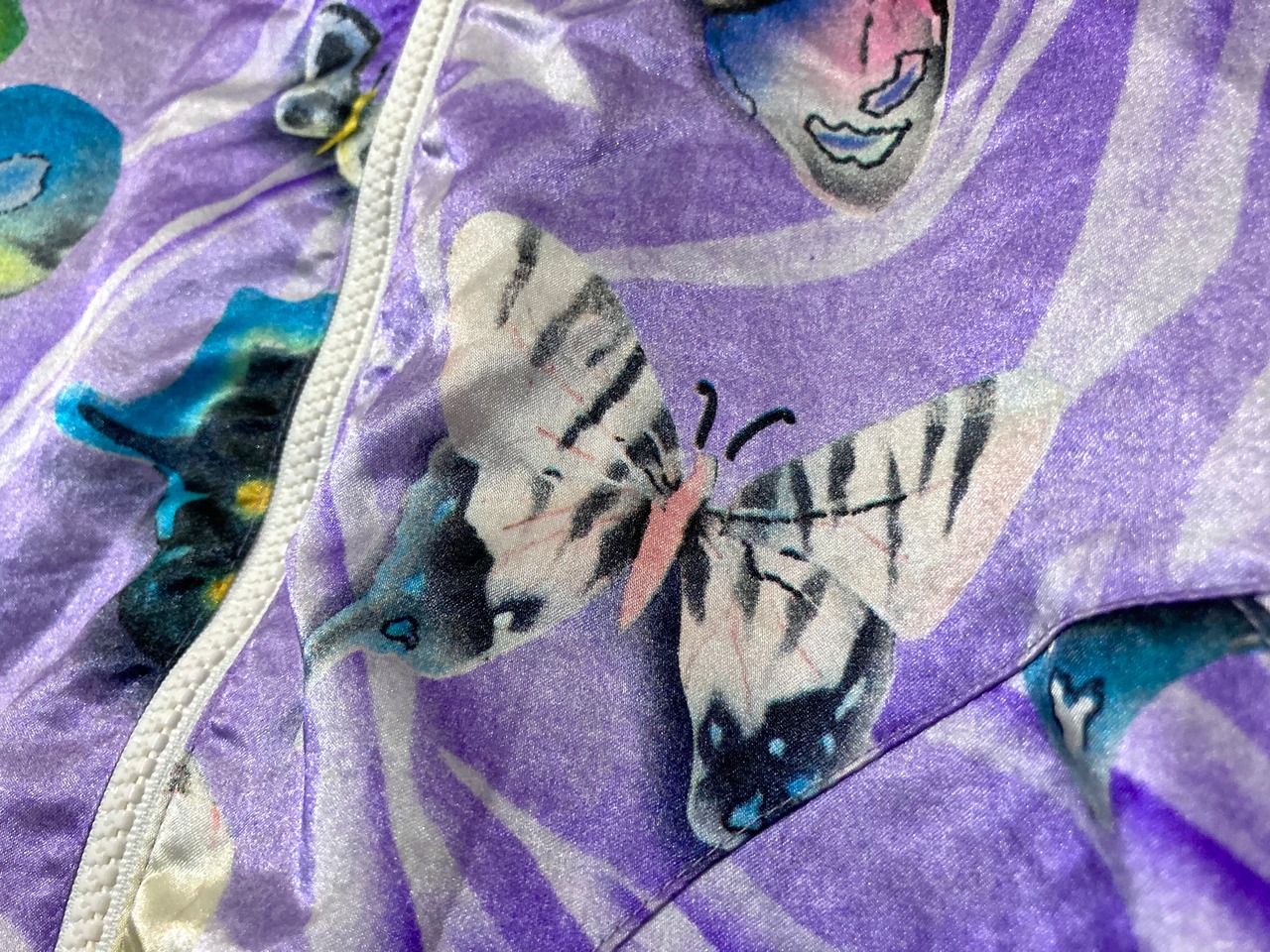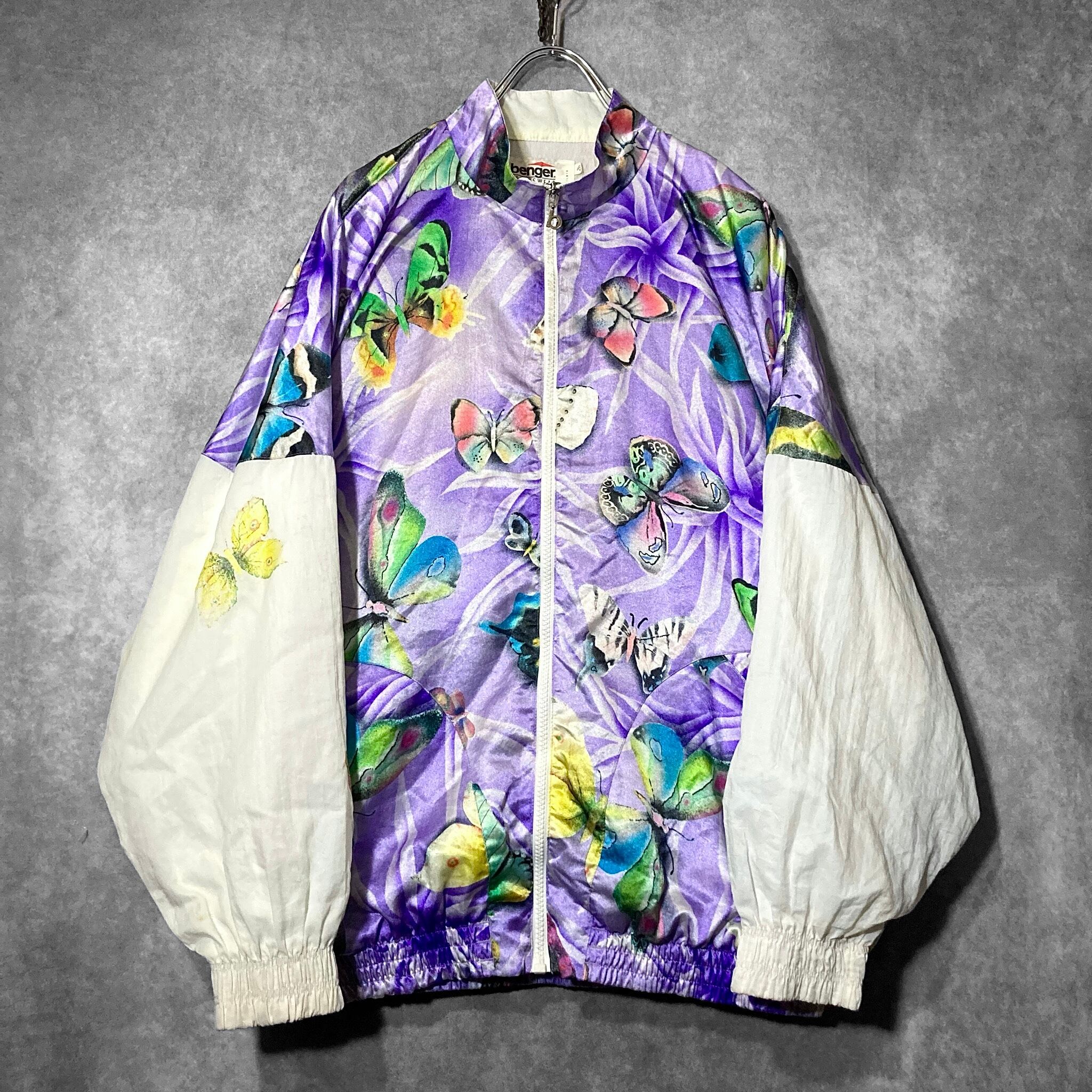 幻想的な紫の花柄と色鮮やかな蝶が舞うアーティスティックな総柄が雰囲気ムンムンなナイロンジャケットの入荷です✔︎