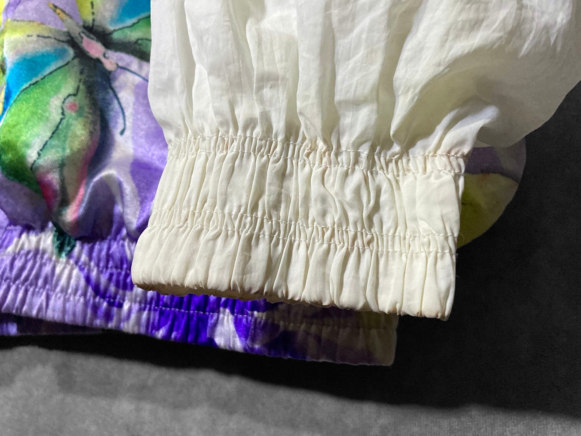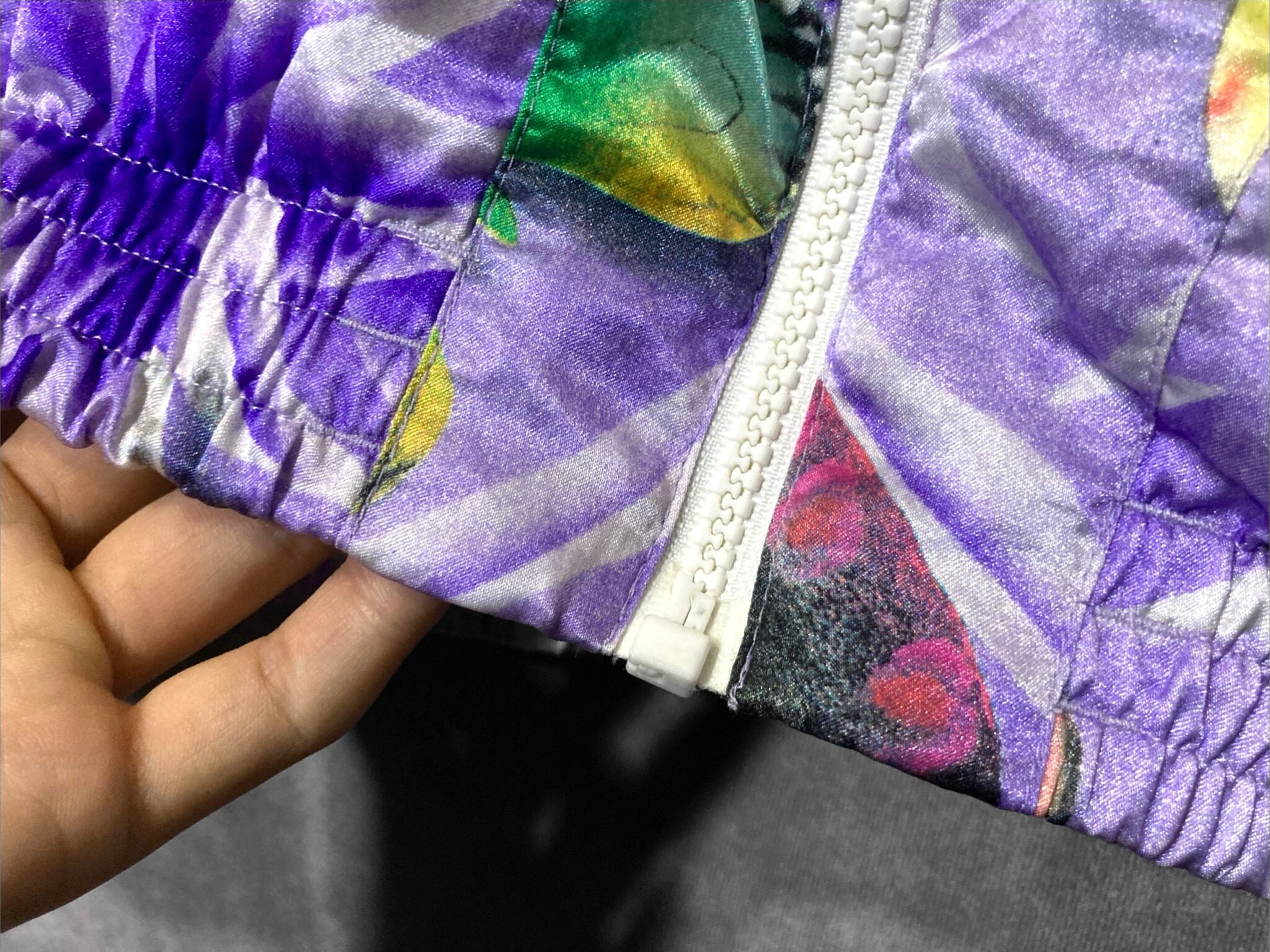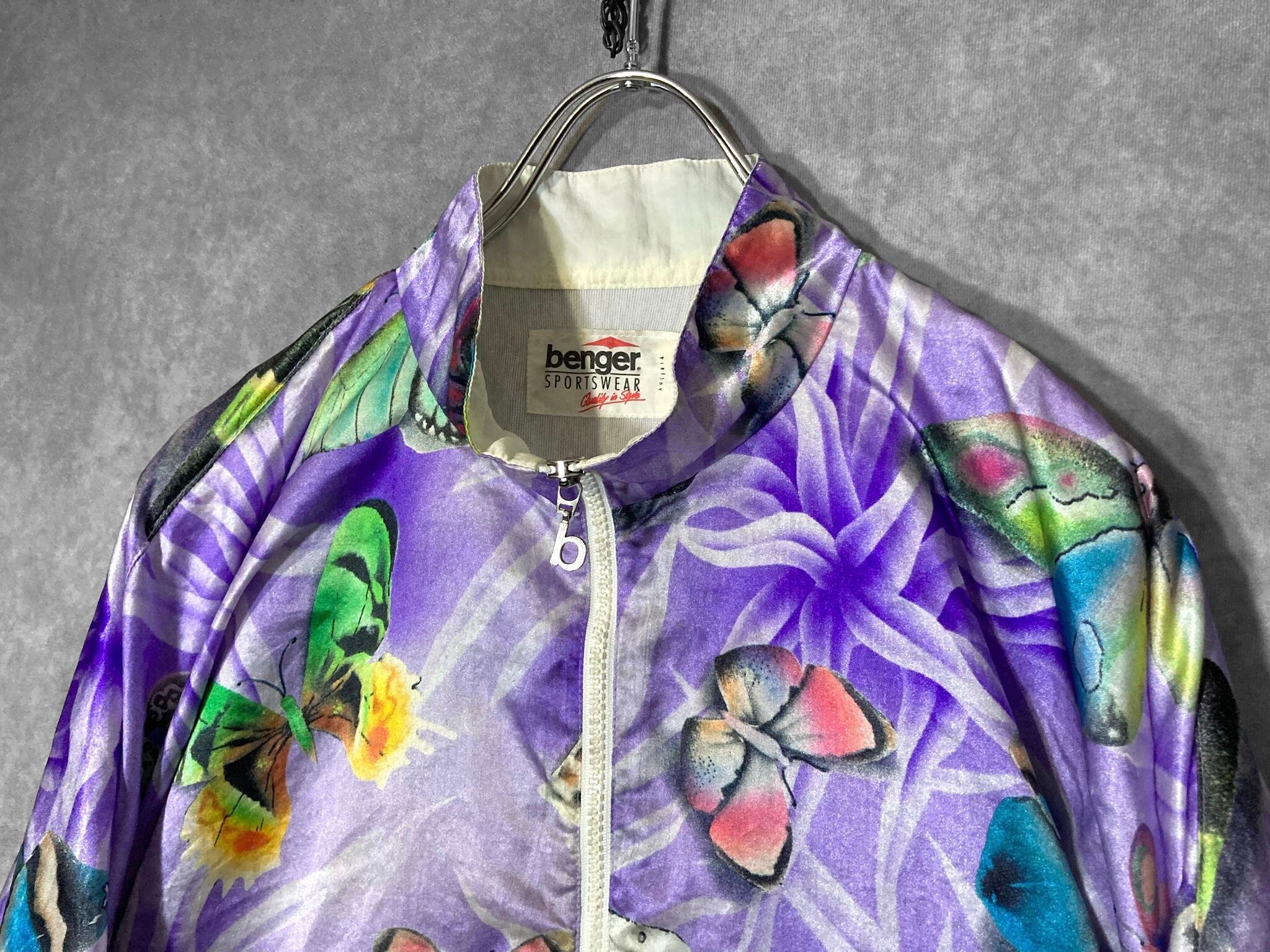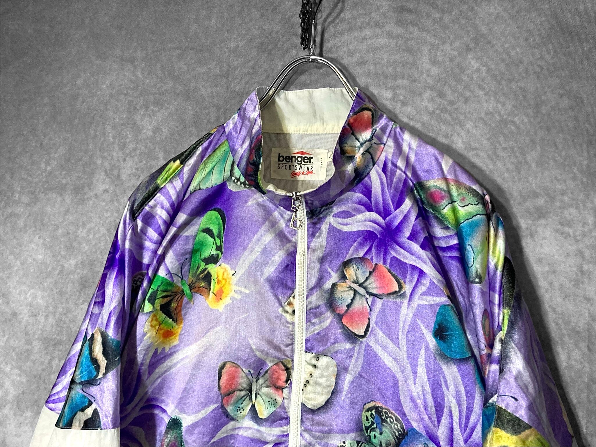 幻想的な紫の花柄と色鮮やかな蝶が舞うアーティスティックな総柄が雰囲気ムンムンなナイロンジャケットの入荷です✔︎