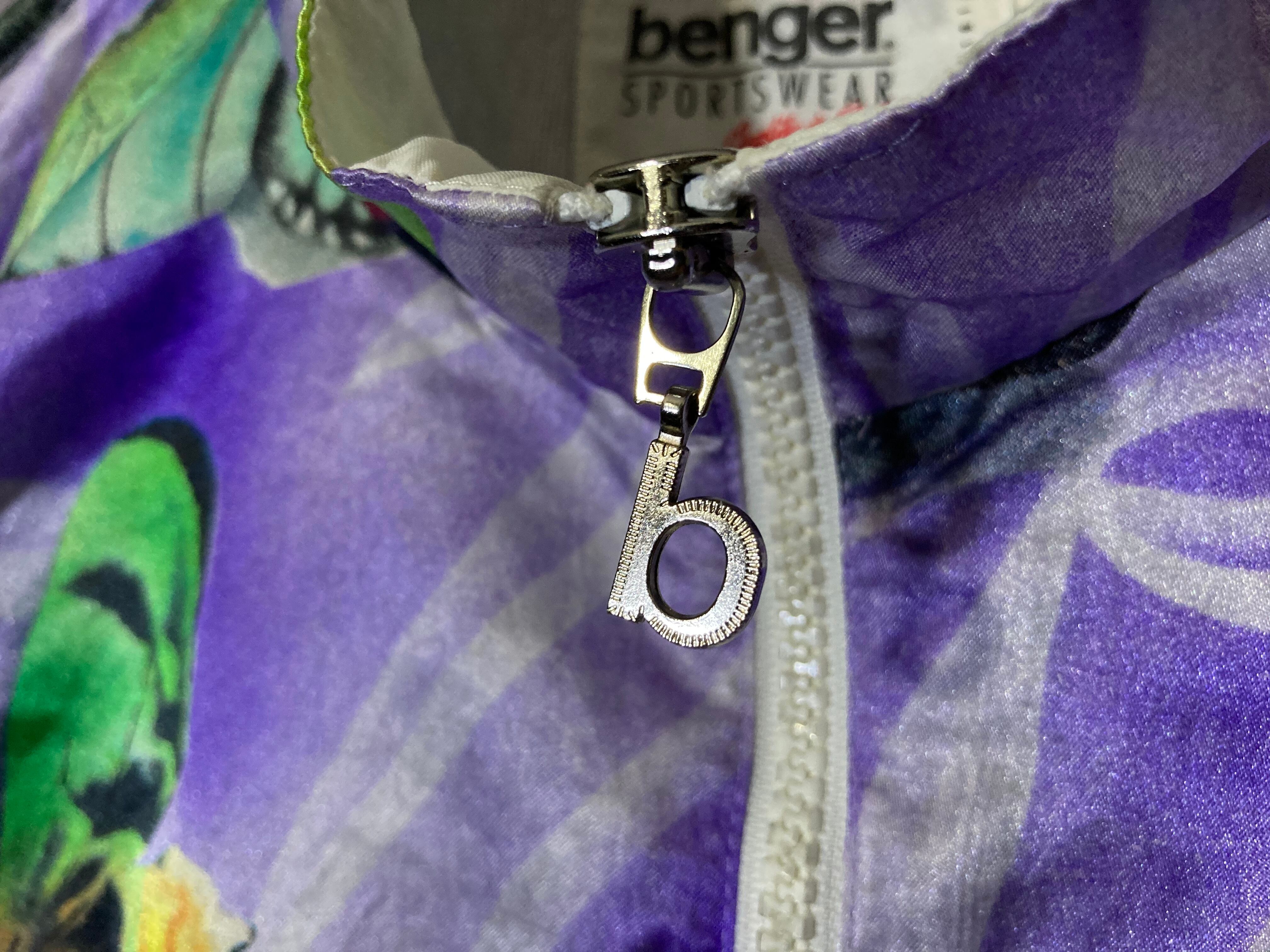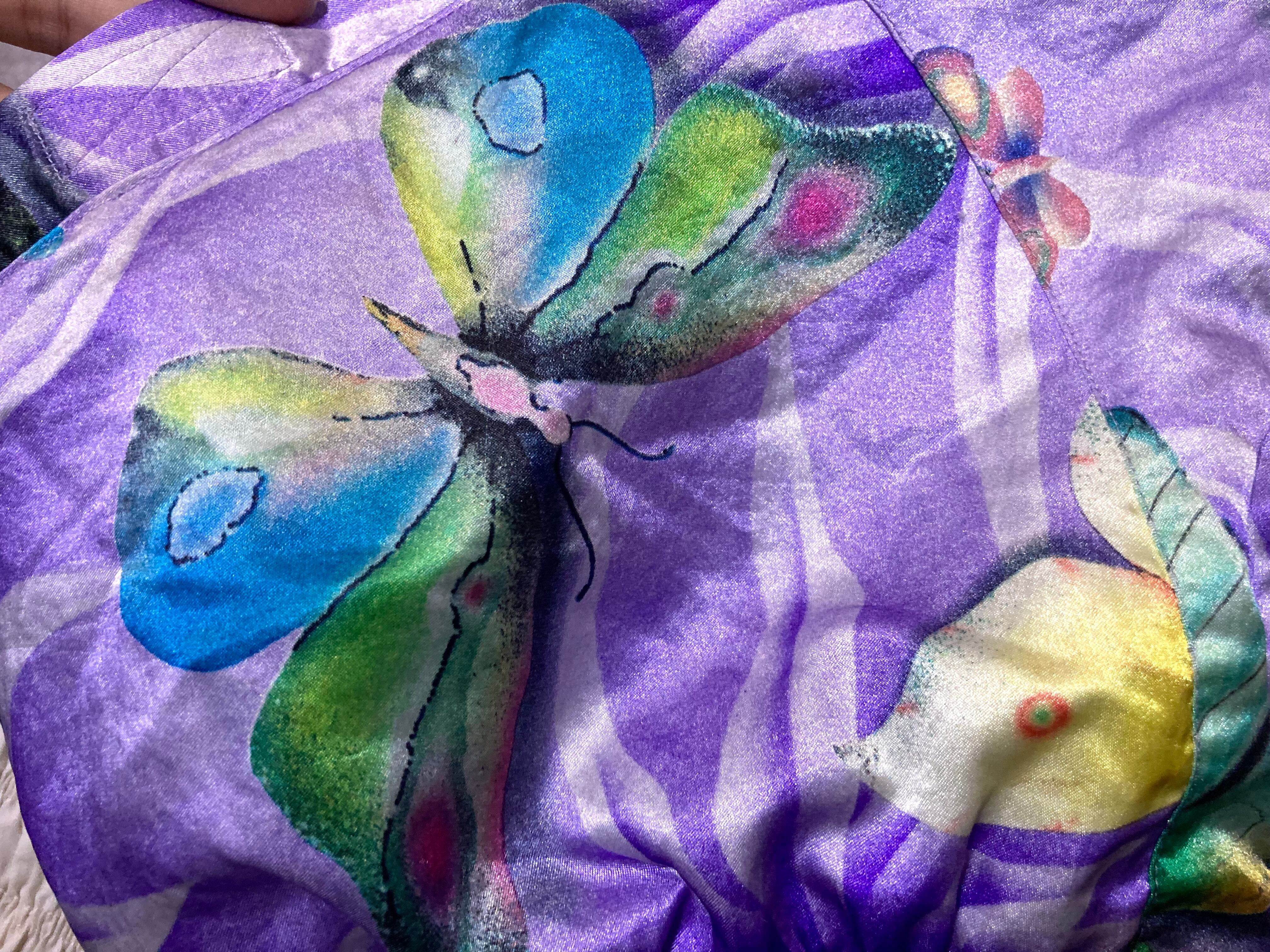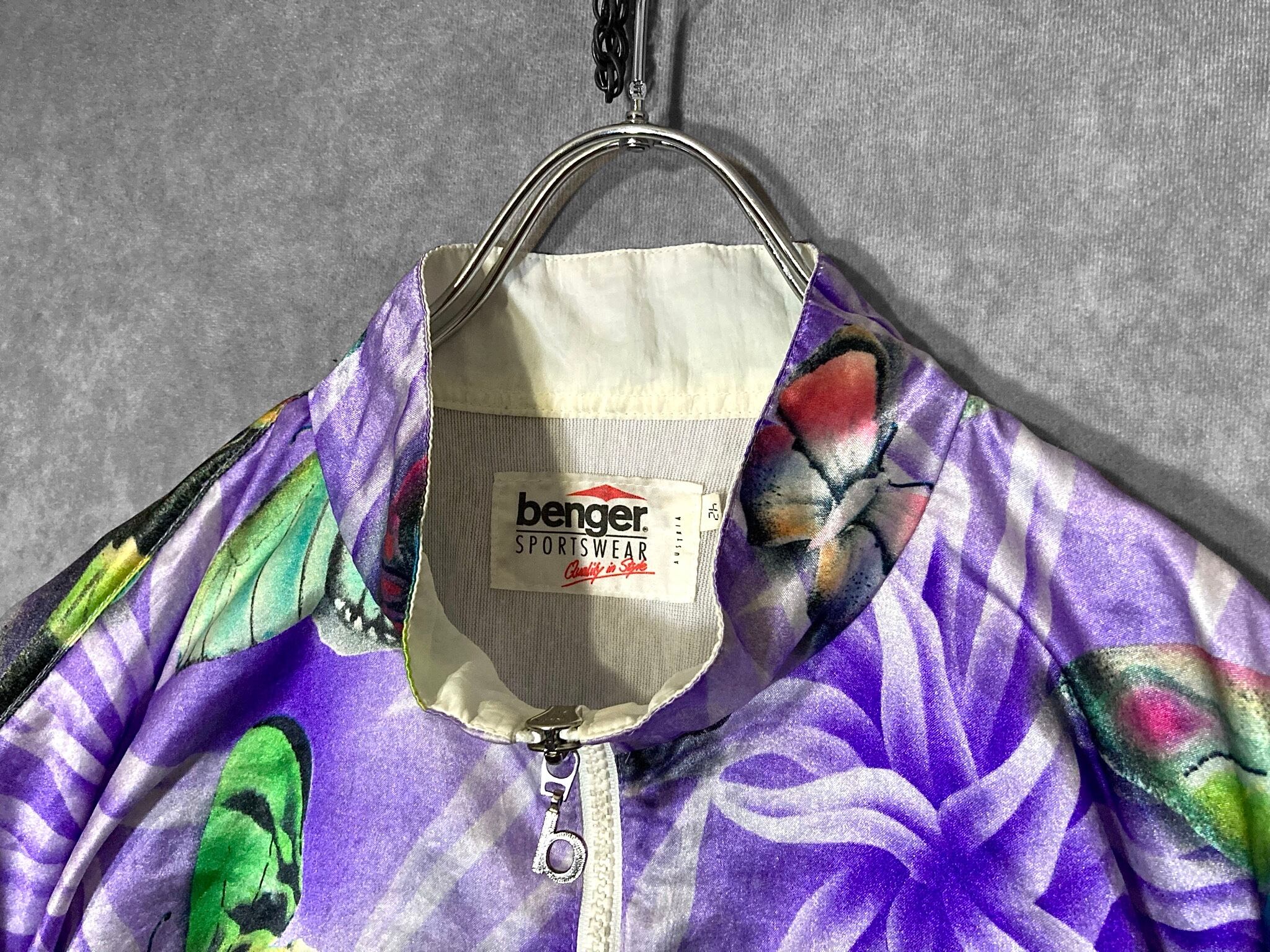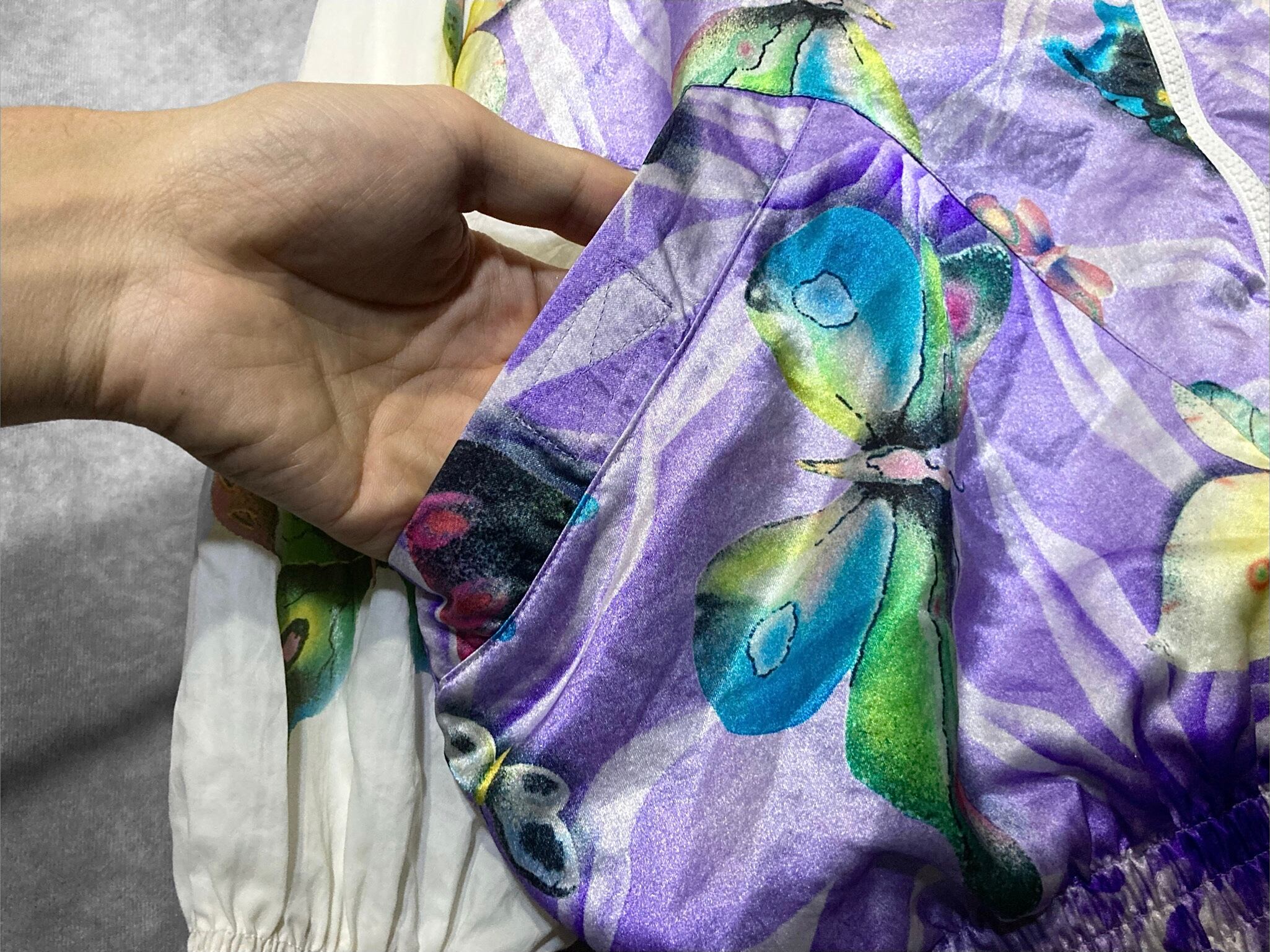 幻想的な紫の花柄と色鮮やかな蝶が舞うアーティスティックな総柄が雰囲気ムンムンなナイロンジャケットの入荷です✔︎