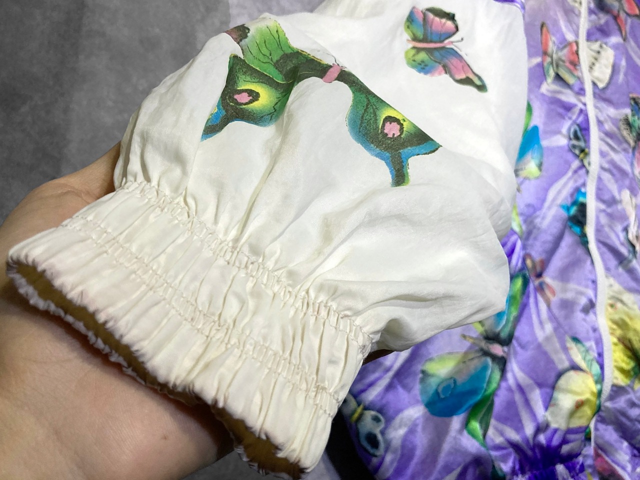 1つ1つが色・柄の異なる蝶が舞っており、袖の切り替えにも蝶が花に誘われるように飛んでいてとても可愛いです。