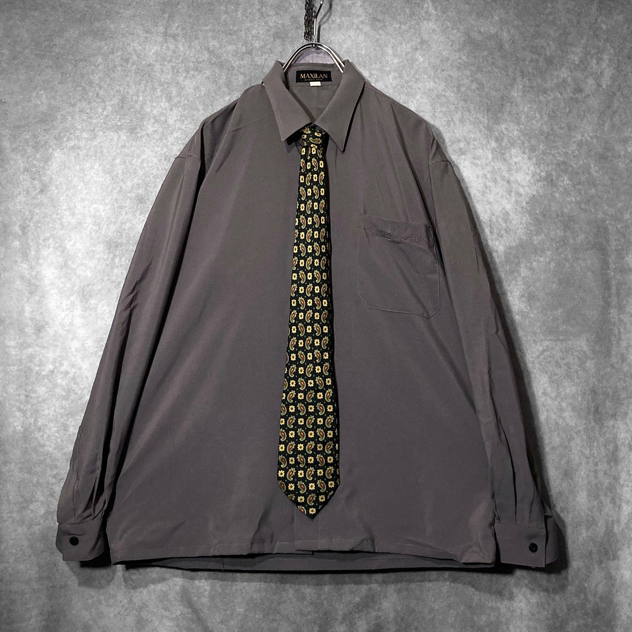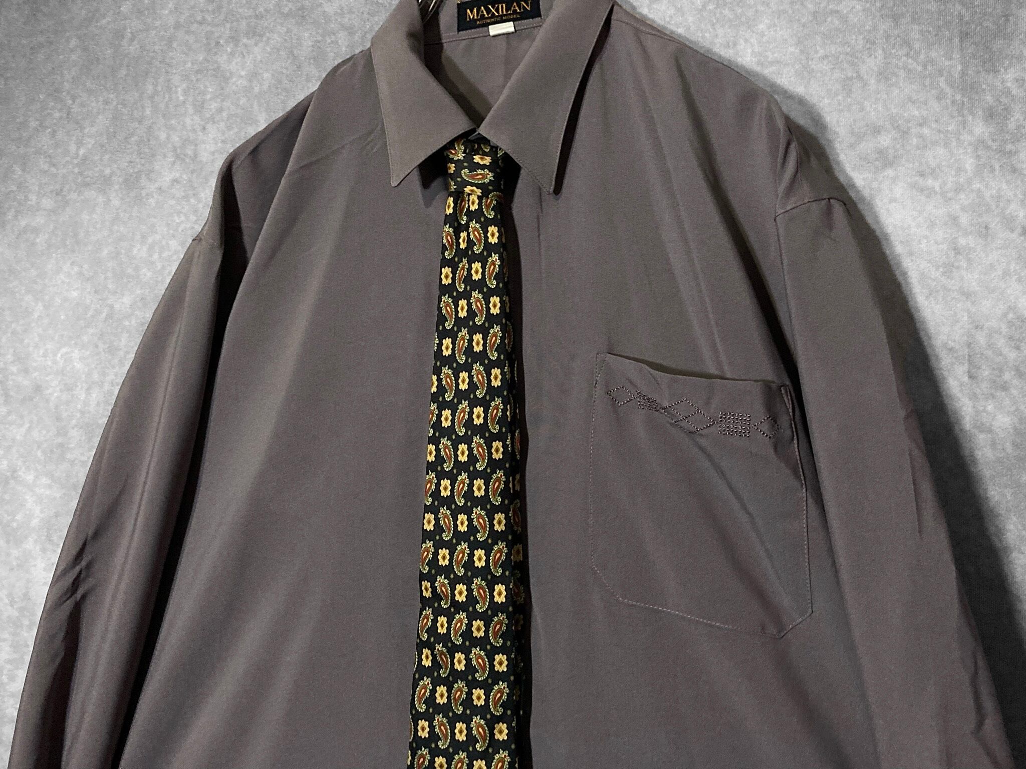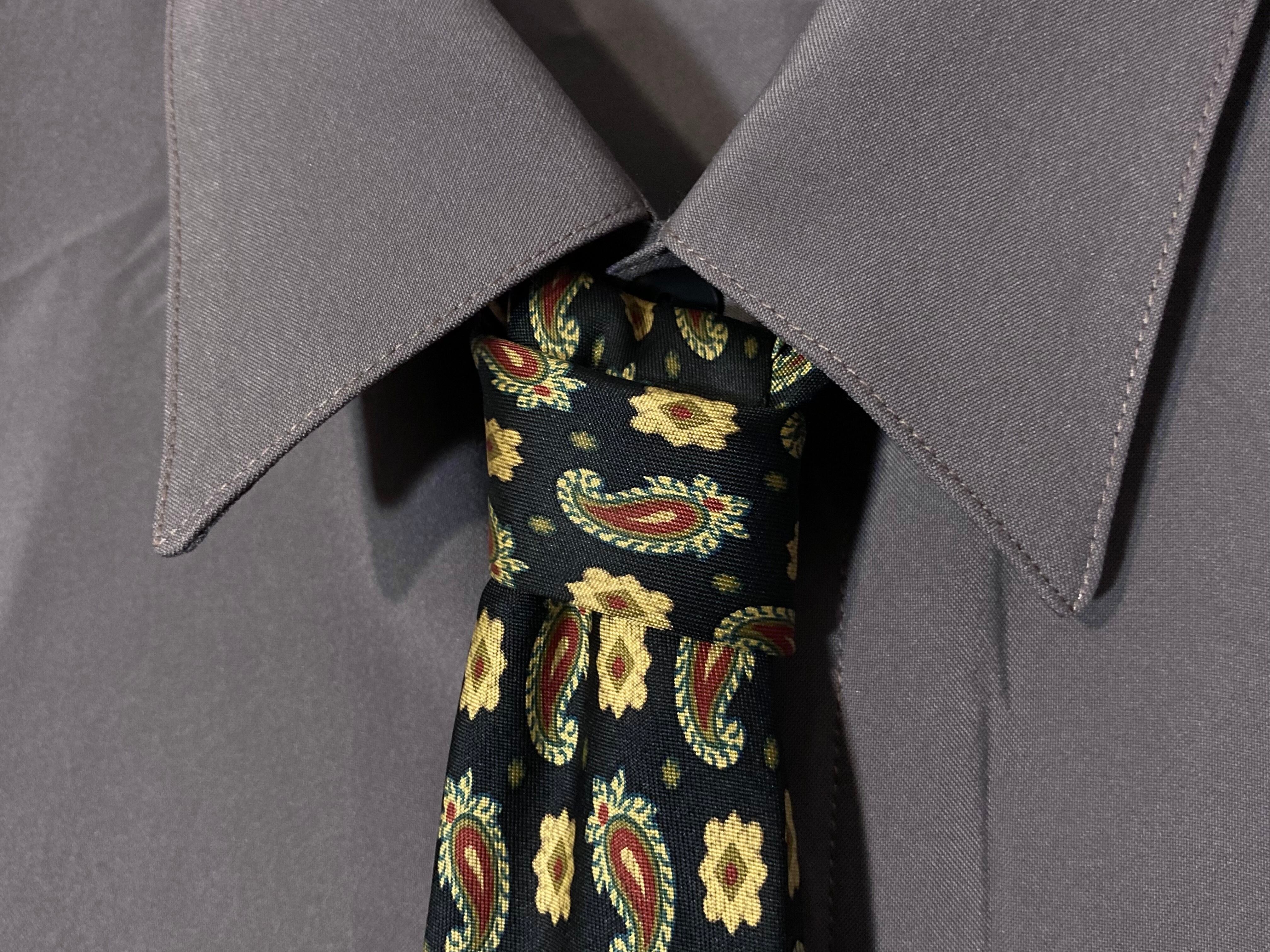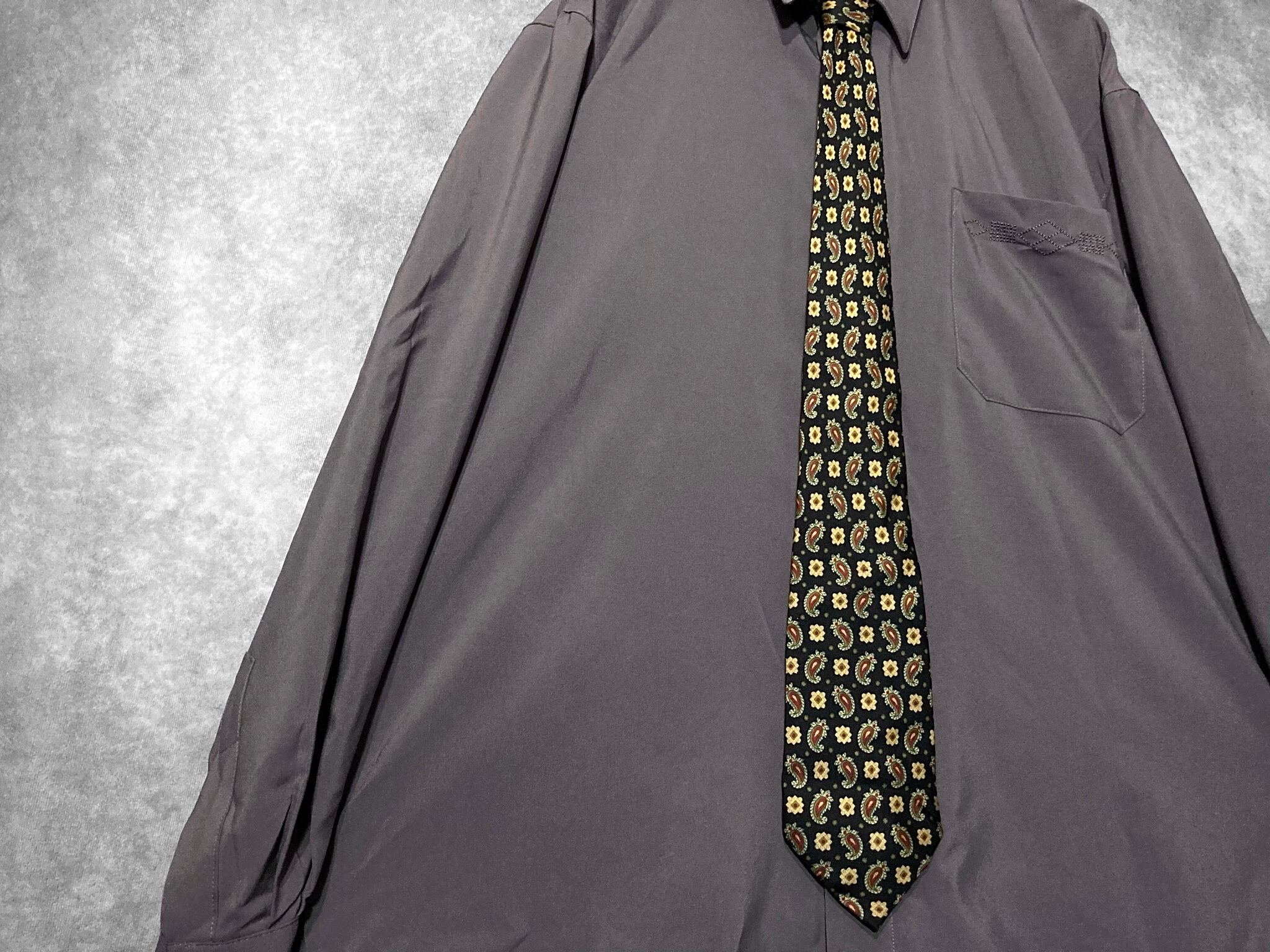 無機質なグレーパープルの刺繍シャツとペイズリー柄のネクタイのネクタイコーデセット。