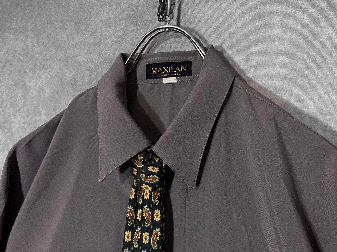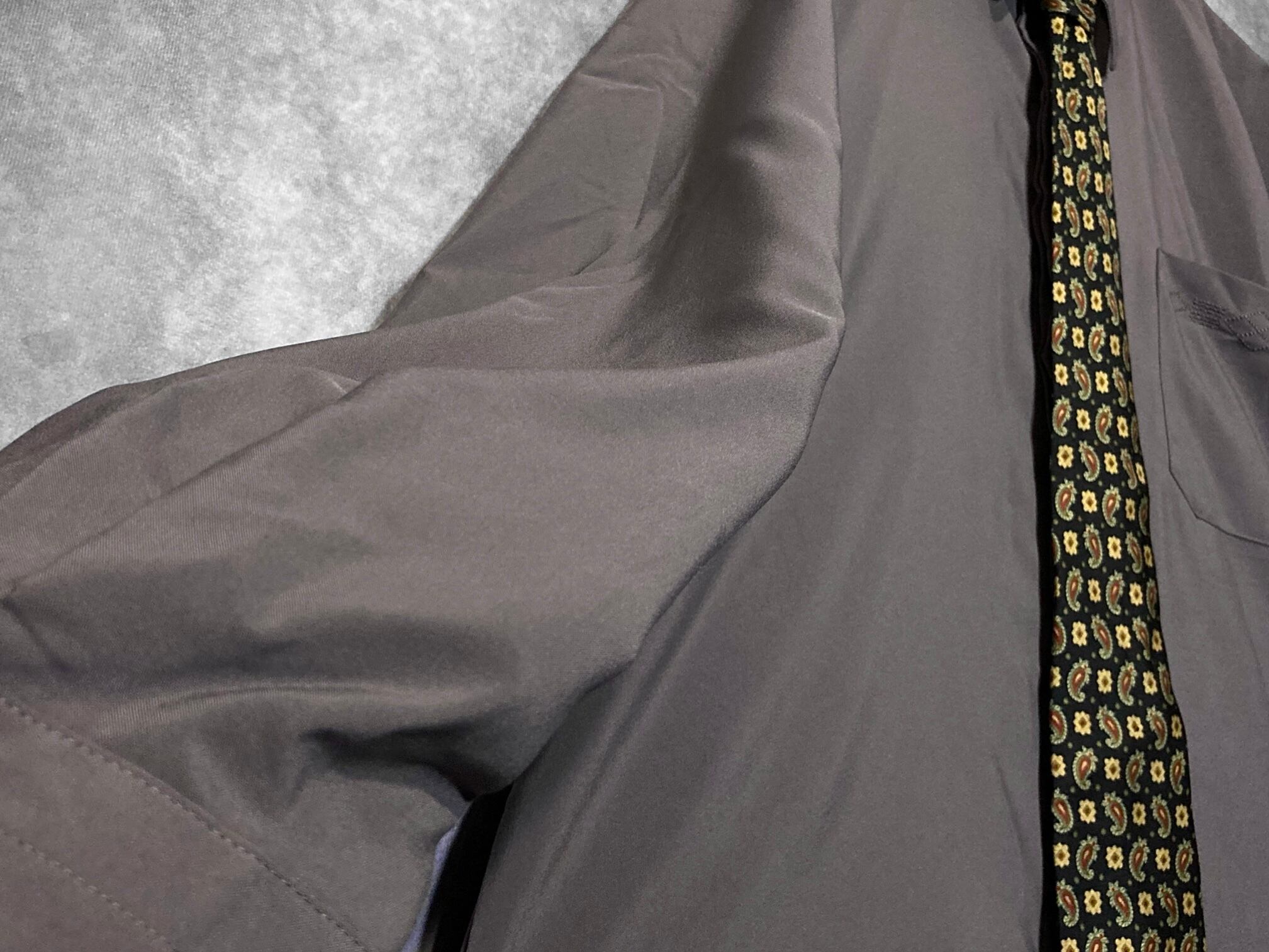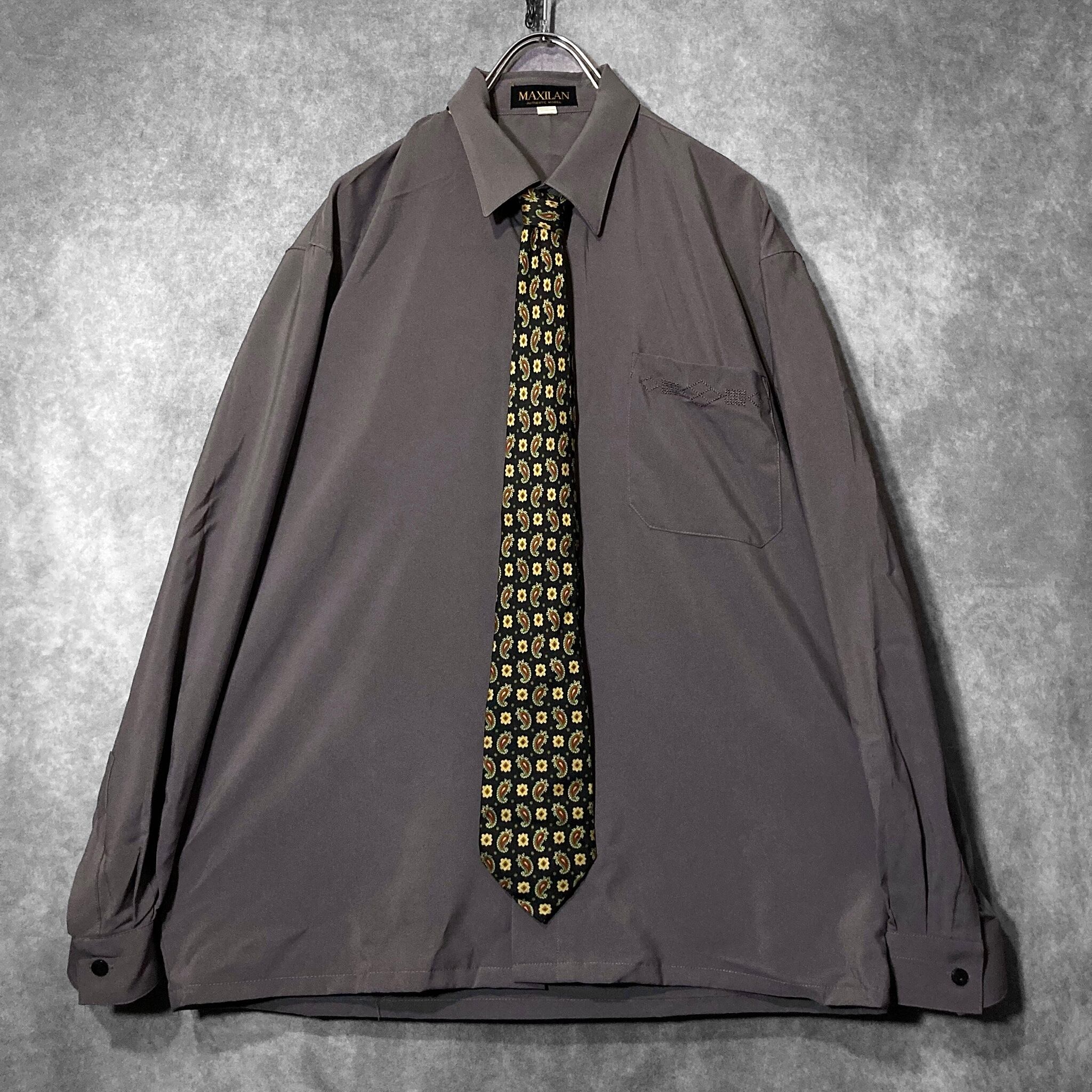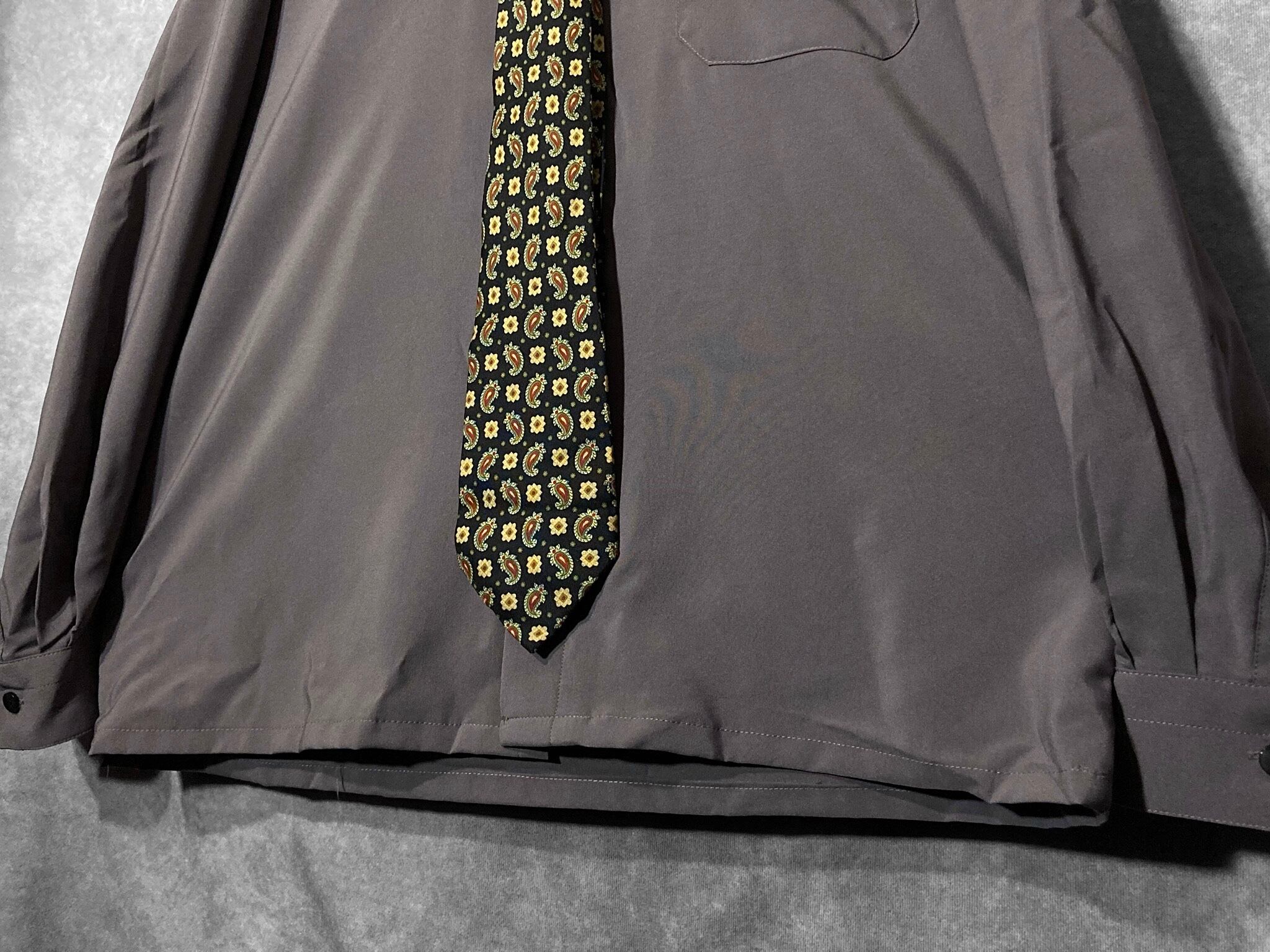 無機質なグレーパープルの刺繍シャツとペイズリー柄のネクタイのネクタイコーデセット。