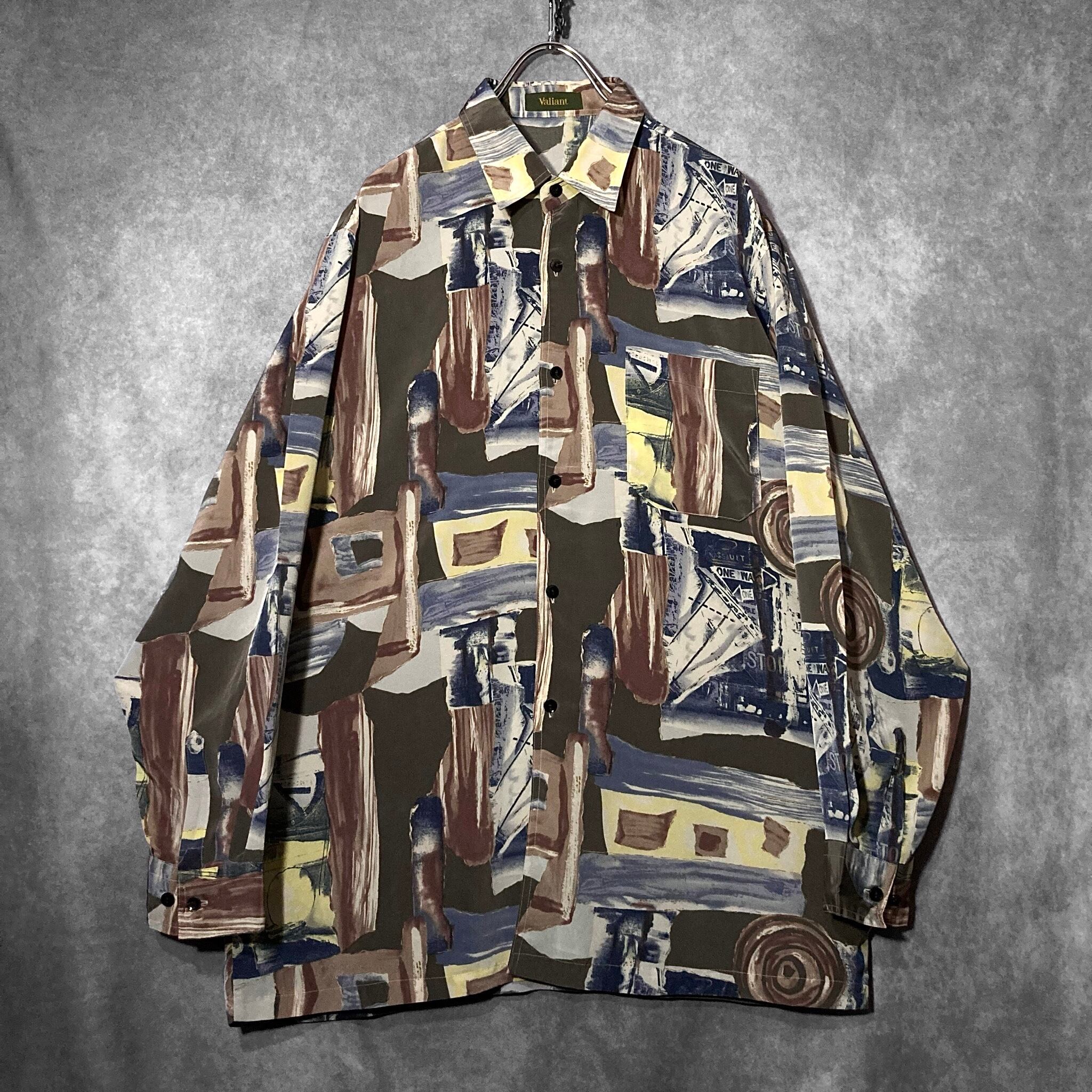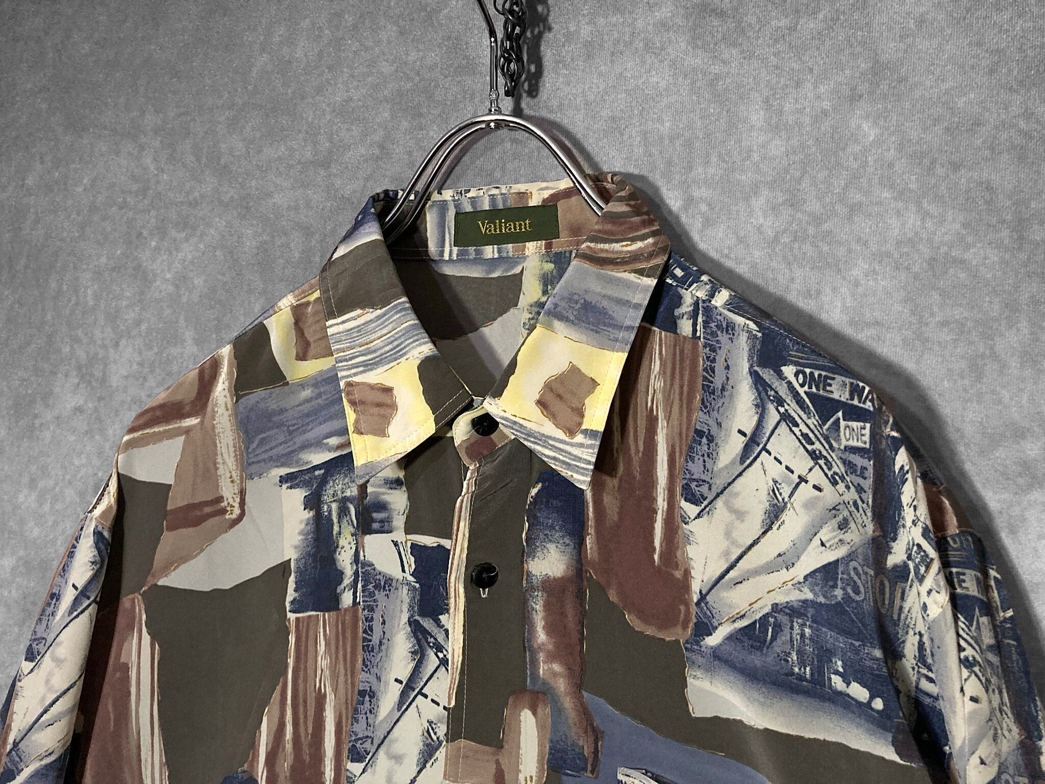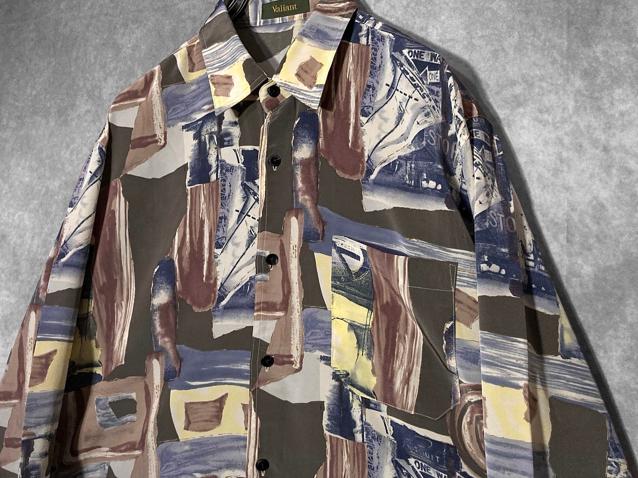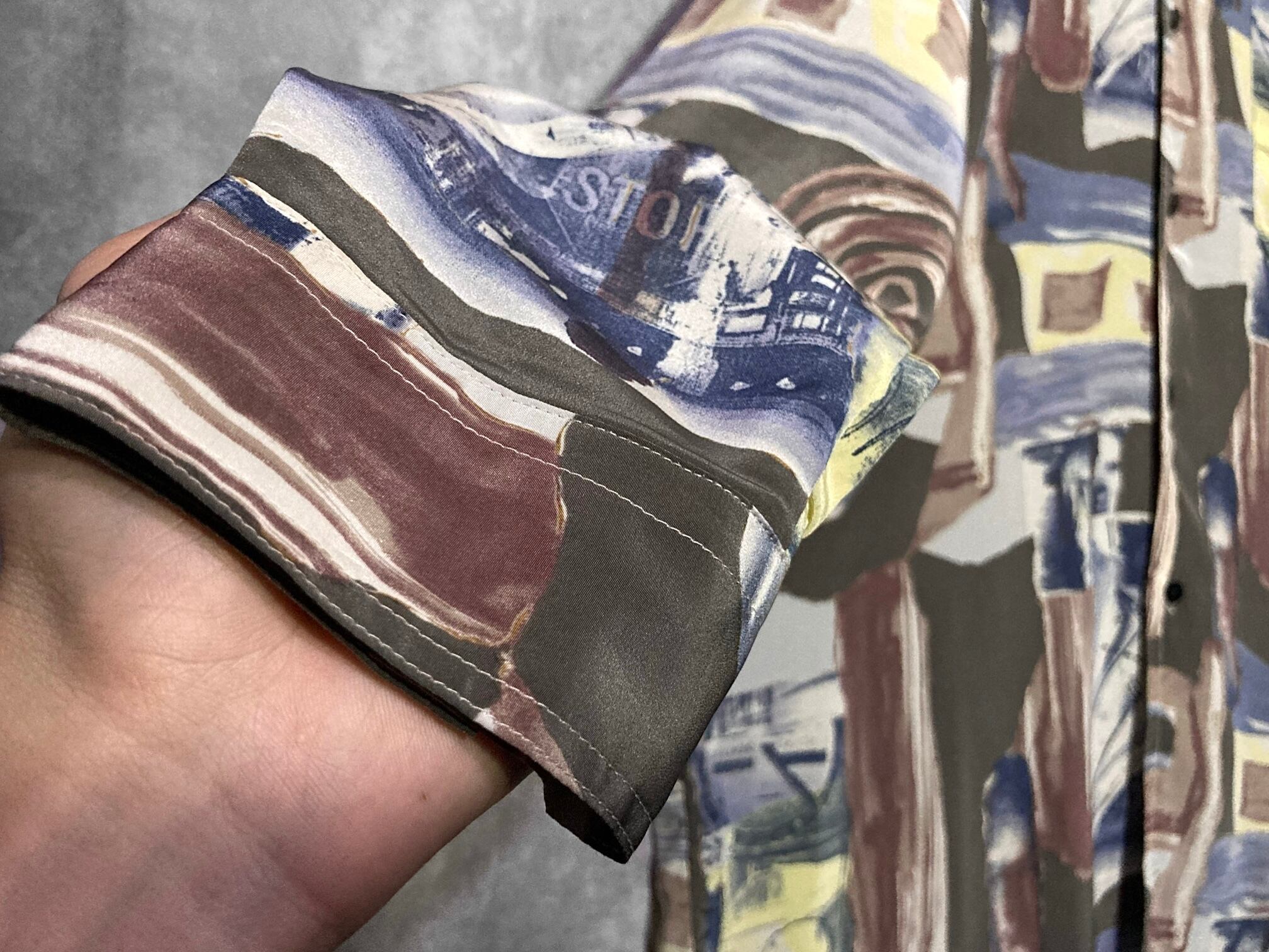 大胆に描かれたストリートの街並みのグラフィックやアーティスティックな擦れたペイントデザインが雰囲気ムンムンな総柄シャツ。