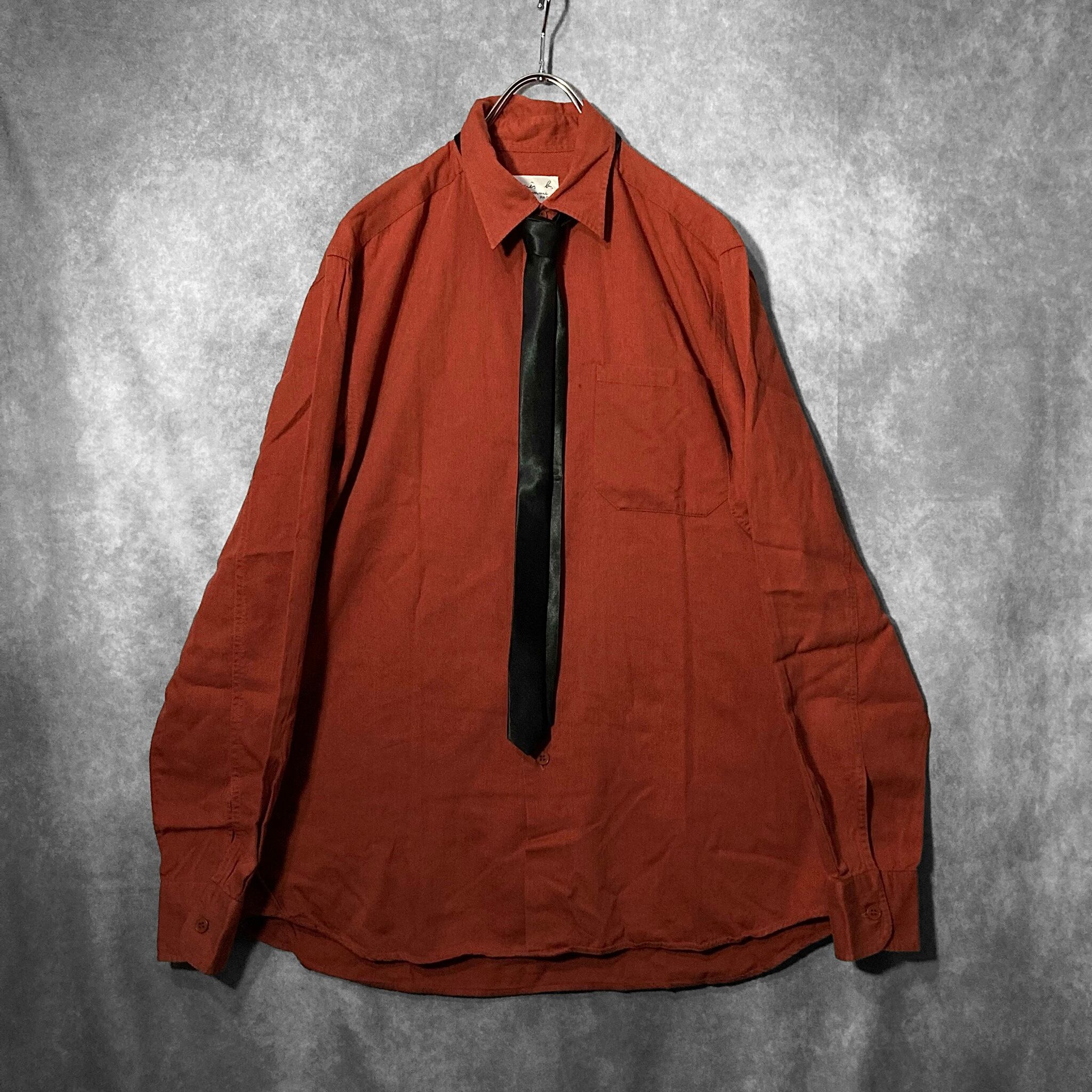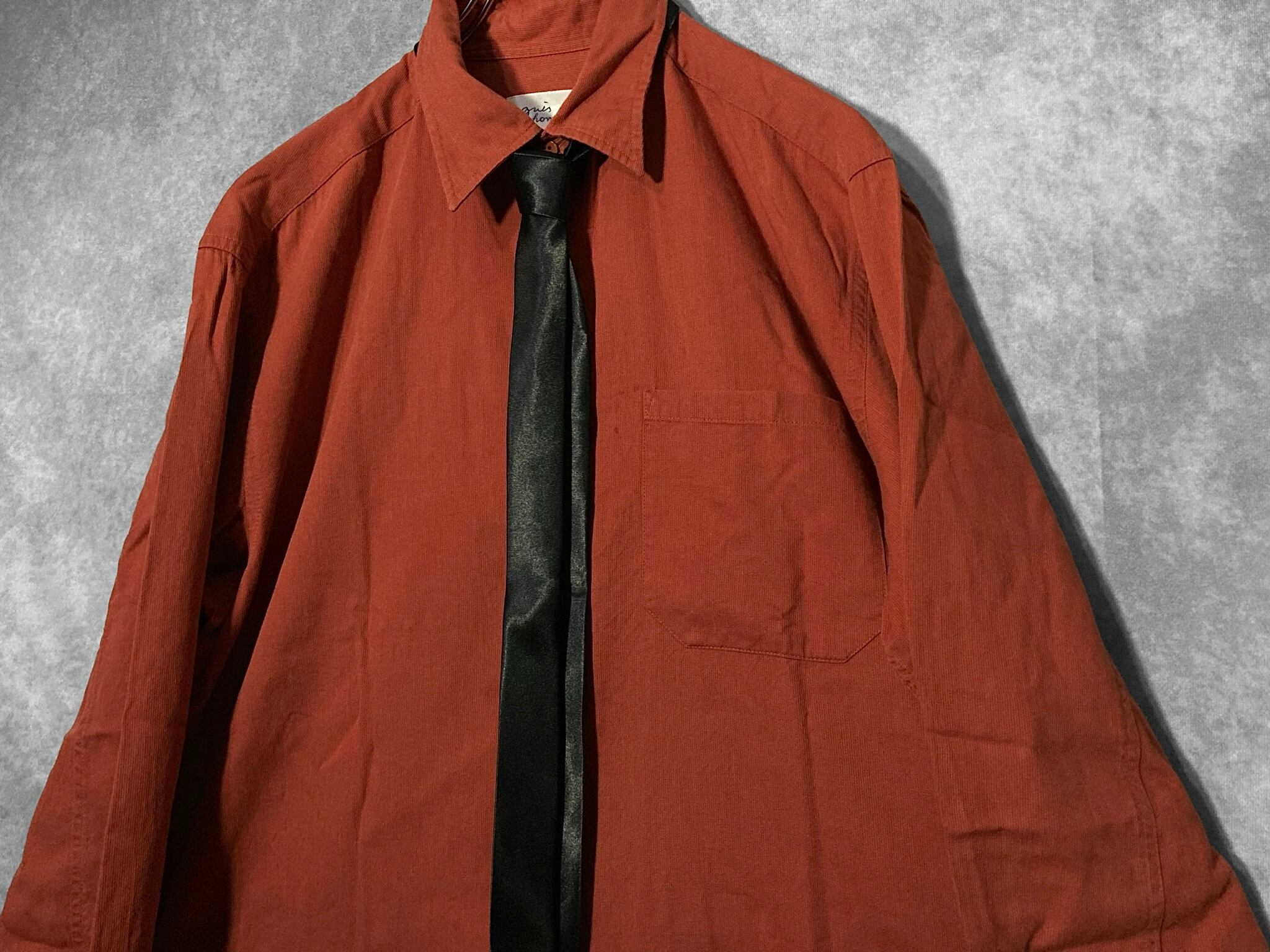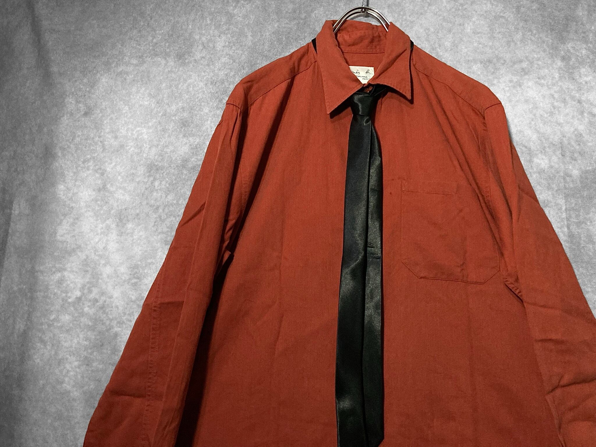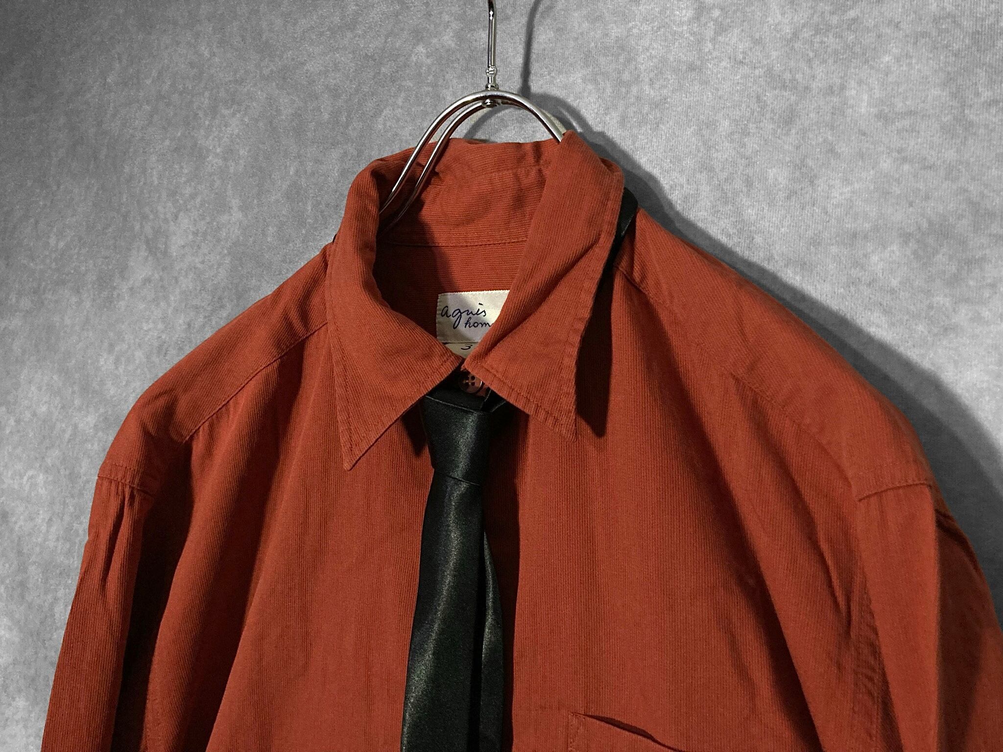 【agnes b】Corduroy fabric Orange color design L/S shirt and Glossy Black color Necktie coordinate set