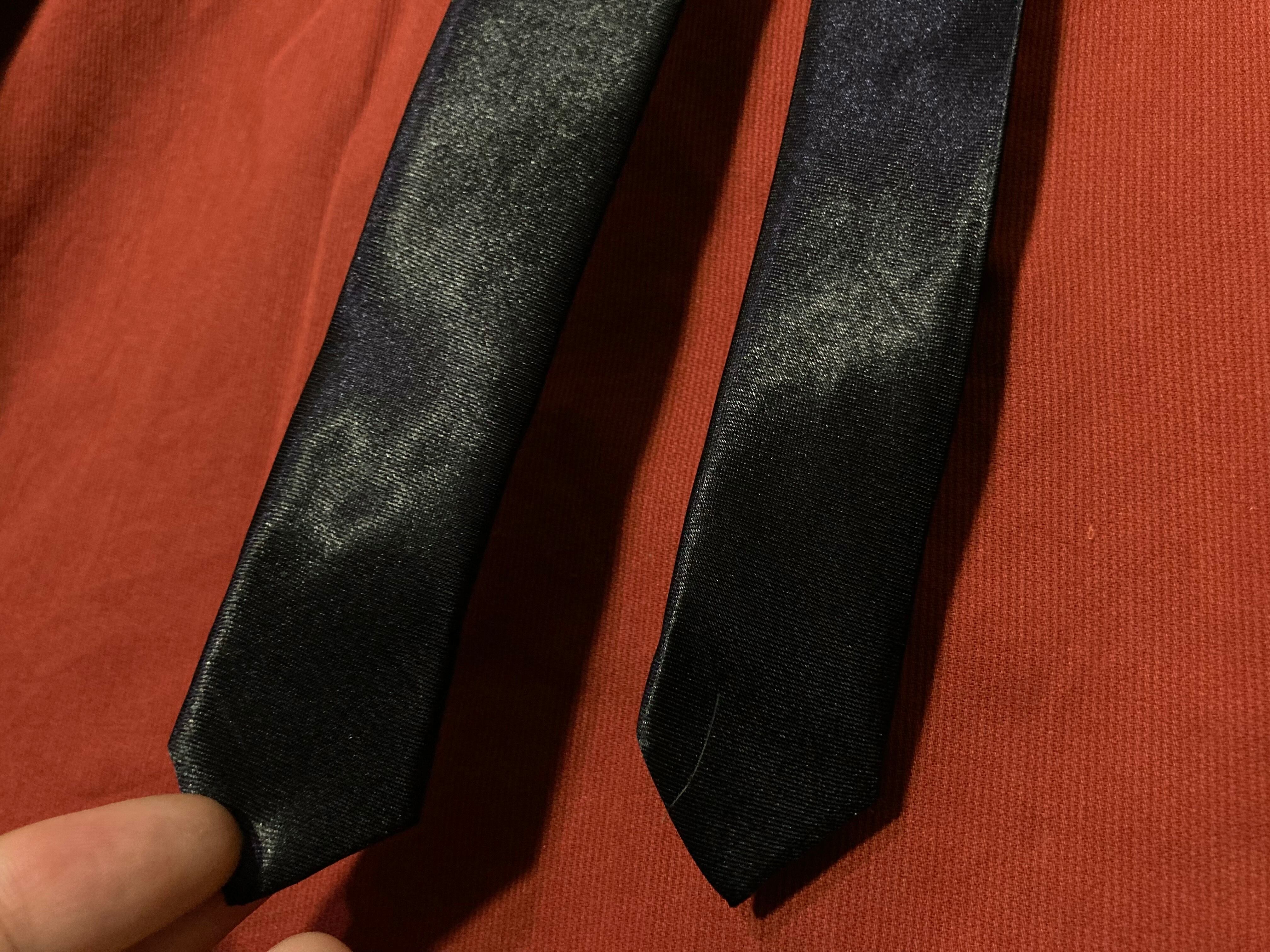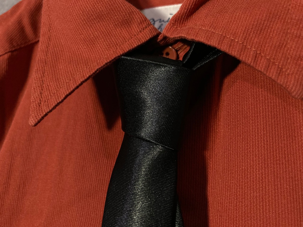薄手の春仕様コーデュロイシャツとサテンライクな無地の黒ネクタイを合わせたシャツコーデ。