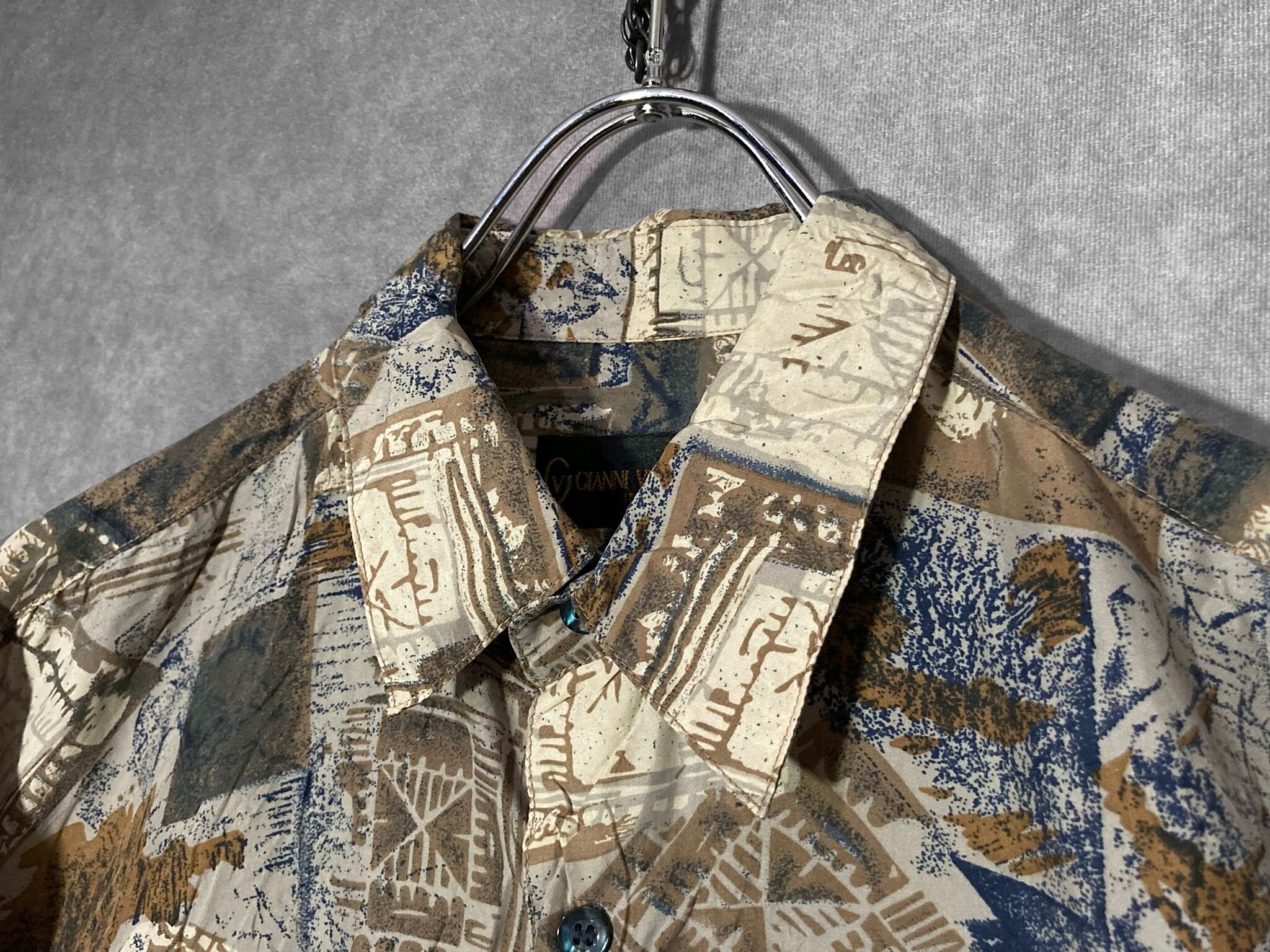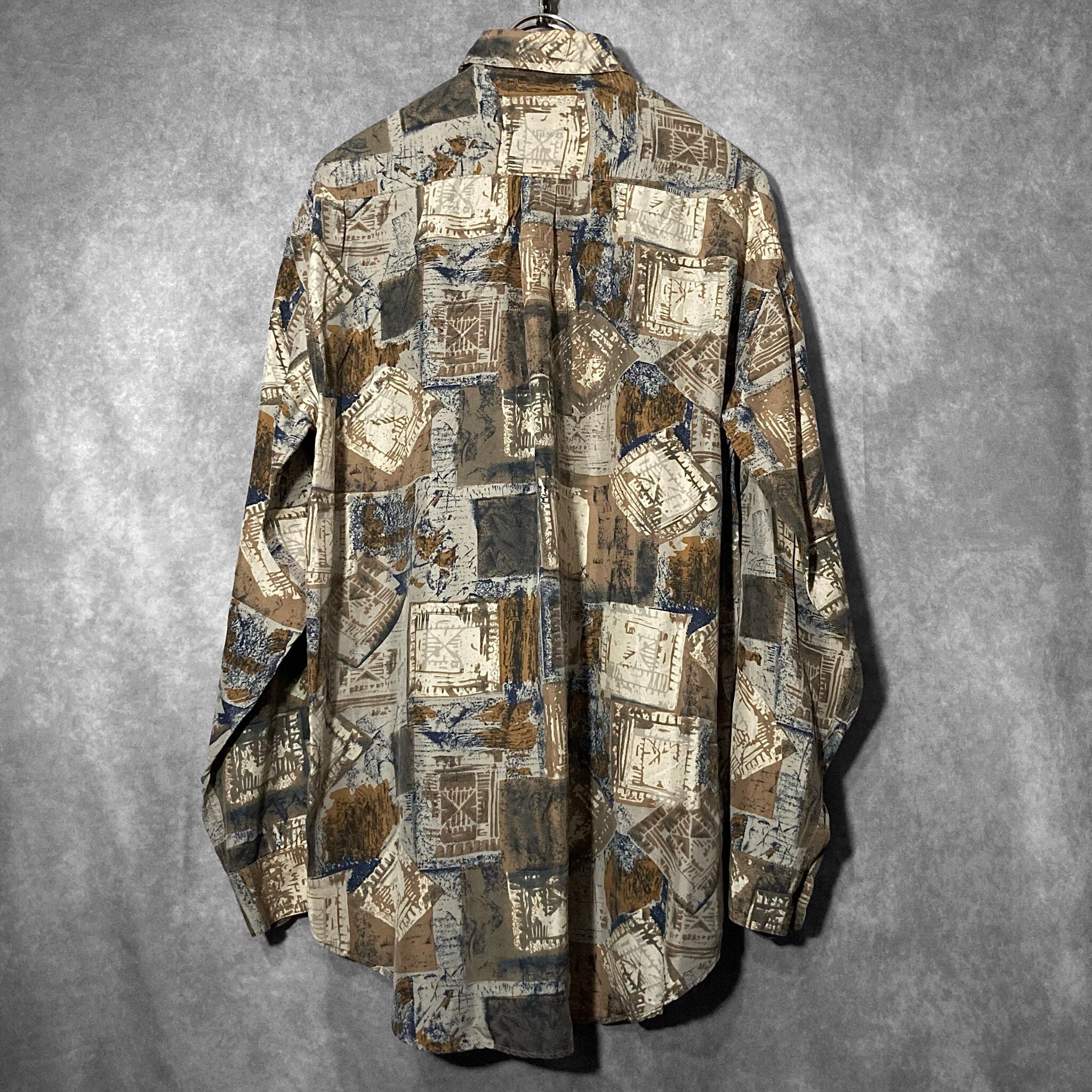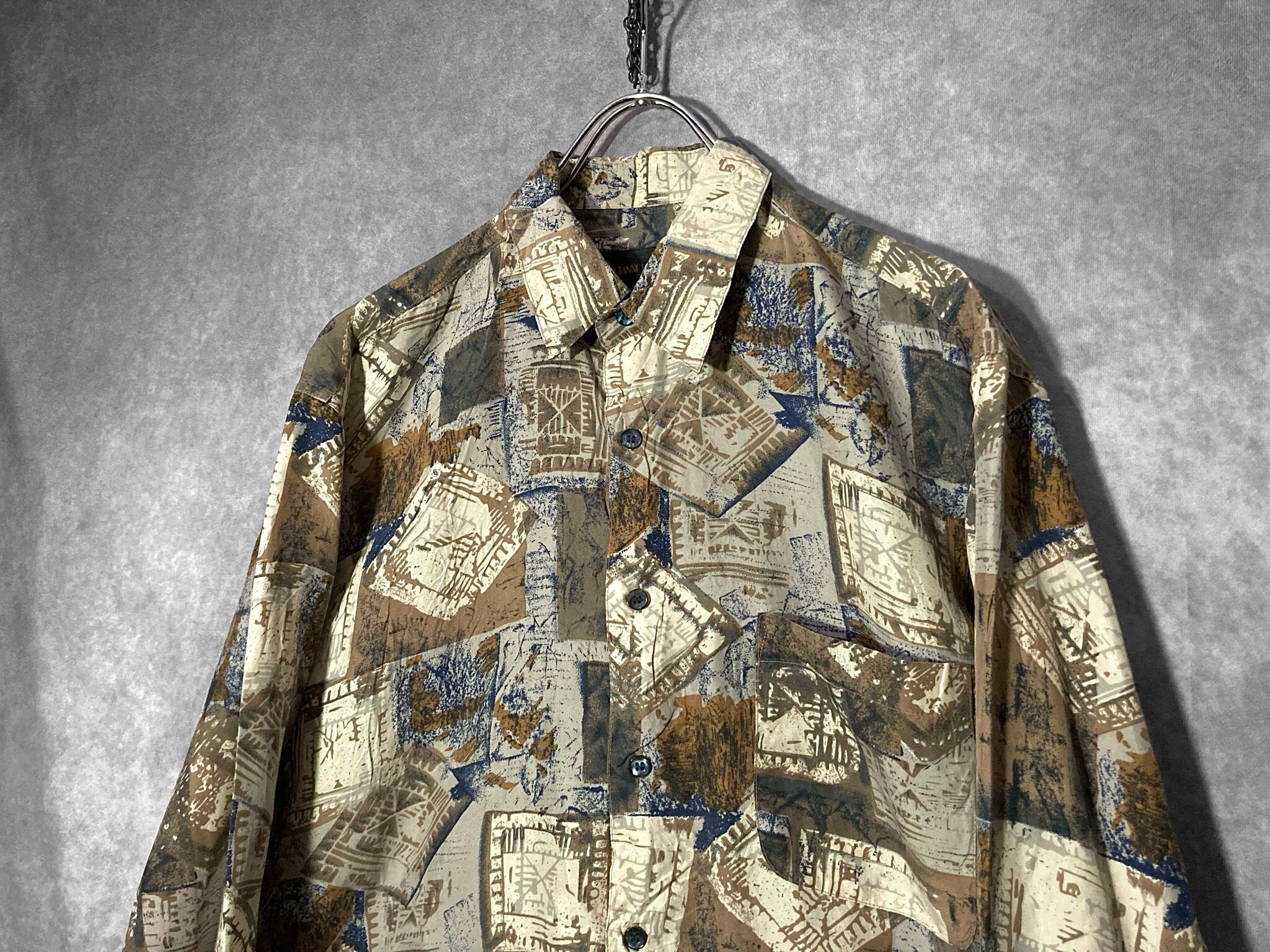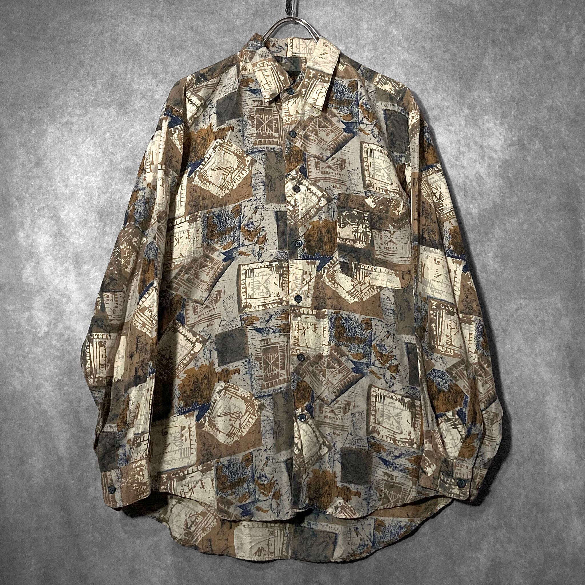 何重にもパターンを重ねて作りあげたようなアーティスティックなデザインが目を惹く総柄シャツ。