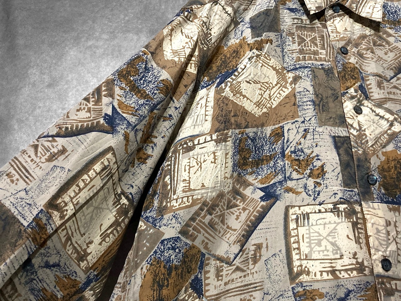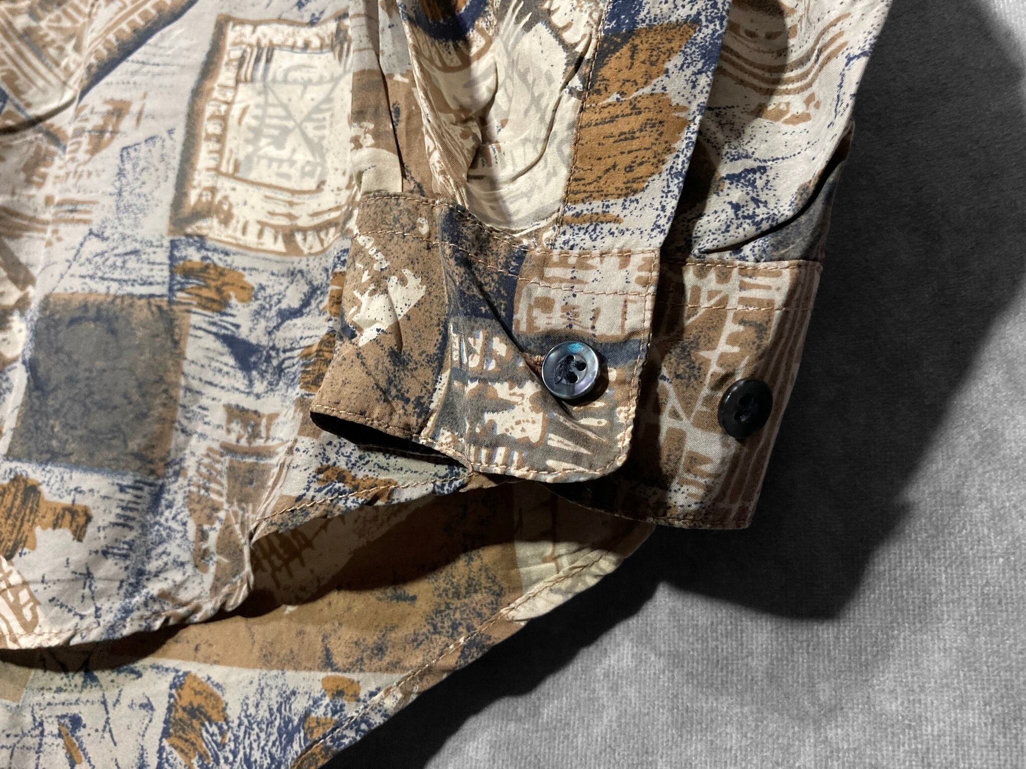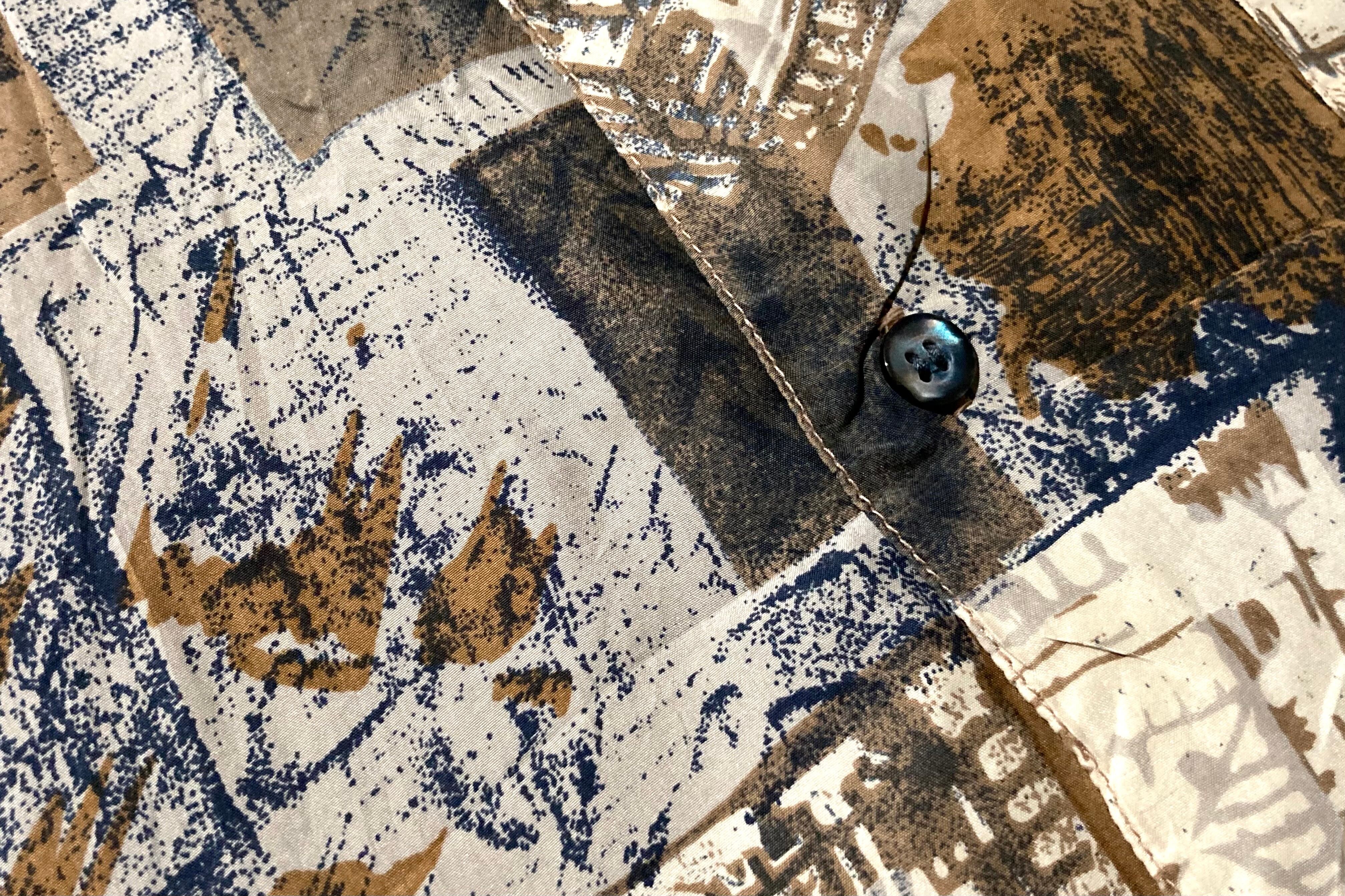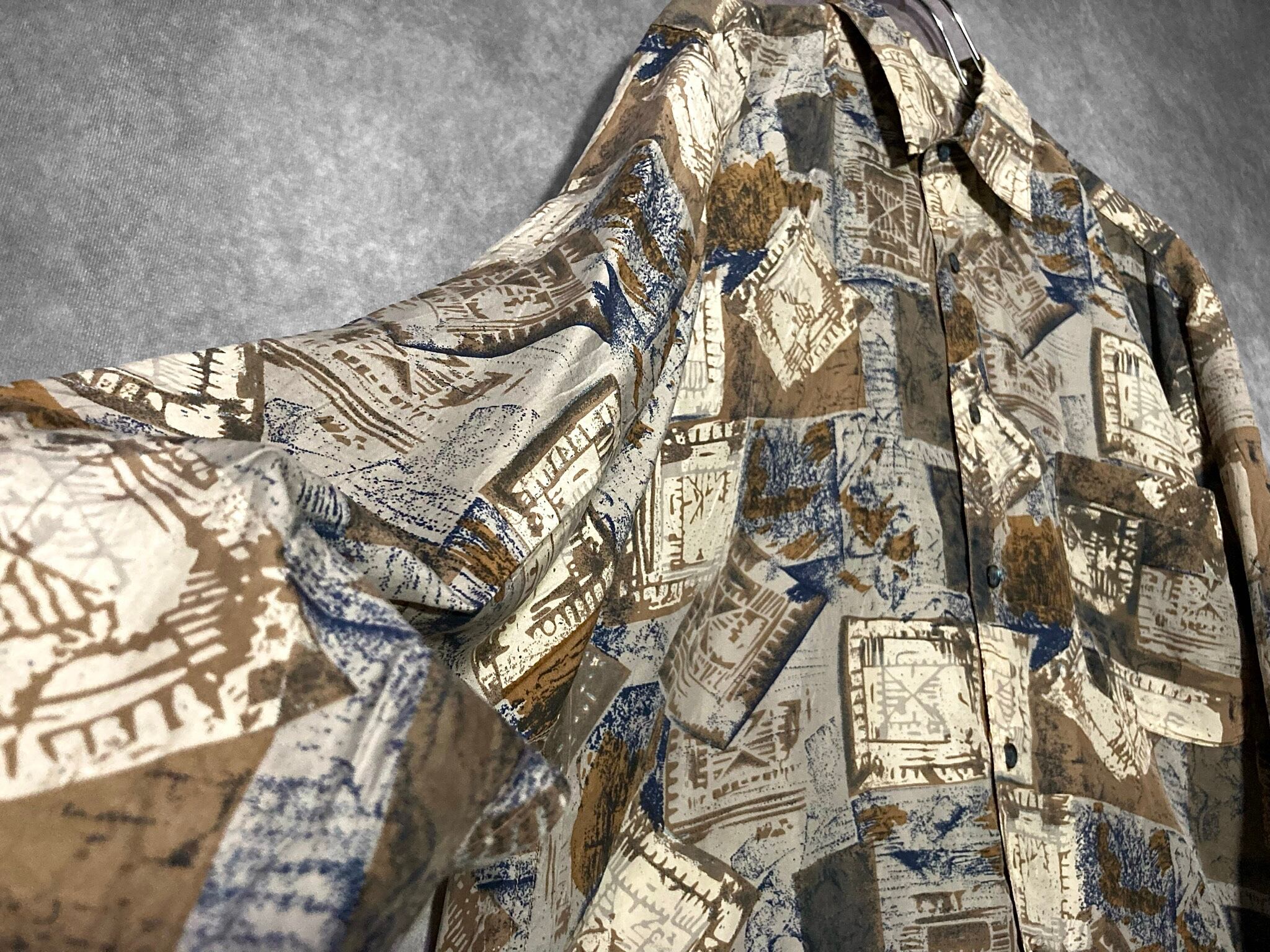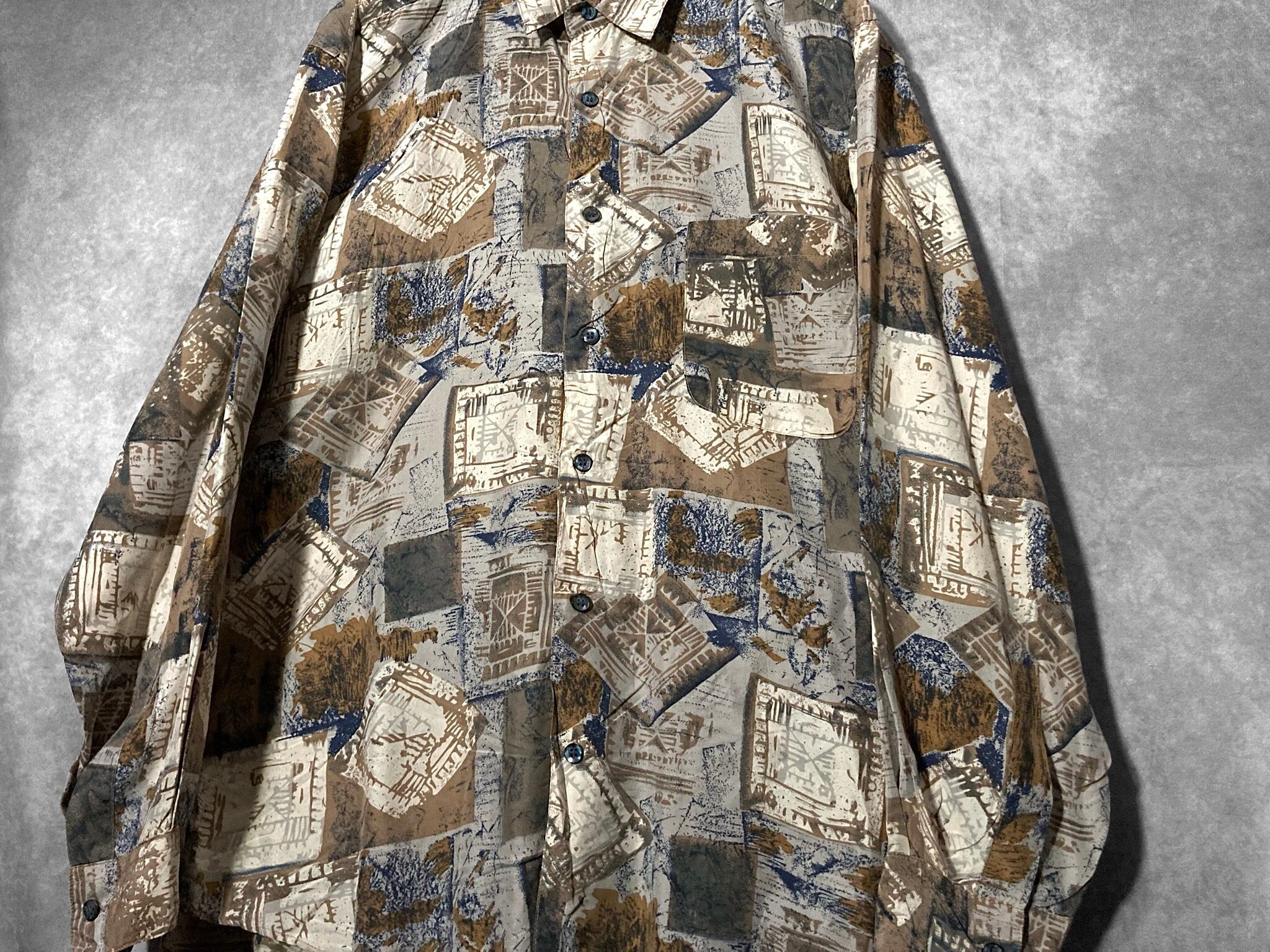何重にもパターンを重ねて作りあげたようなアーティスティックなデザインが目を惹く総柄シャツ。