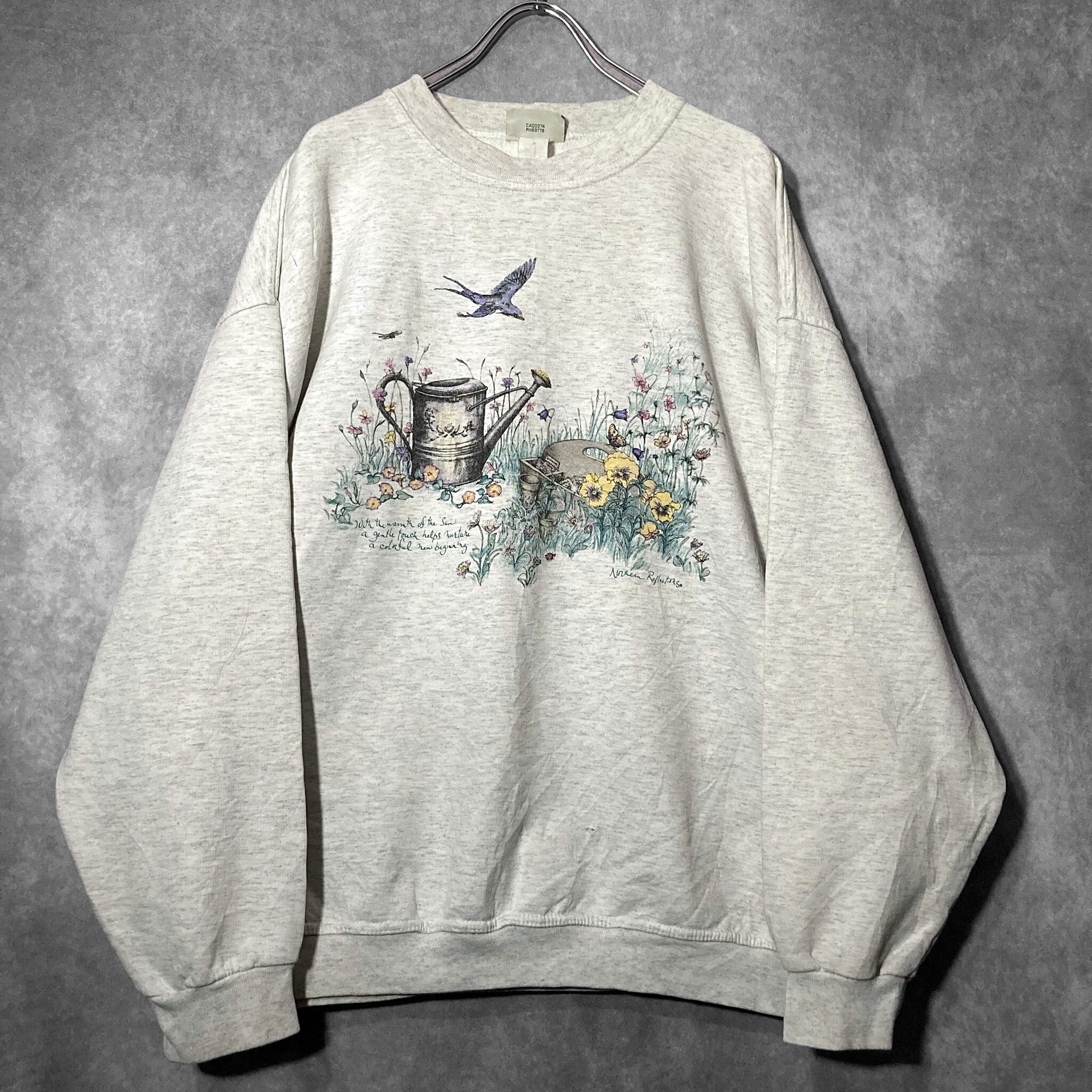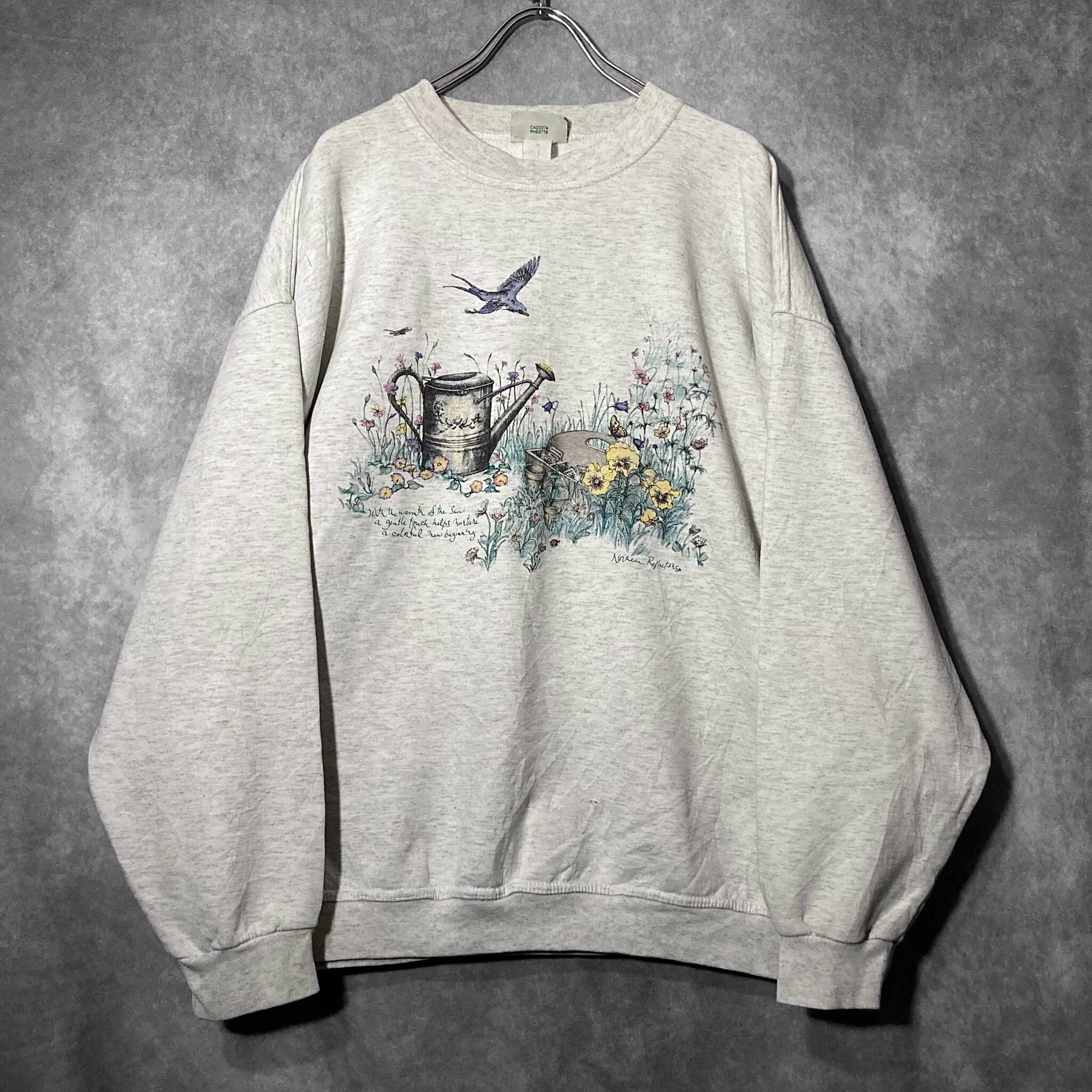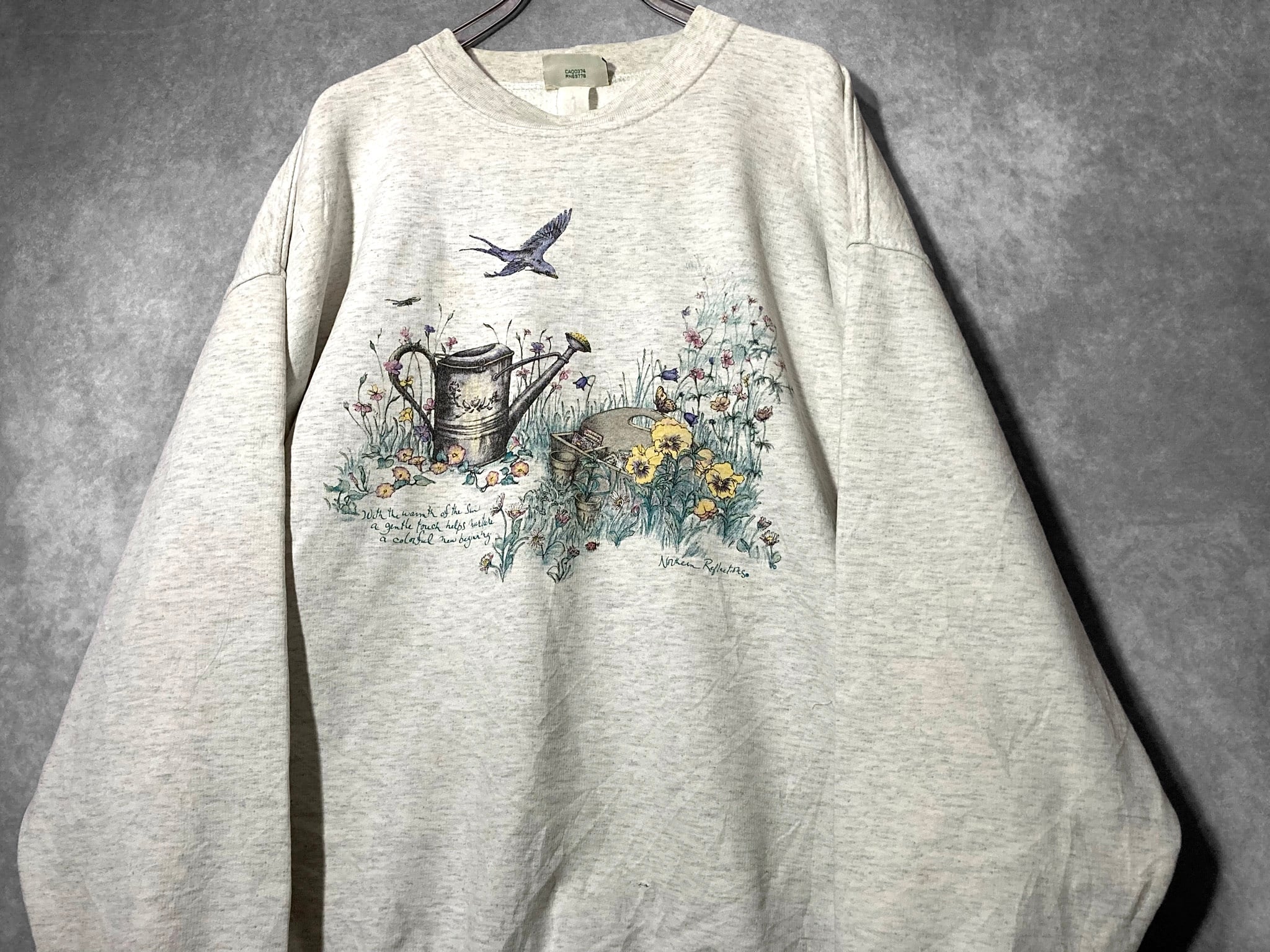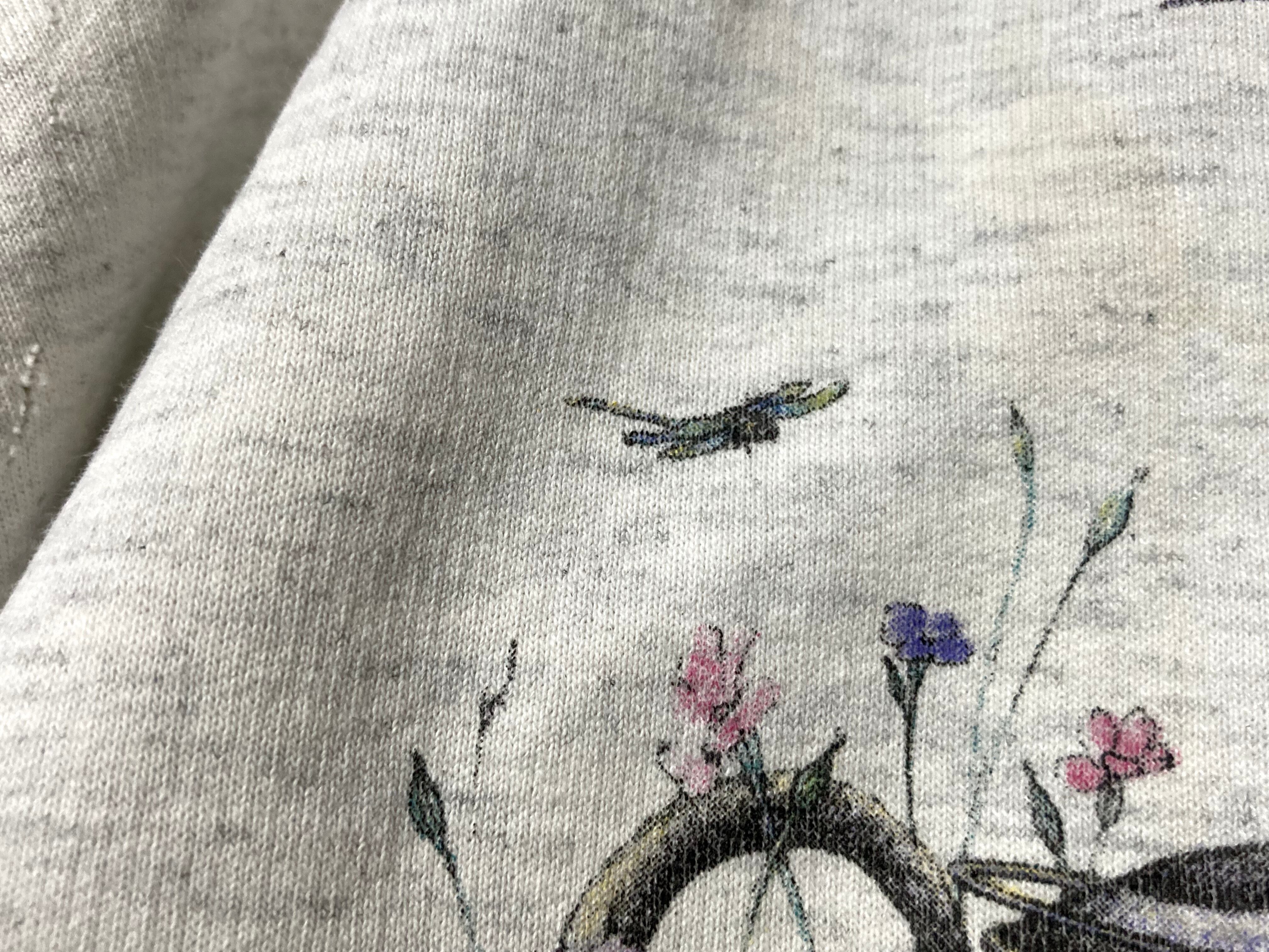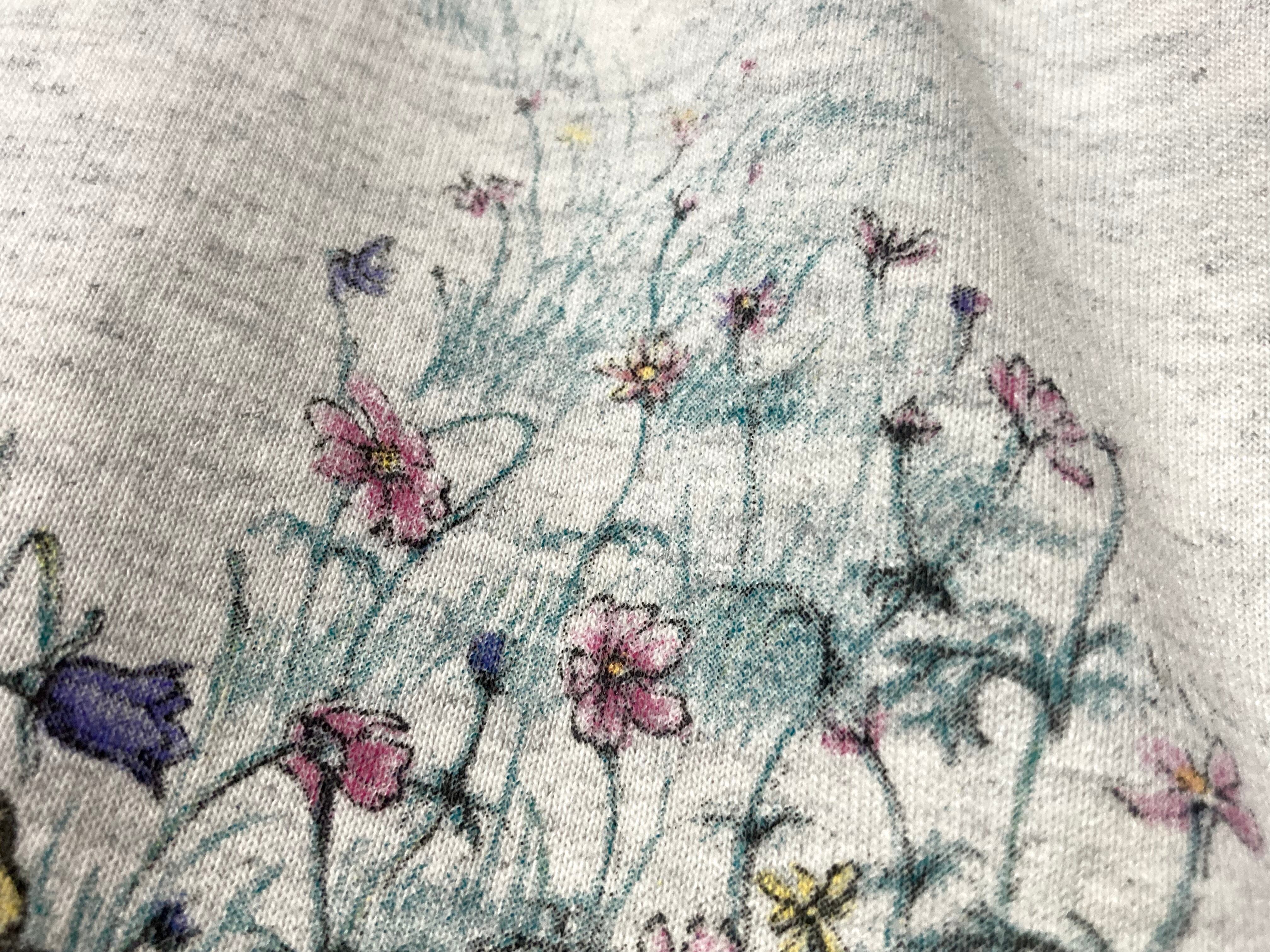 杢調のオフホワイトに春の訪れを告げるような色彩豊かなお花と引き寄せられる小鳥さんがデザインされたプリントスウェット。
