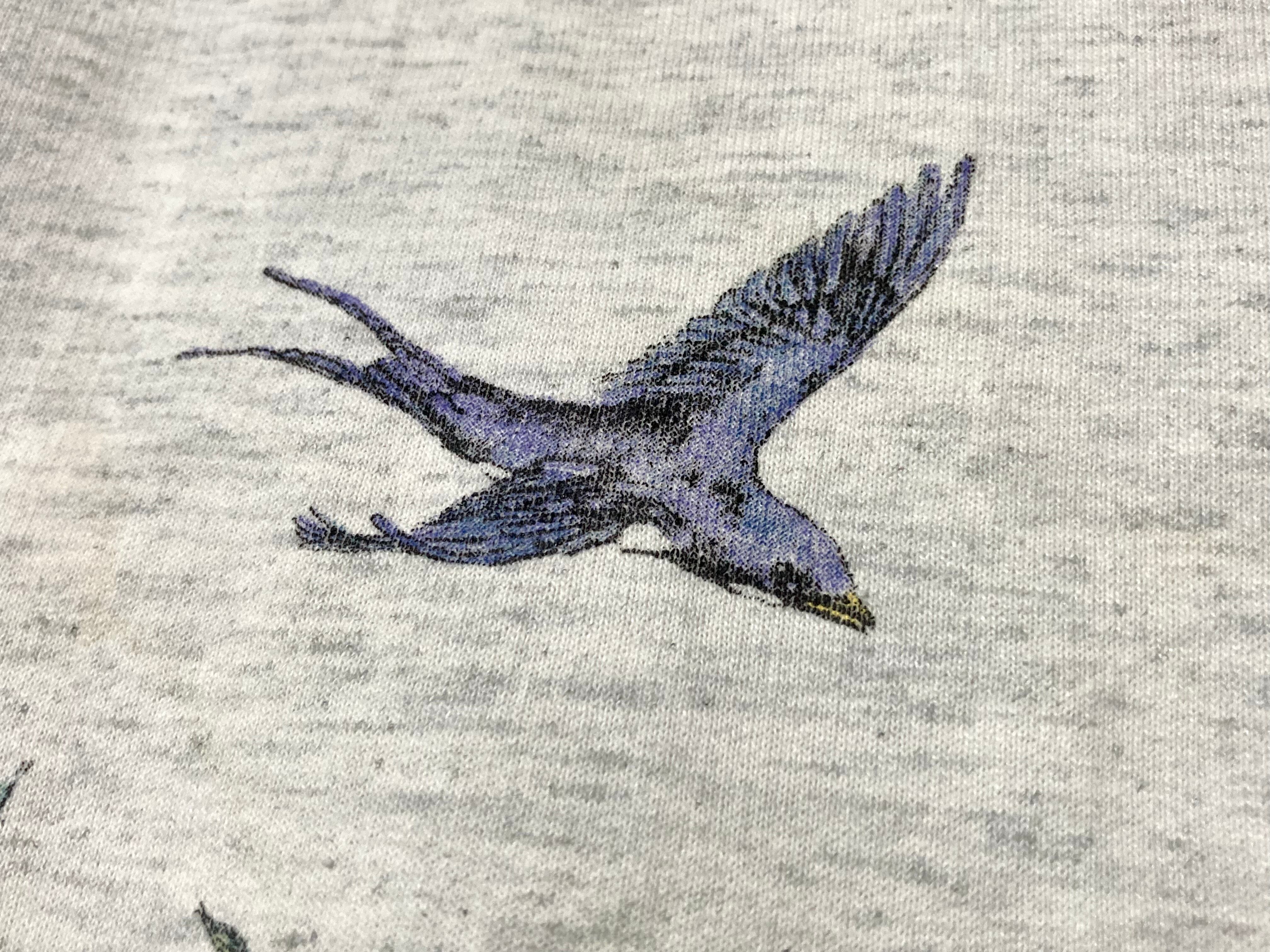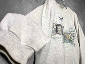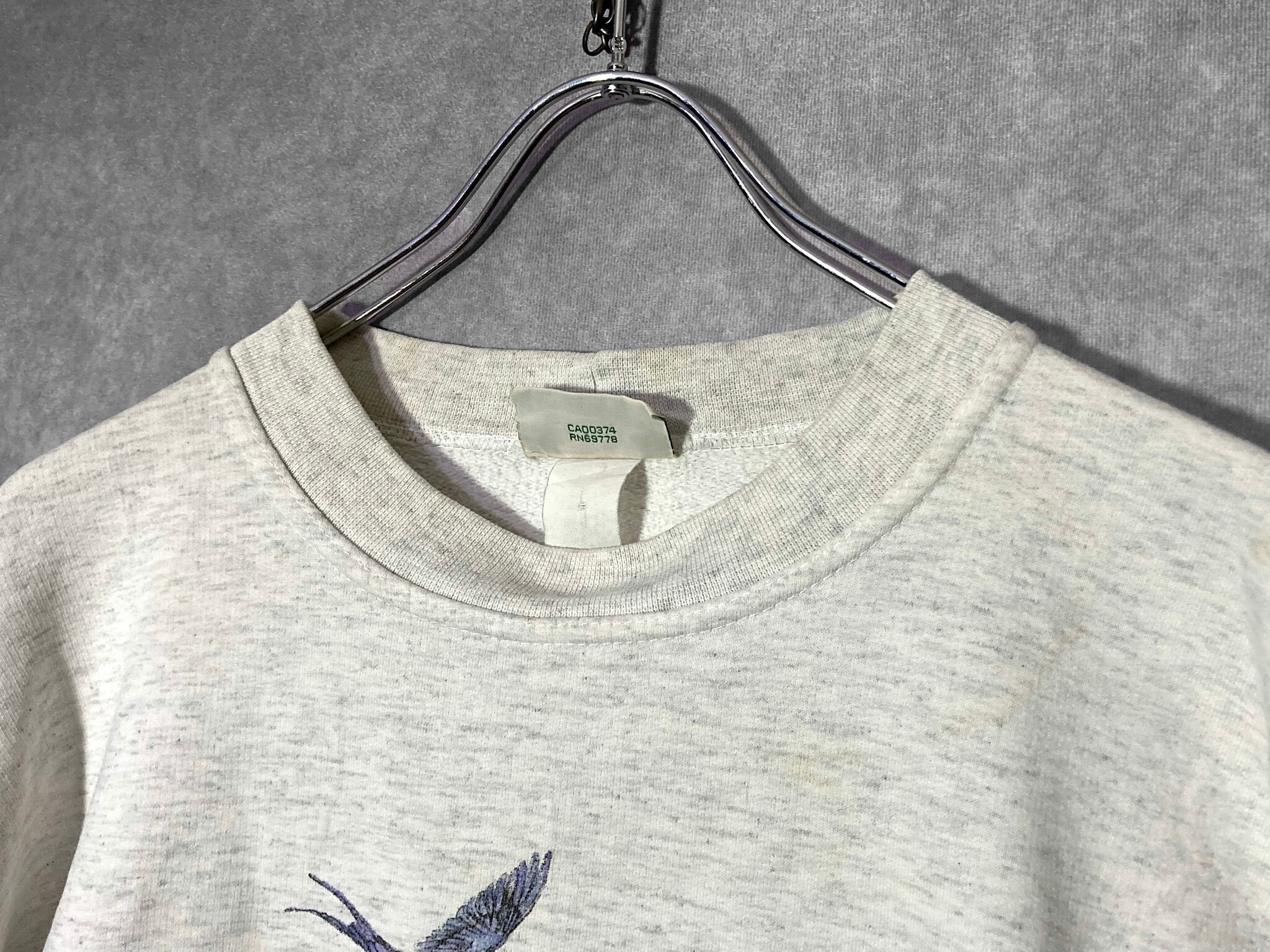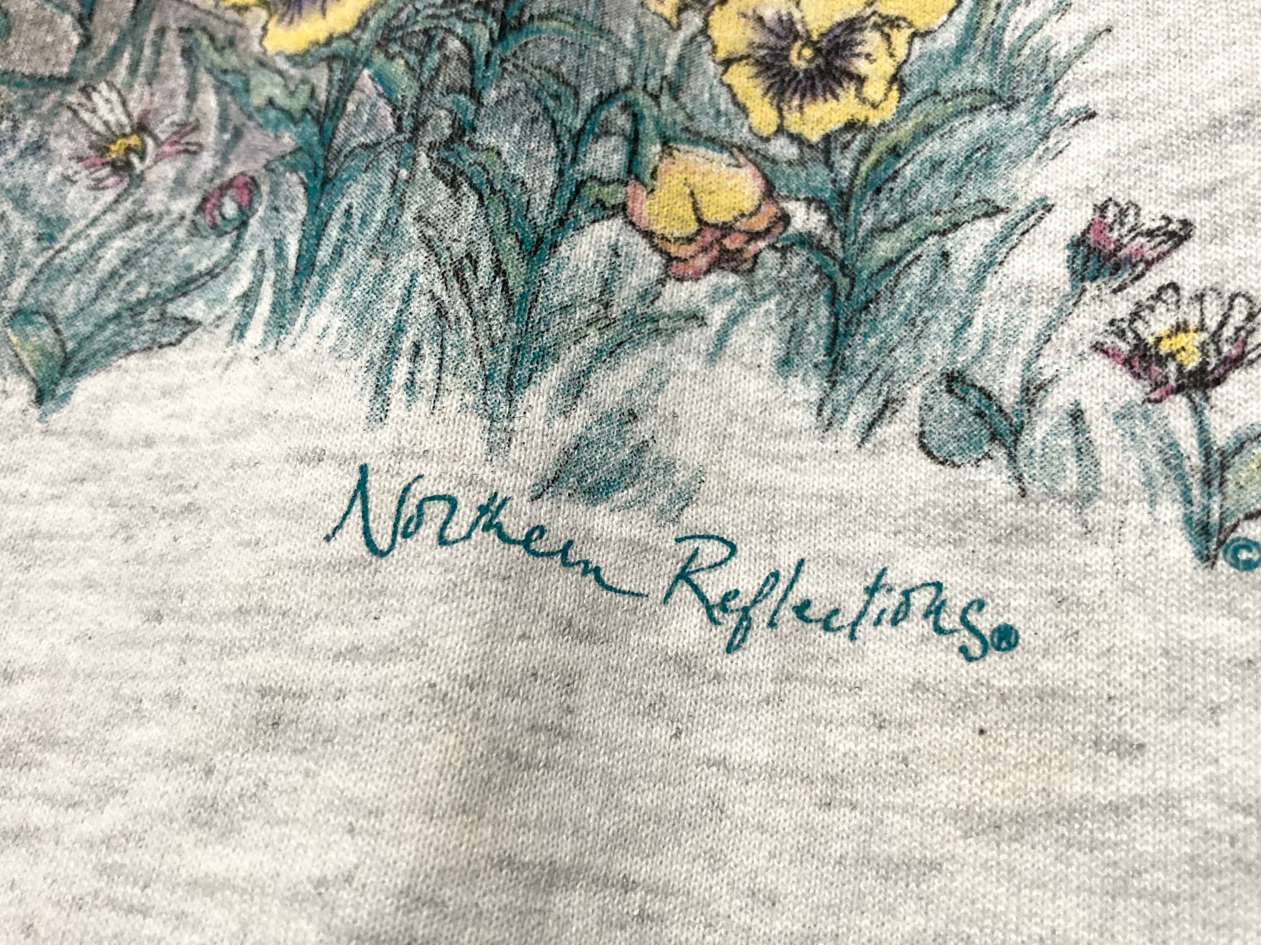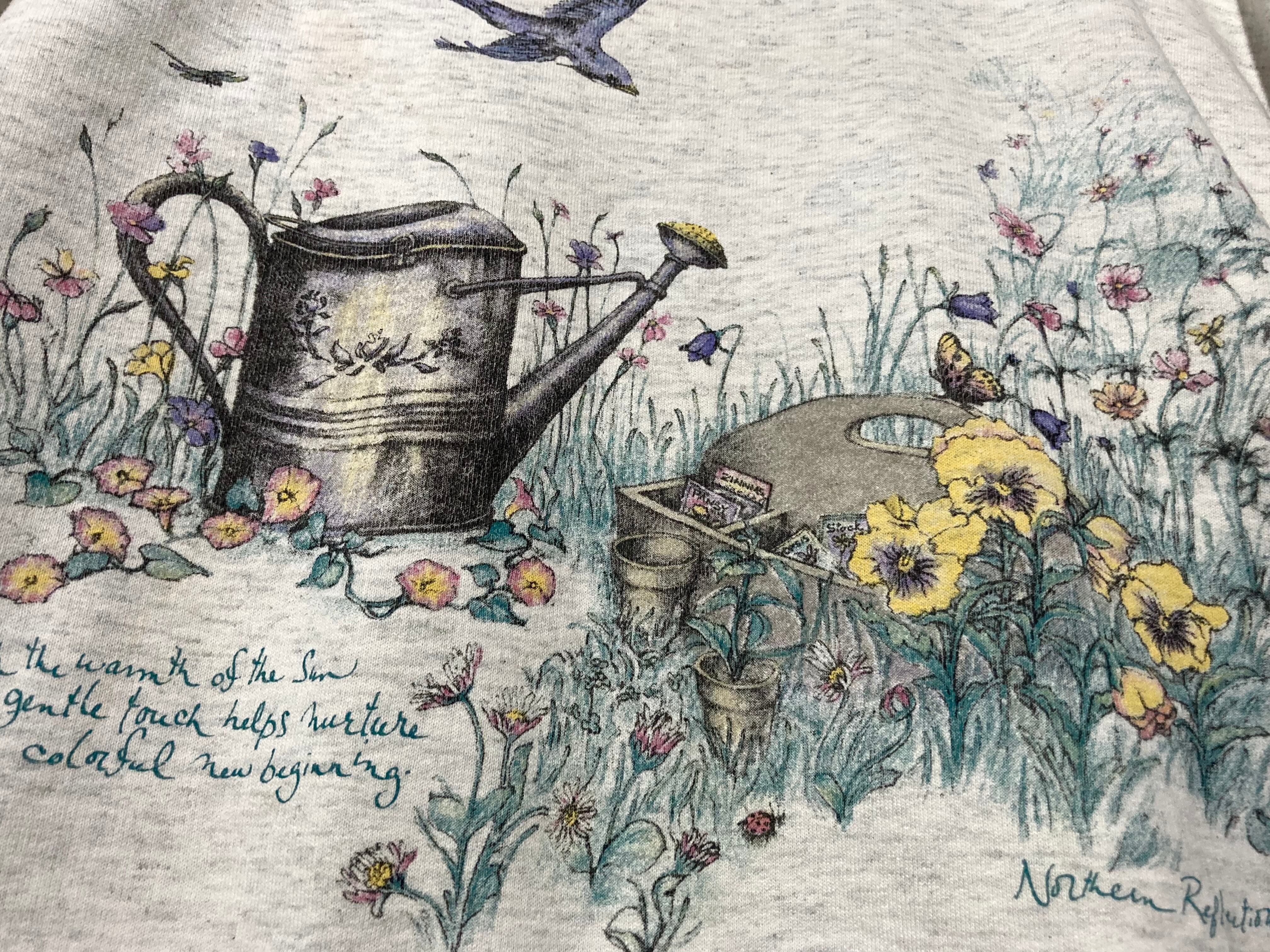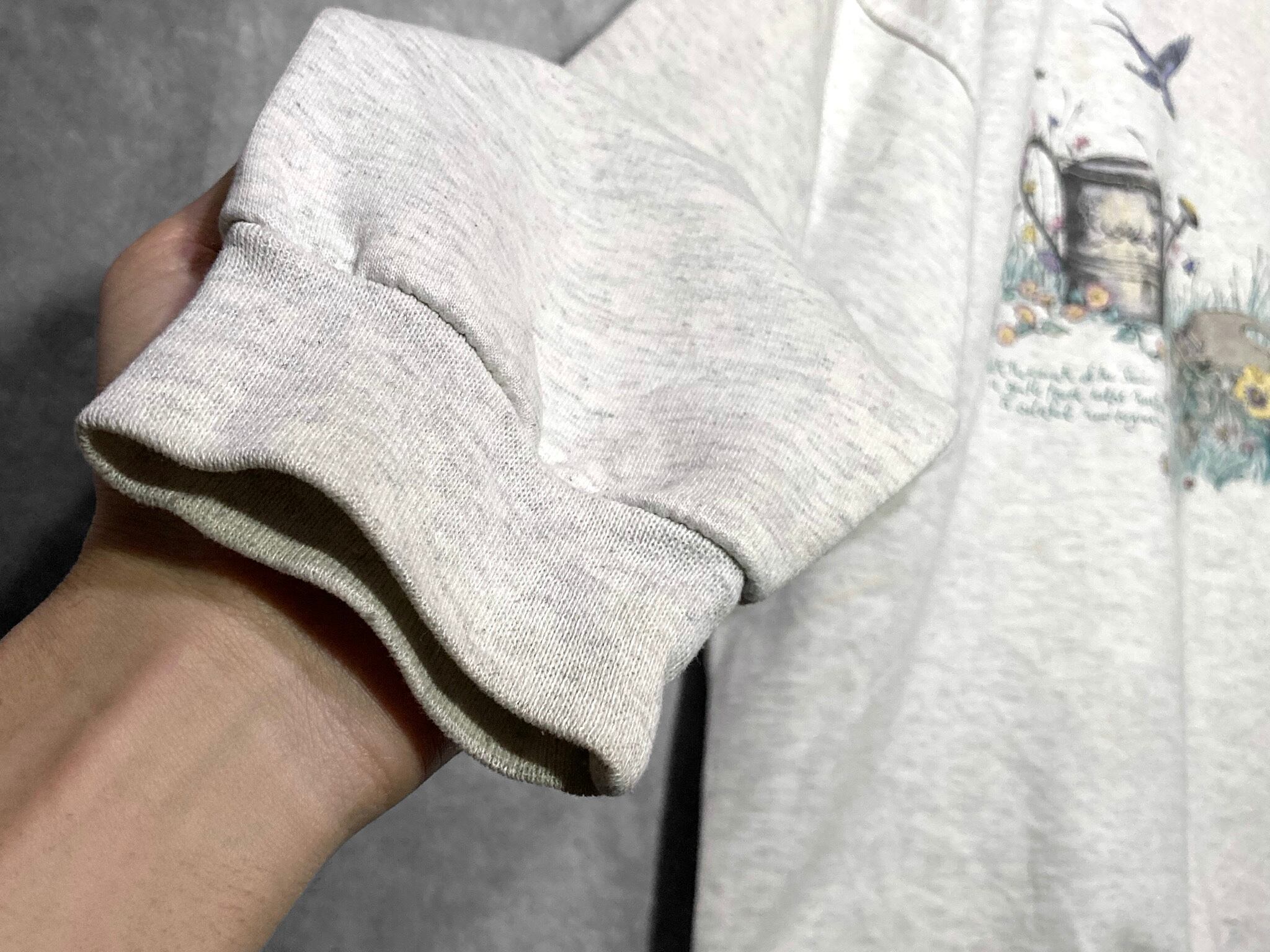 杢調のオフホワイトに春の訪れを告げるような色彩豊かなお花と引き寄せられる小鳥さんがデザインされたプリントスウェット。