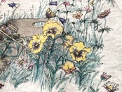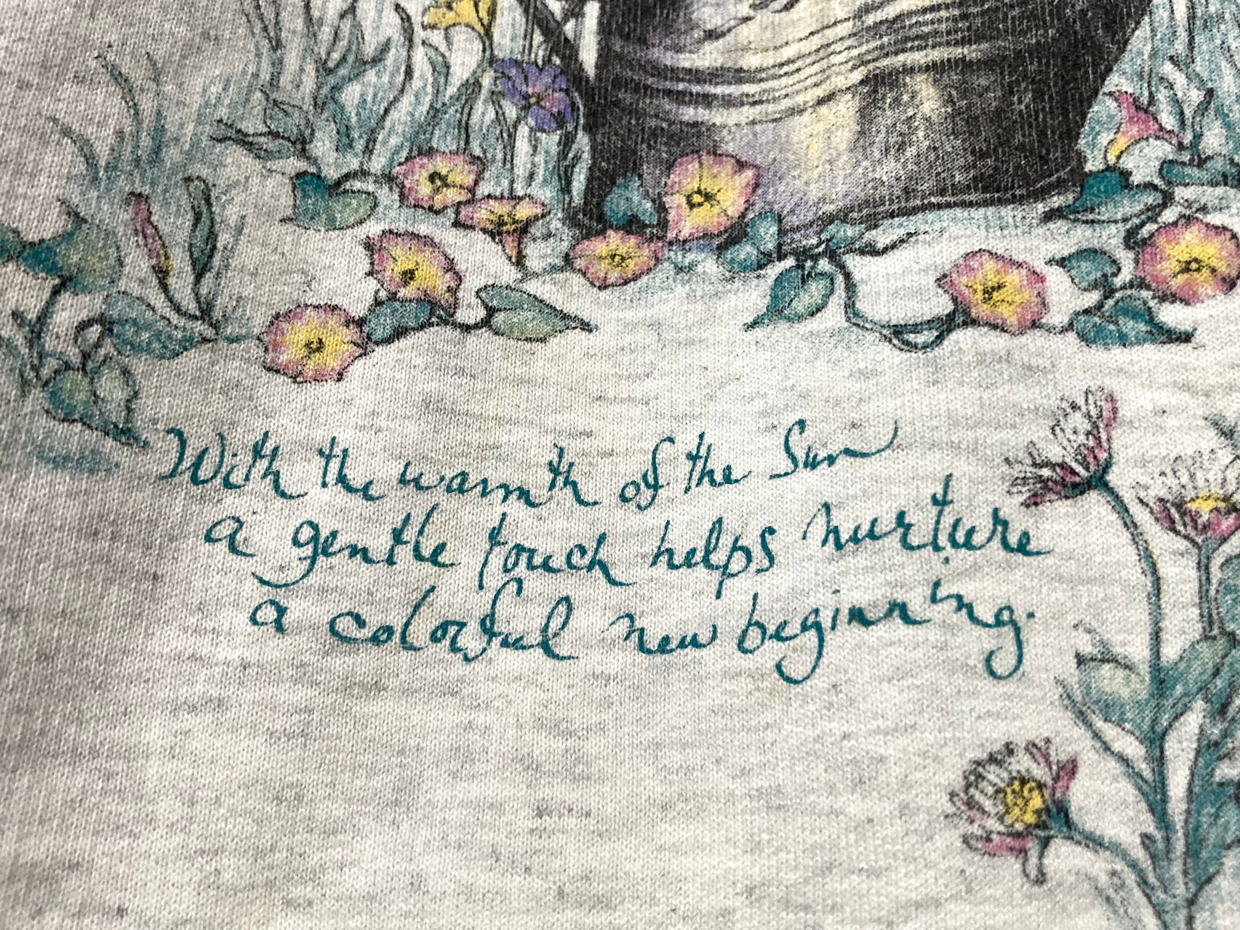 陽の光を浴びて咲いた花のそばには花の型押しがされた如雨露(じょうろ)が置かれたかわいいデザイン。