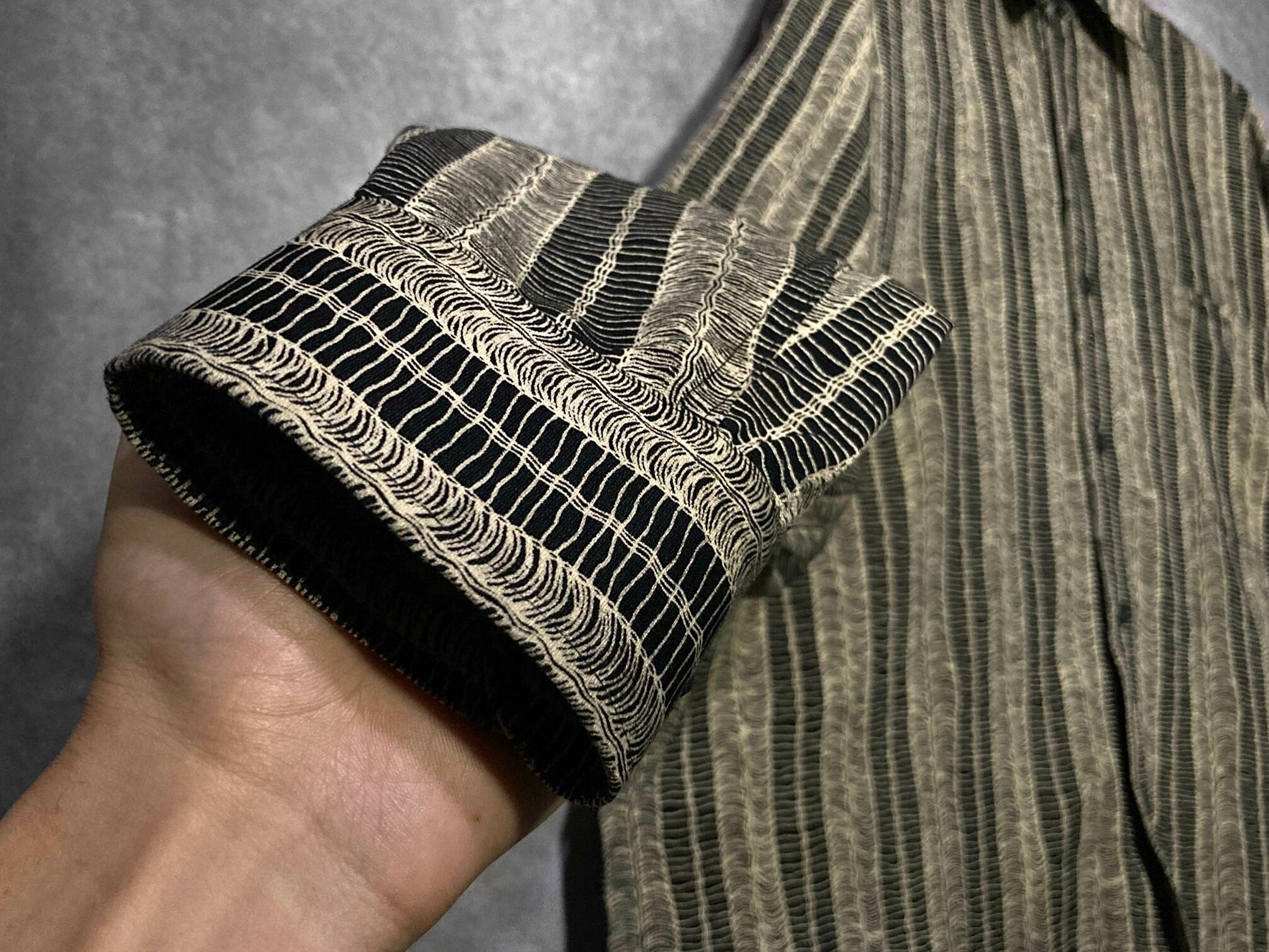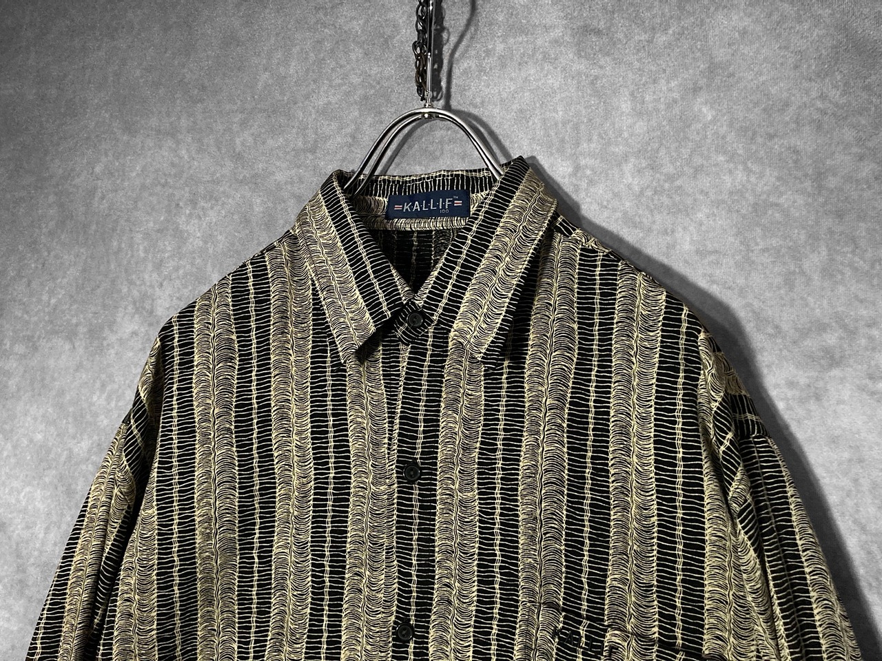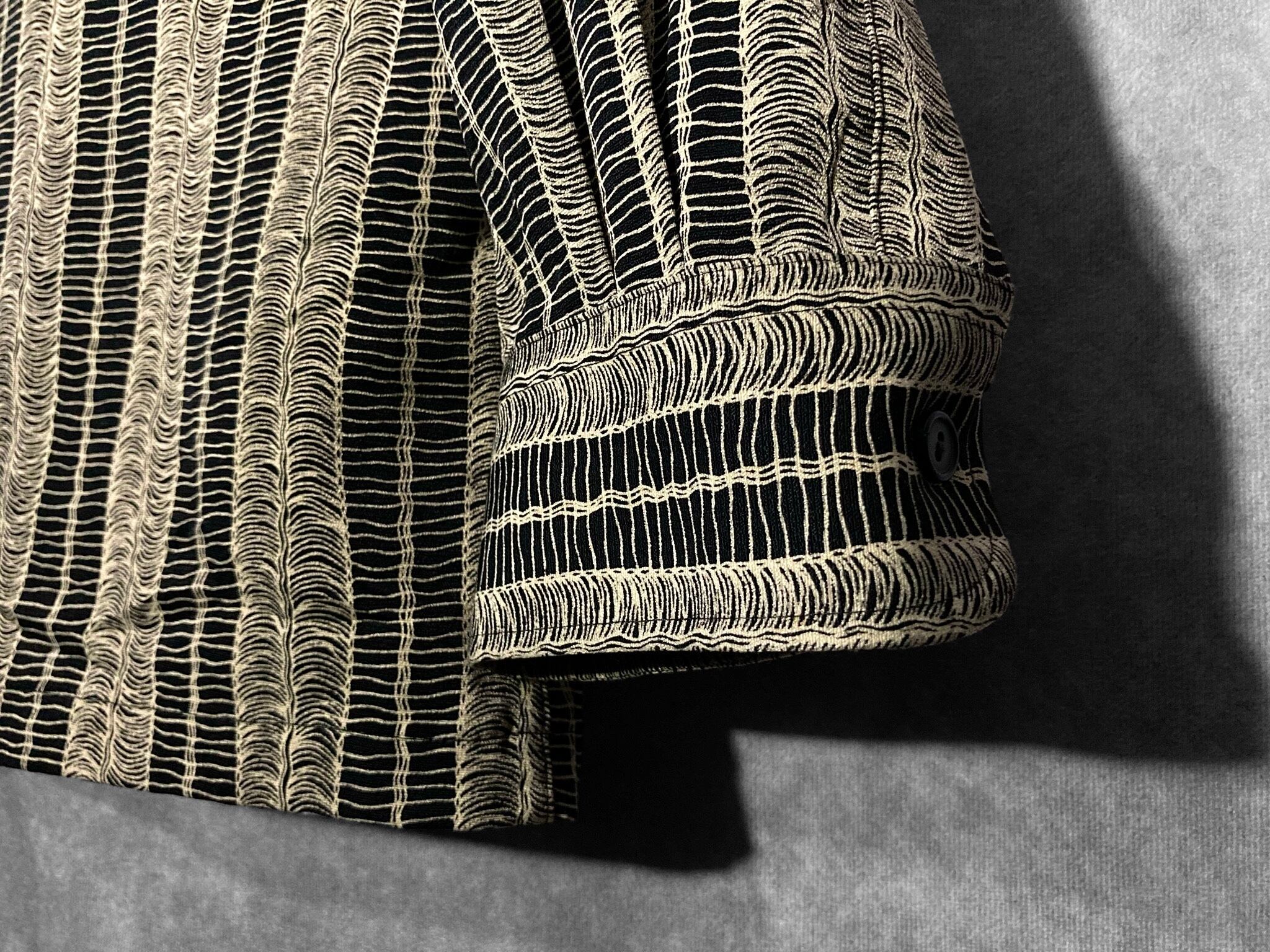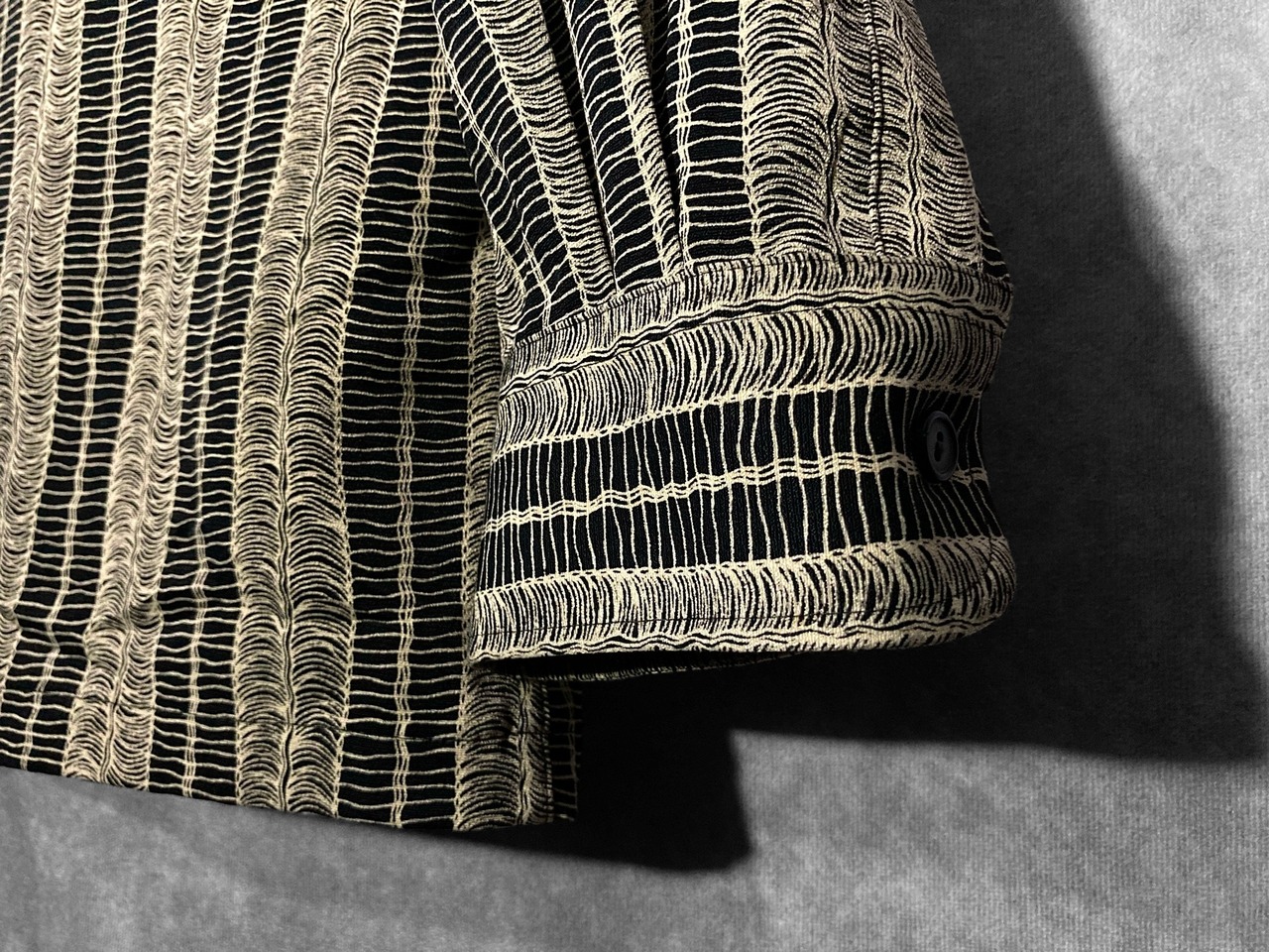 生地の編み目をほどいたような個性的なパターンの総柄シャツ。