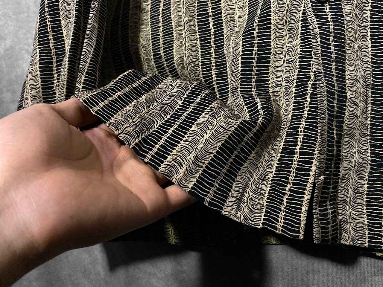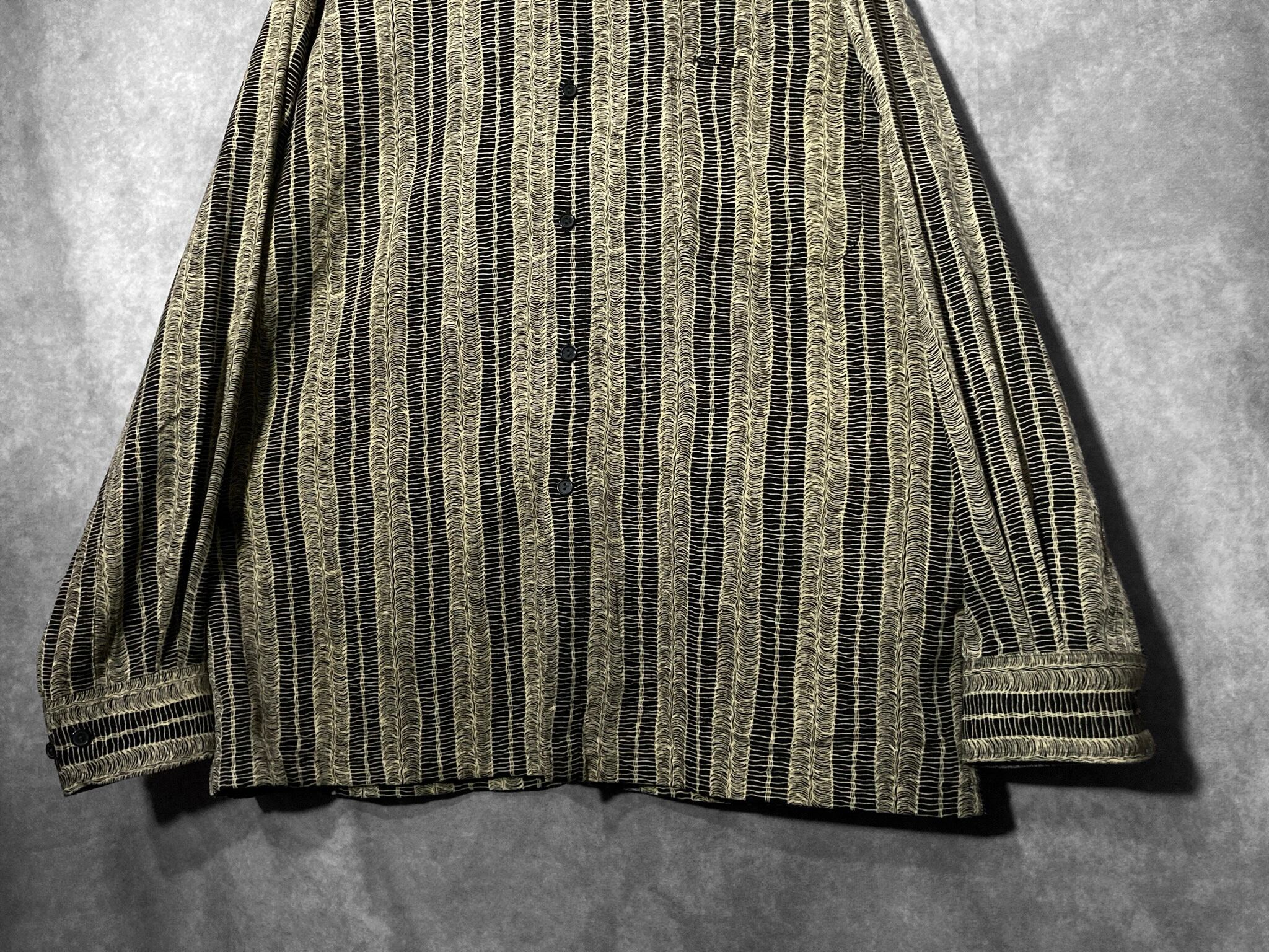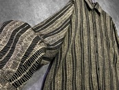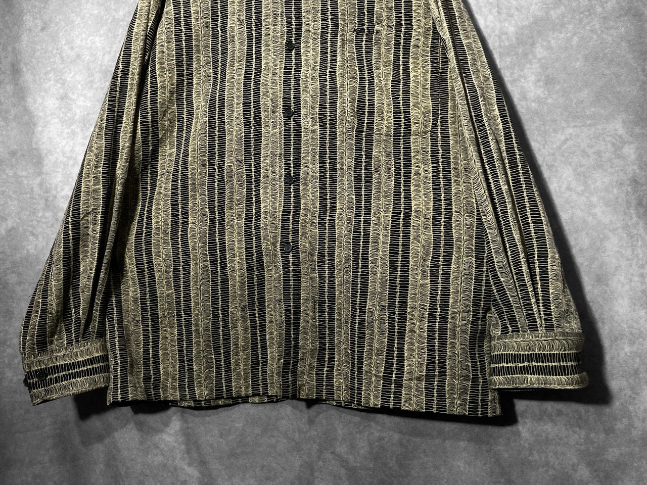 生地の編み目をほどいたような個性的なパターンの総柄シャツ。