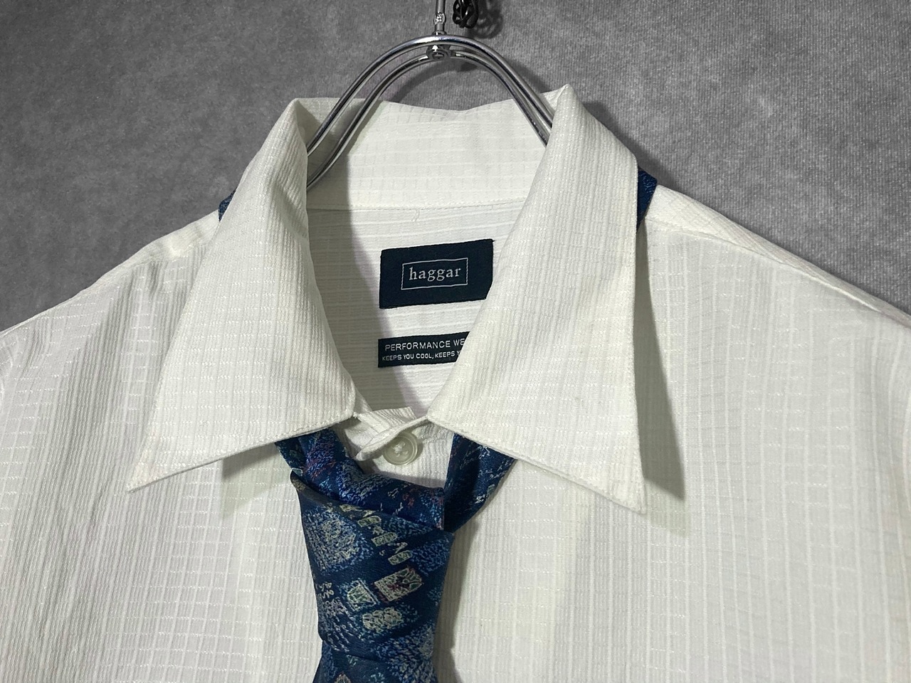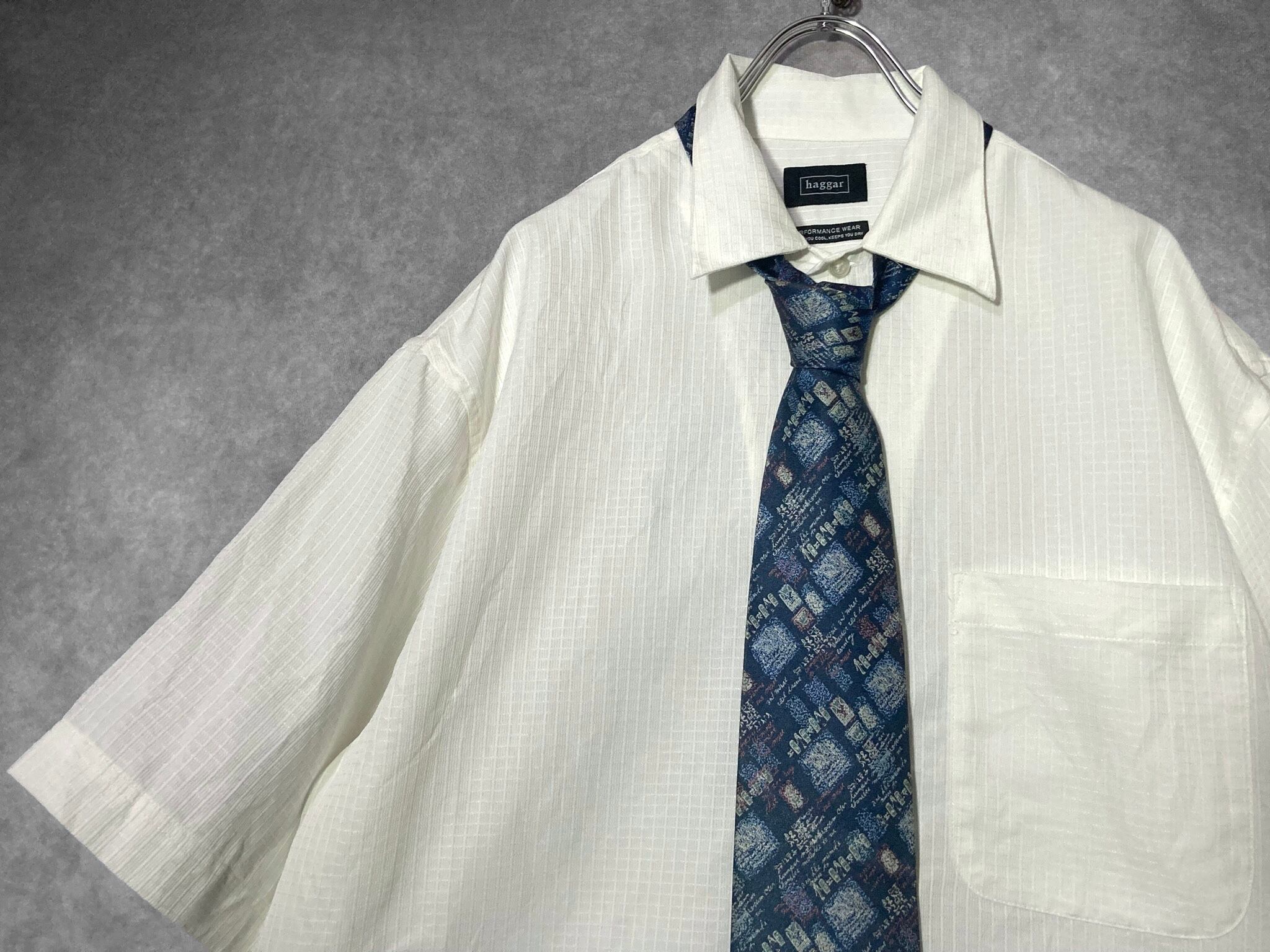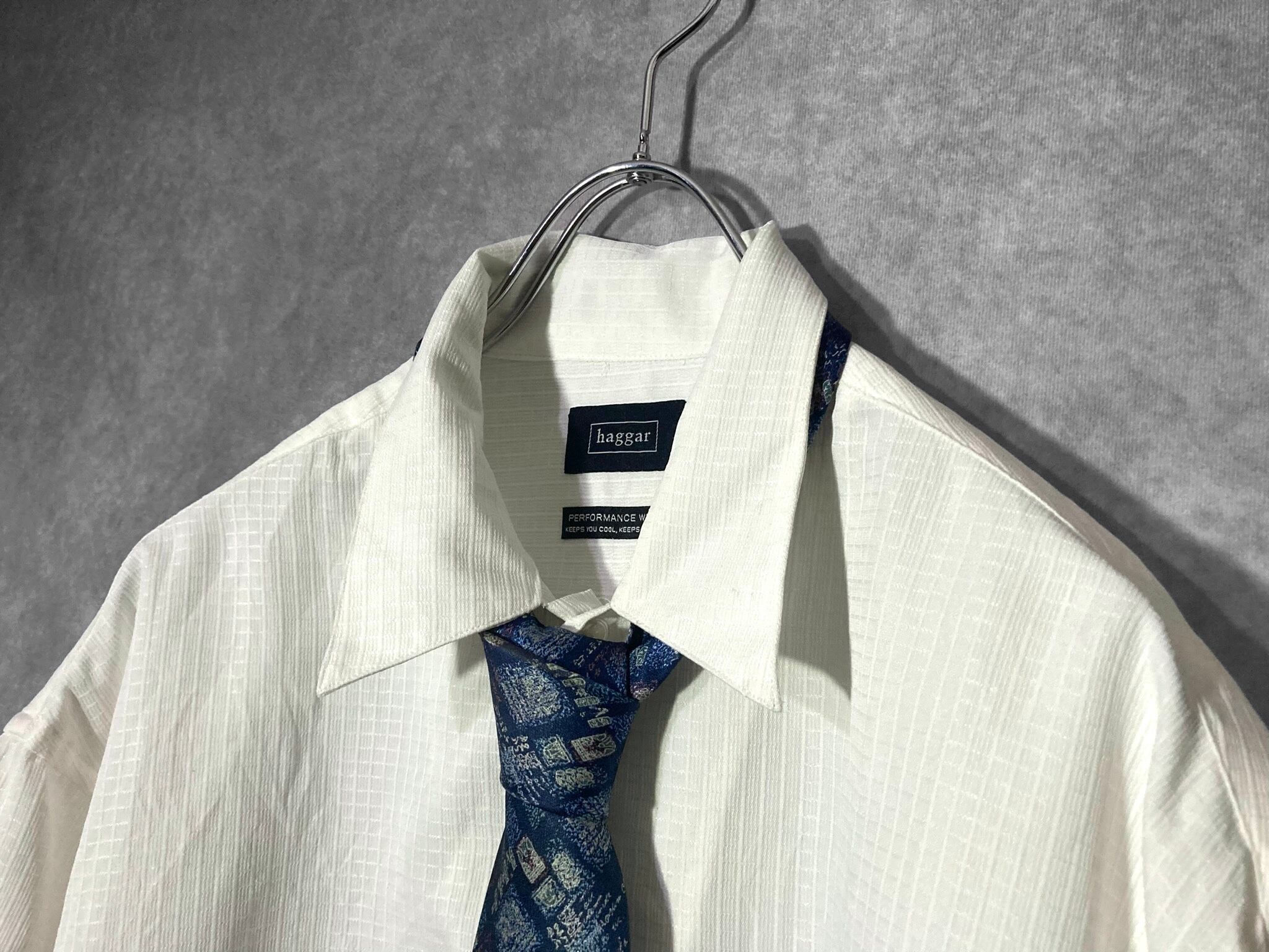 Hagger ブランドより、うっすらと格子模様が浮かび上がるように編まれたデザインのシャツとパキッとした寒冷ブルーのアート柄のデザインネクタイセット。