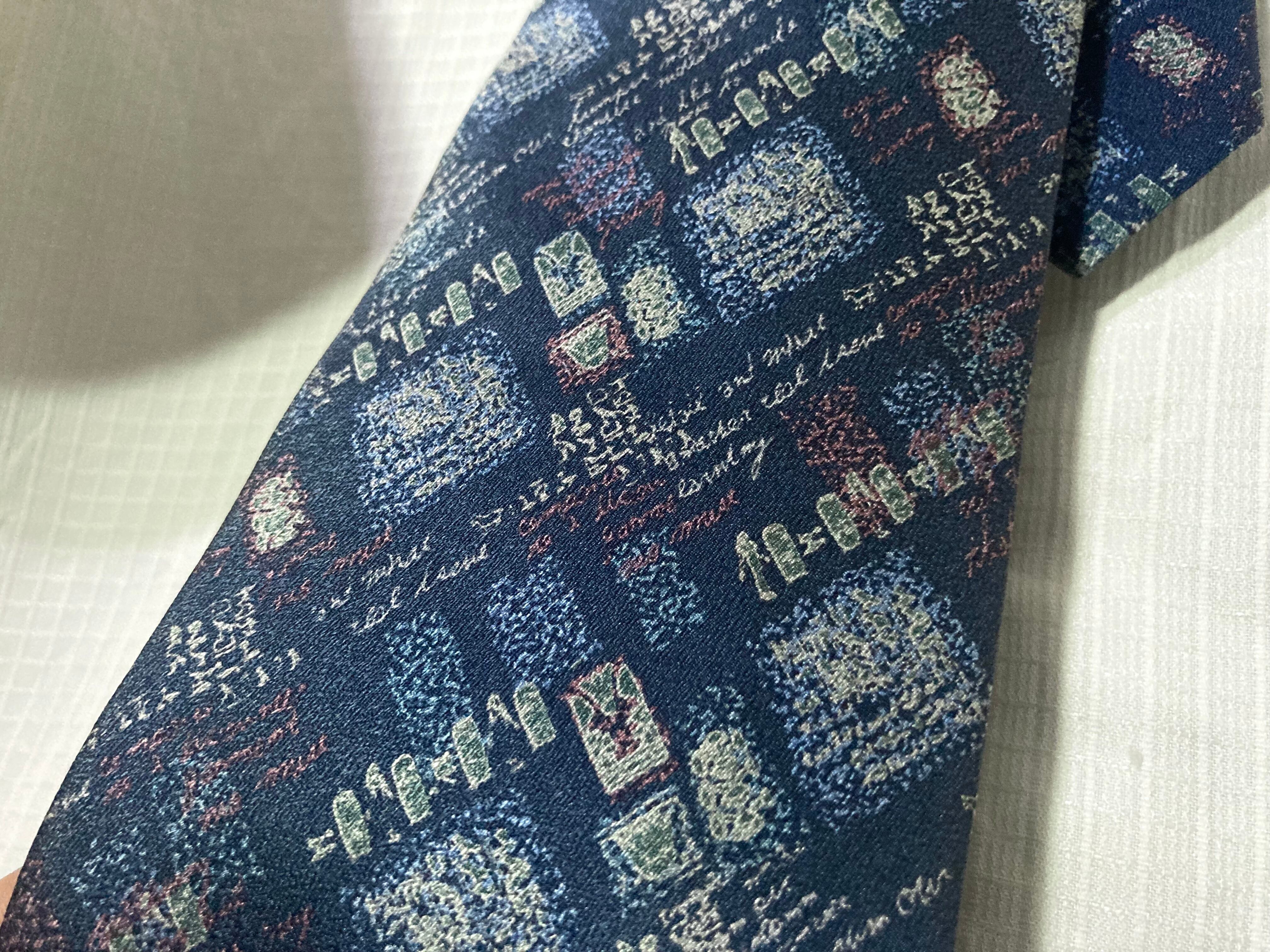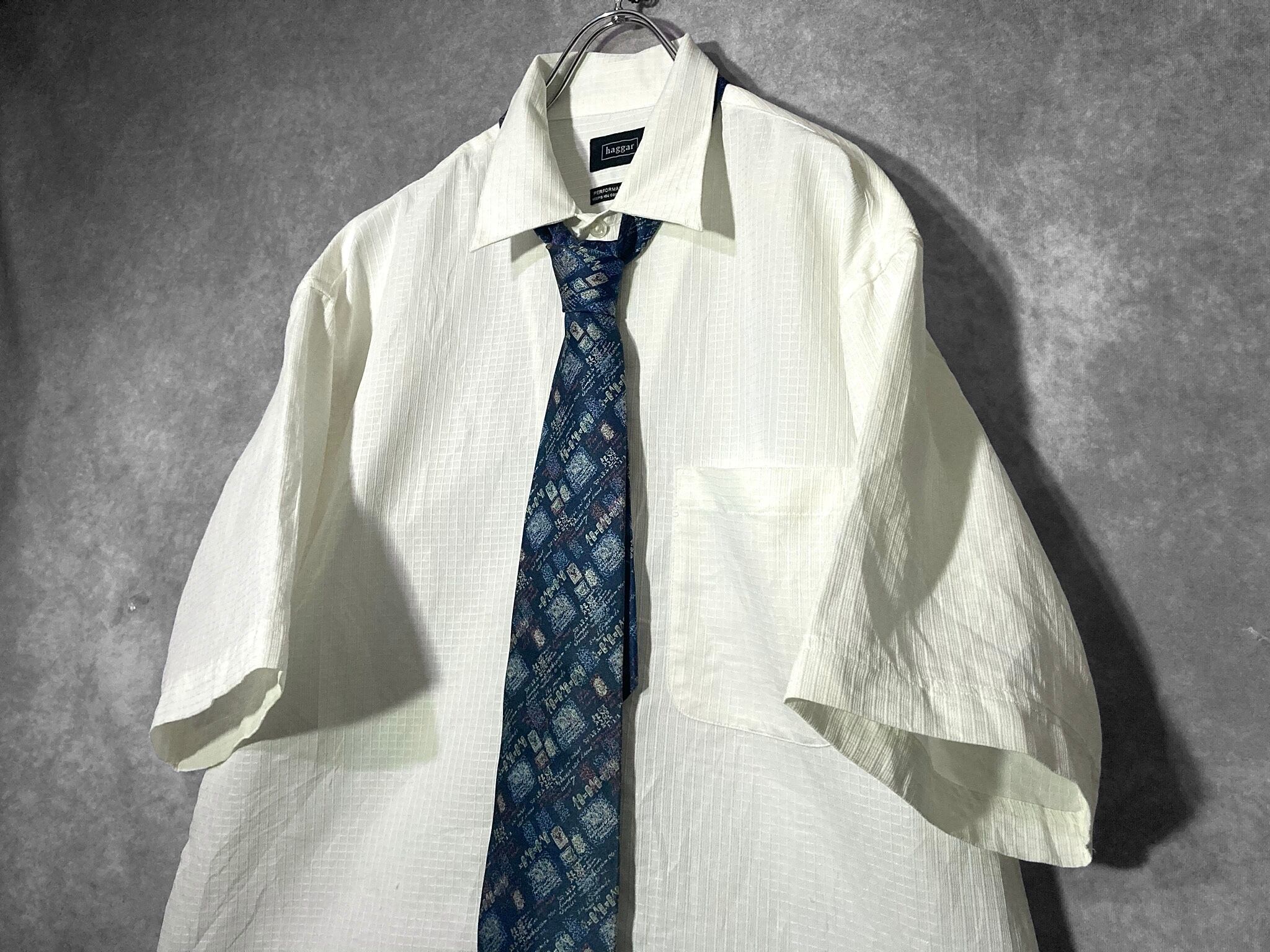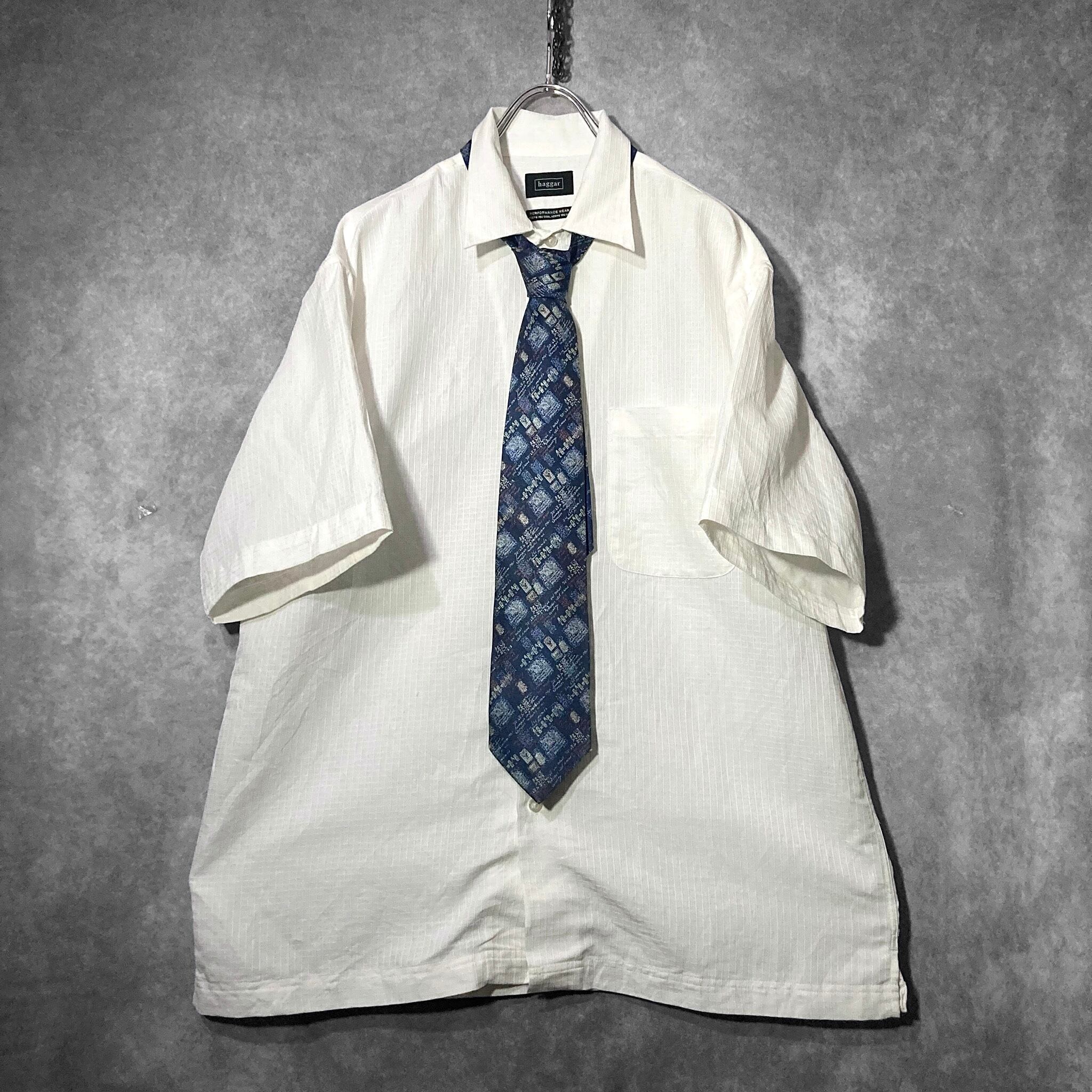 Hagger ブランドより、うっすらと格子模様が浮かび上がるように編まれたデザインのシャツとパキッとした寒冷ブルーのアート柄のデザインネクタイセット。