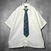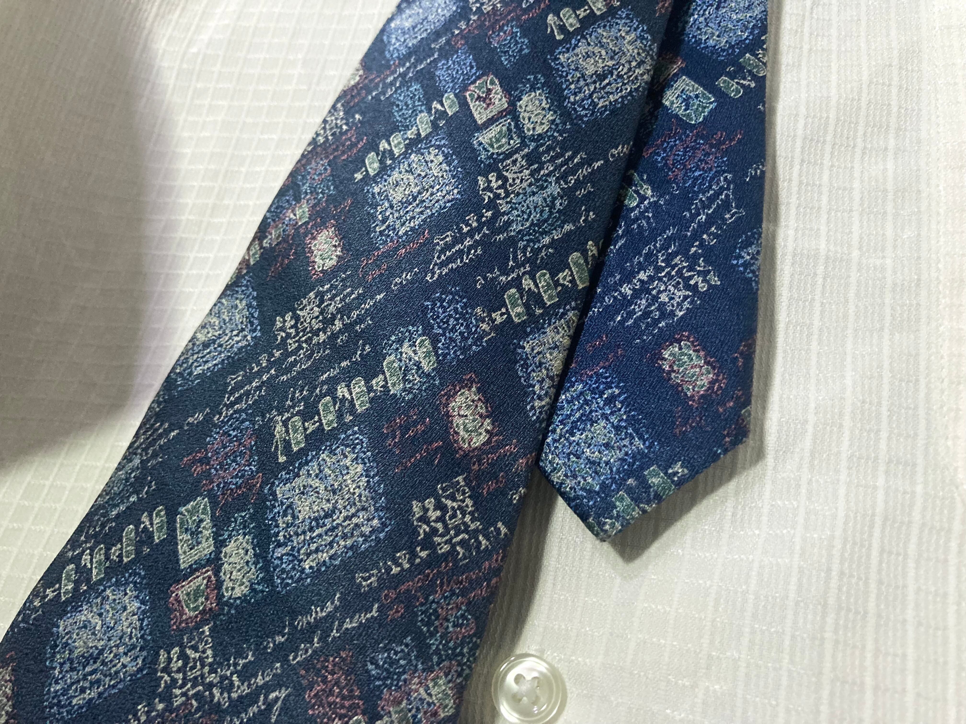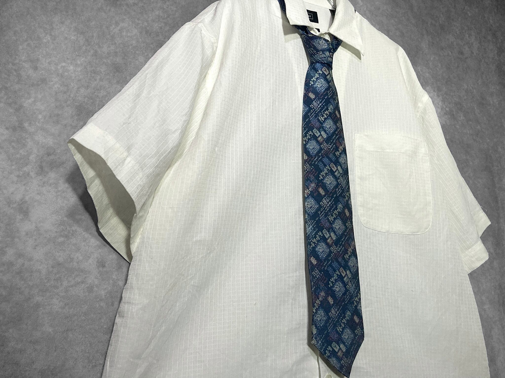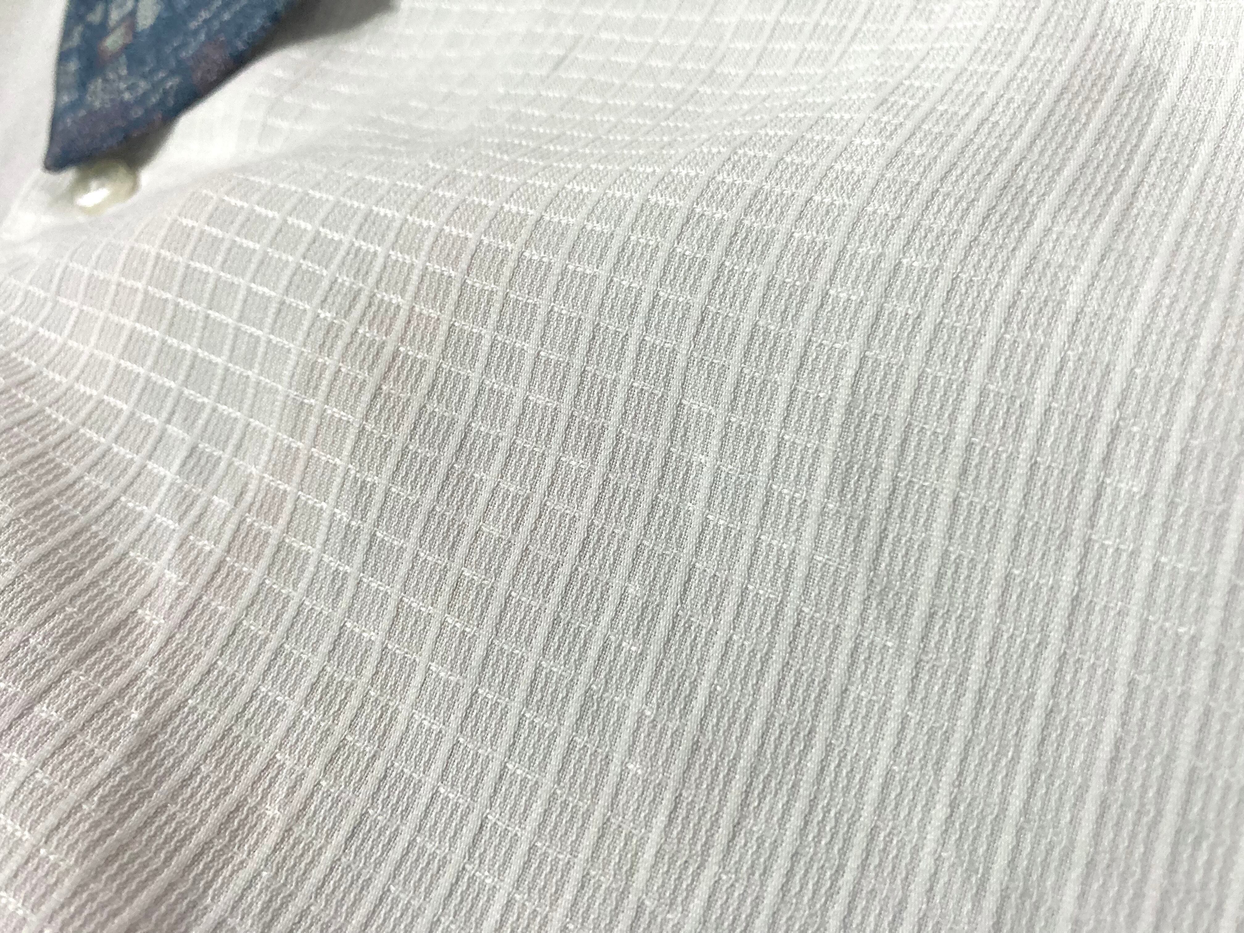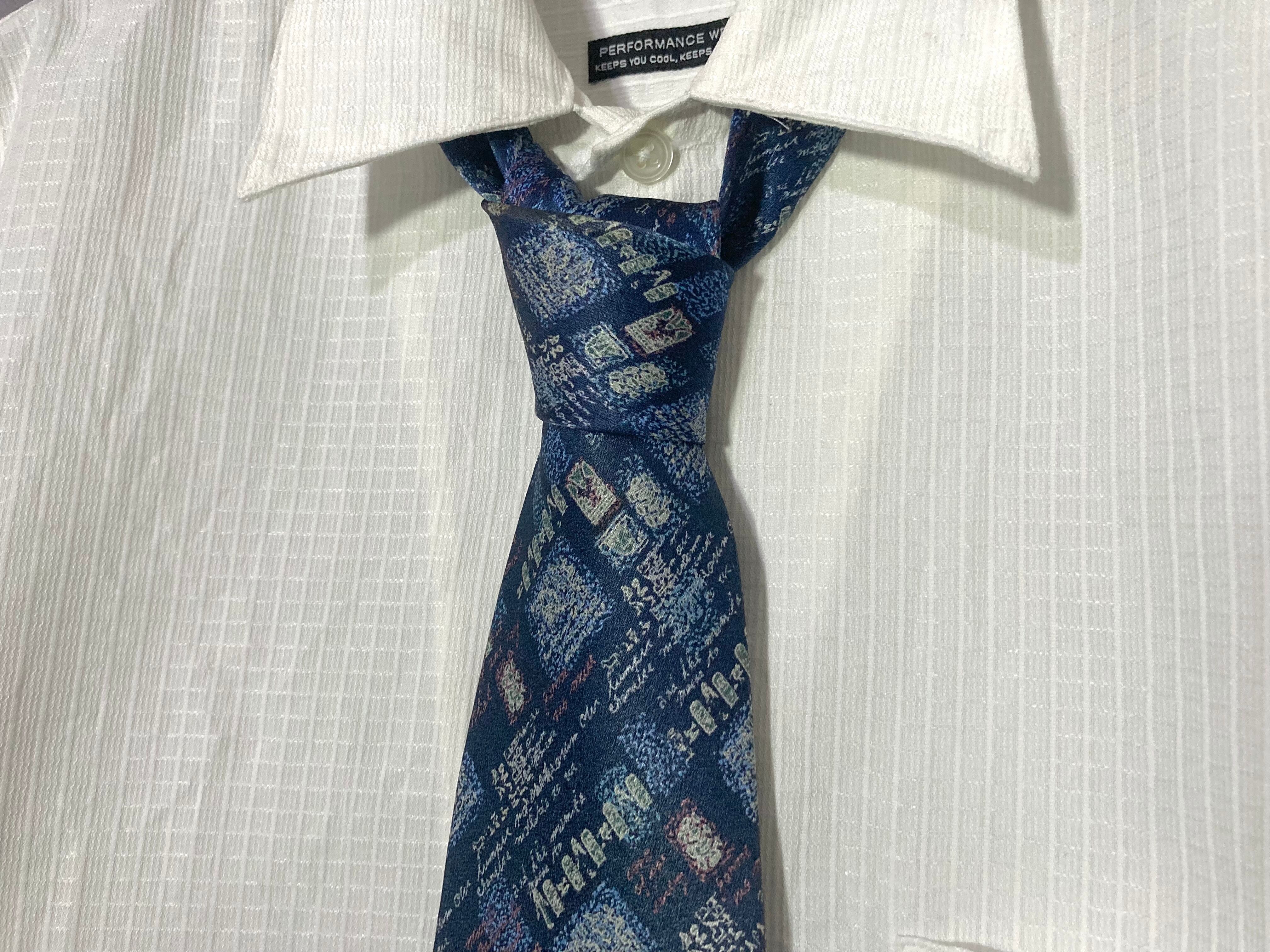 シンプルなディテールでありながら、さりげなく凸凹に編まれた細かいデザインが単体としても使えるシャツとセンスを感じる総柄デザインネクタイのトップスコーデです。