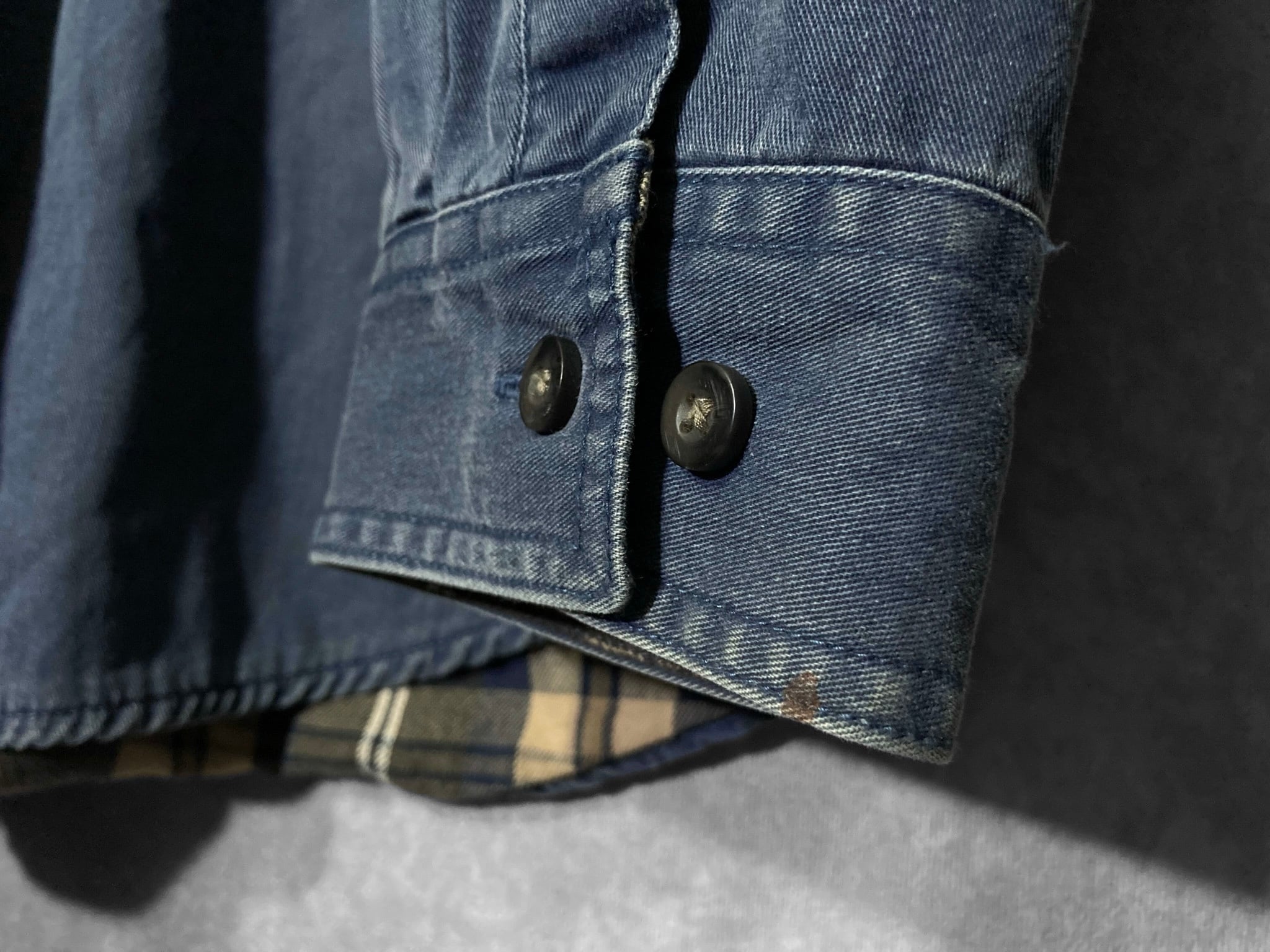 裏地をフランネル起毛のチェックで切り替えることでコンテンポラリーに落とし込んだデザインのデニムシャツ。