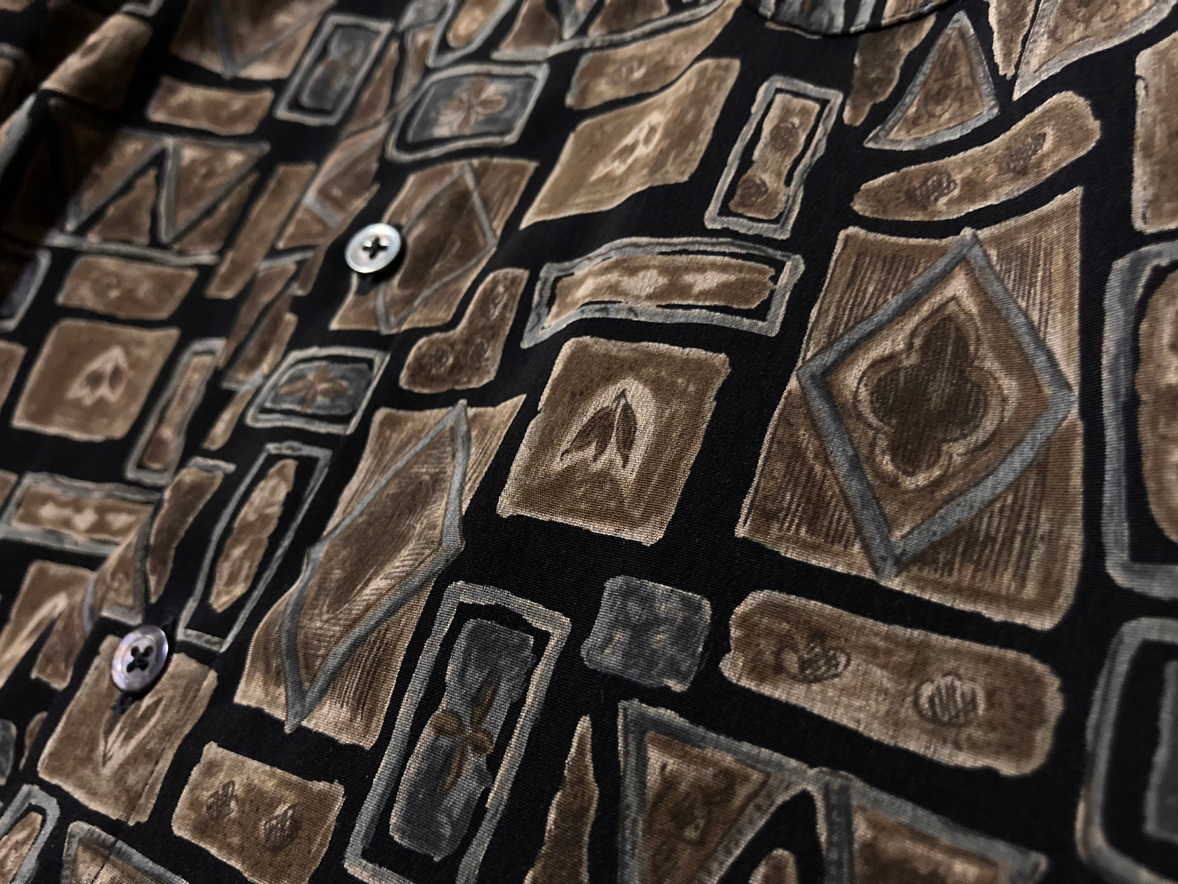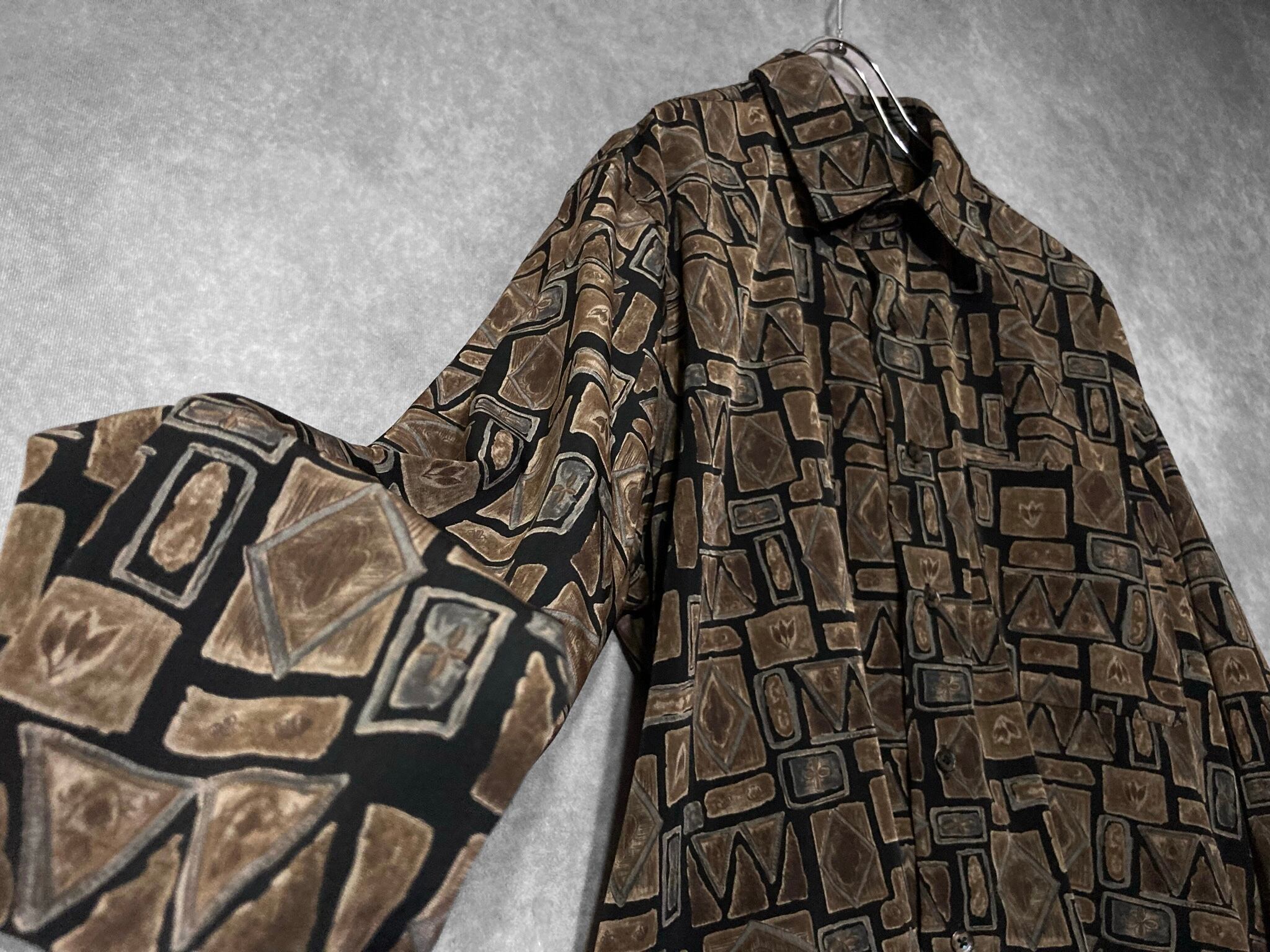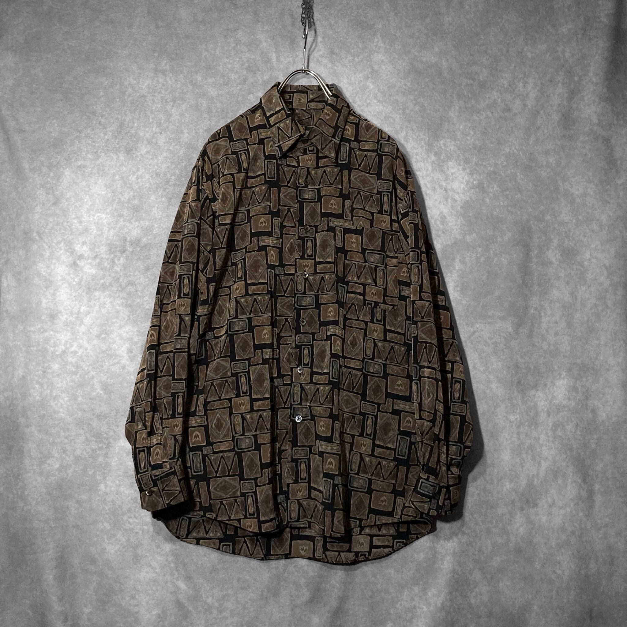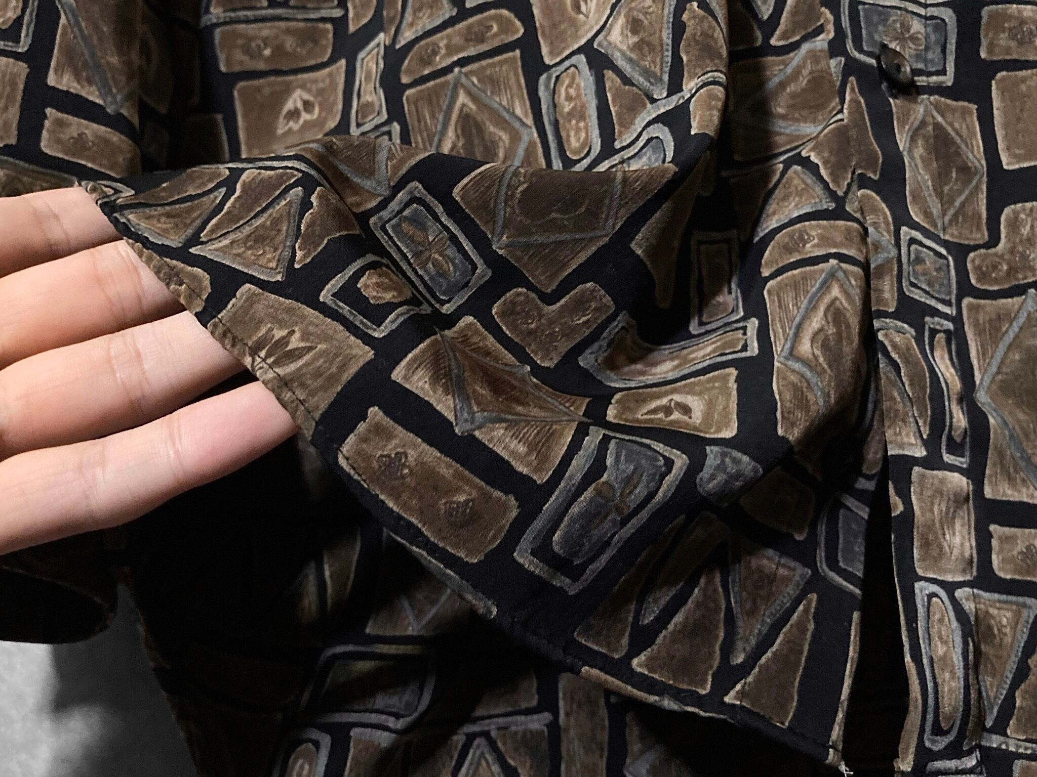 黒とダークブラウンのコントラストの遺跡の壁画のようなミステリアスで神秘的なデザインの総柄シャツ。
