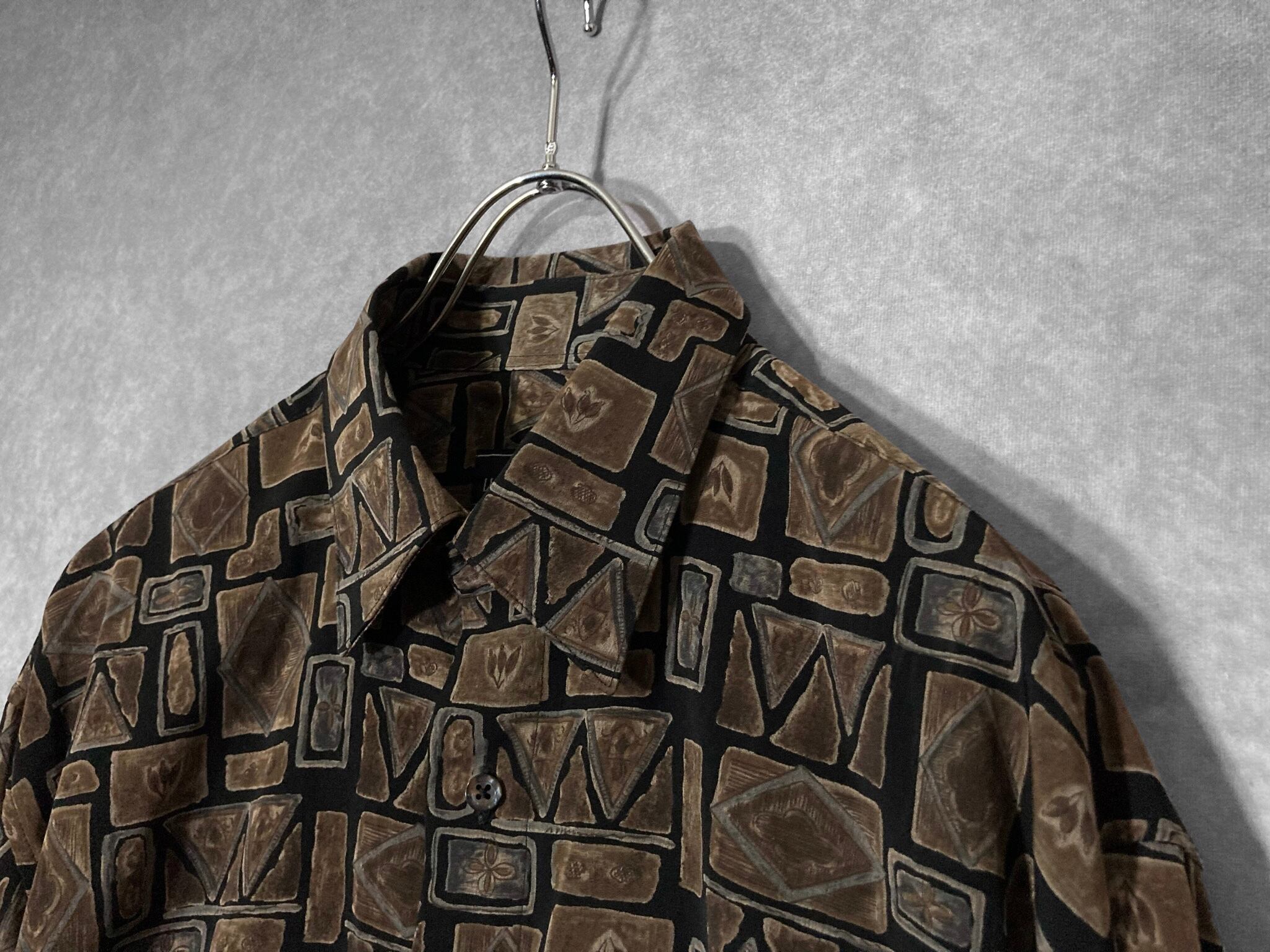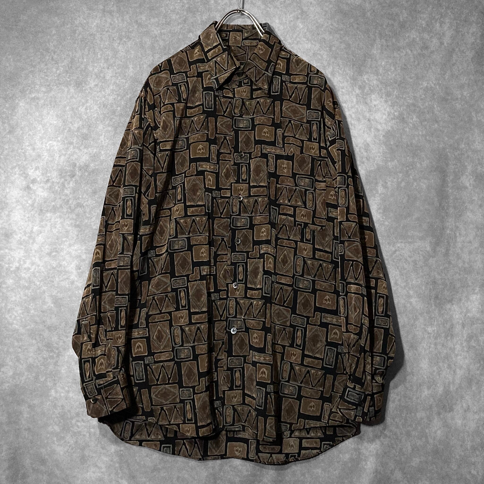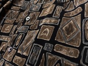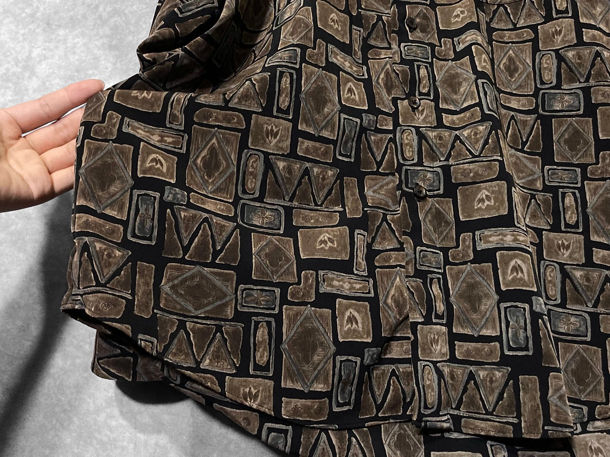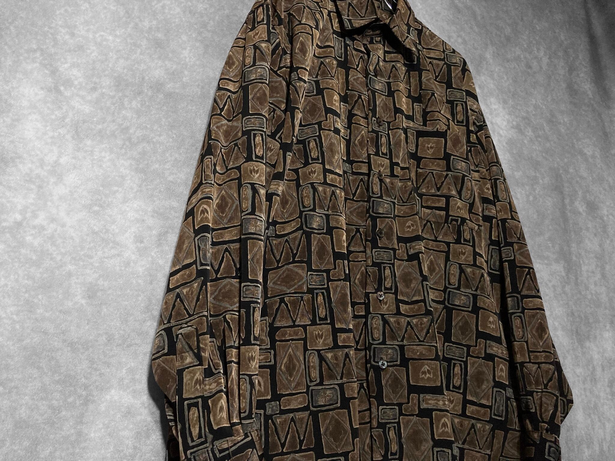 黒とダークブラウンのコントラストの遺跡の壁画のようなミステリアスで神秘的なデザインの総柄シャツ。