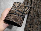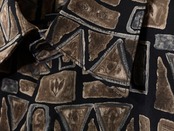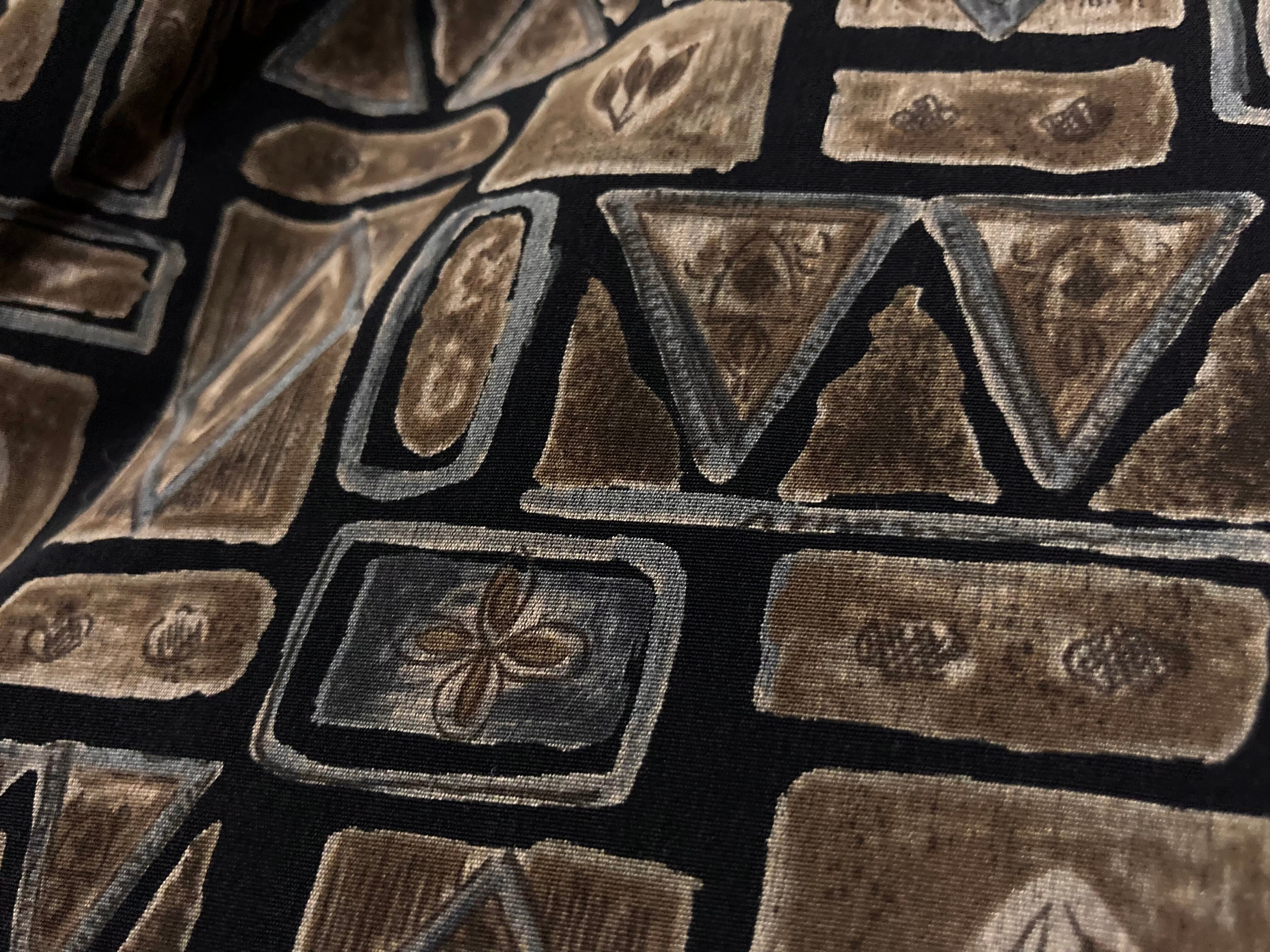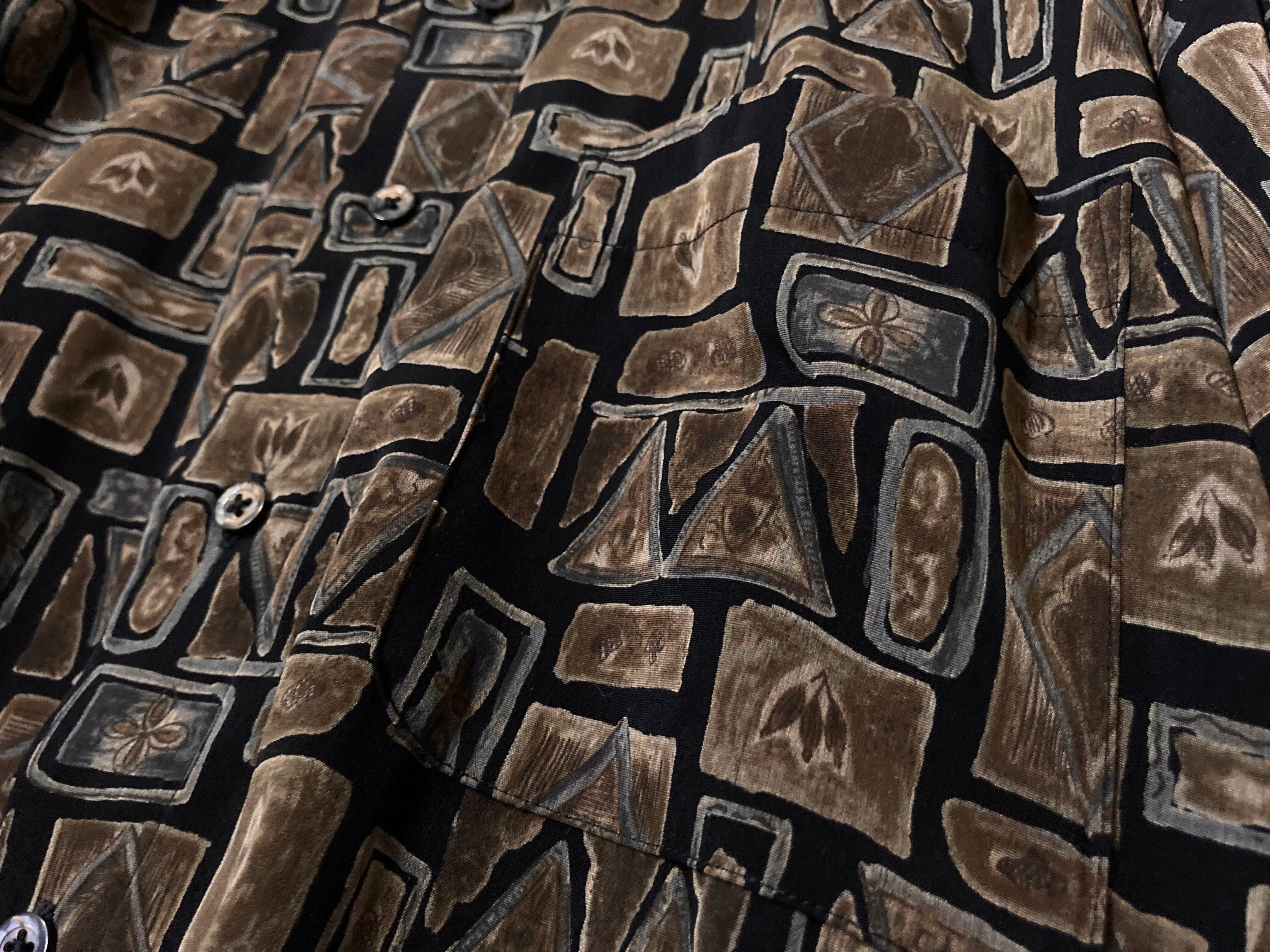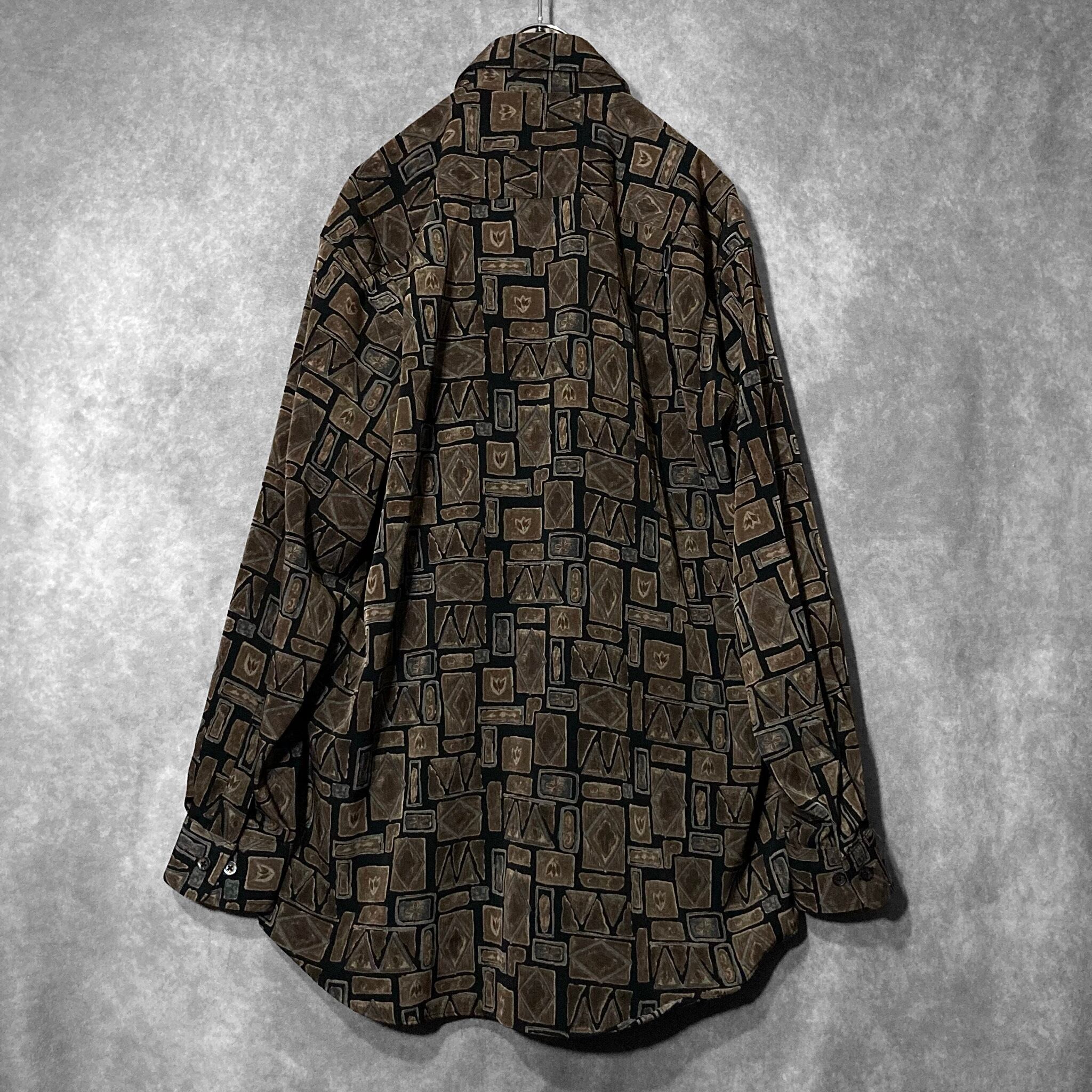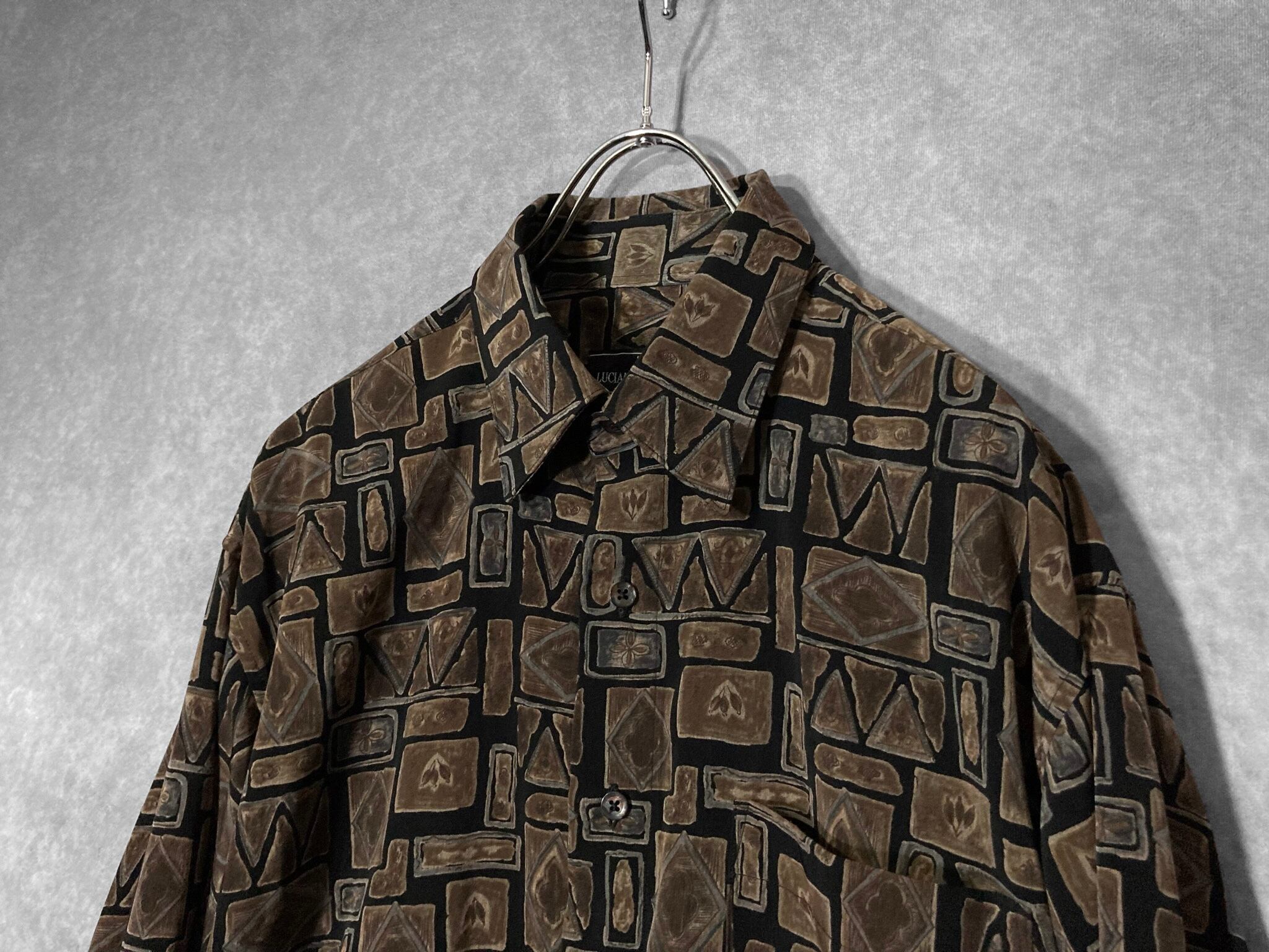 黒とダークブラウンのコントラストの遺跡の壁画のようなミステリアスで神秘的なデザインの総柄シャツ。