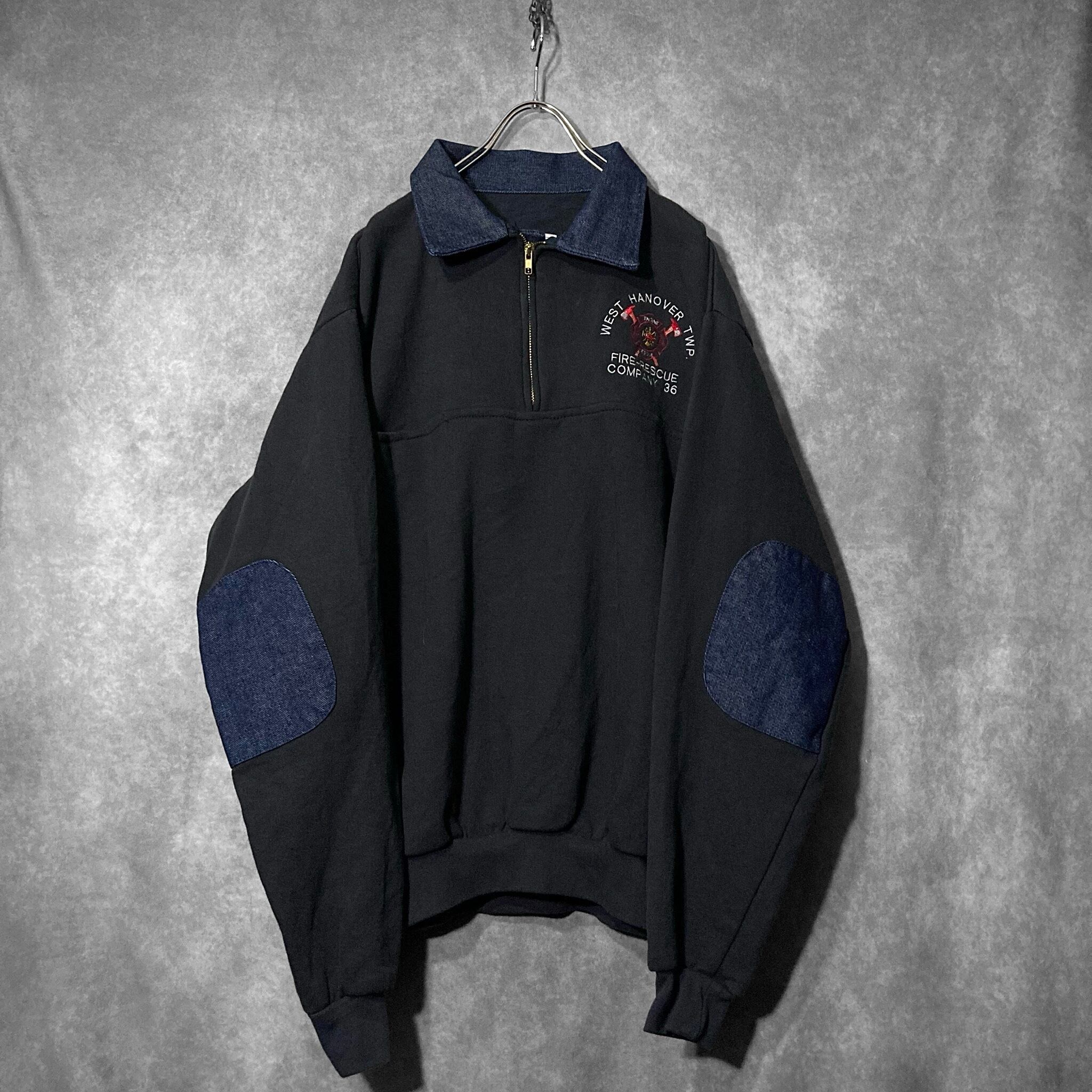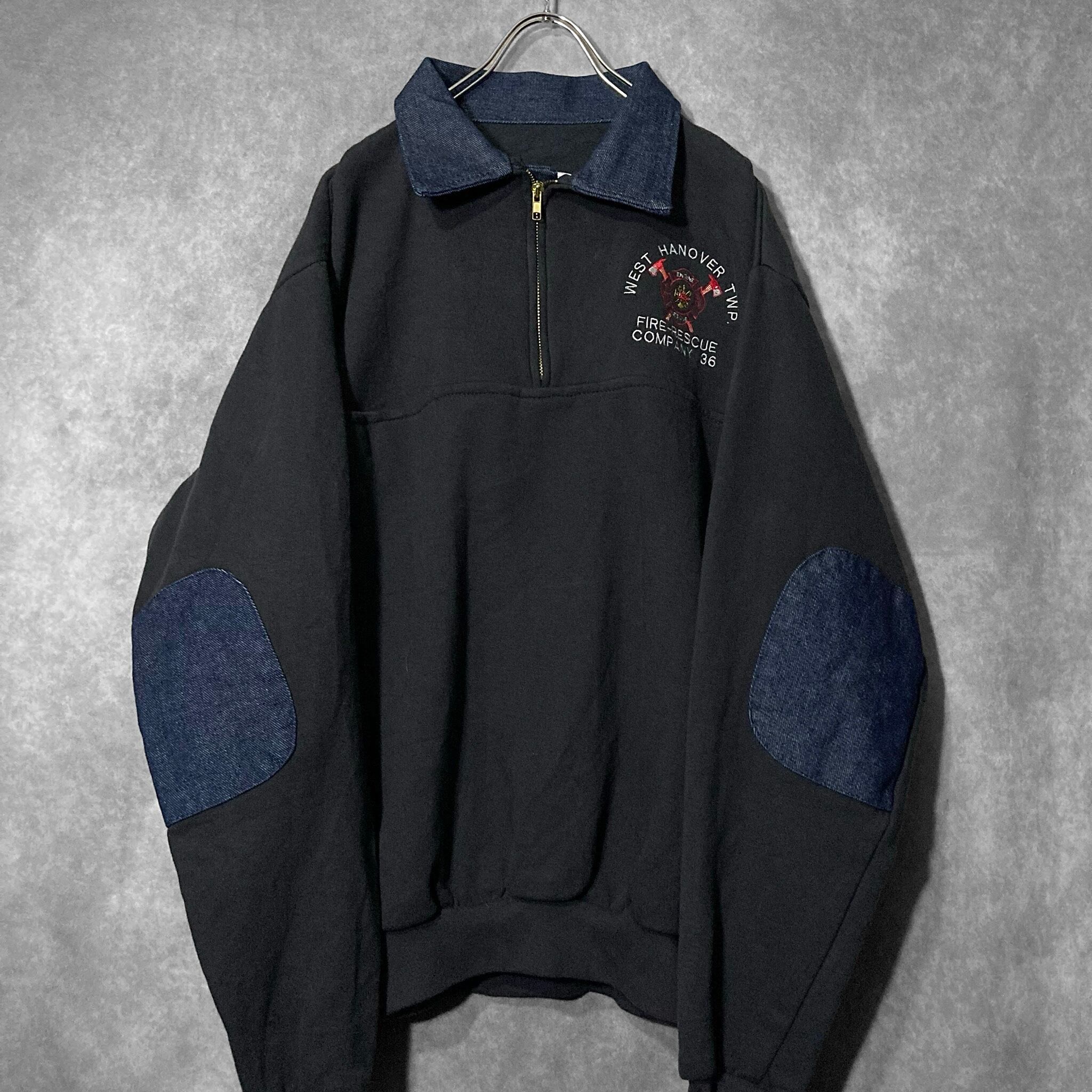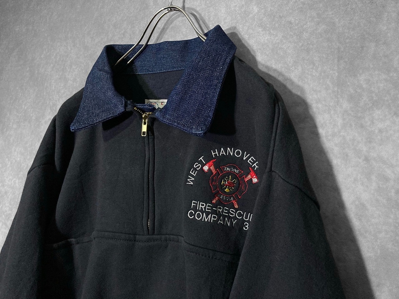 XL made in USA, GAME Workwear WEST HANOVAR TWP. FIRE RESCUE COMPANY 36 Logo embroidery × Denim fabric collar and elbow patchwork design Half-zip pullover shirt
