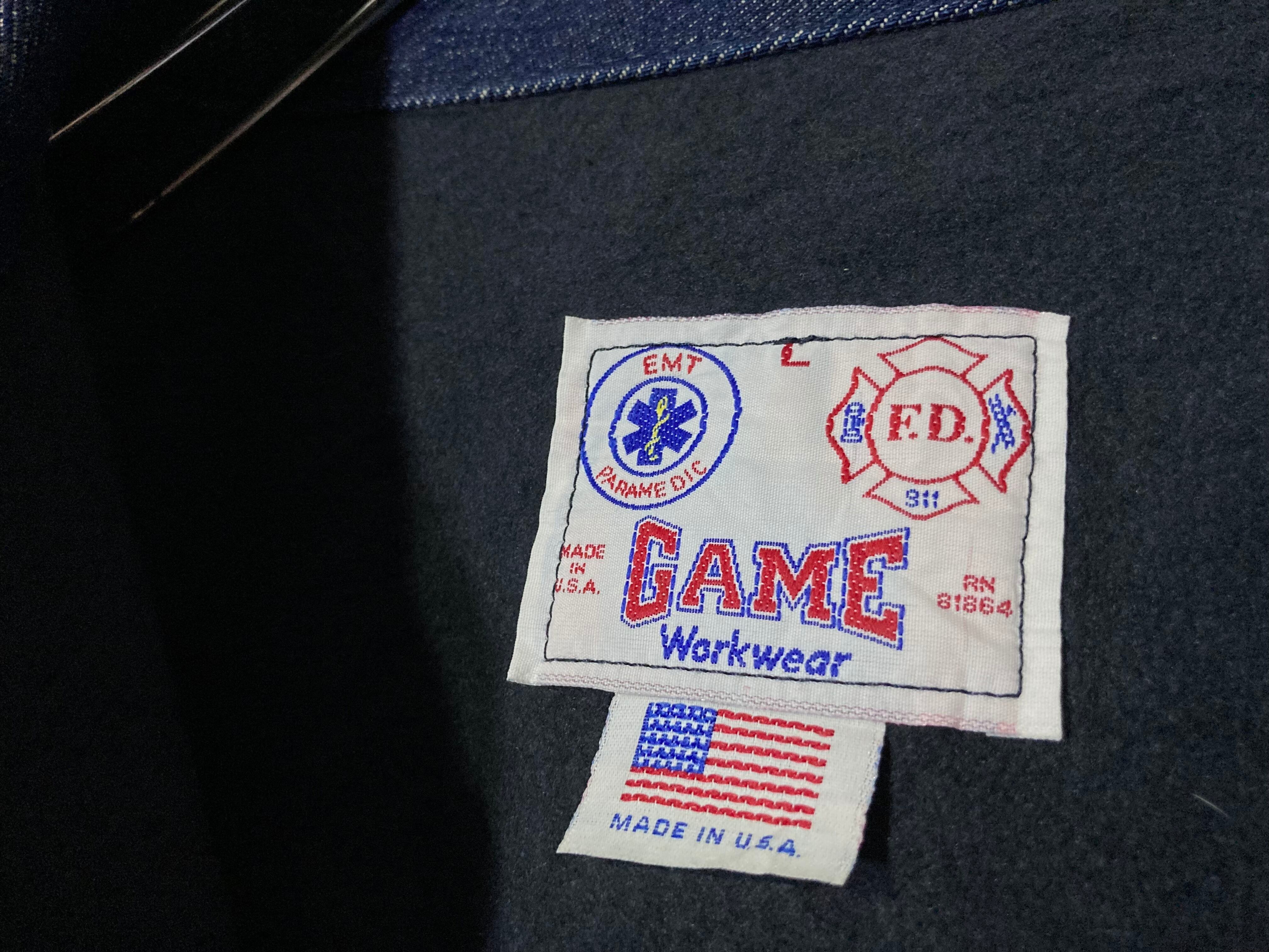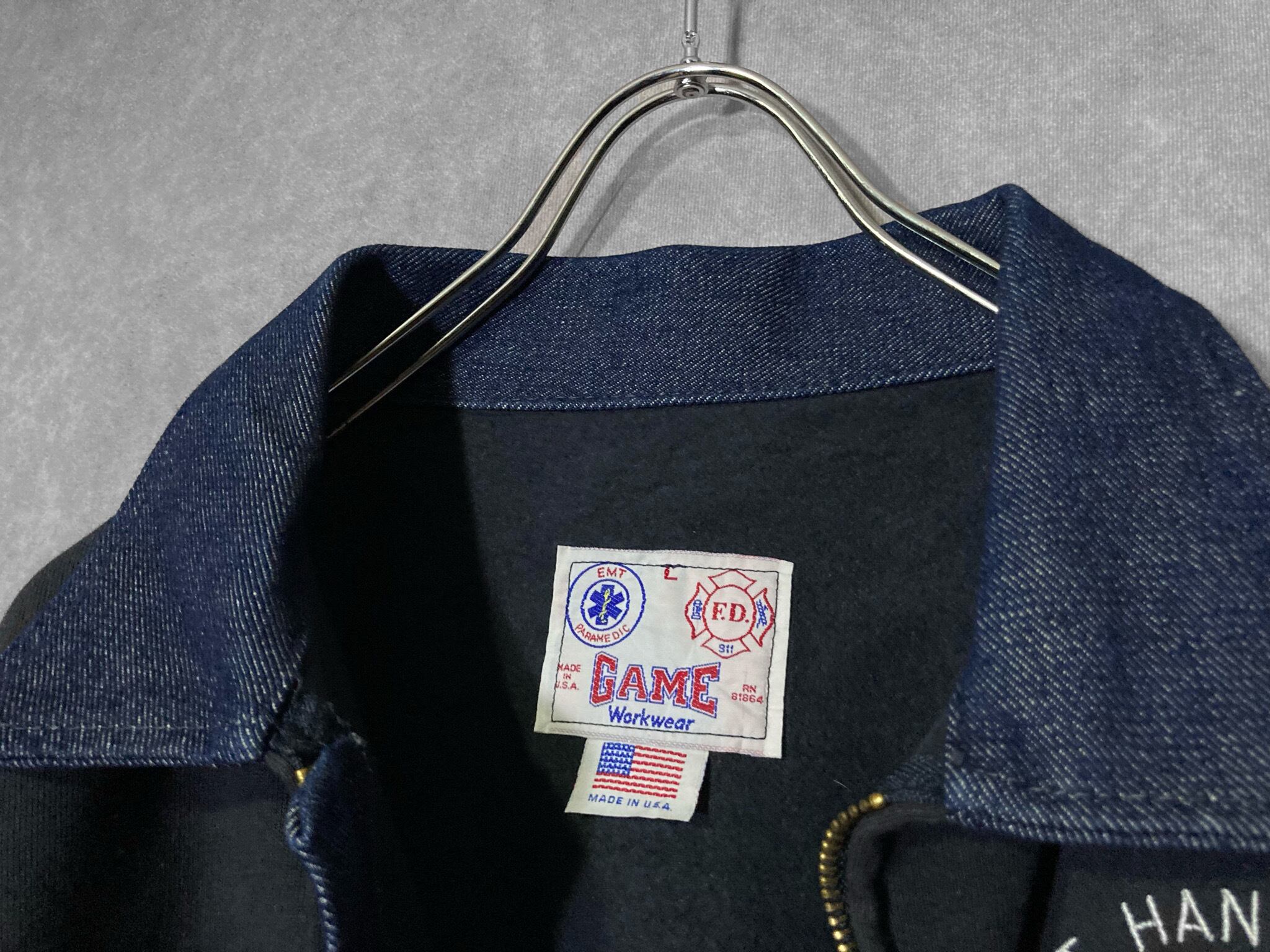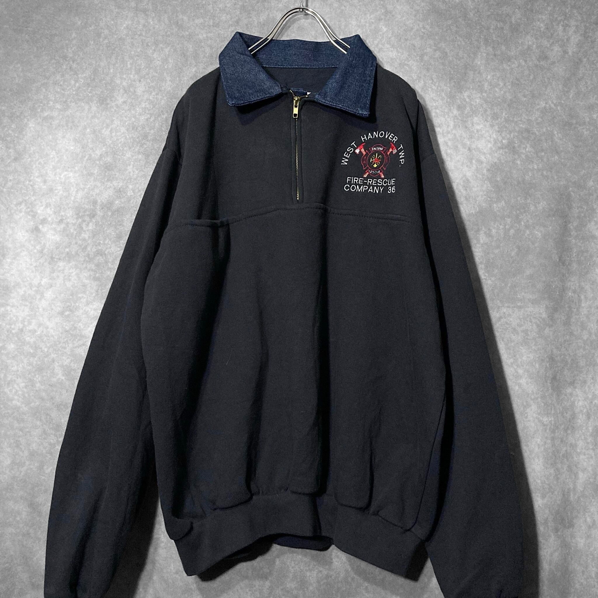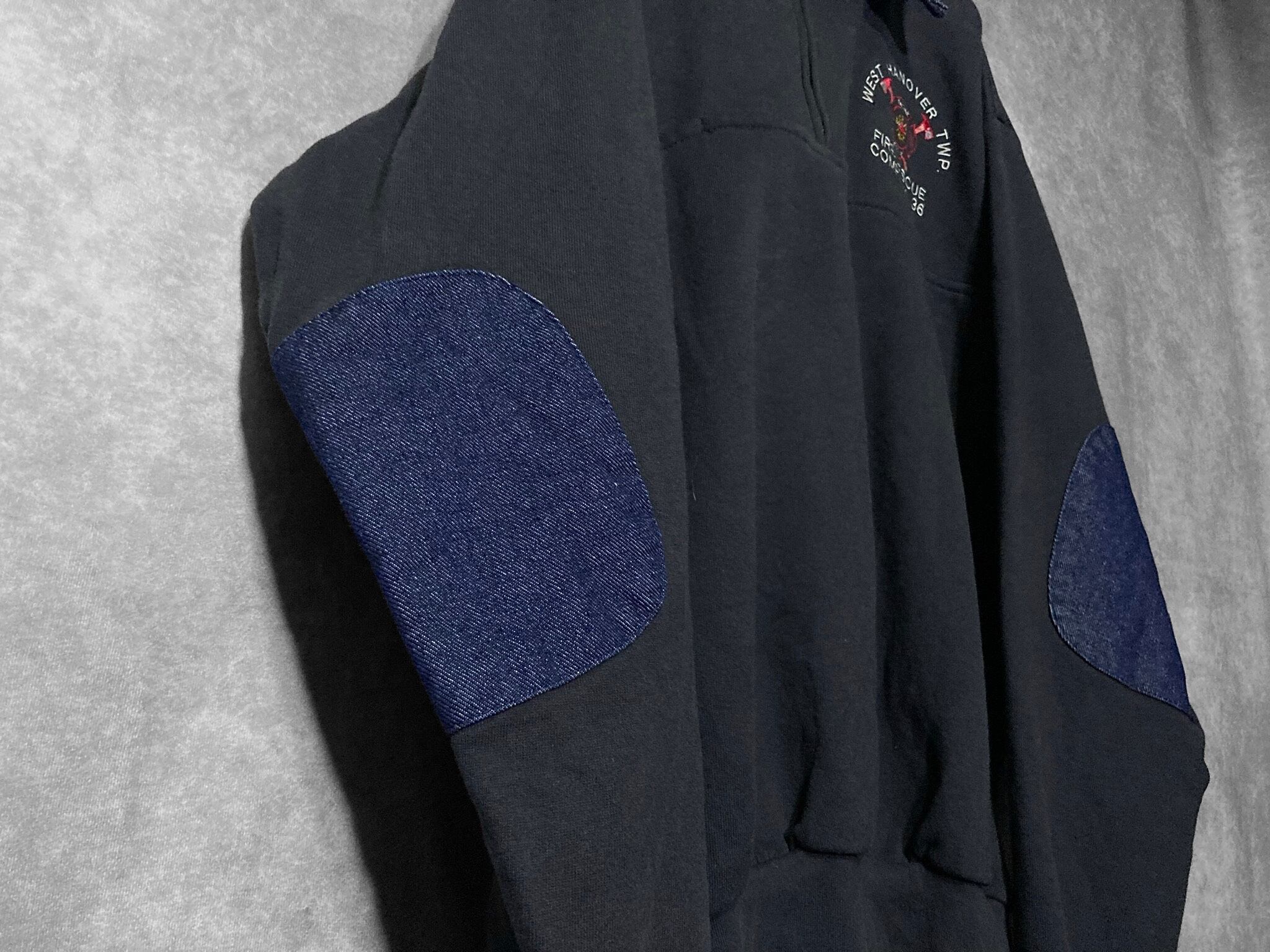 XL made in USA, GAME Workwear WEST HANOVAR TWP. FIRE RESCUE COMPANY 36 Logo embroidery × Denim fabric collar and elbow patchwork design Half-zip pullover shirt