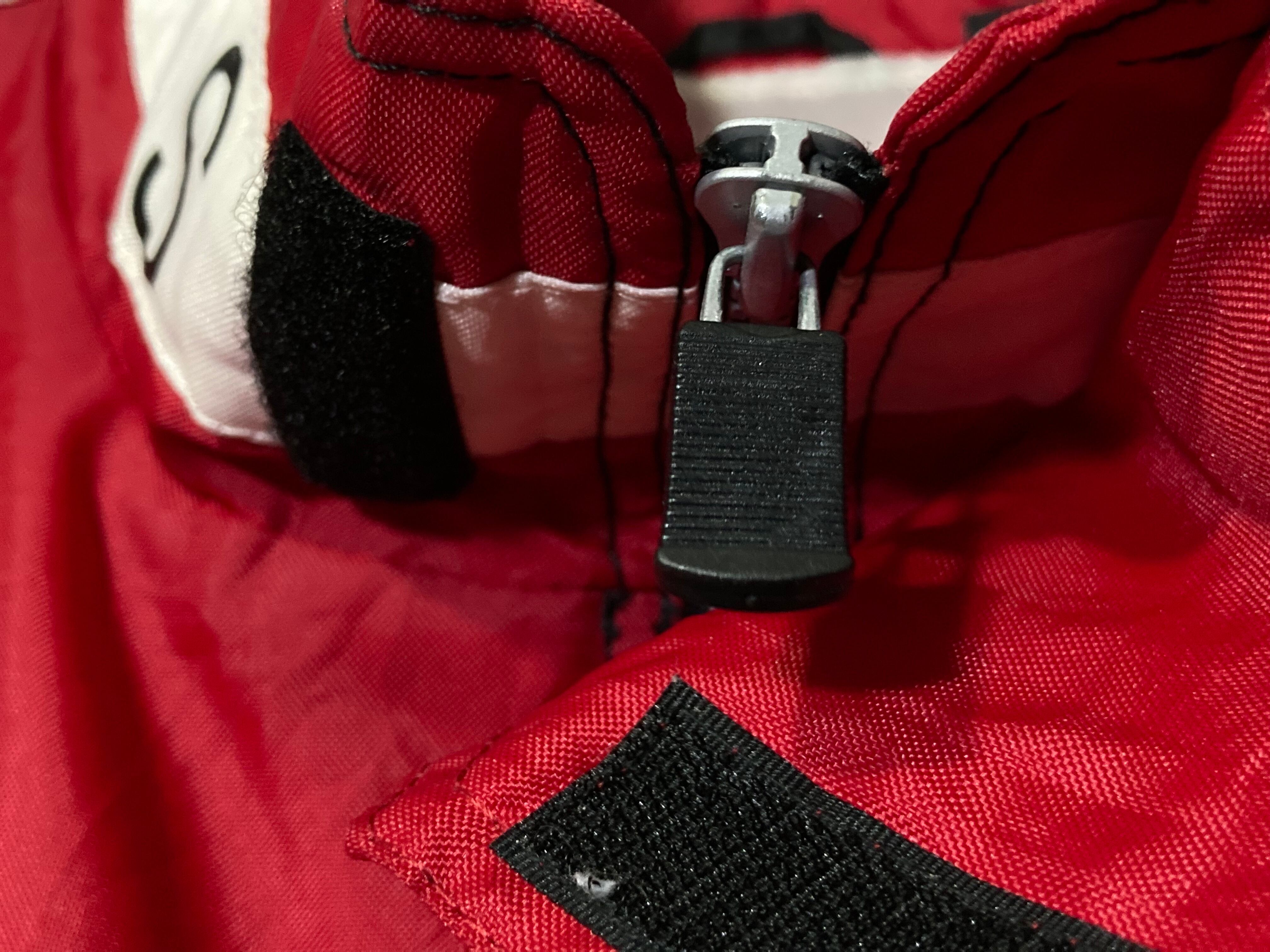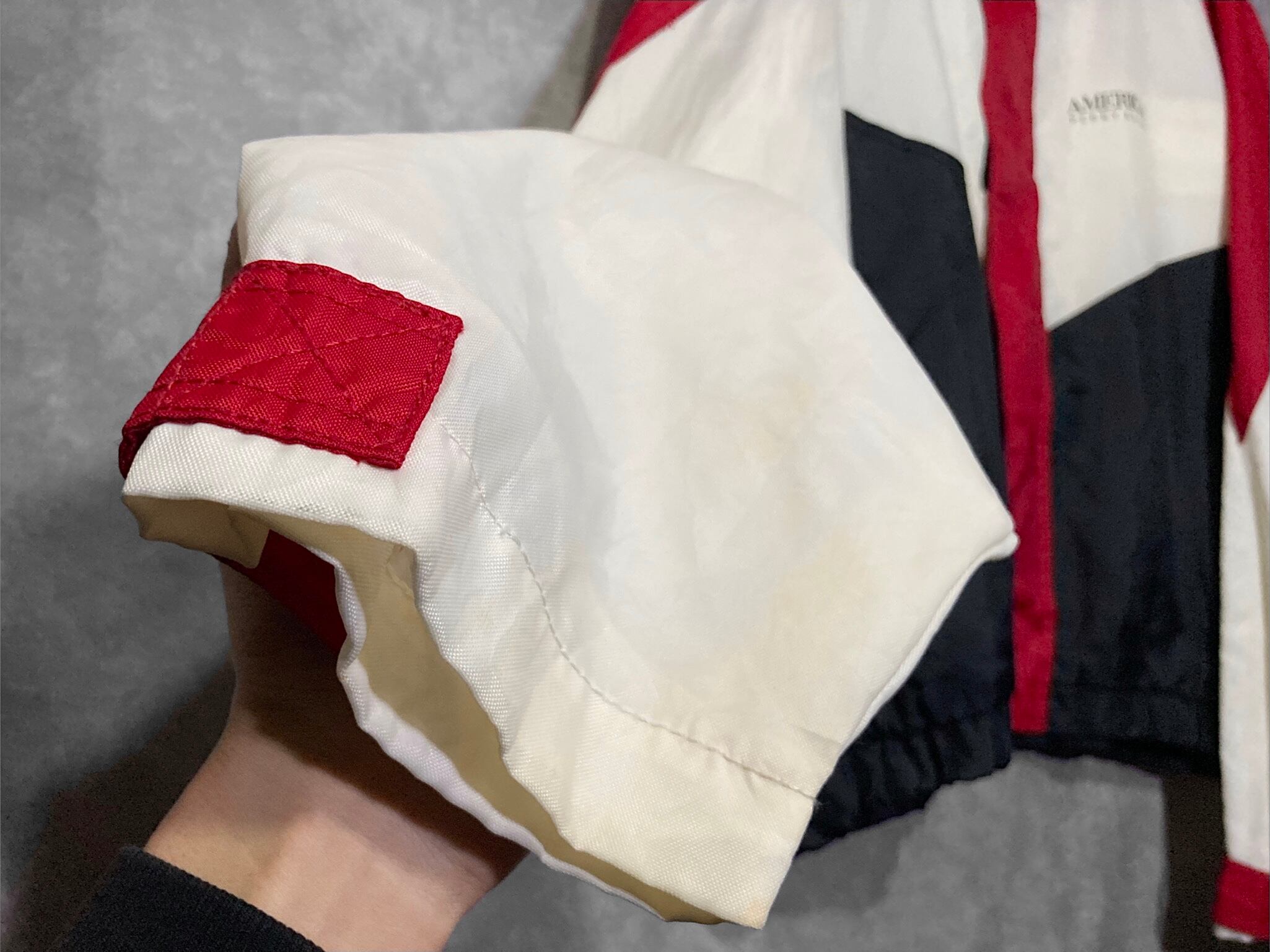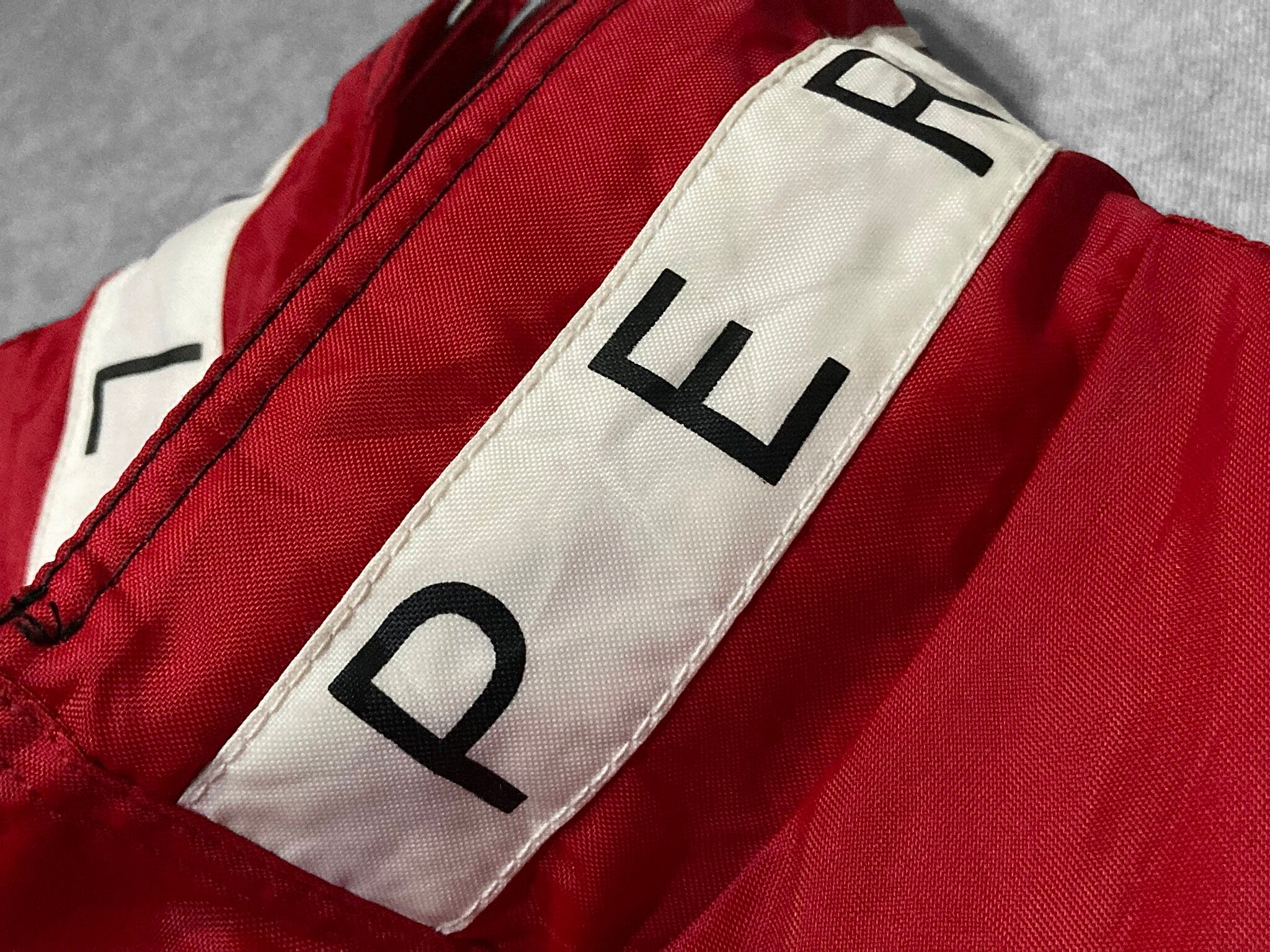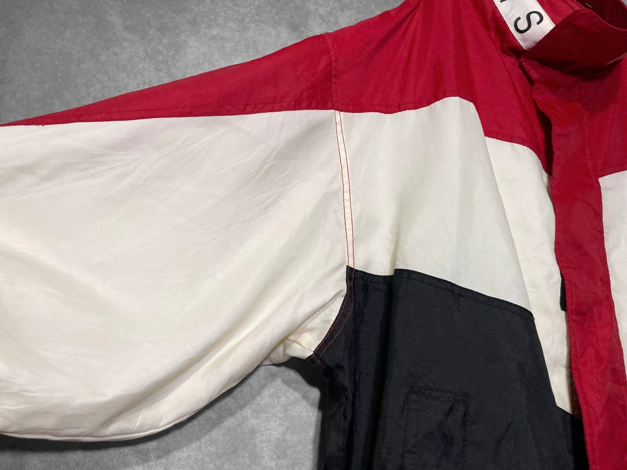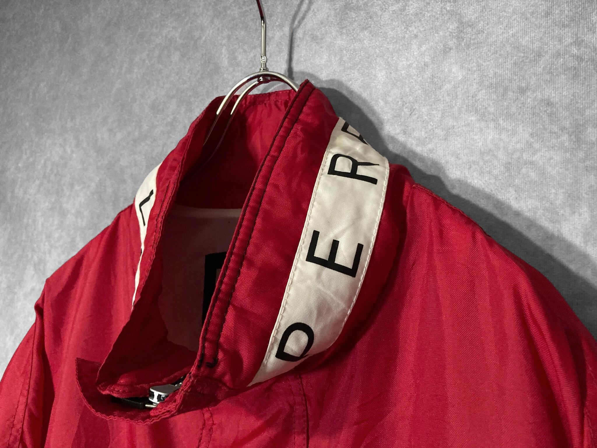 バックのロゴデザインと赤と白黒のコントラストが目を引くオーバーサイズブルゾン。