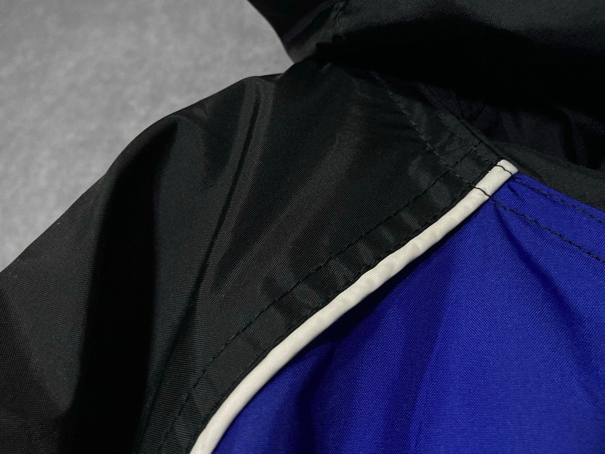 肩から脇下へ伸びるホワイトのパイピングラインはブルーとのコントラストを作り出して絶妙な抜け感を加えてます。