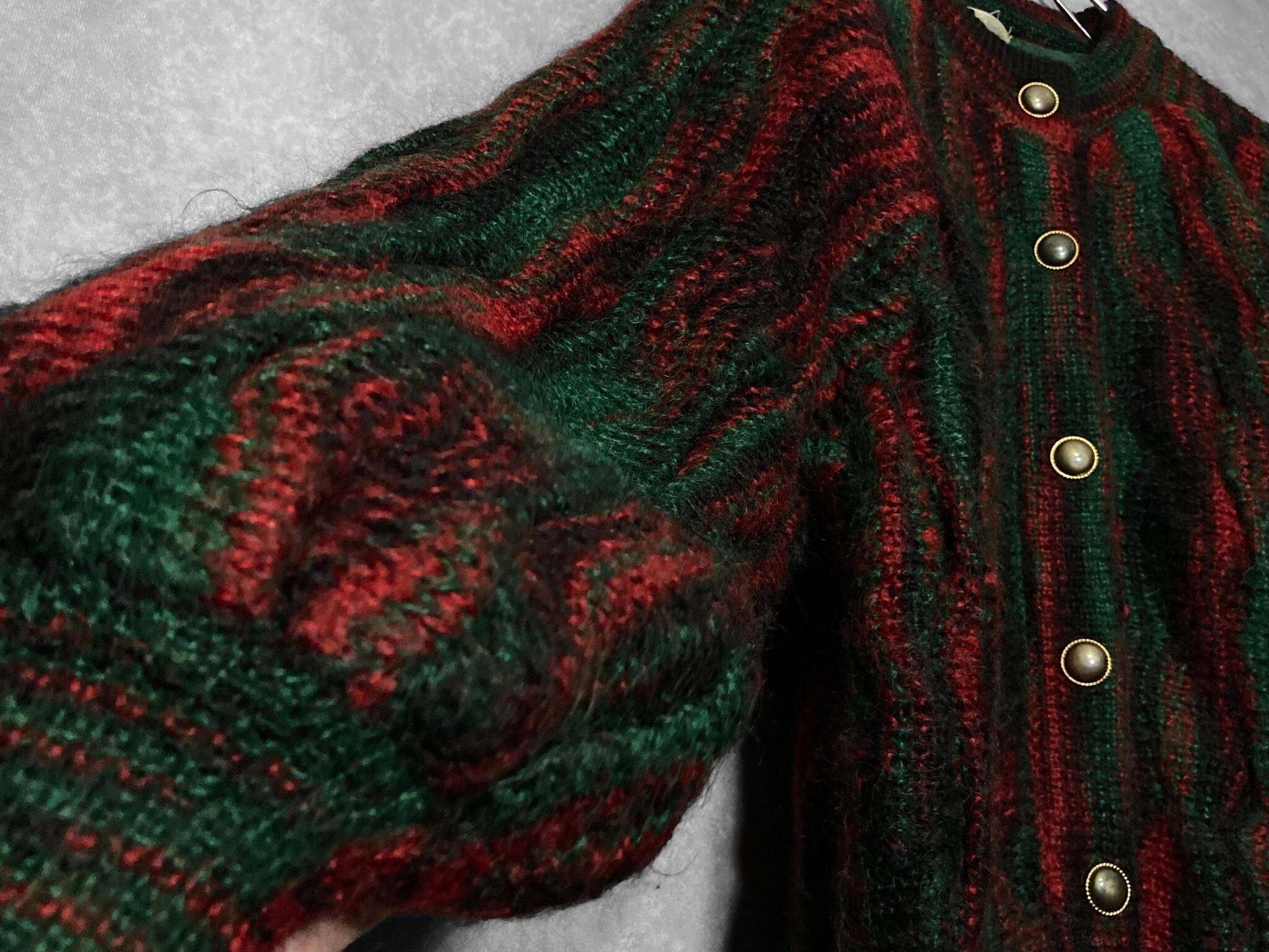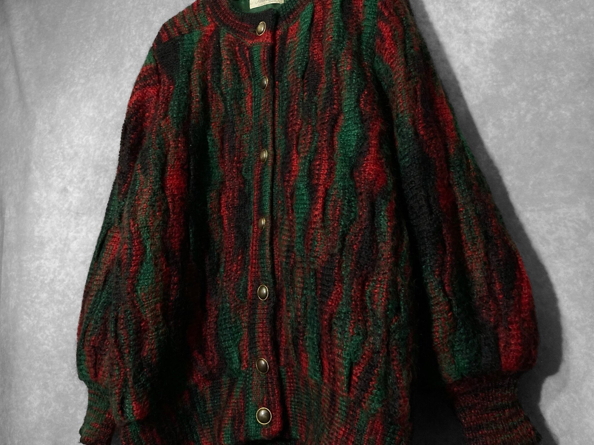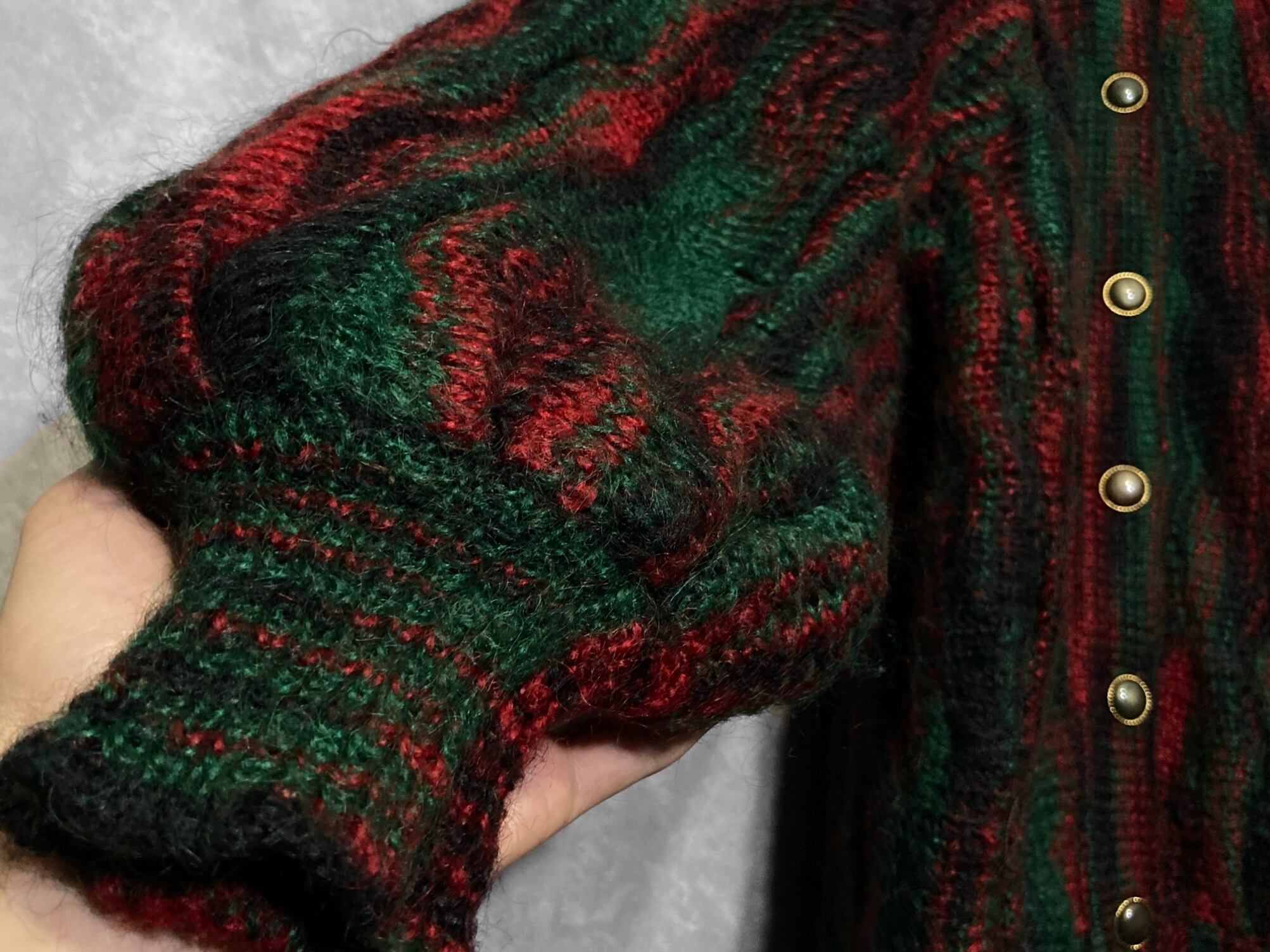ブラッディレッドとグリーンのグラデーション模様が怪奇的で妖艶な雰囲気溢れるニットカーディガンの入荷です。