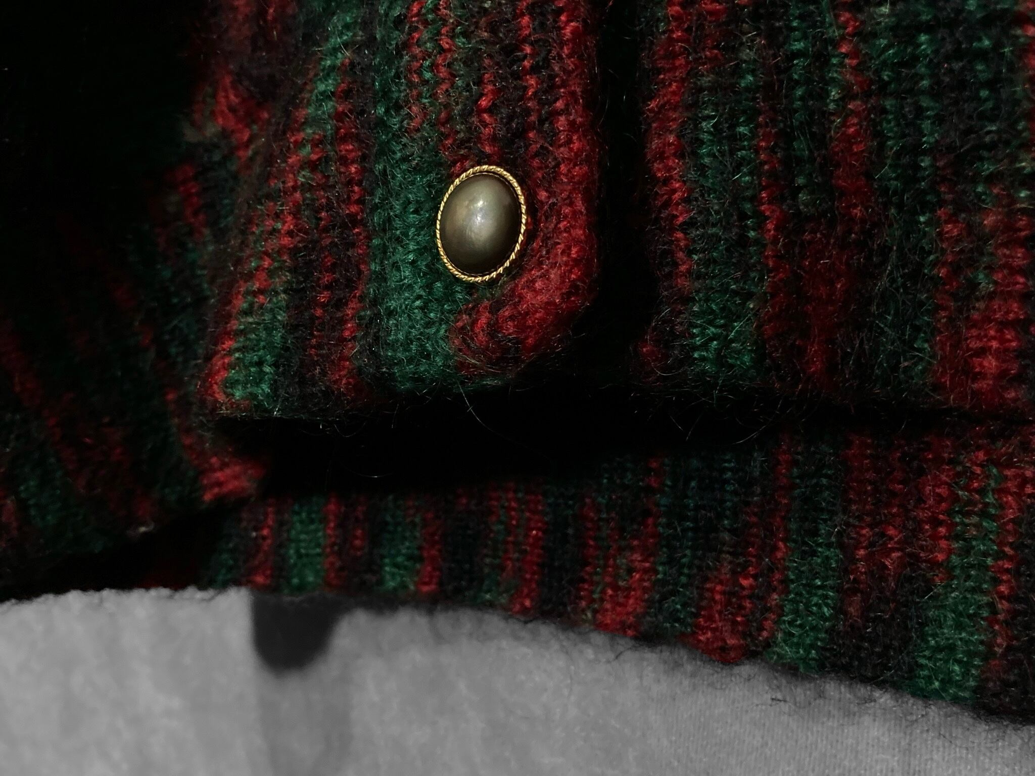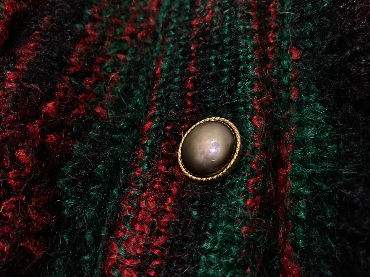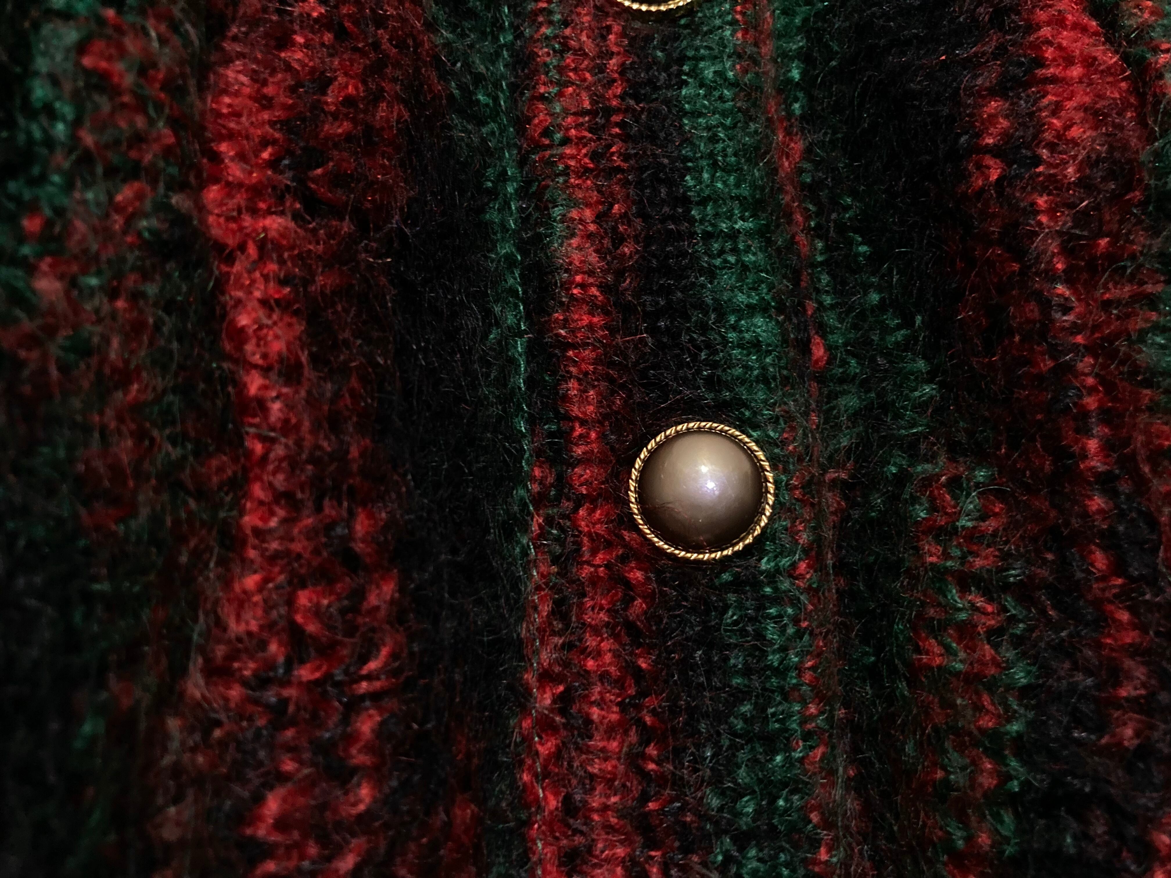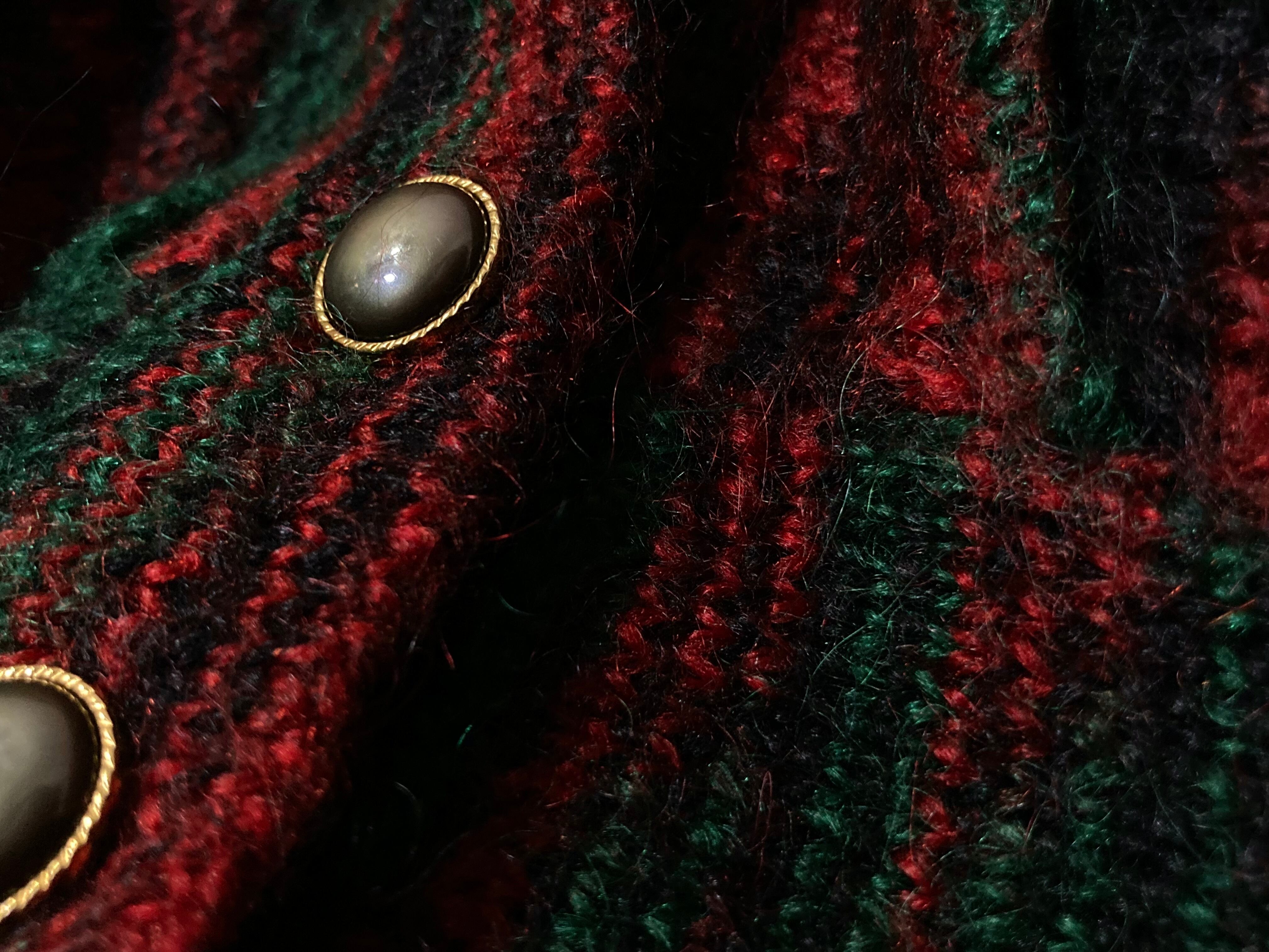 ブラッディレッドとグリーンのグラデーション模様が怪奇的で妖艶な雰囲気溢れるニットカーディガンの入荷です。