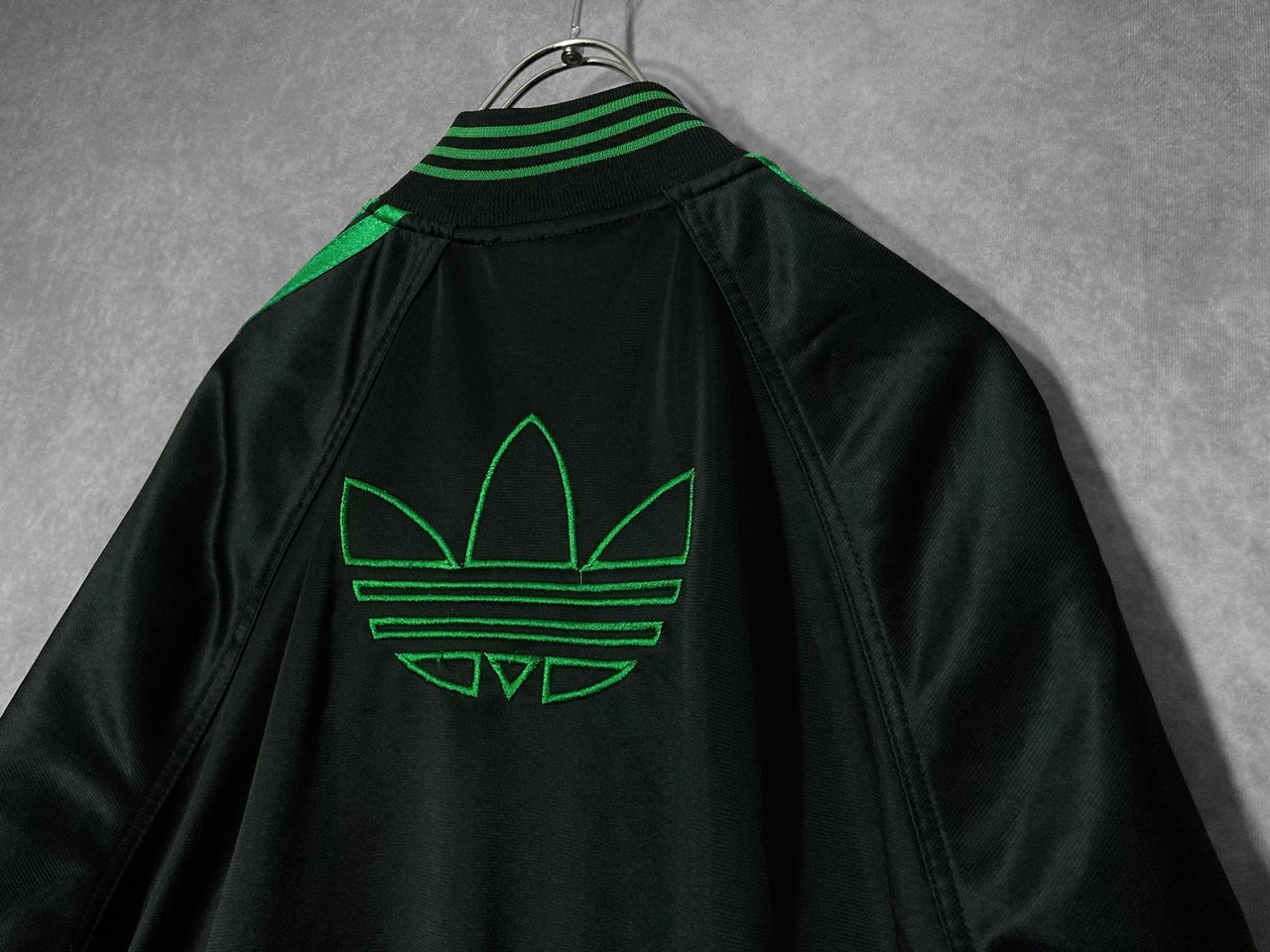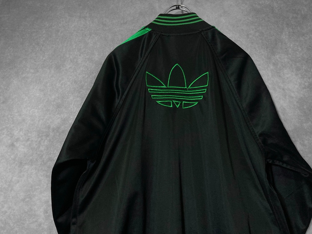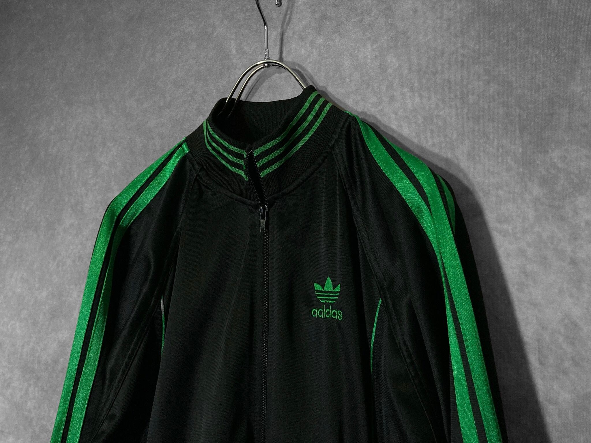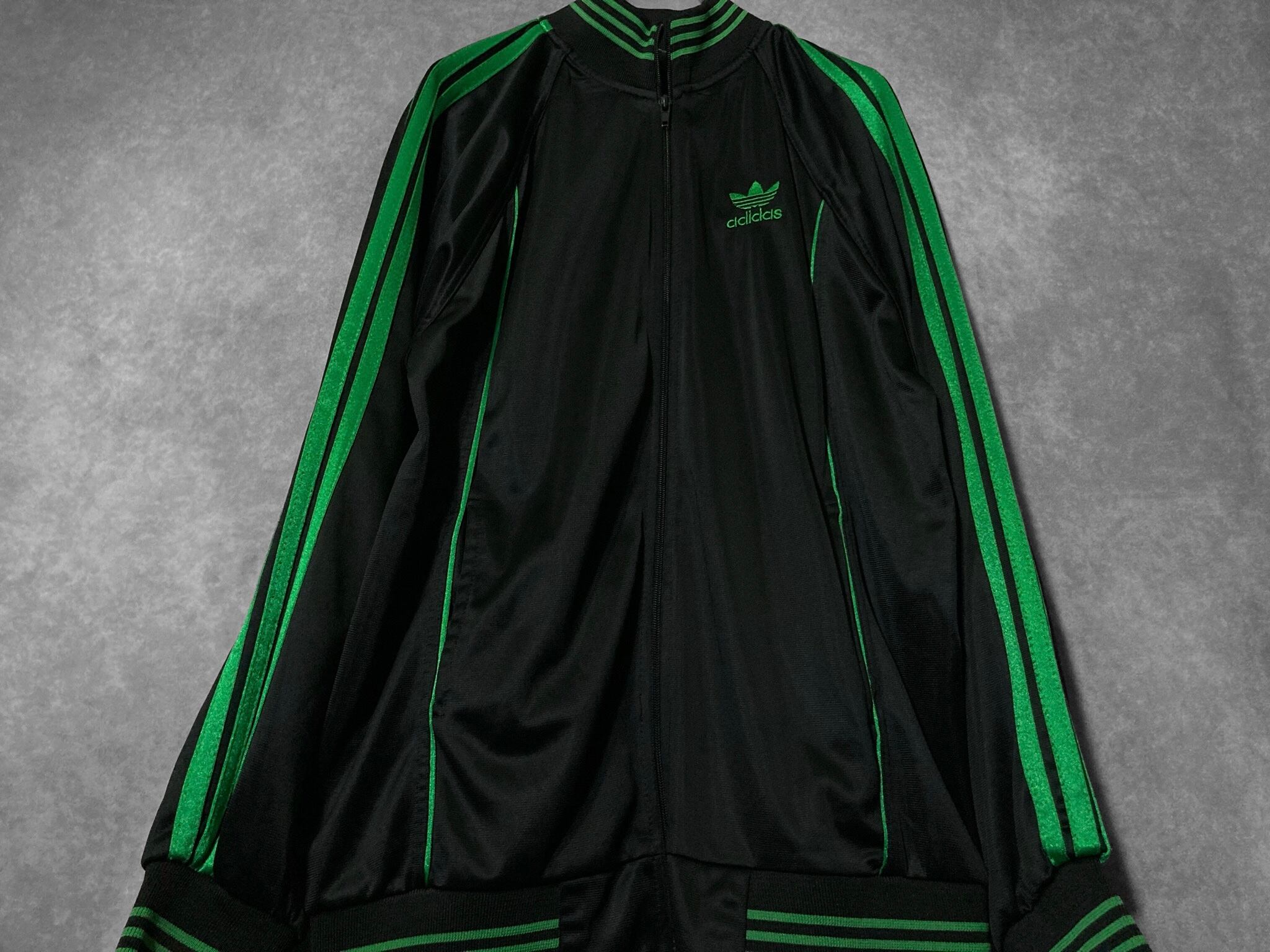 人気のスポーツファッションブランド・adidasより、ギラギラと反射したモンスターグリーンのスリーストライプが存在感を放つトラックジャケットの入荷です。