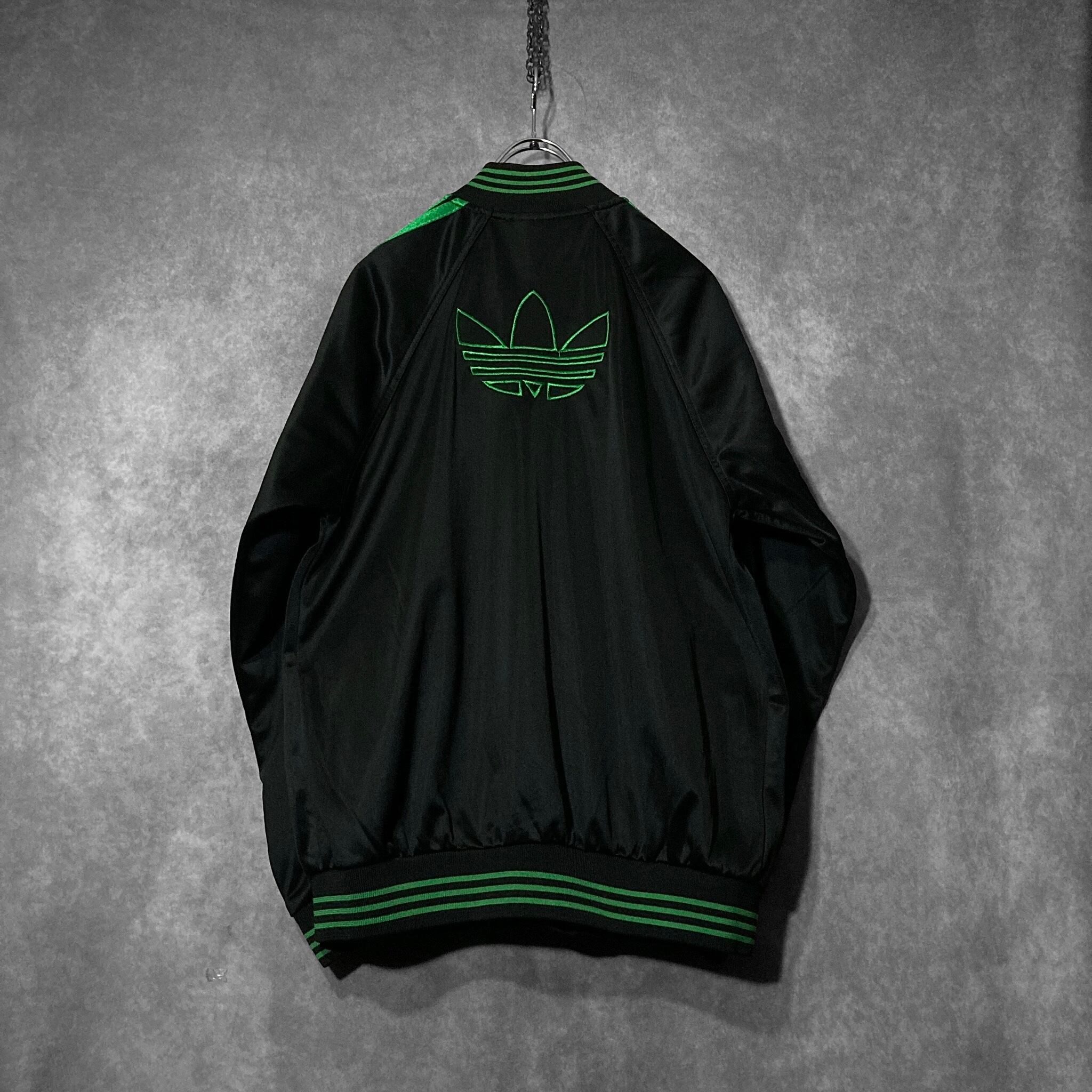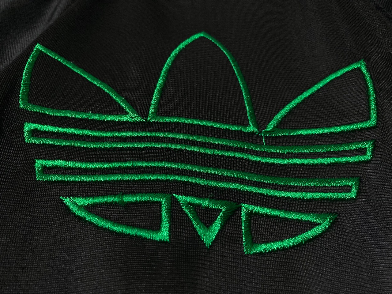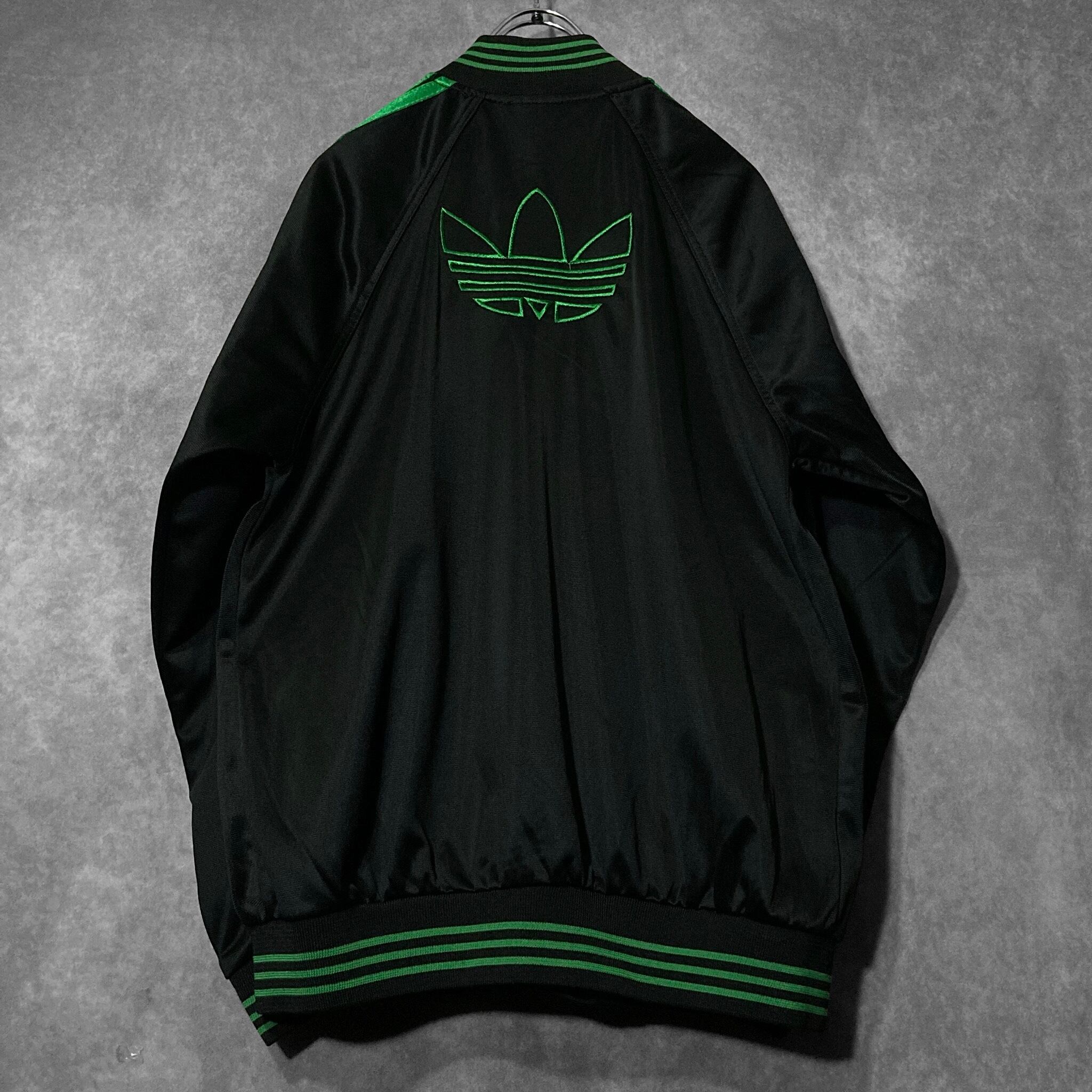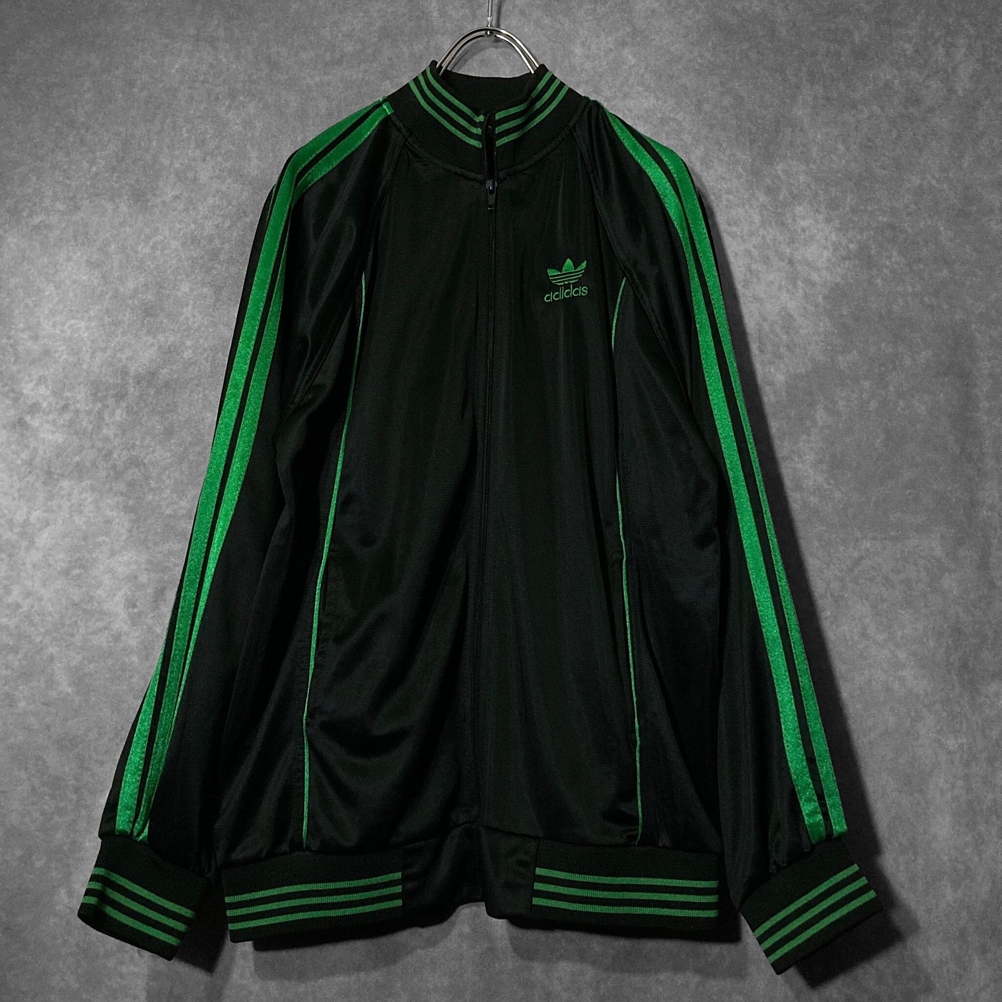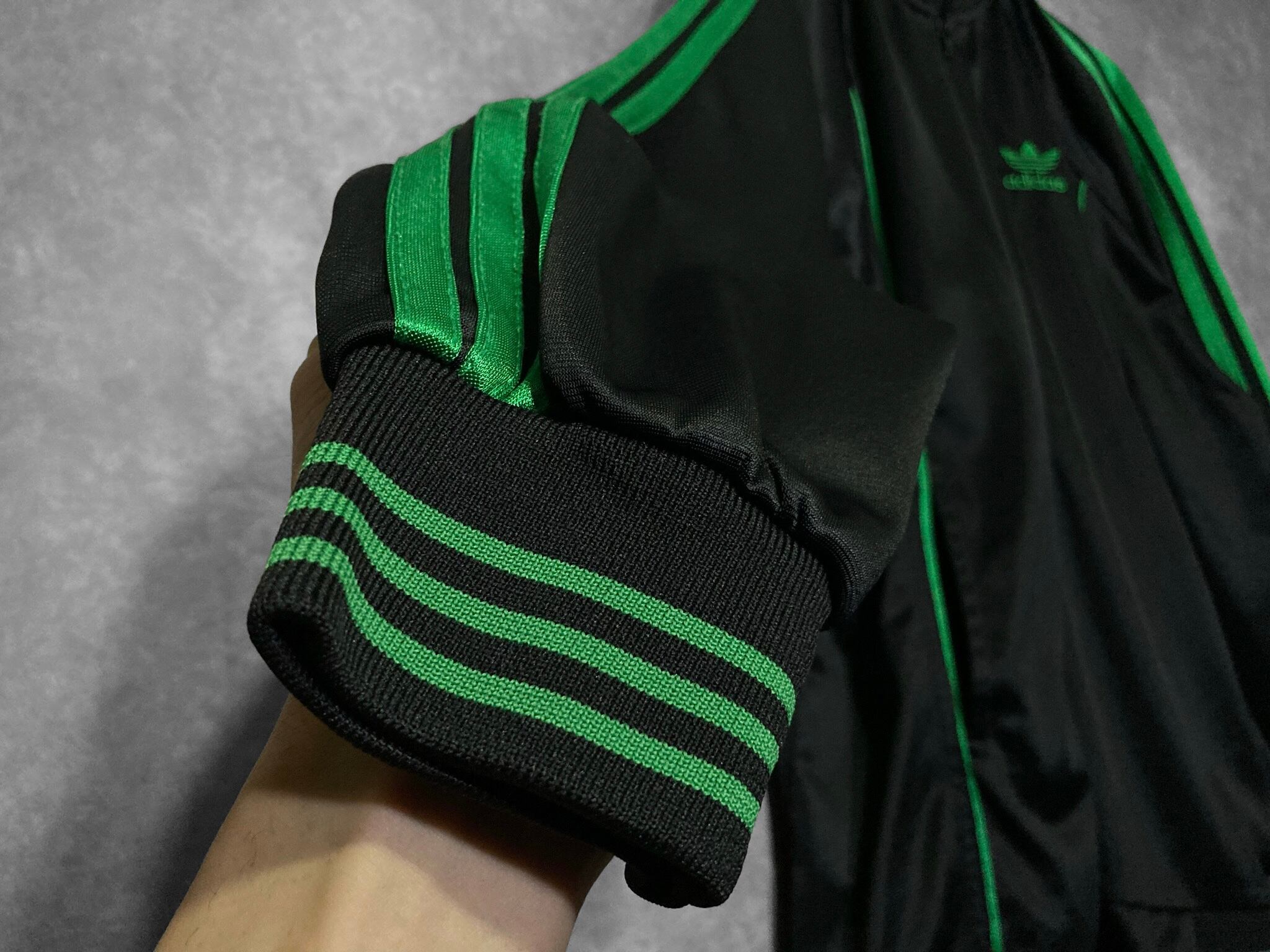 人気のスポーツファッションブランド・adidasより、ギラギラと反射したモンスターグリーンのスリーストライプが存在感を放つトラックジャケットの入荷です。