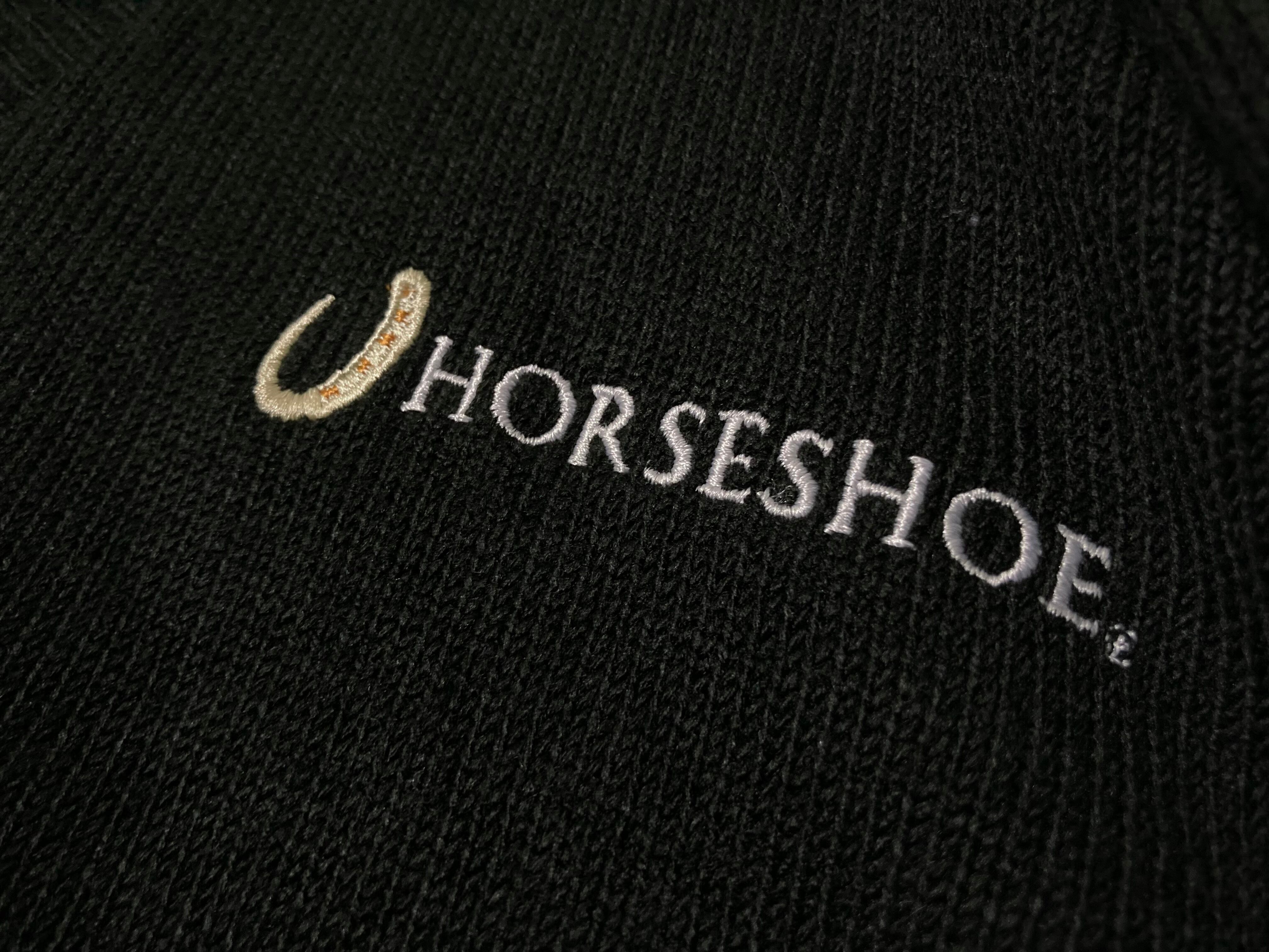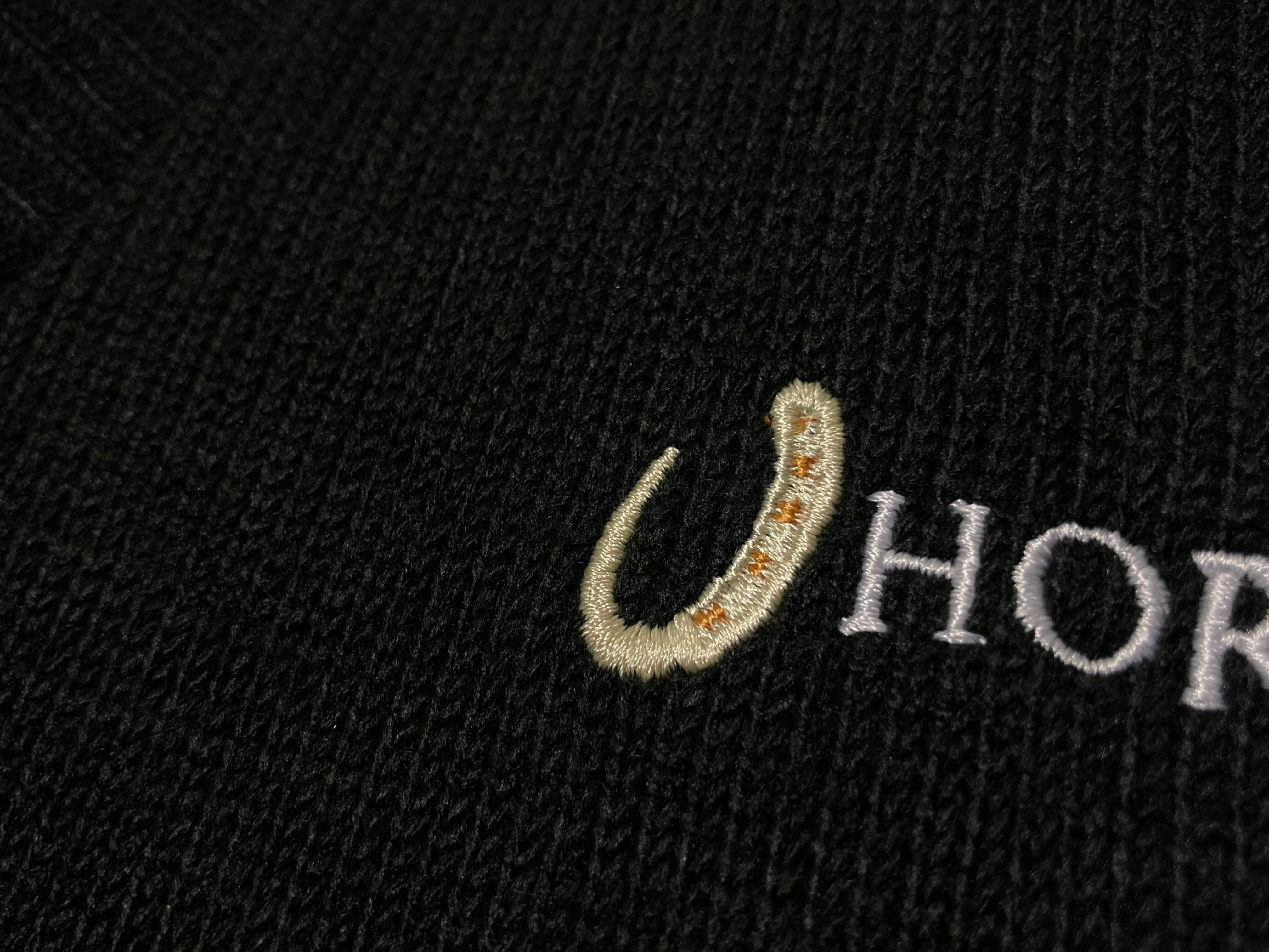 ホースシュー(馬蹄)は馬の蹄(ひづめ)に取り付けるU字型の保護具のことで、胸元にはホースシューのシルエットとロゴの刺繍が配され、ブラックに映えて存在感を放つデザイン。