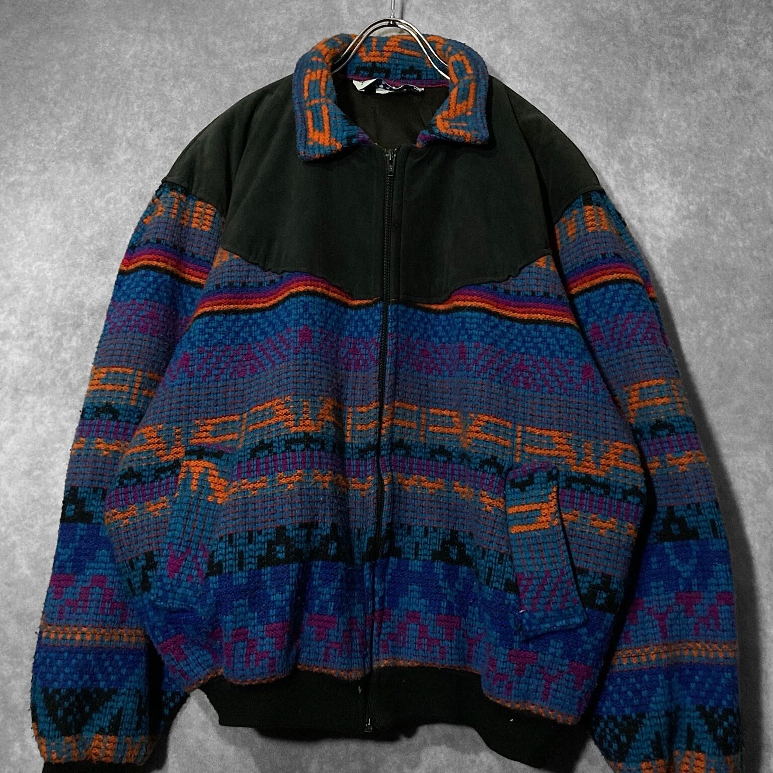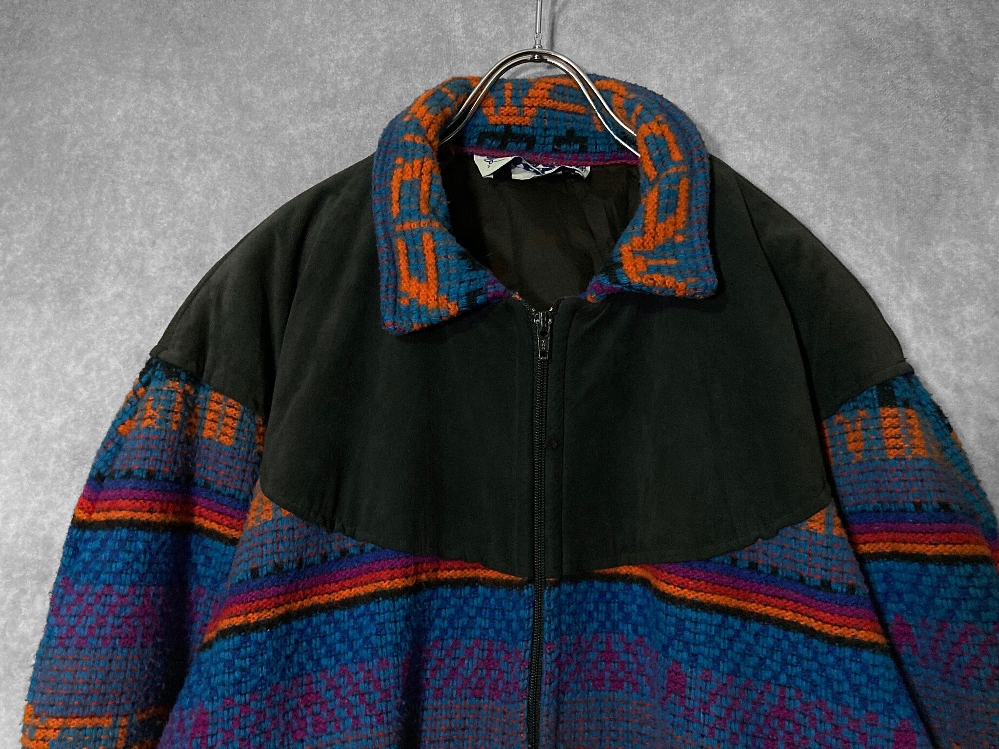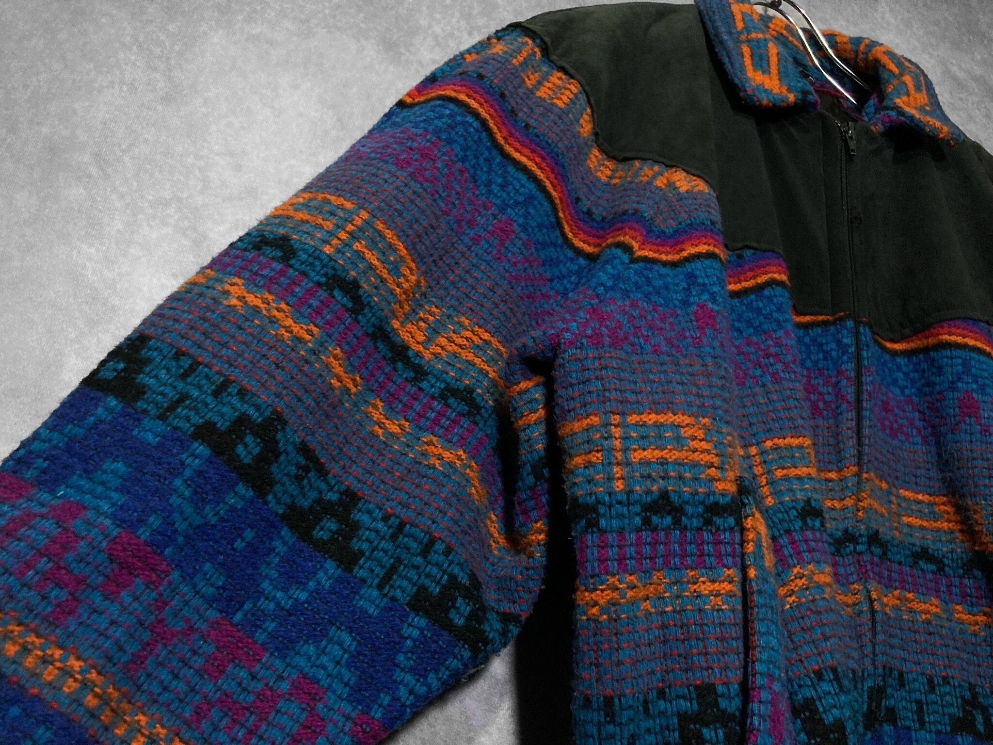 70-90's Native art all over pattern × faux suede leather switching full-zip jacket