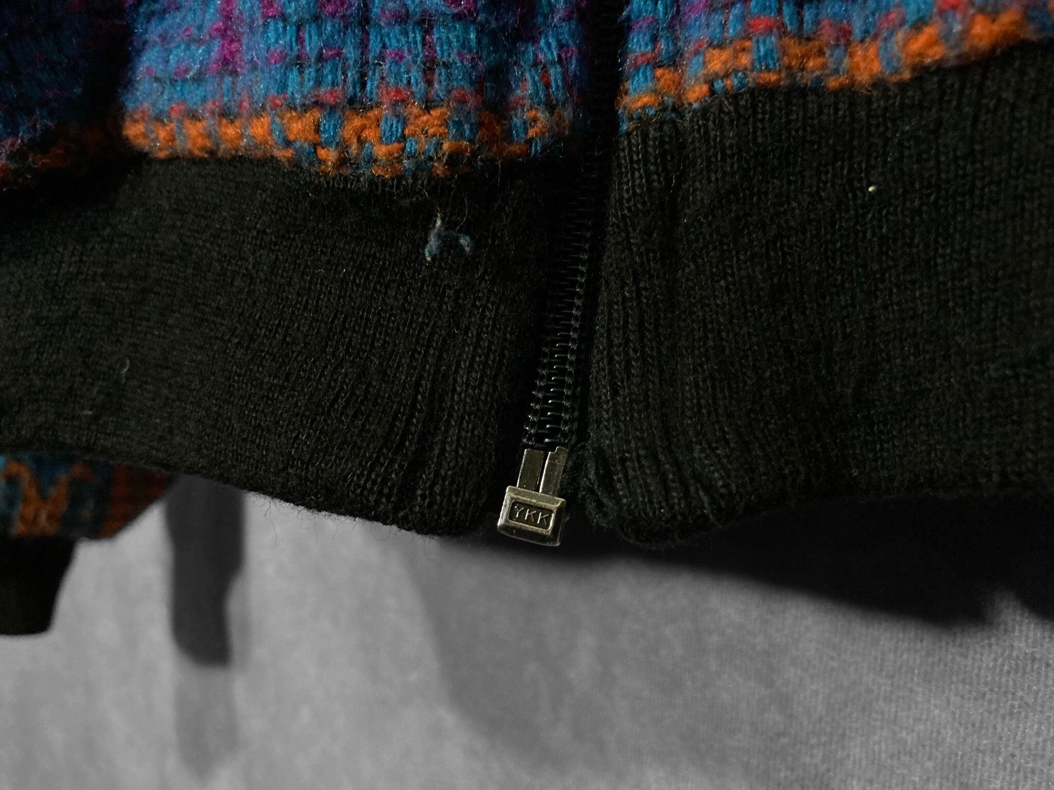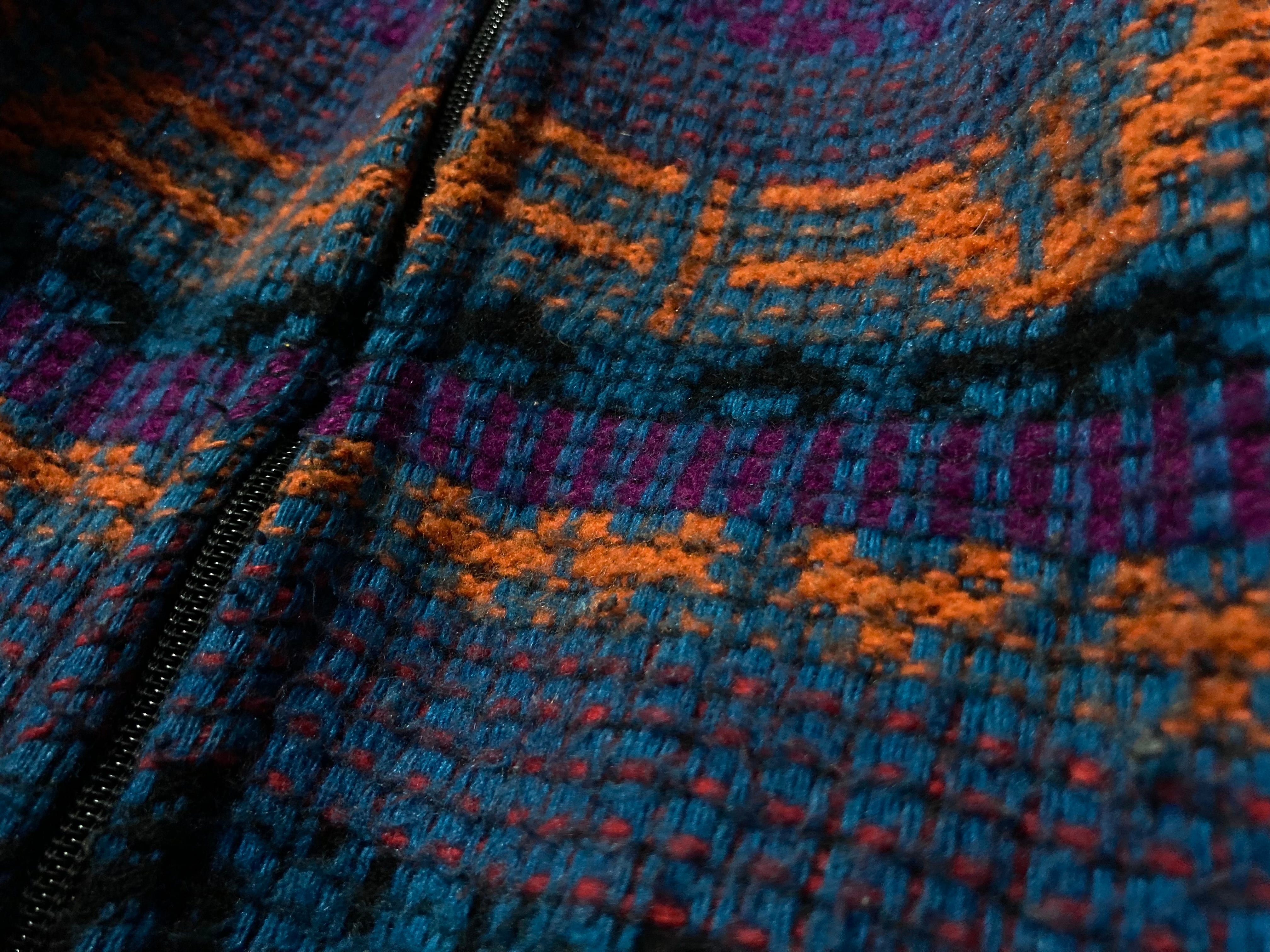 一見派手に見えるパターンもヨークの切り替えと絞られたリブにより、コントラストの効いた落ち着いた雰囲気に見えます。