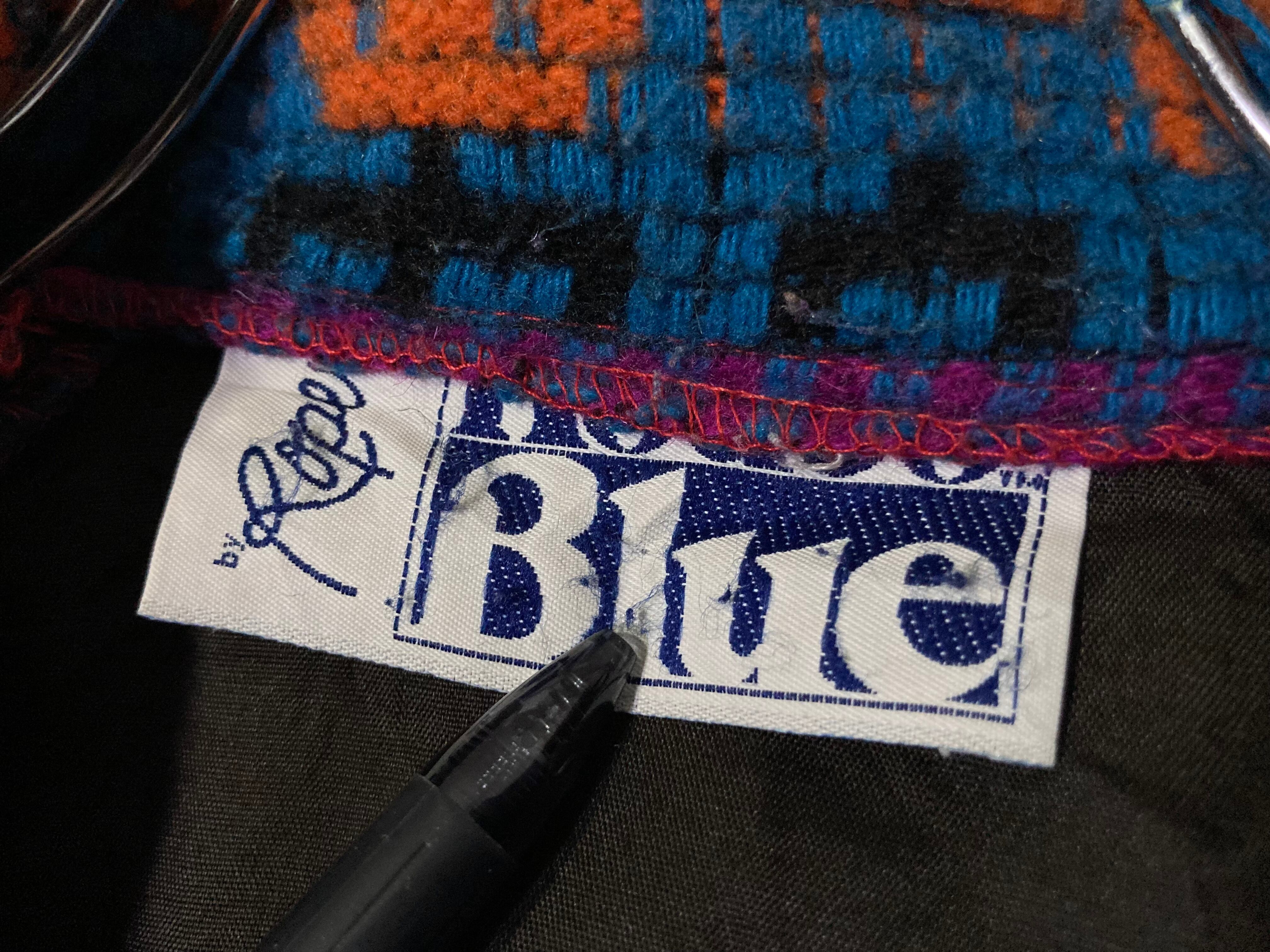 ブルーとオレンジのグラデーションが印象的な異国調の総柄の切り替えジャケット。