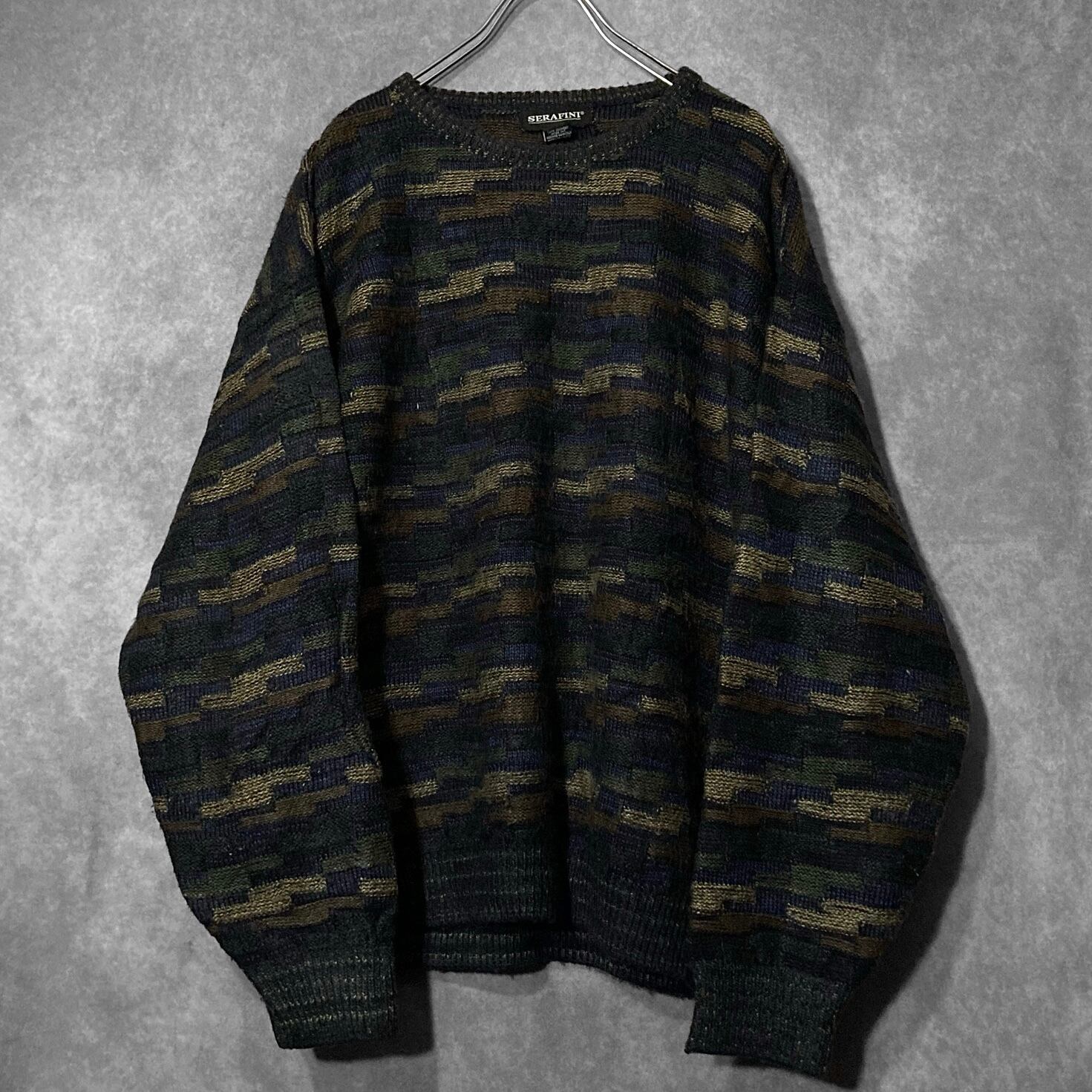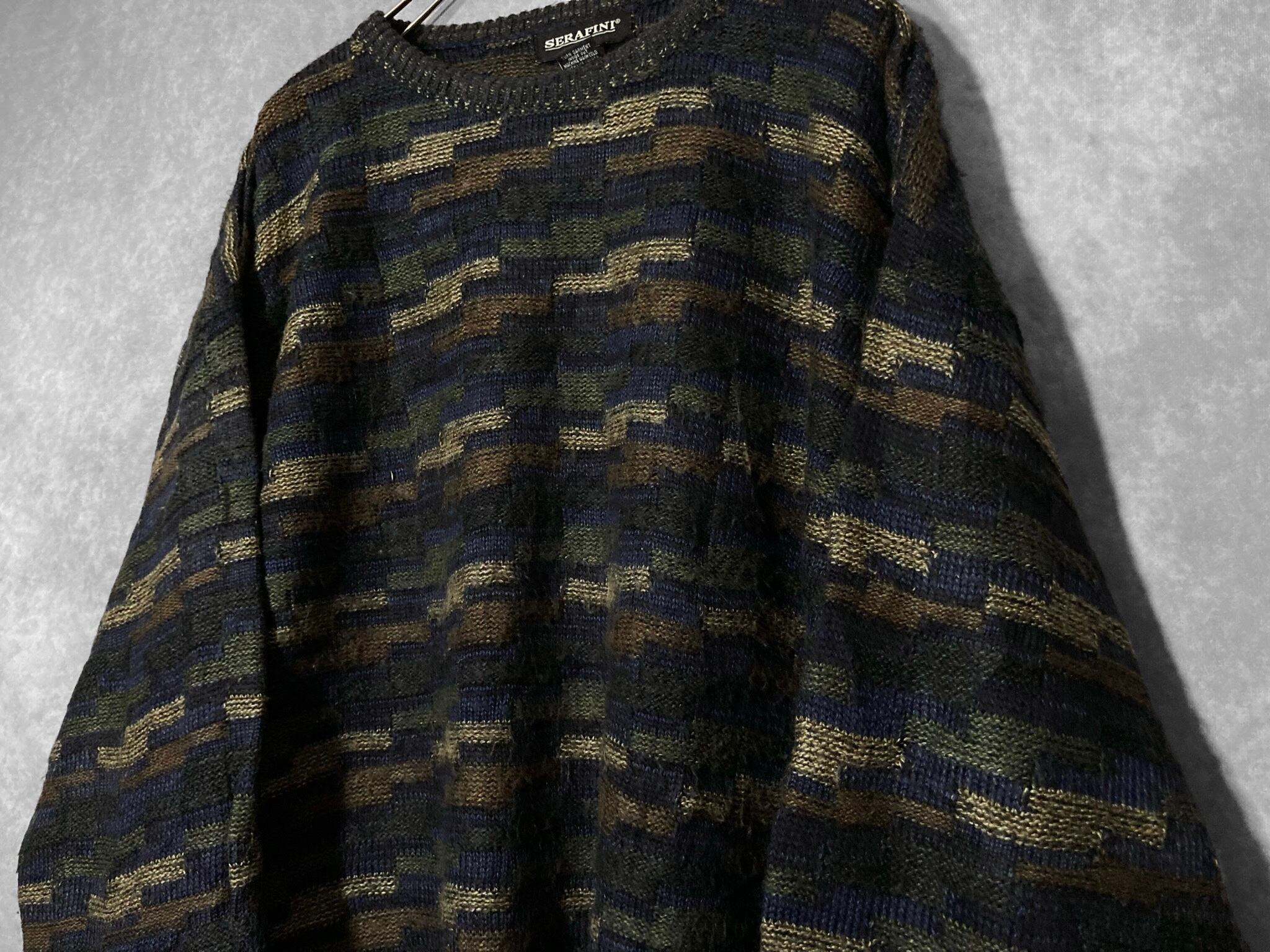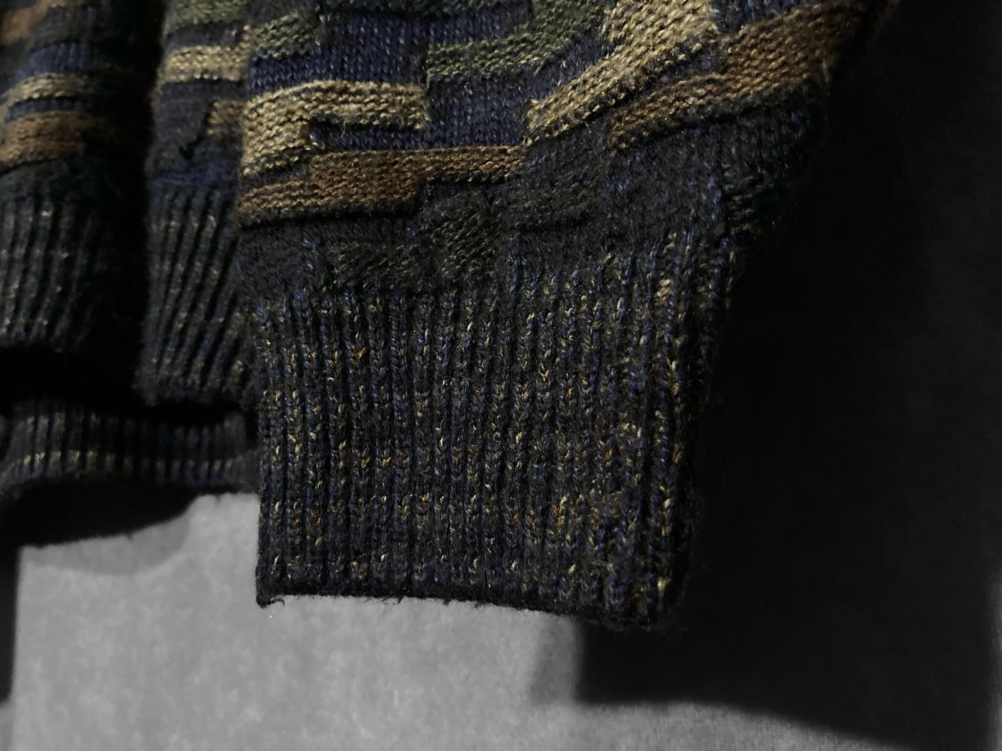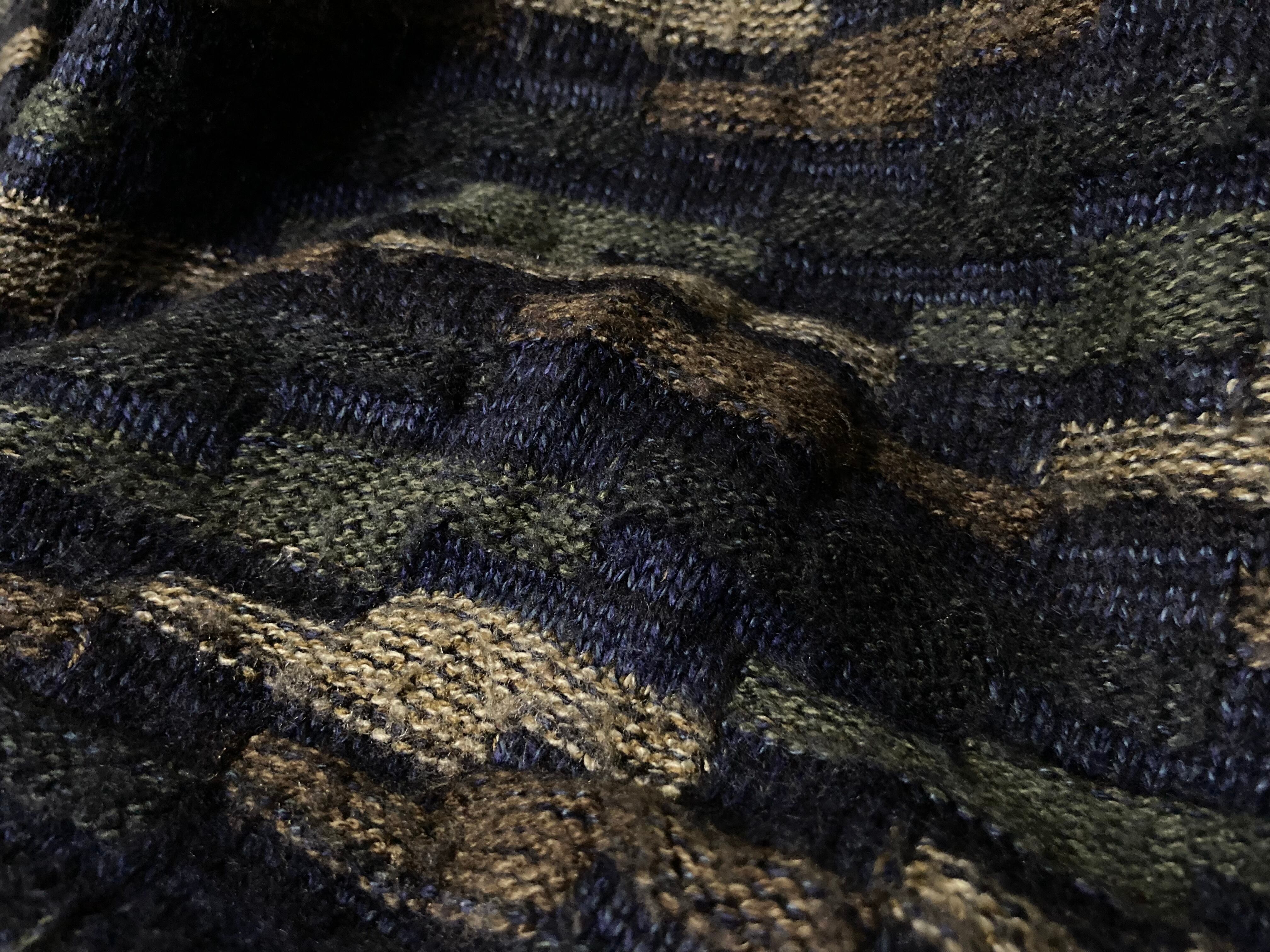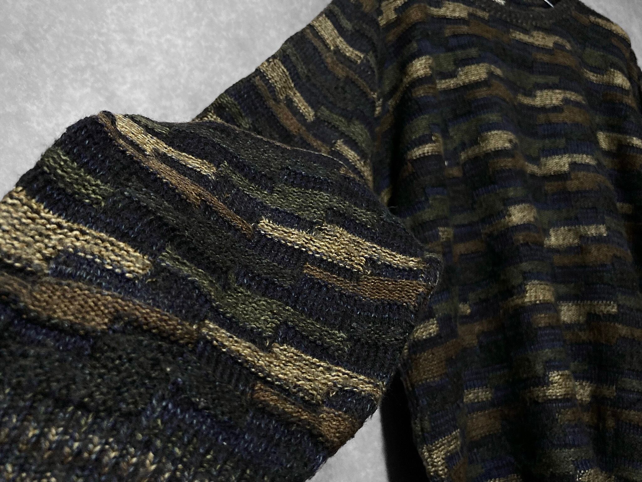 S字ブロックが積み重なったようなアースカラーの幾何学柄の雰囲気ムンムンな総柄デザインニットの入荷です。