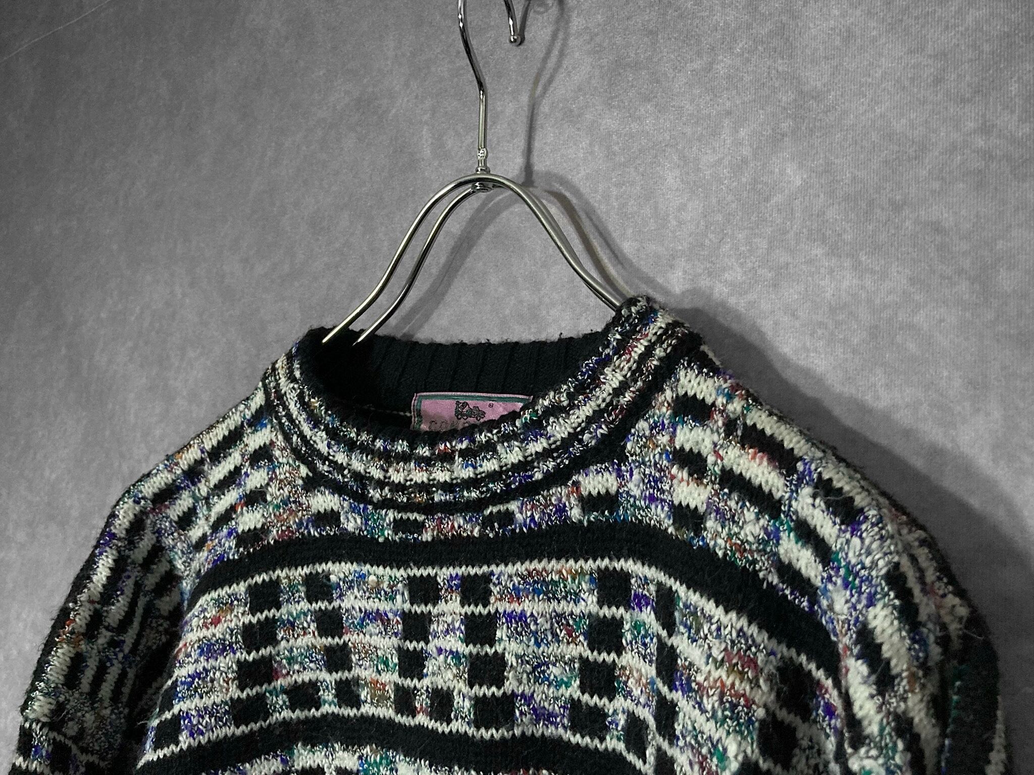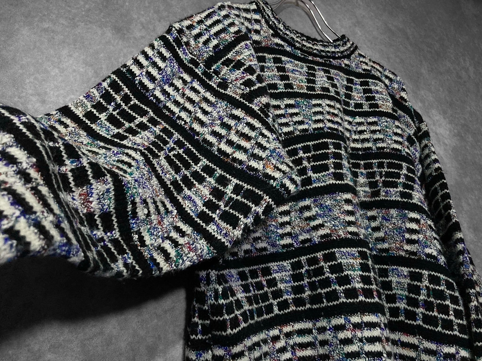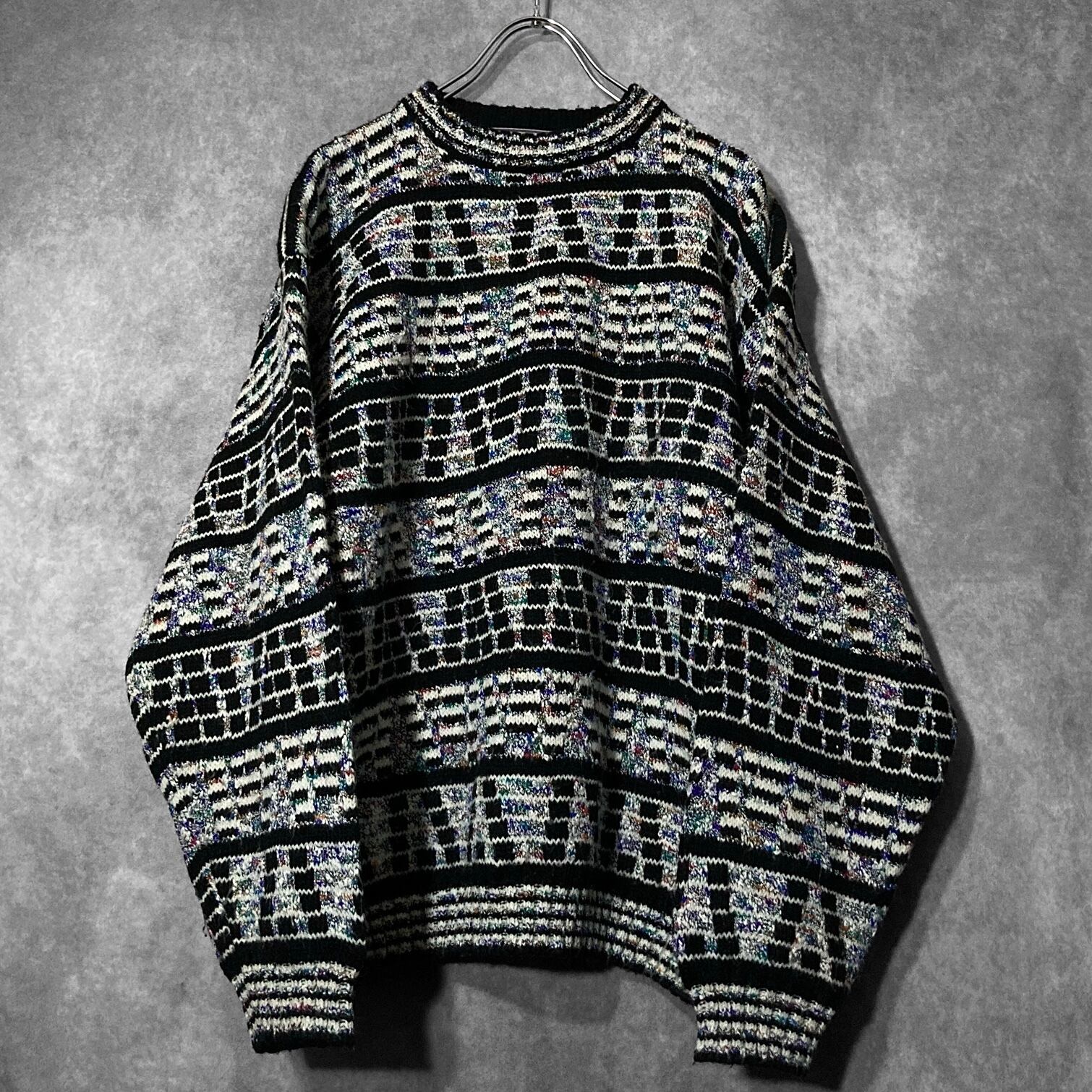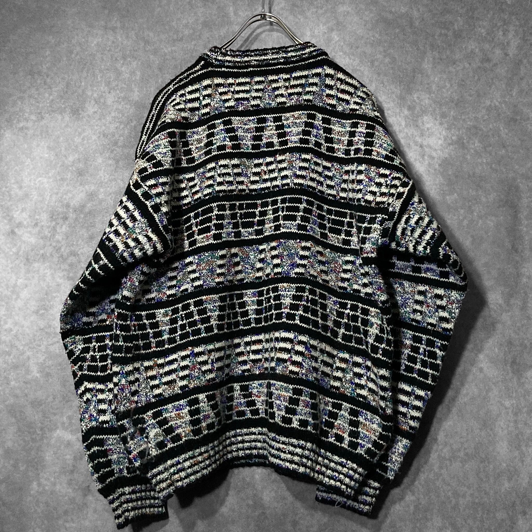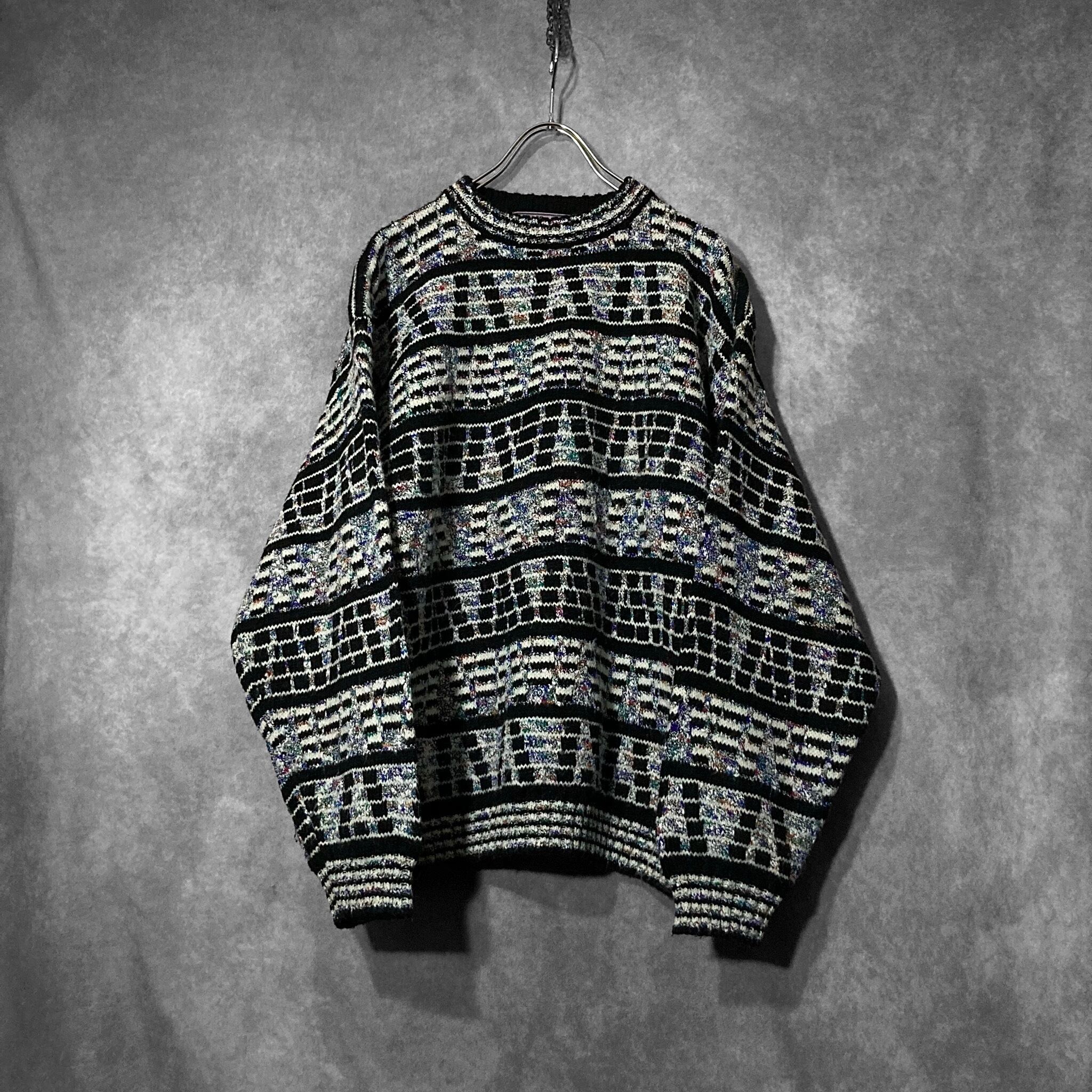 ディスプレイのノイズ画面のような幾何学模様の総柄が雰囲気ムンムンなデザインニットの入荷です。