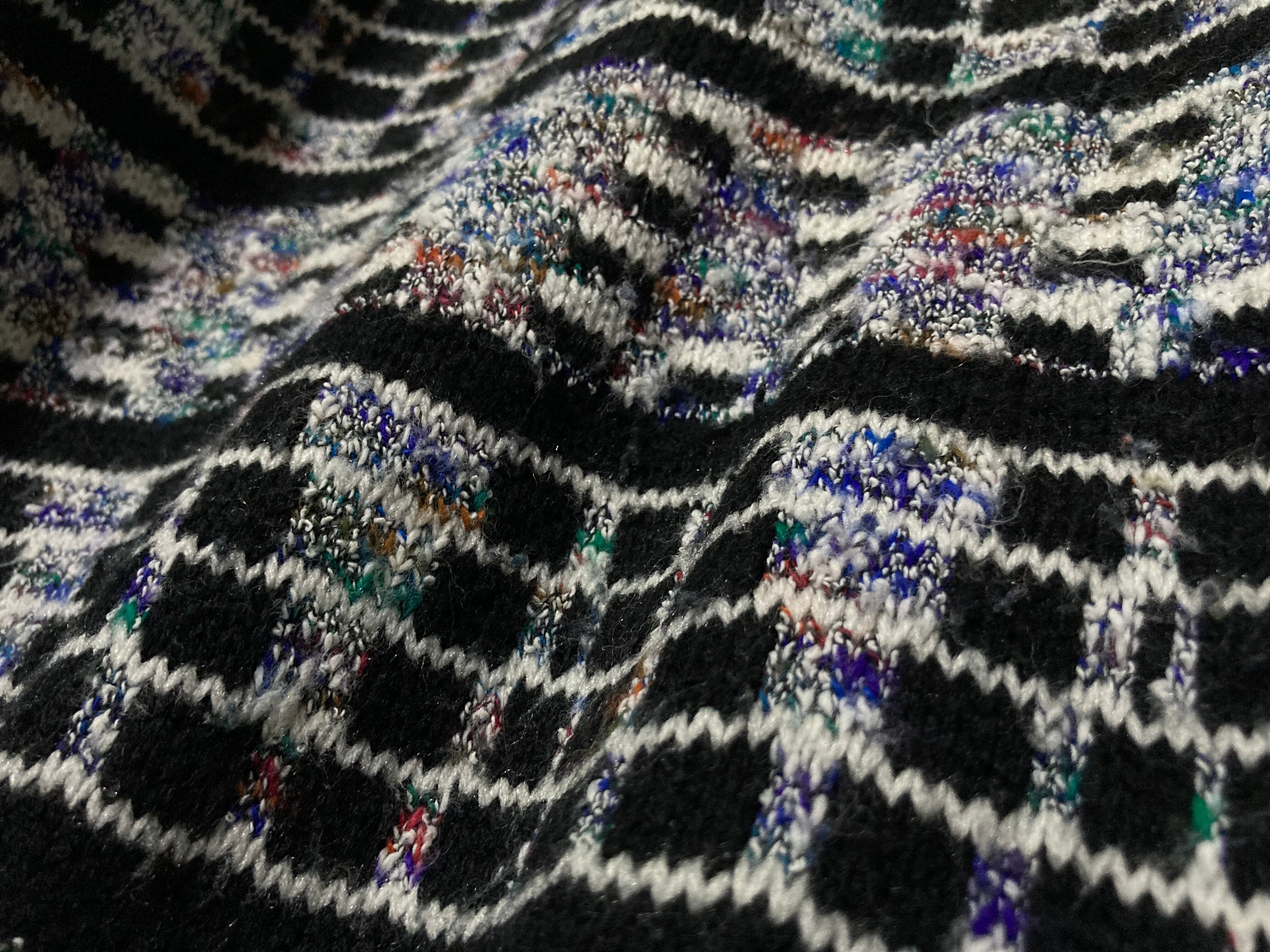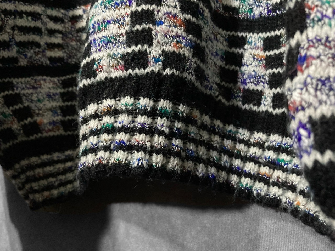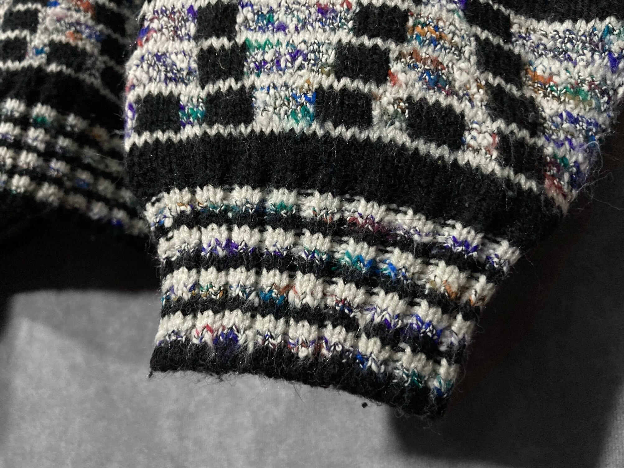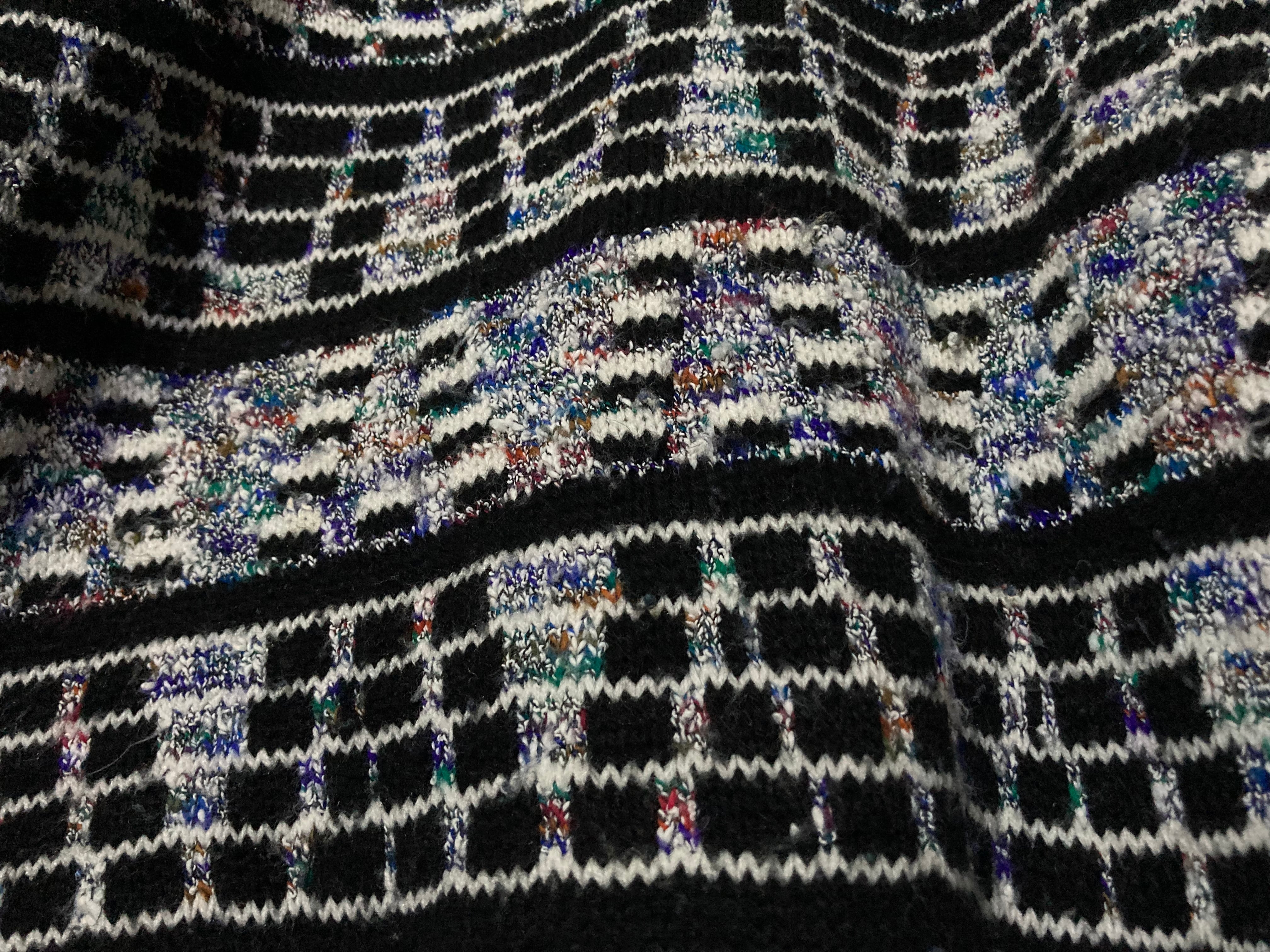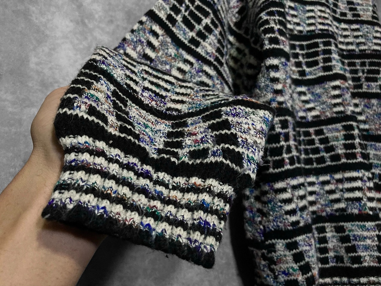 ディスプレイのノイズ画面のような幾何学模様の総柄が雰囲気ムンムンなデザインニットの入荷です。