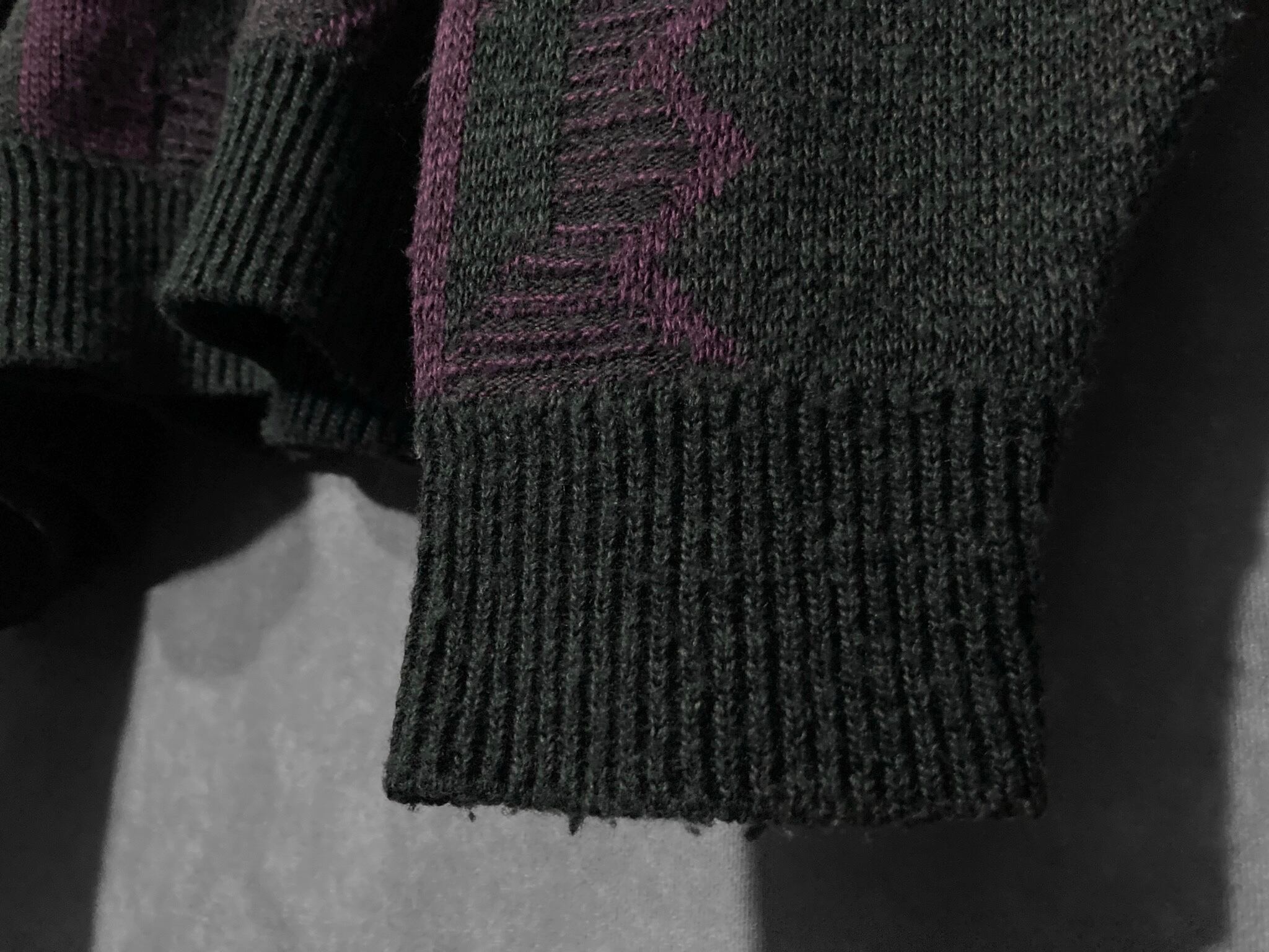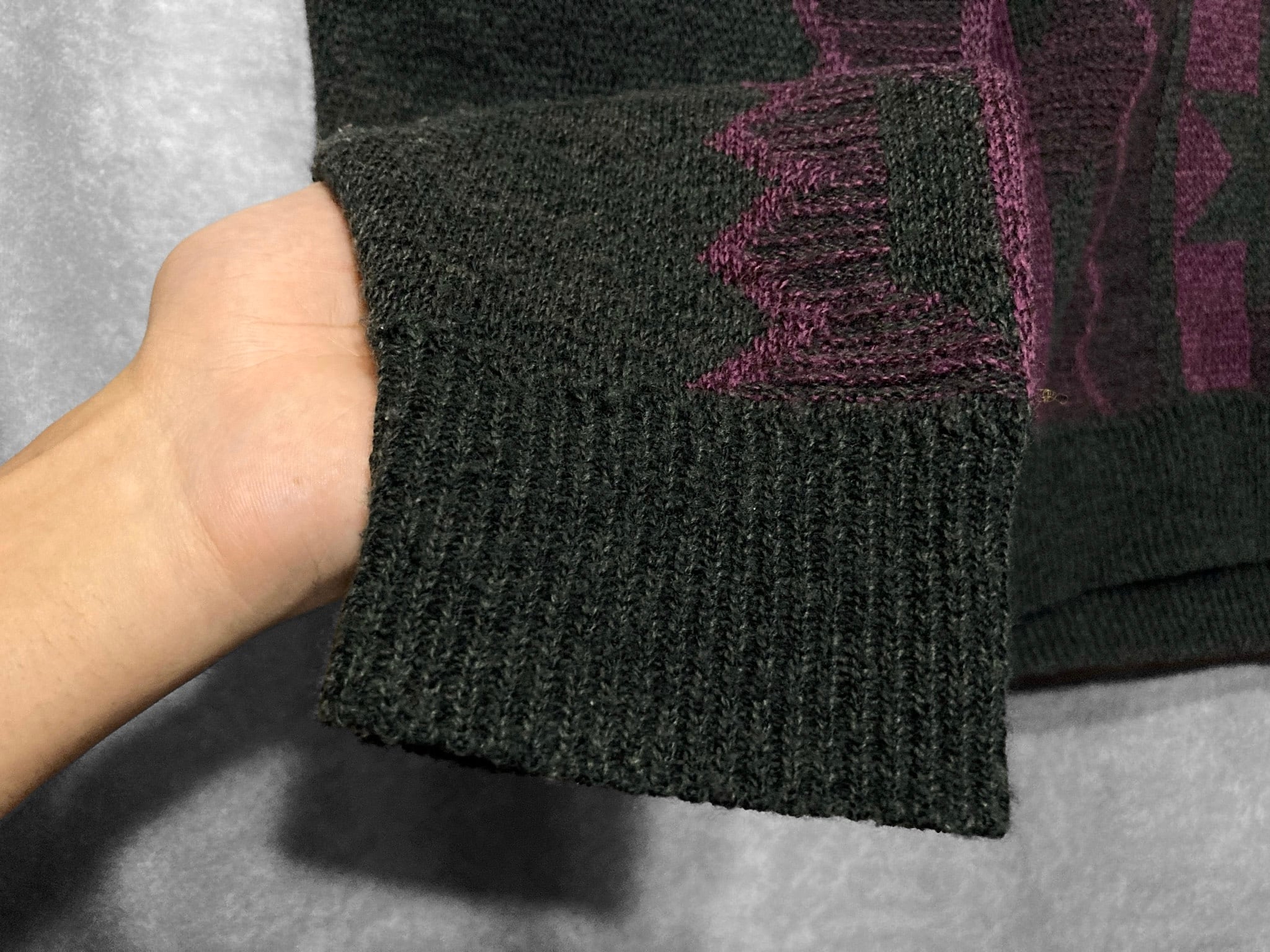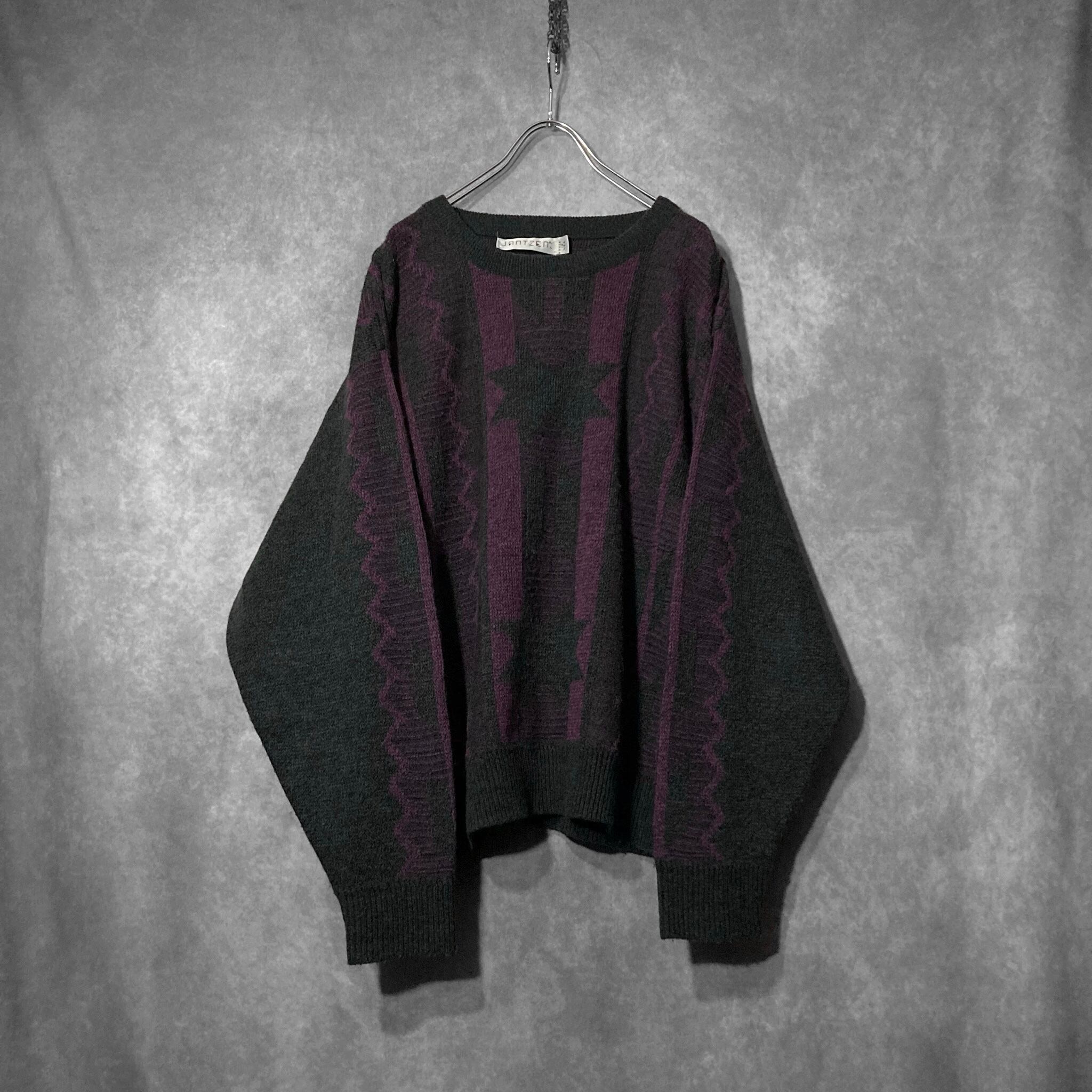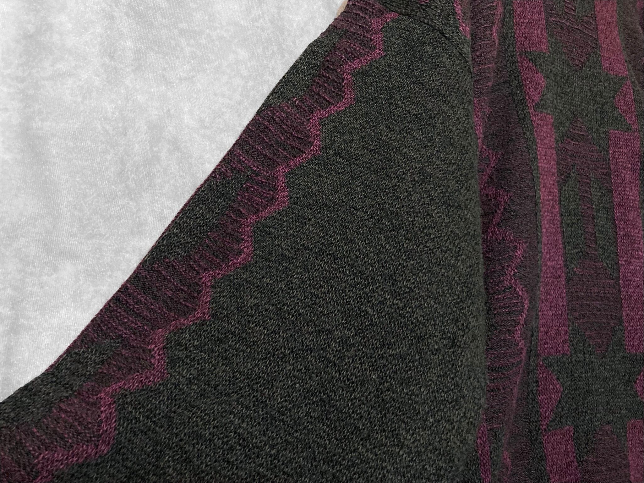 無機質なコンクリートグレーのベースにパープルカラーのサイケデリックなラインが印象的なデザインニットセーターの入荷です。