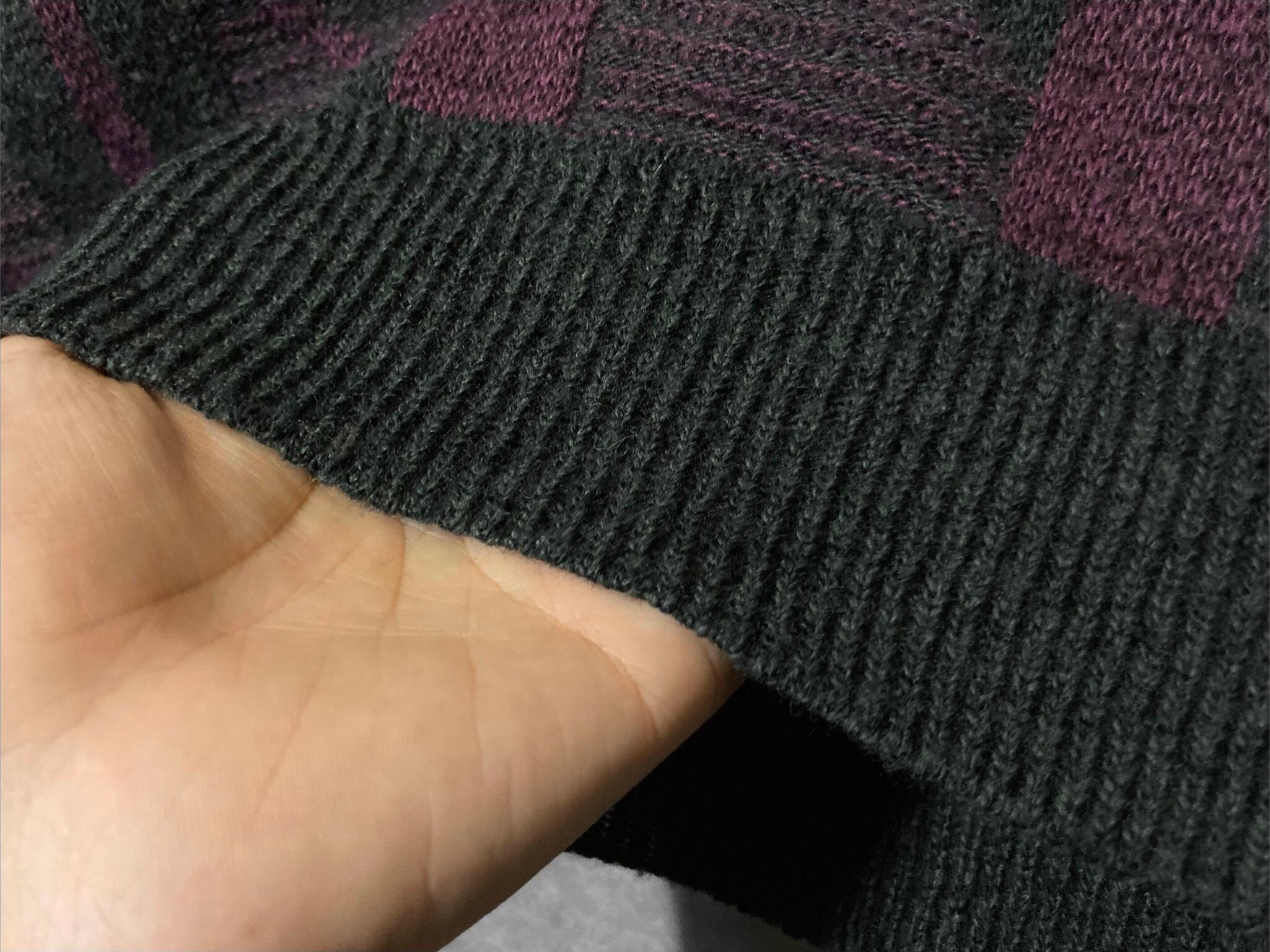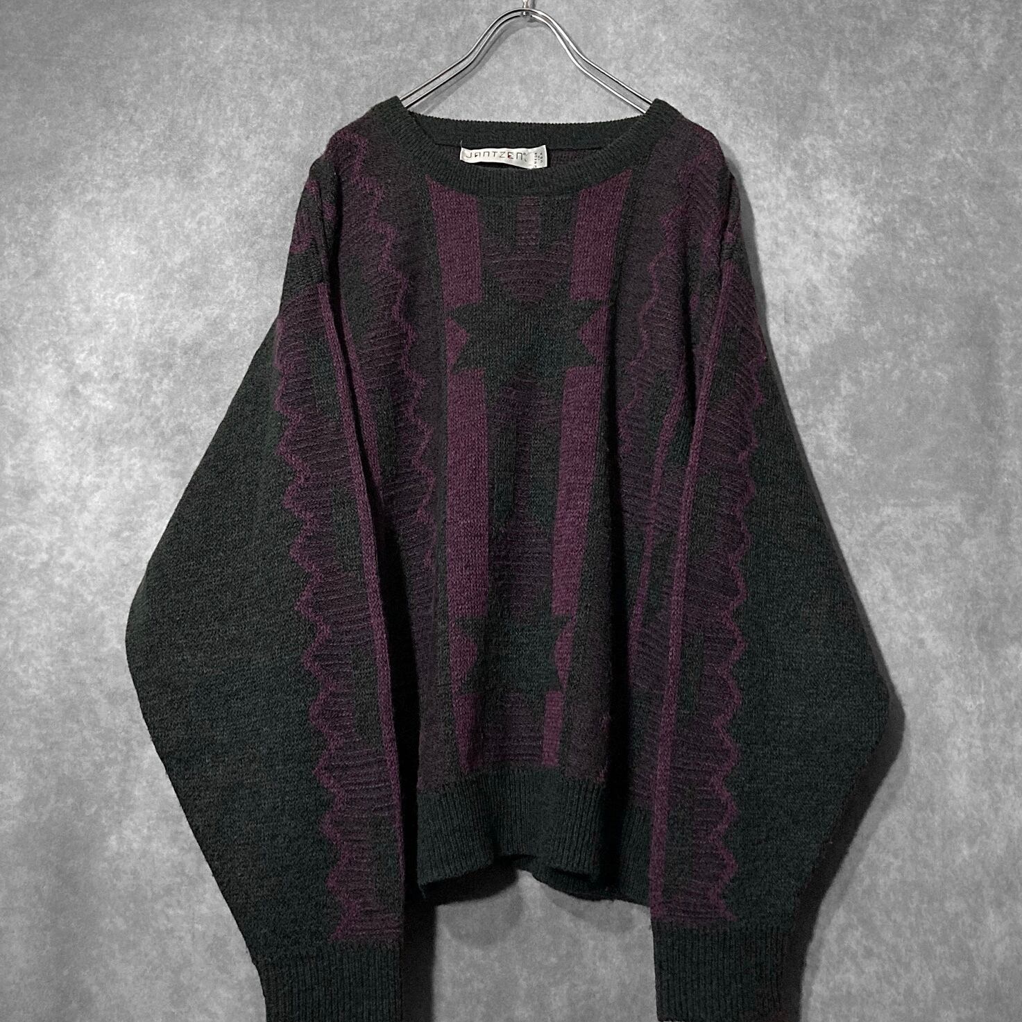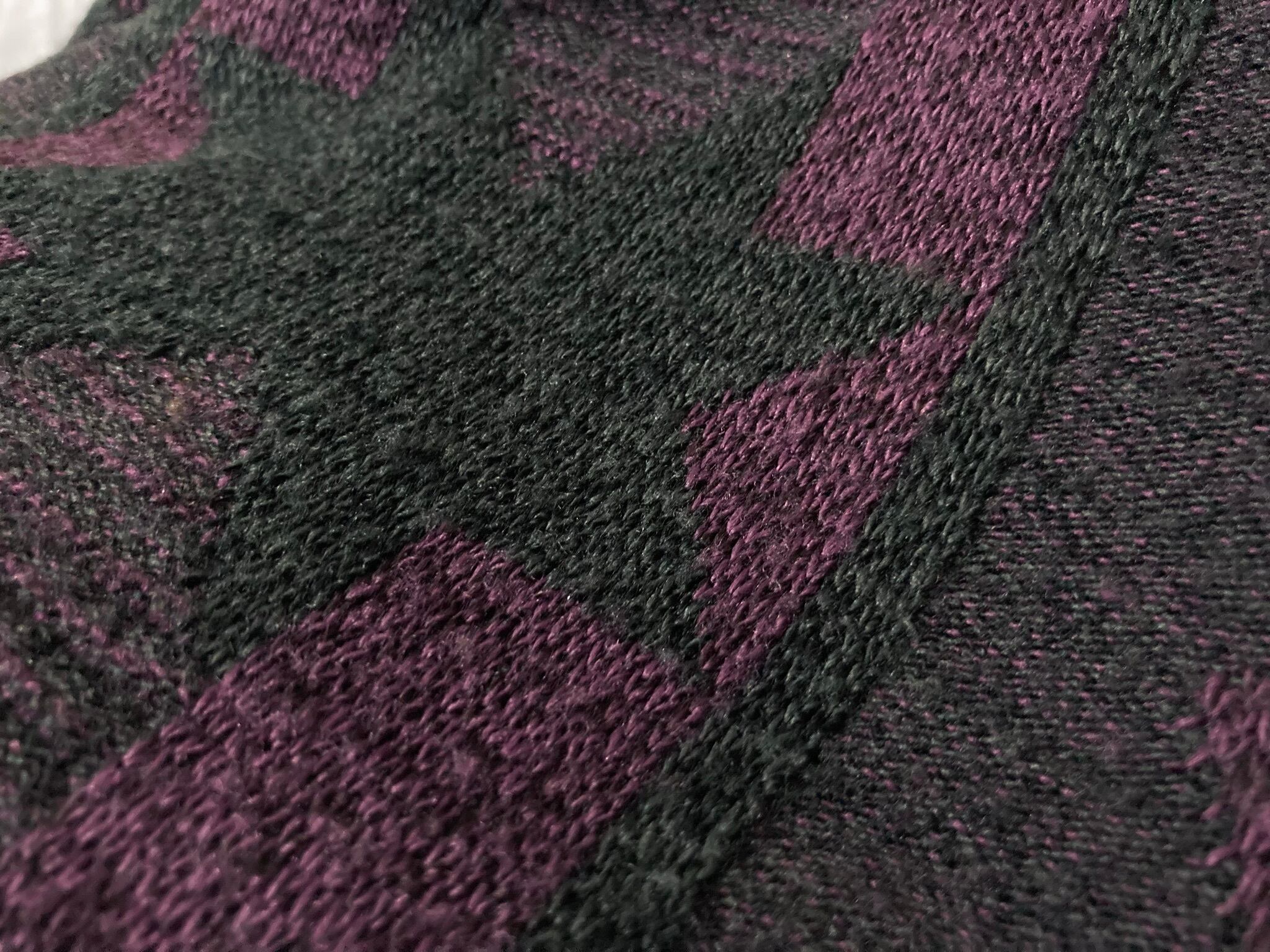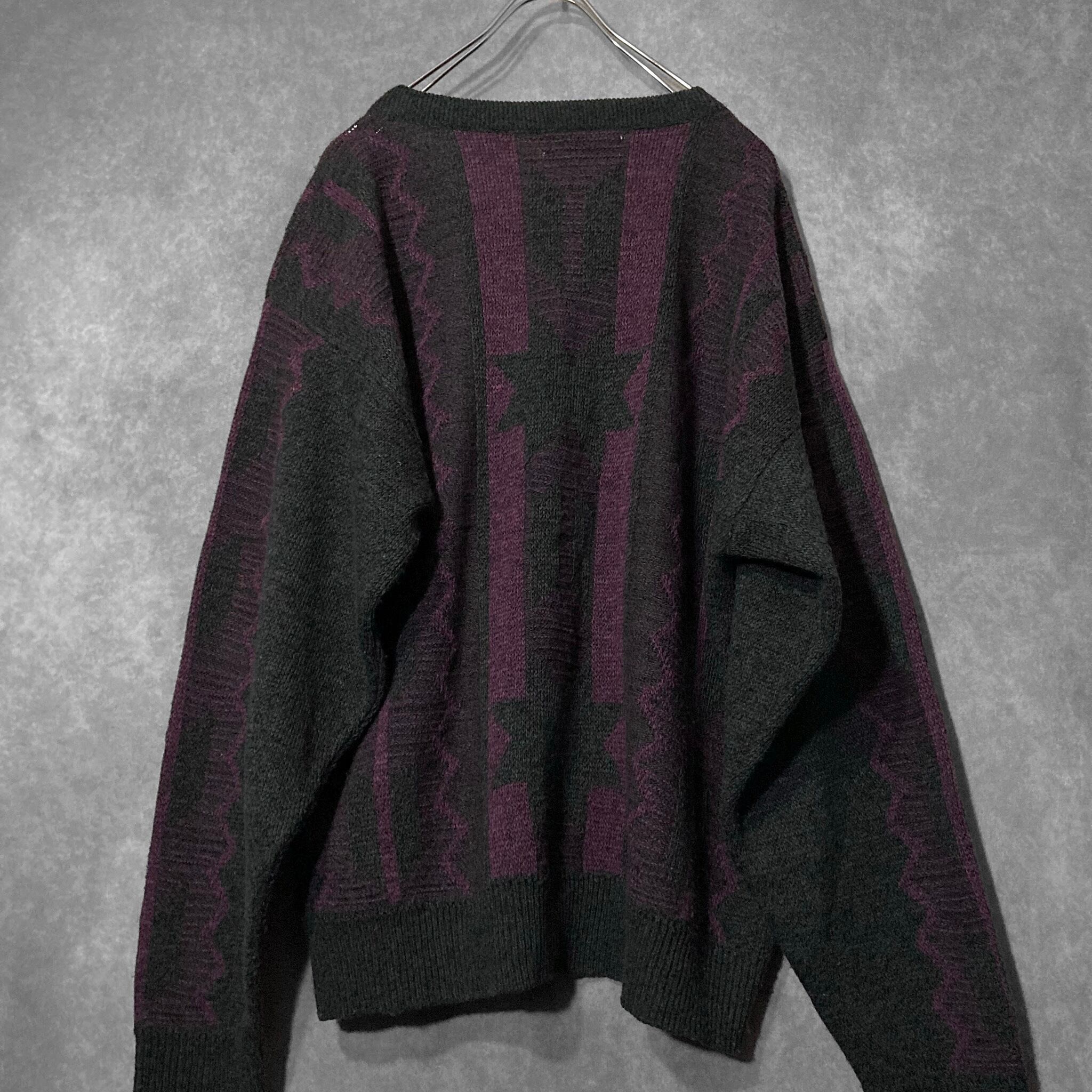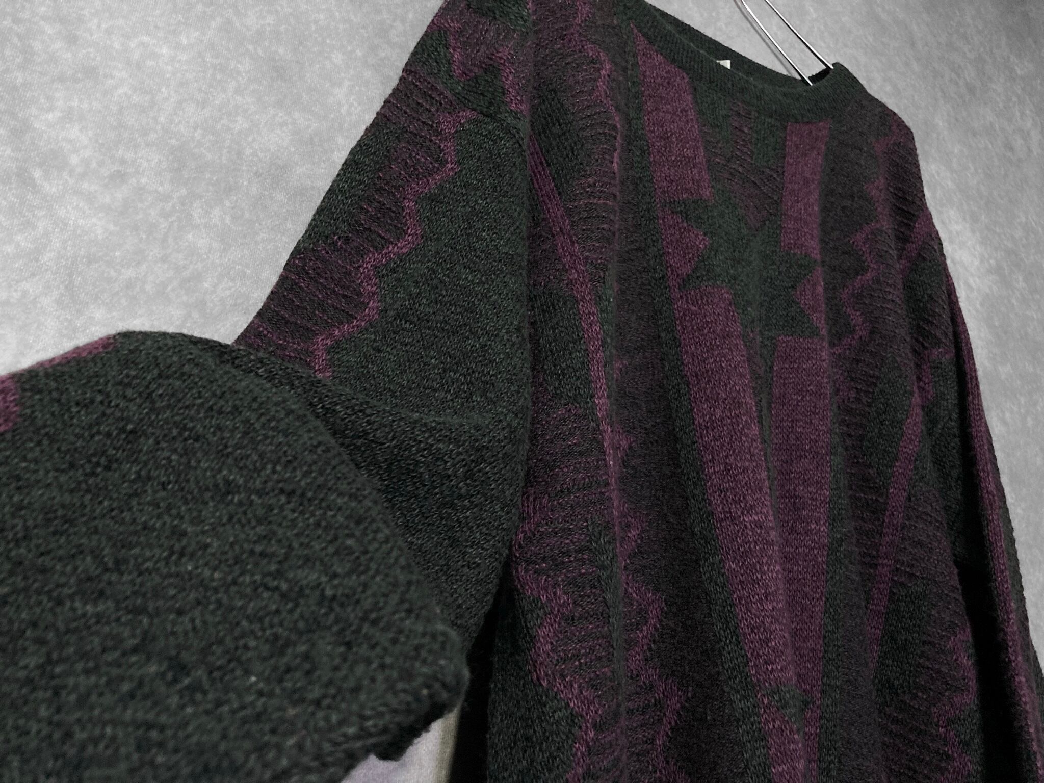 無機質なコンクリートグレーのベースにパープルカラーのサイケデリックなラインが印象的なデザインニットセーターの入荷です。