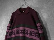 Burgundy-colored Uneven texture design fabric × pile fabric ethnic pattern design Collared Knit Sweater