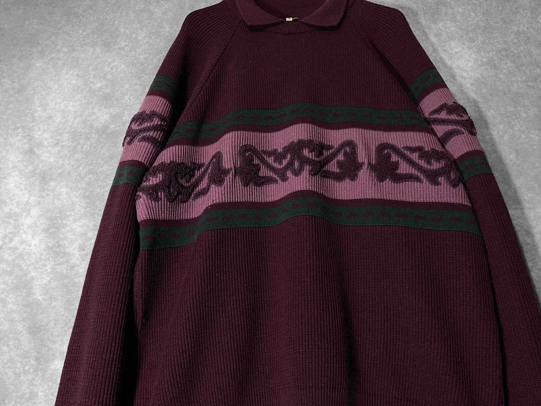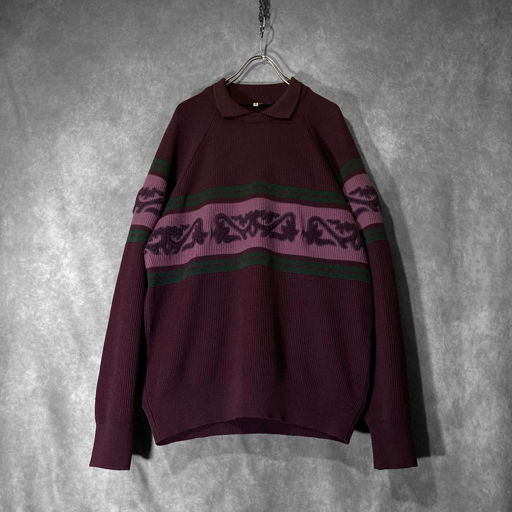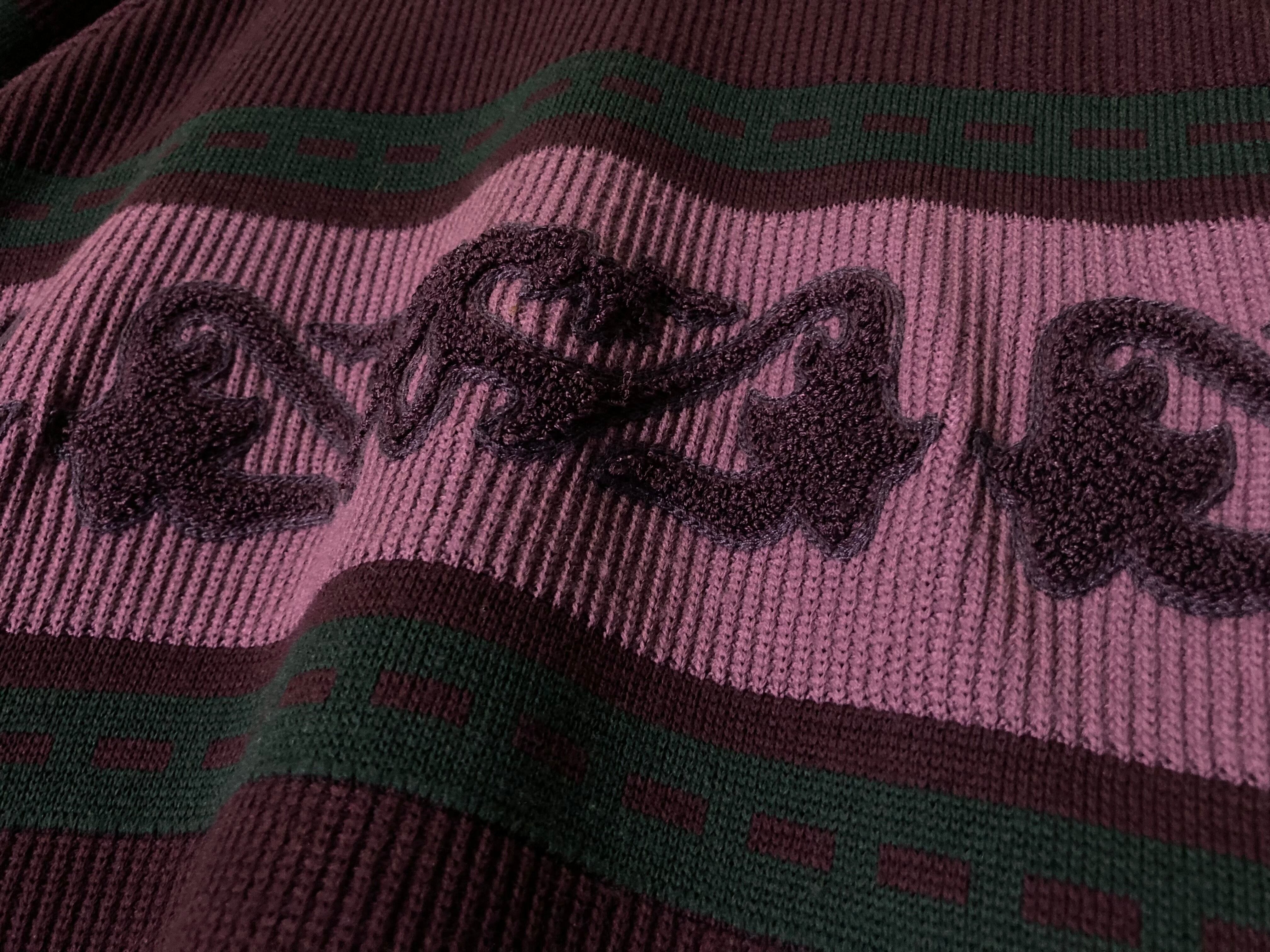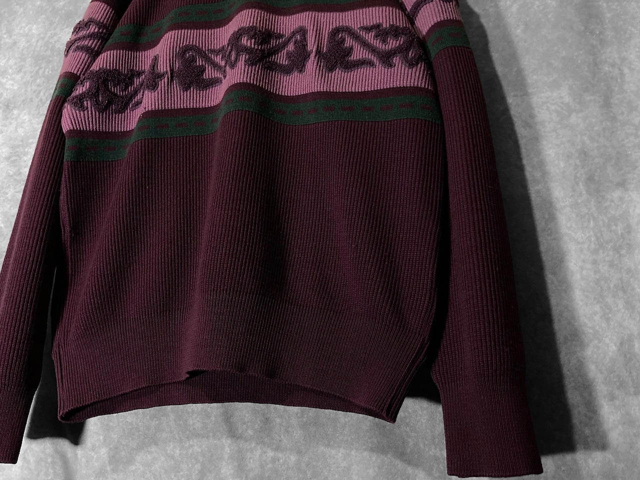 毎回好評の当店が厳選してピックアップするニットコレクションより、バーガンディーの色味とパイル起毛のエスニックな模様が雰囲気ムンムンなデザインニットが入荷です。