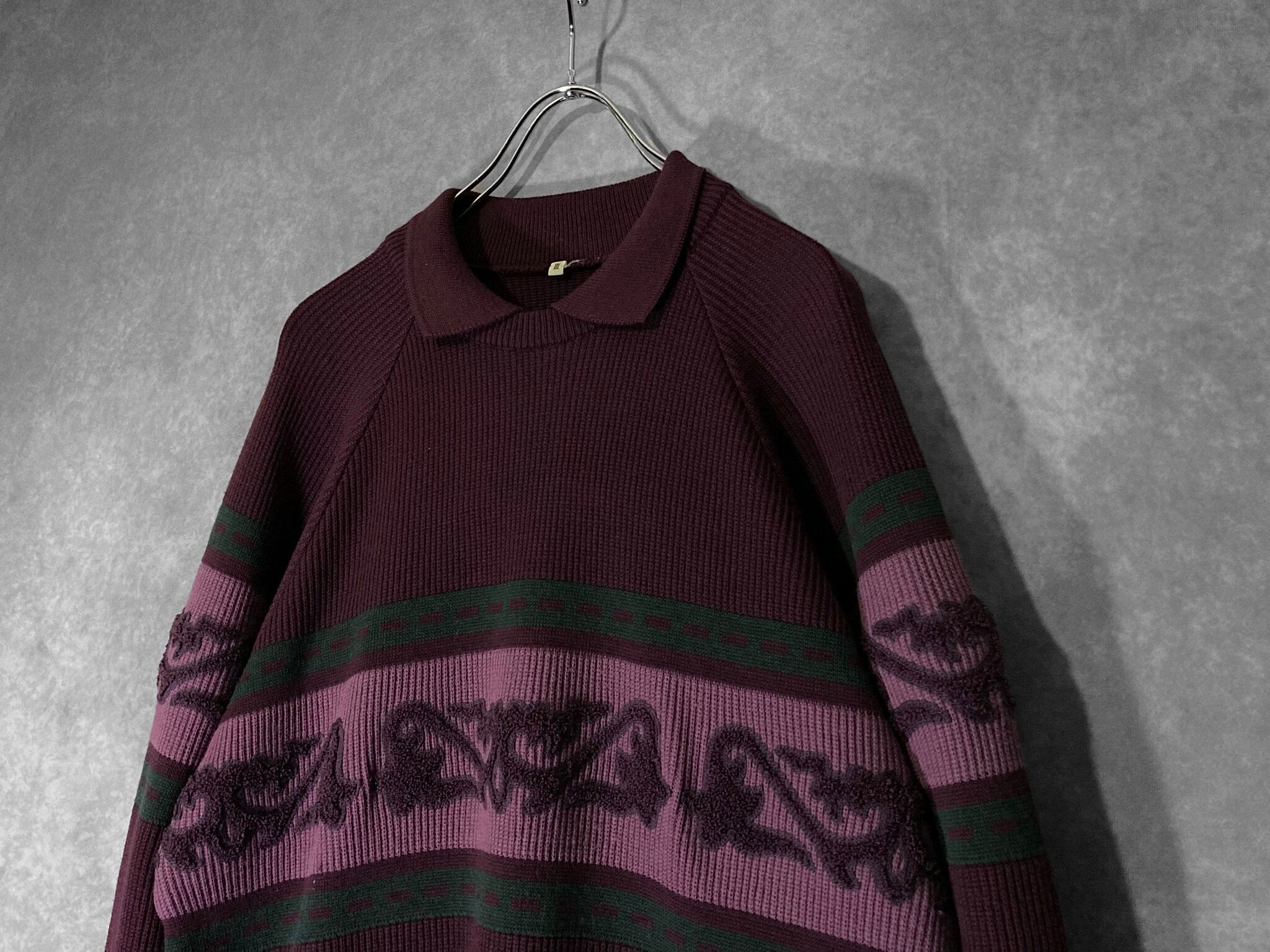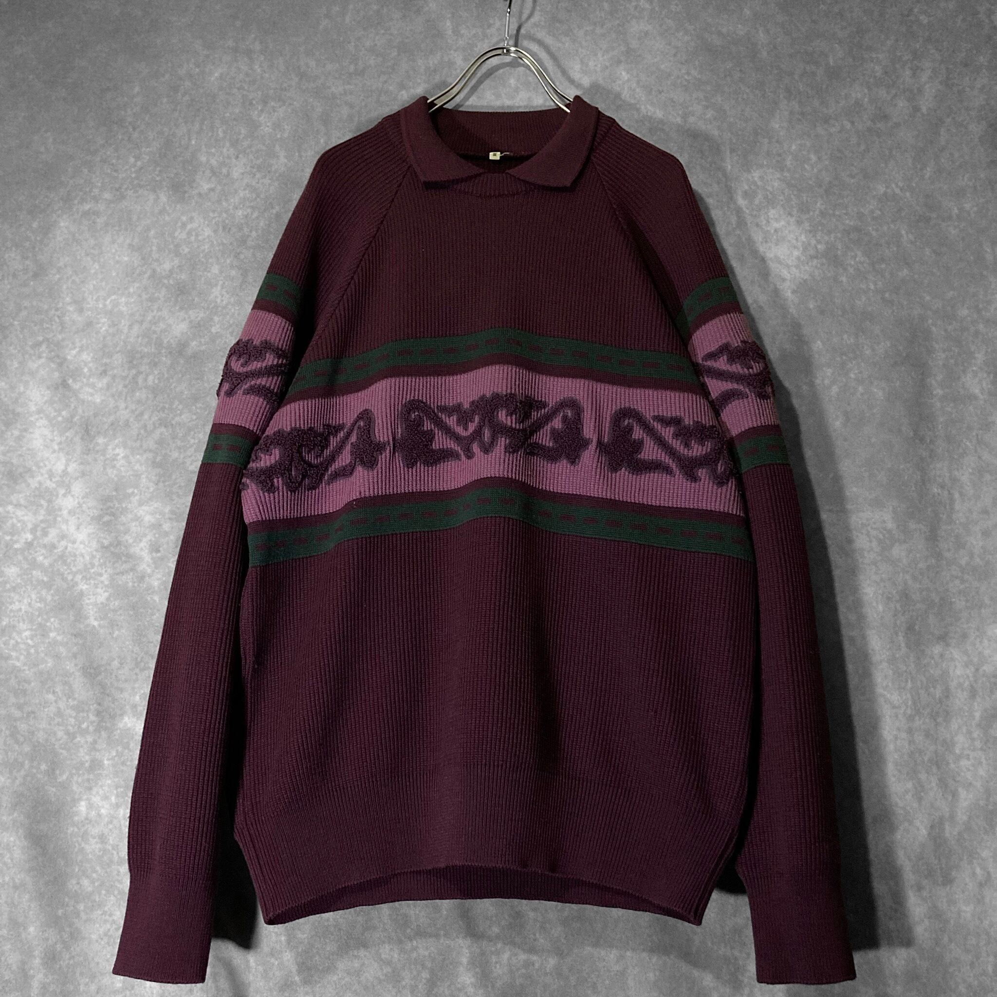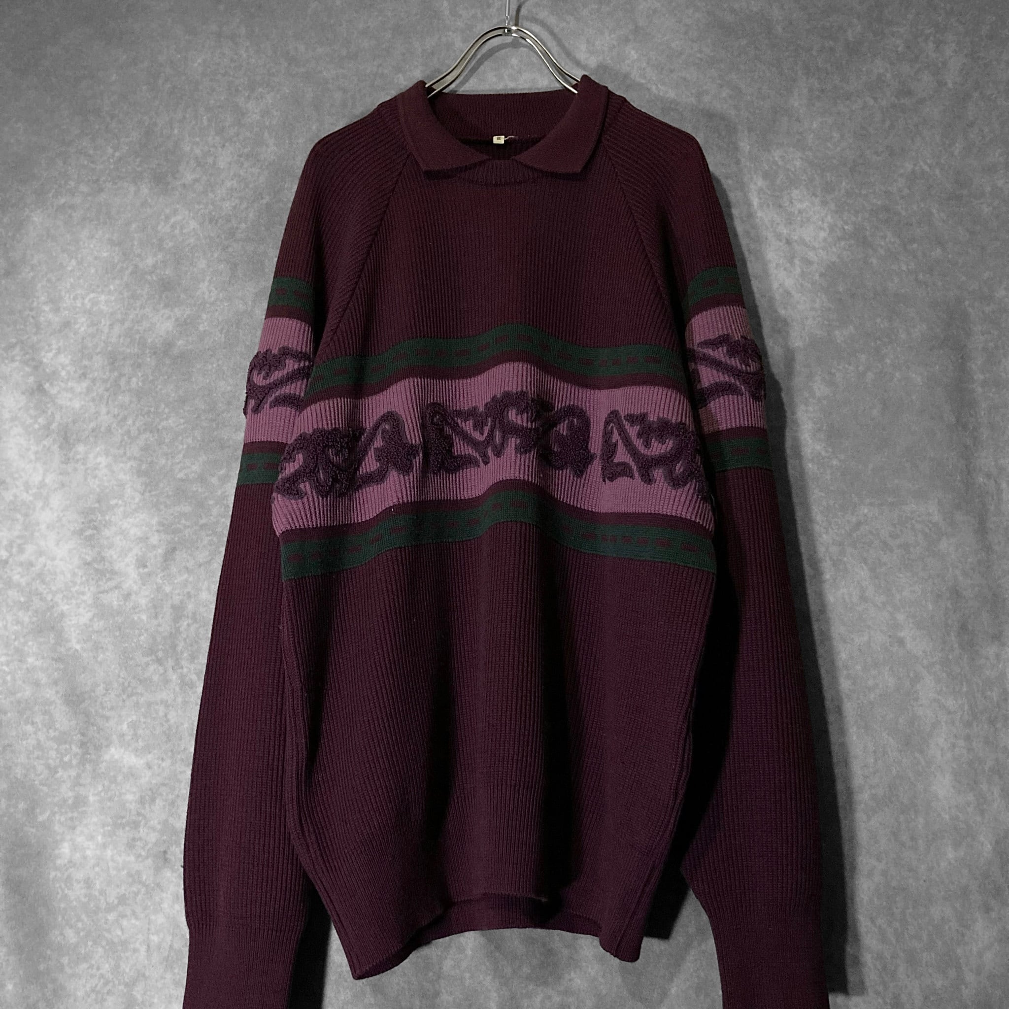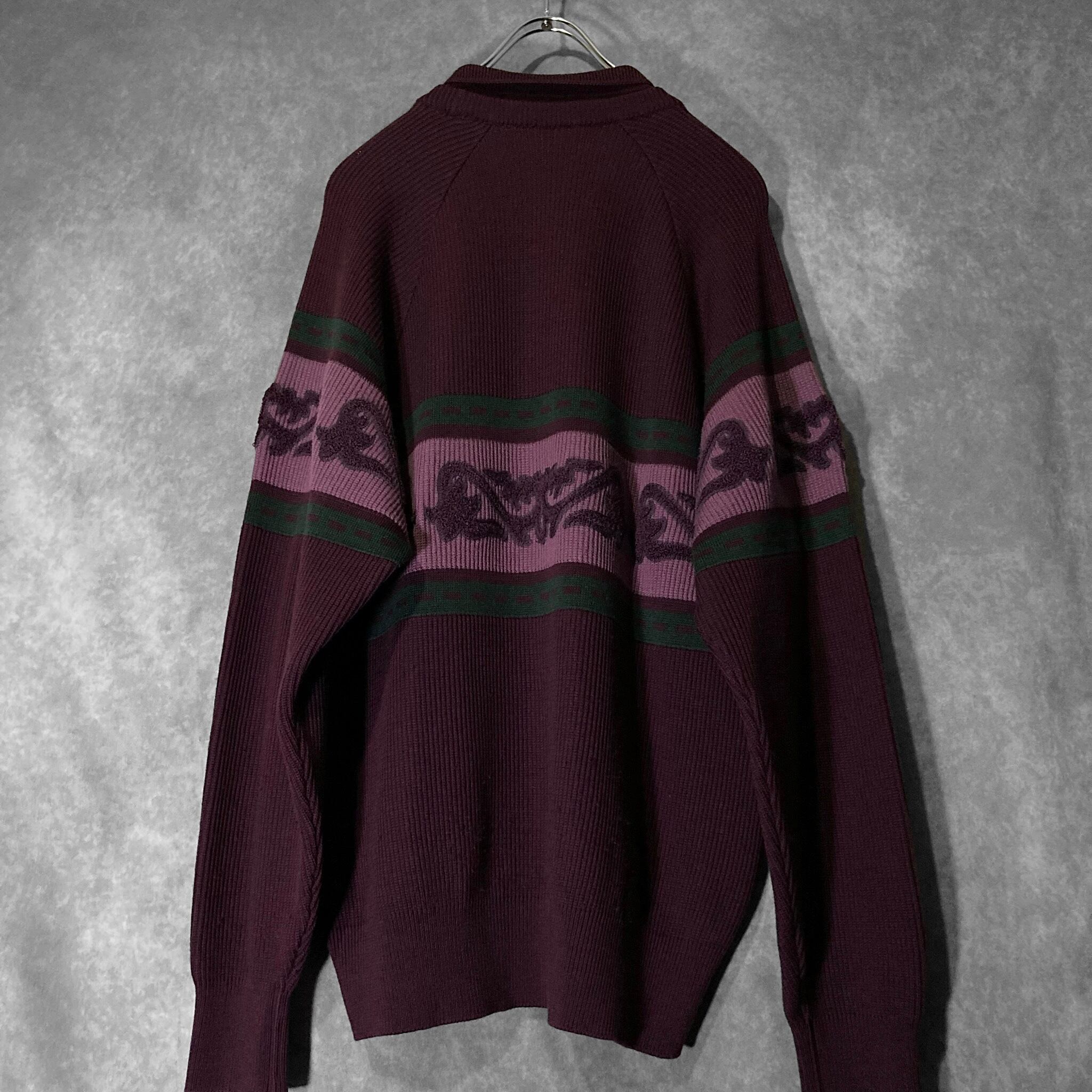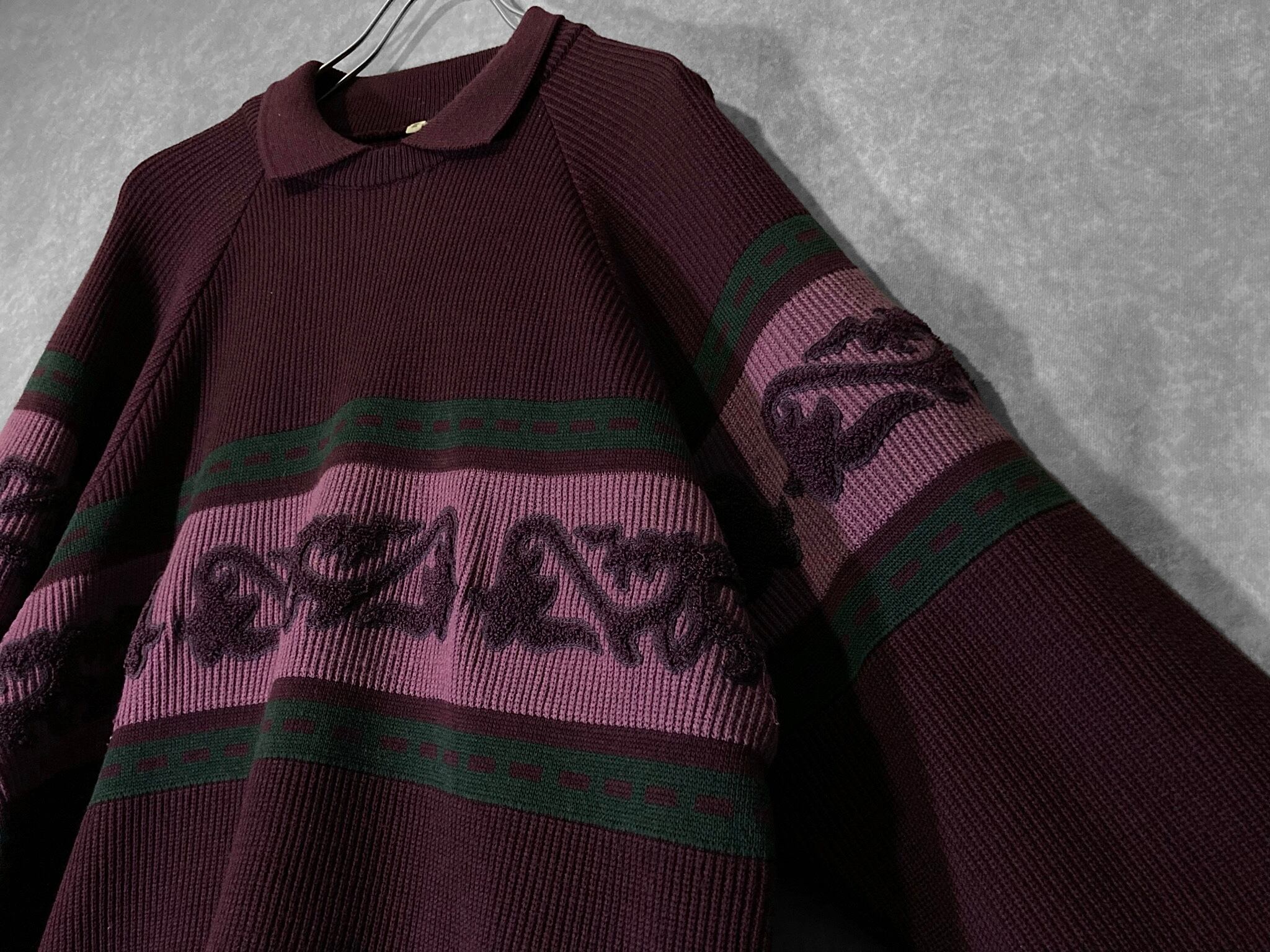 毎回好評の当店が厳選してピックアップするニットコレクションより、バーガンディーの色味とパイル起毛のエスニックな模様が雰囲気ムンムンなデザインニットが入荷です。