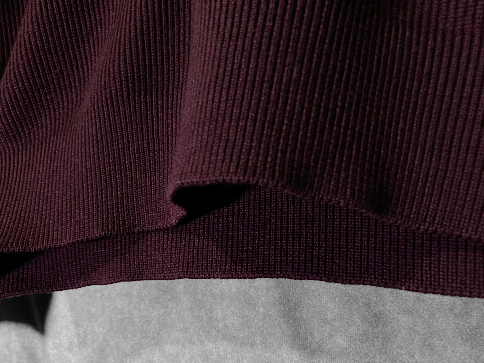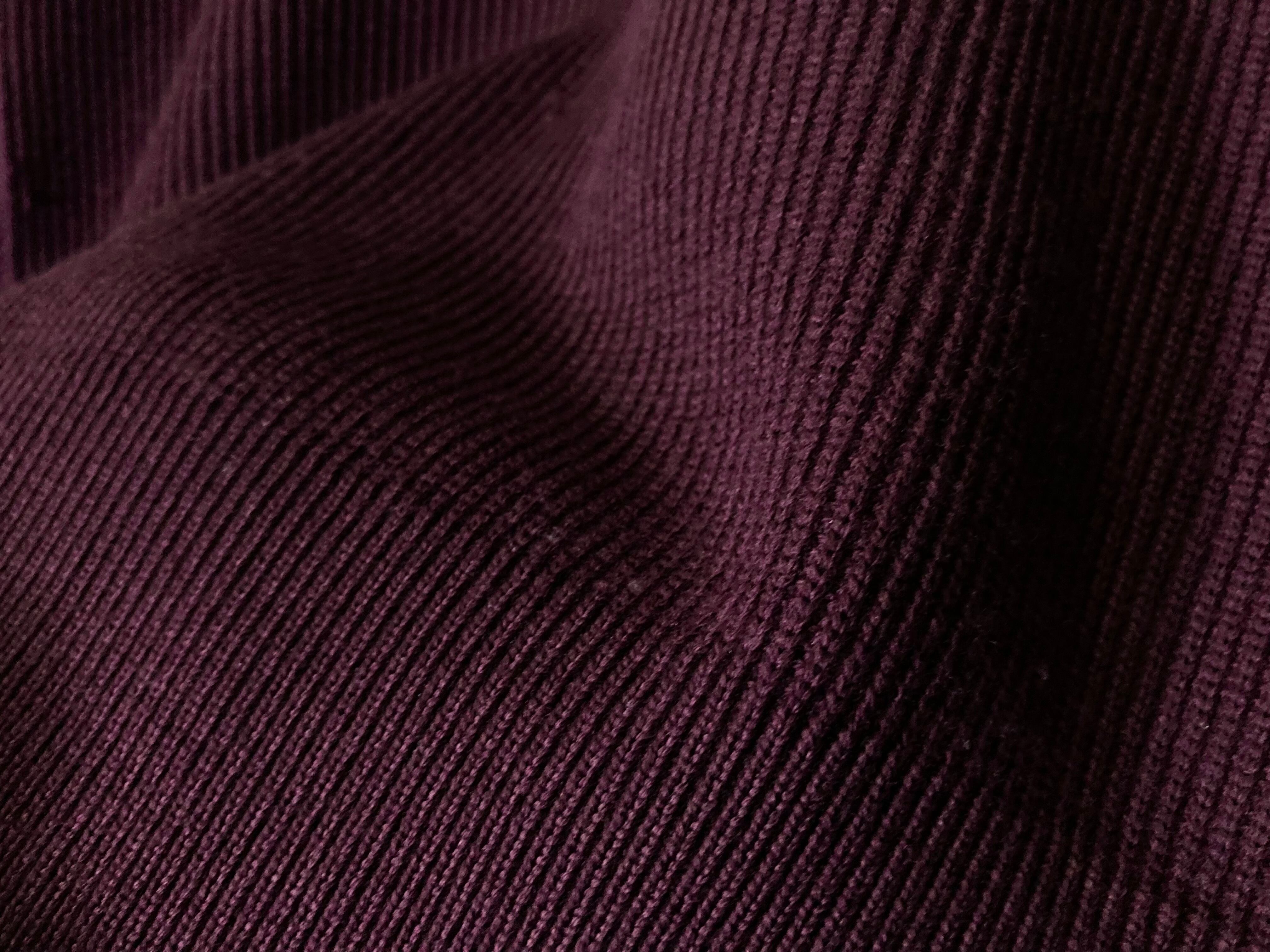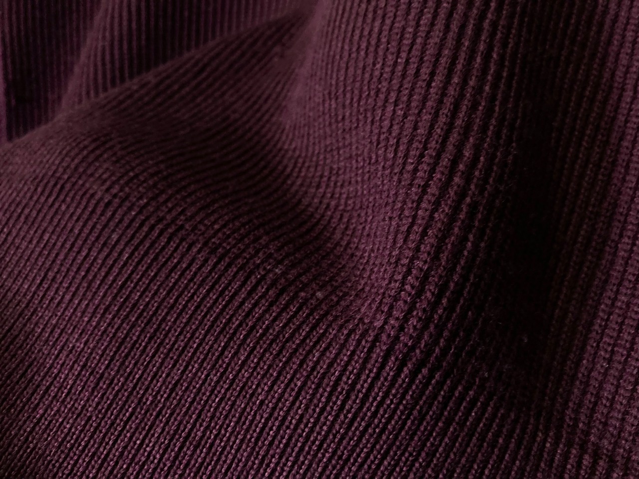 ポリウレタンを含んだ綿を素材に使用し平織りに編んだ編み目が粗く凸凹感のあるテクスチャーニットの生地が特徴的。
