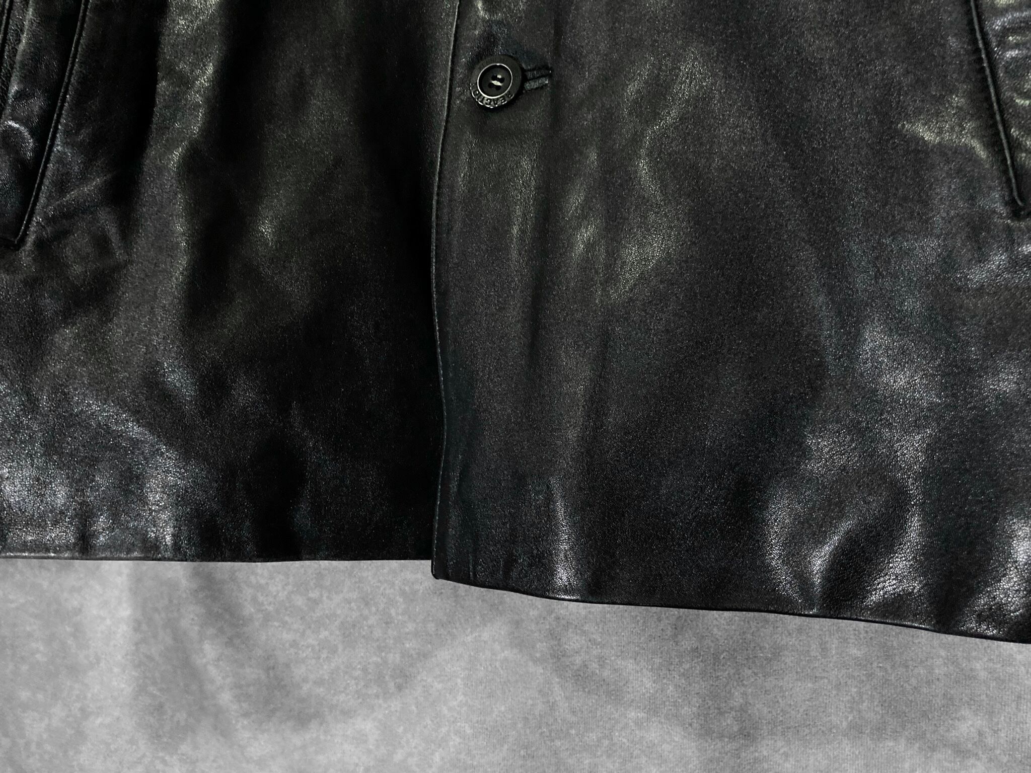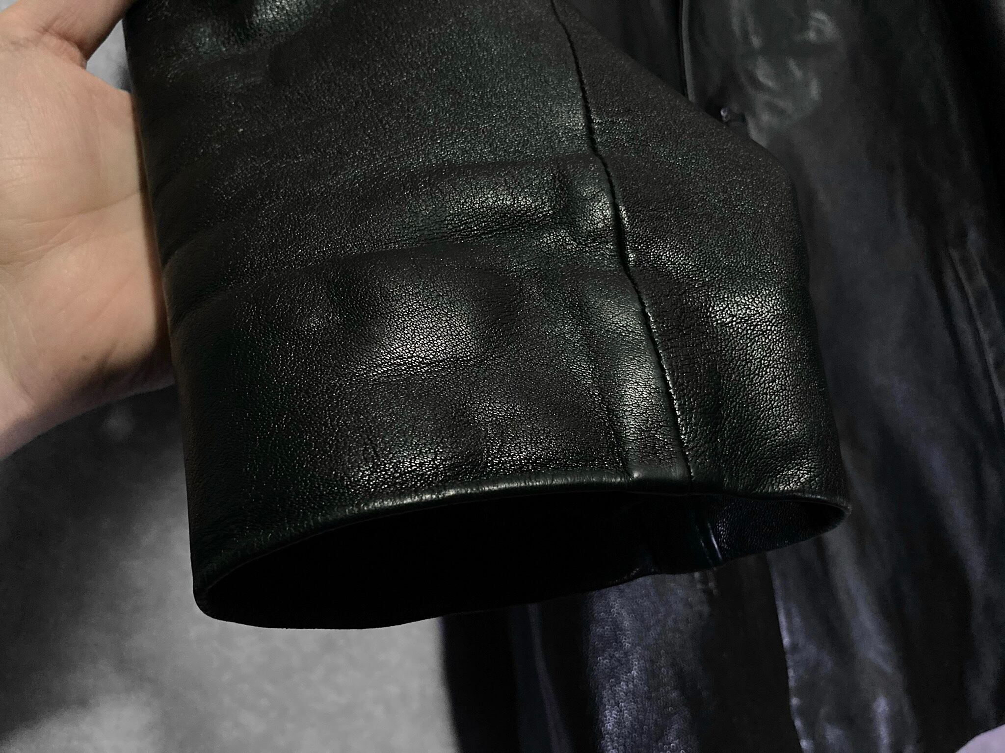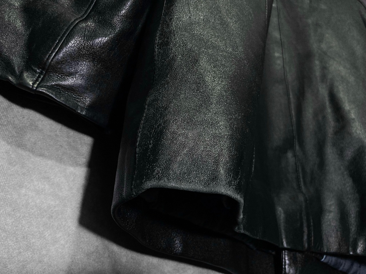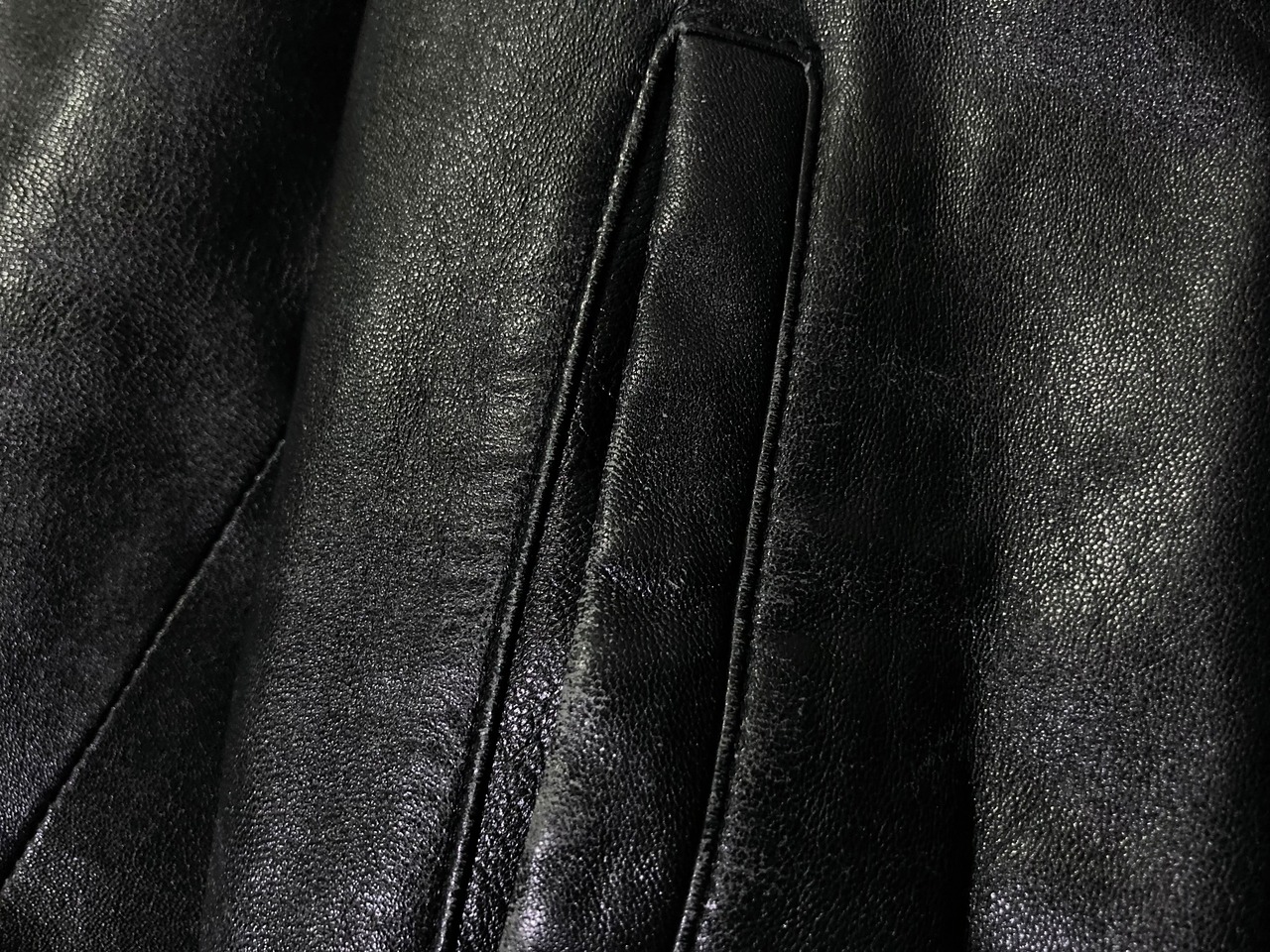 光沢感のある強めのパリッとしたハリのある薄めの生地感が特徴で、目の詰まったきめ細かい本革のゴートレザー(山羊皮)を使用した羽織りやすい極上のレザージャケット。