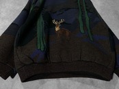 山々の谷あいに佇んだ鹿の刺繍がアイコニックで存在感のあるデザインで、山脈の影のコントラストや歪に伸びた植物が非日常感を高めています。