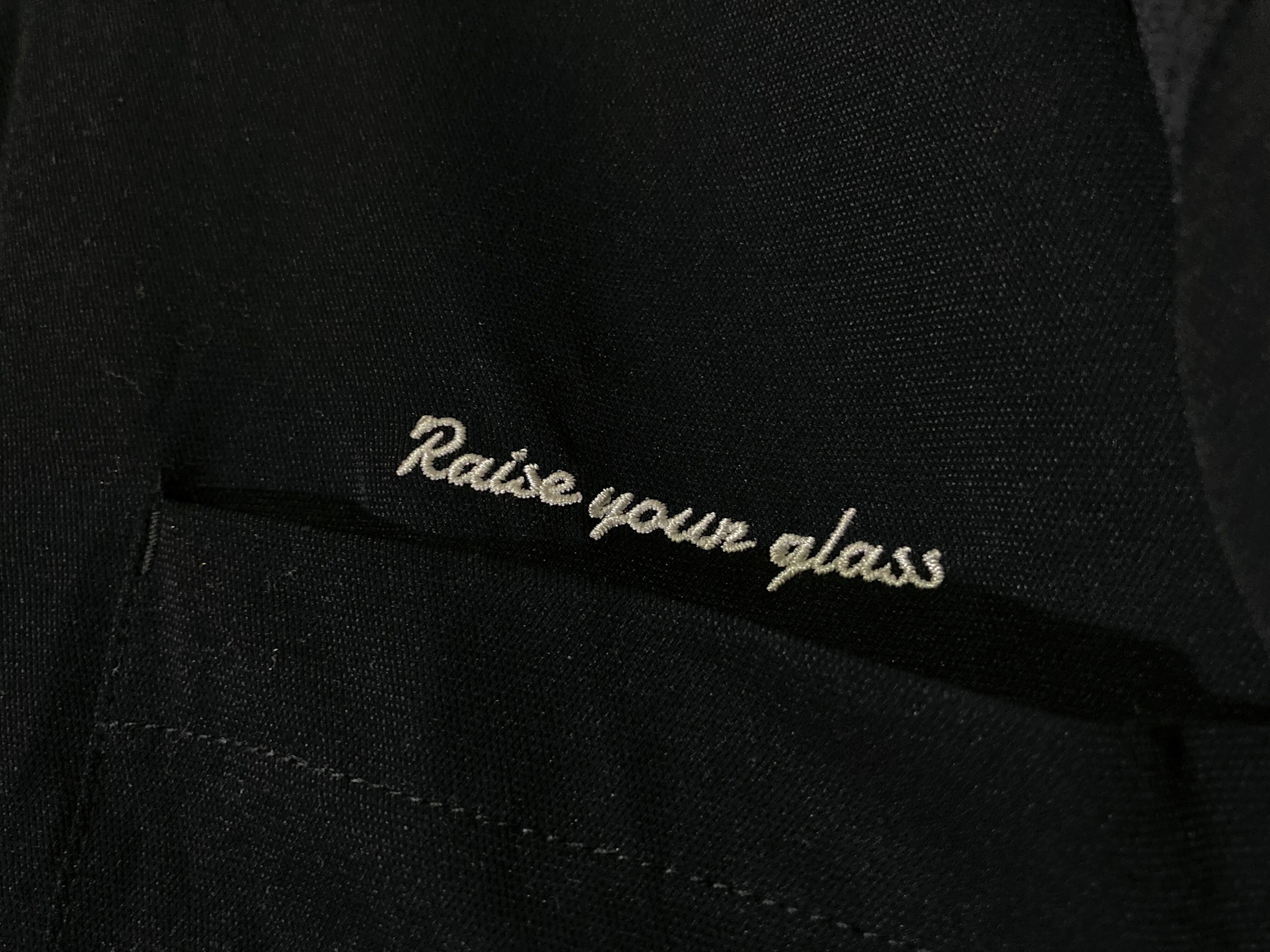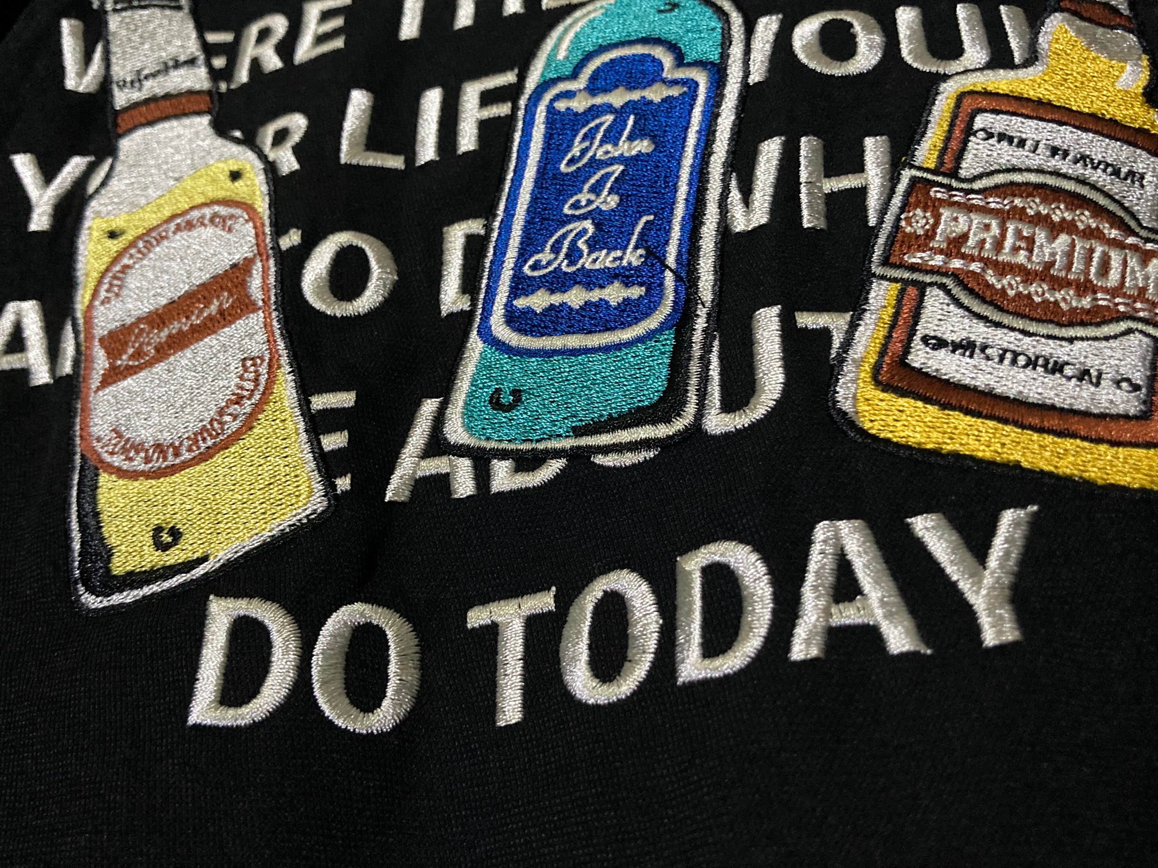 目を引くアーチロゴだけでなく、リキュールボトルの下に描かれたレターデザインまで太字のフォントで刺繍されており、細かいところまでこだわりを感じるハイセンスなデザインが魅力的な至極の1着。