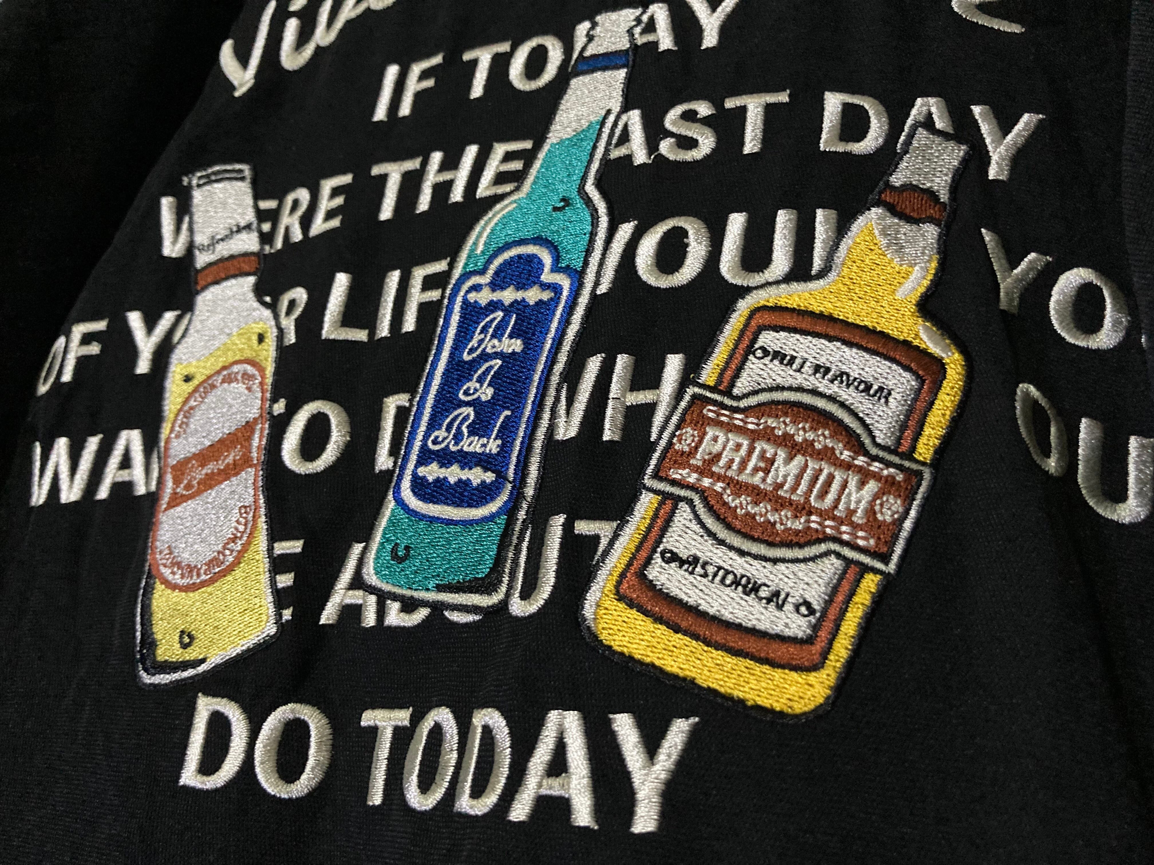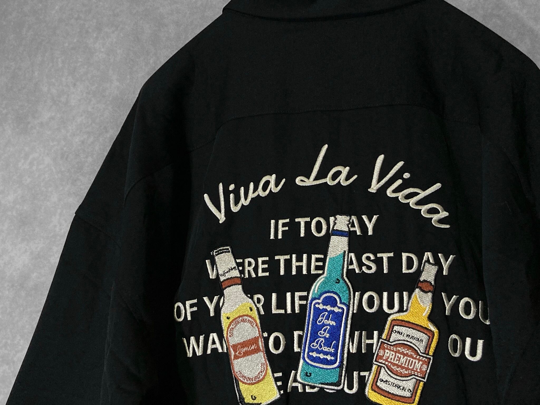背面のデカデカと誇張された " Viva La Vida " のアーチロゴの刺繍とリキュールボトルの刺繍が印象的で存在感を放ちます。