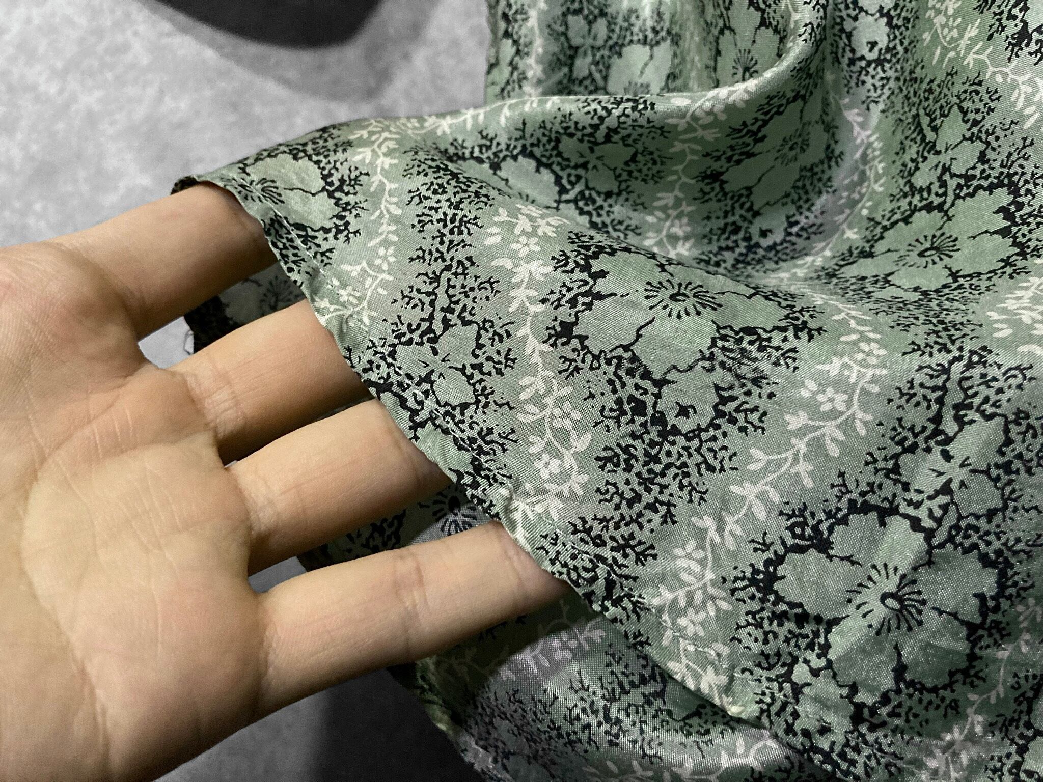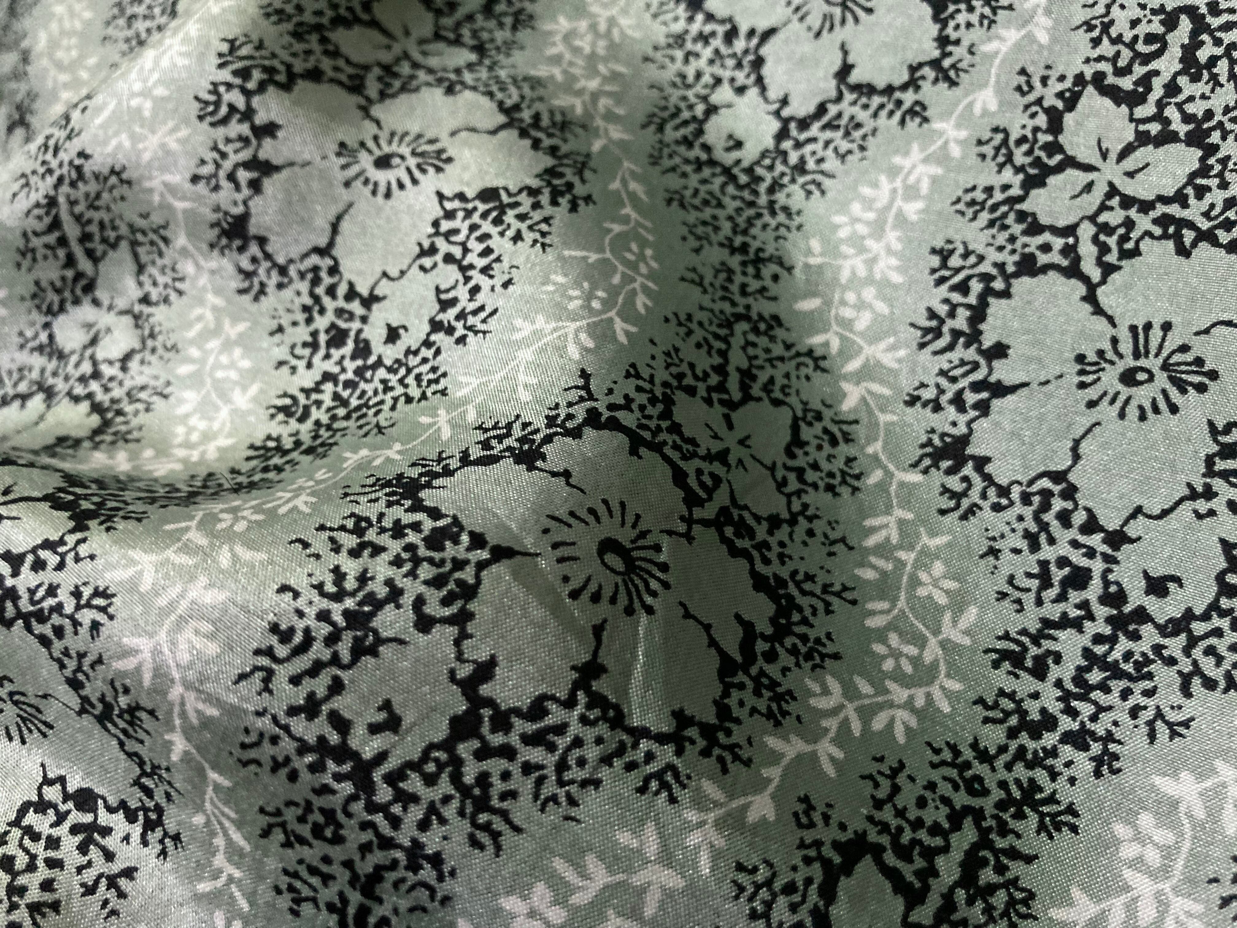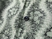 無機質な印象のブルーグリーンとシルバーを混ぜたようなモノトーンな色合いのフローラルパターンが色気のあるスタイリングを演出します。
