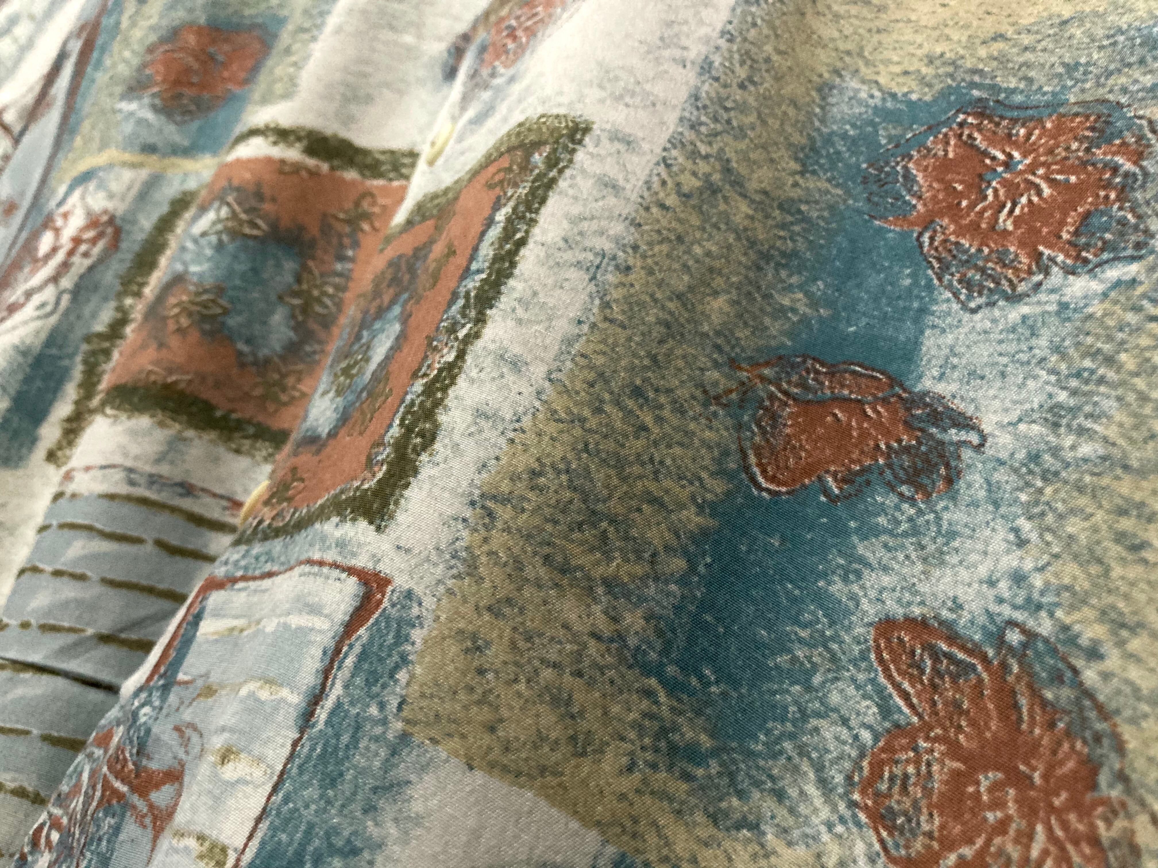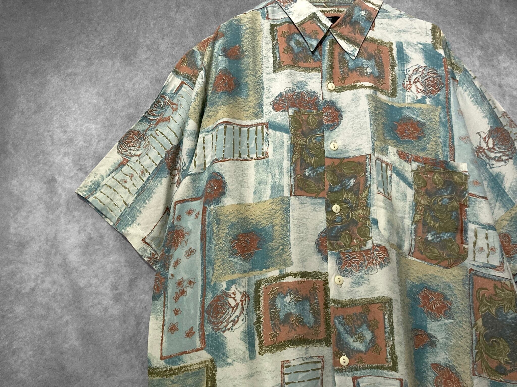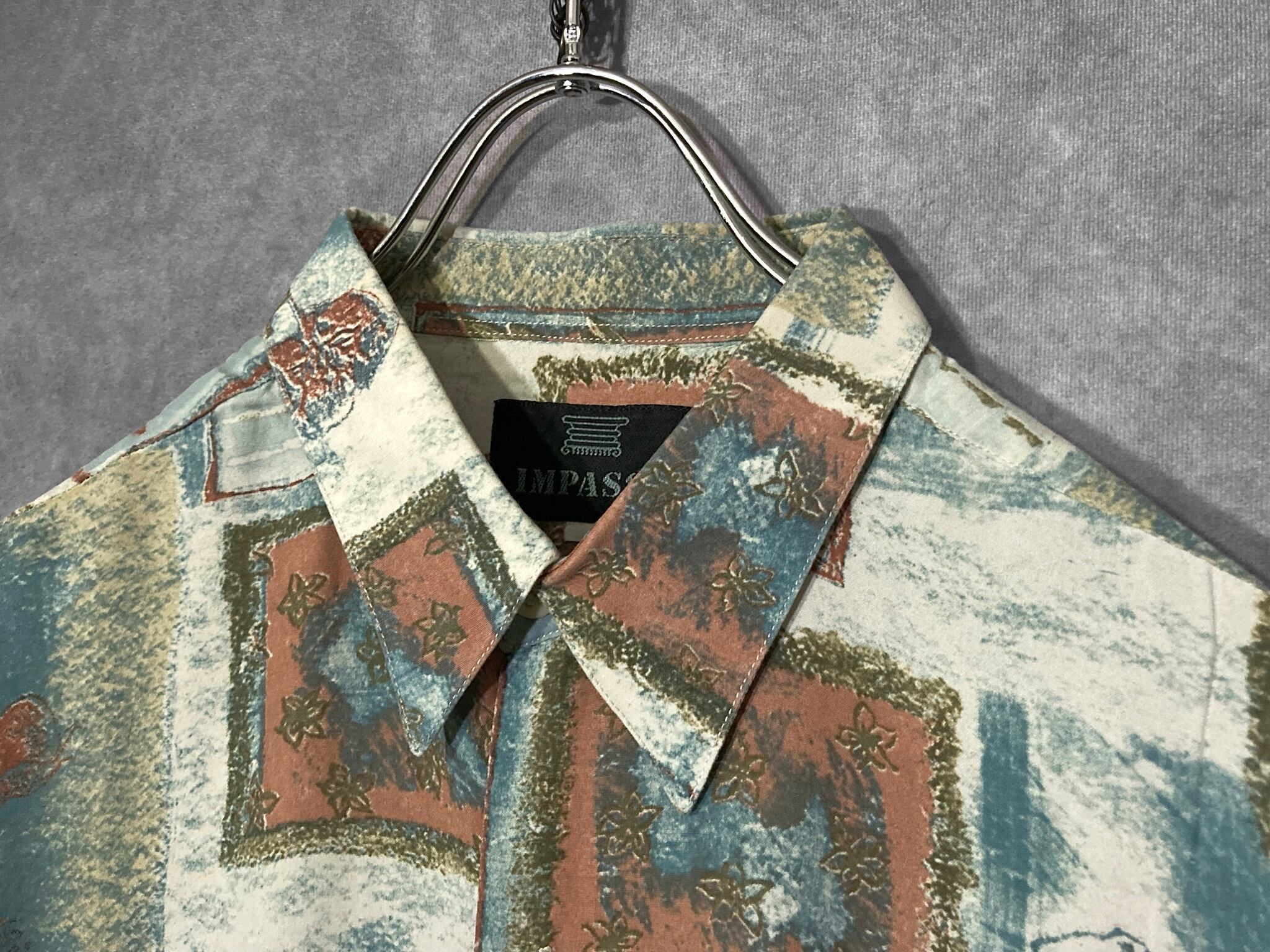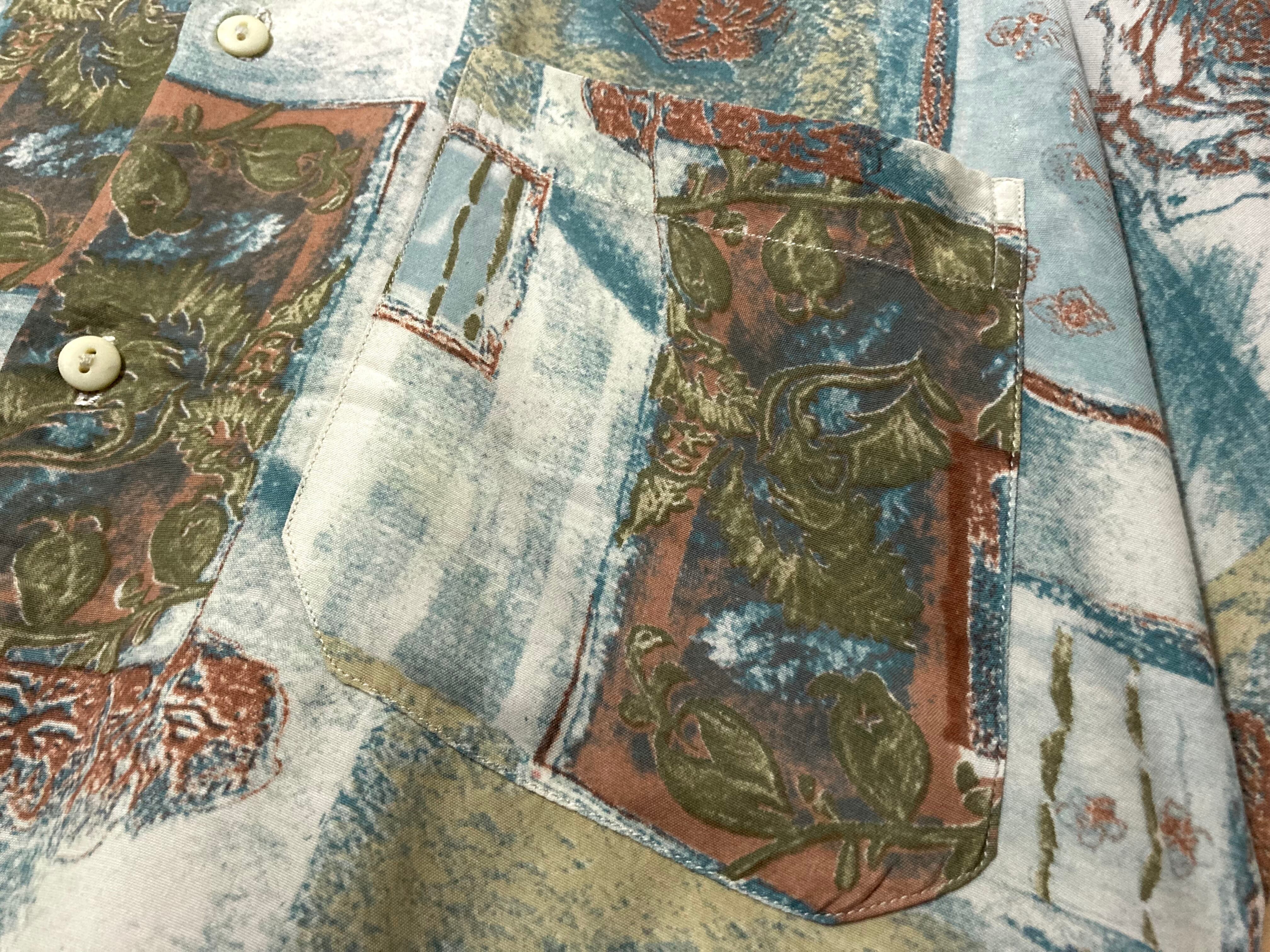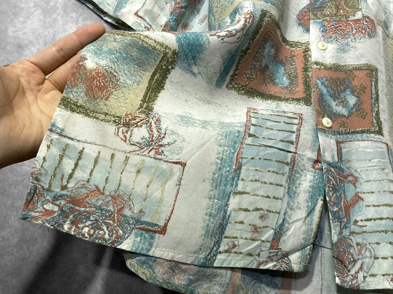 クレヨンで描いては滲ませてを繰り返してデザインされた雰囲気ムンムンなアーティスティックな総柄シャツ。